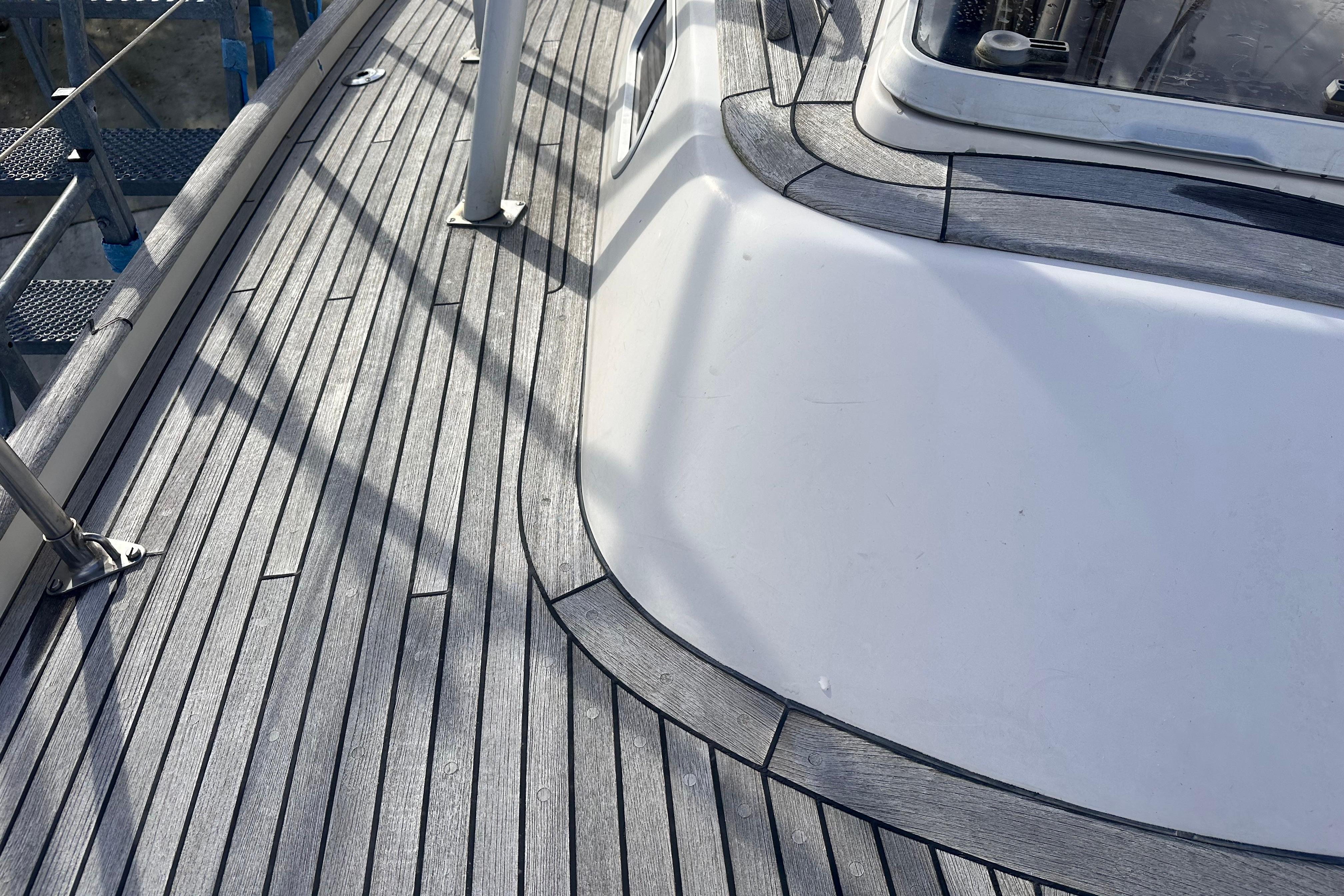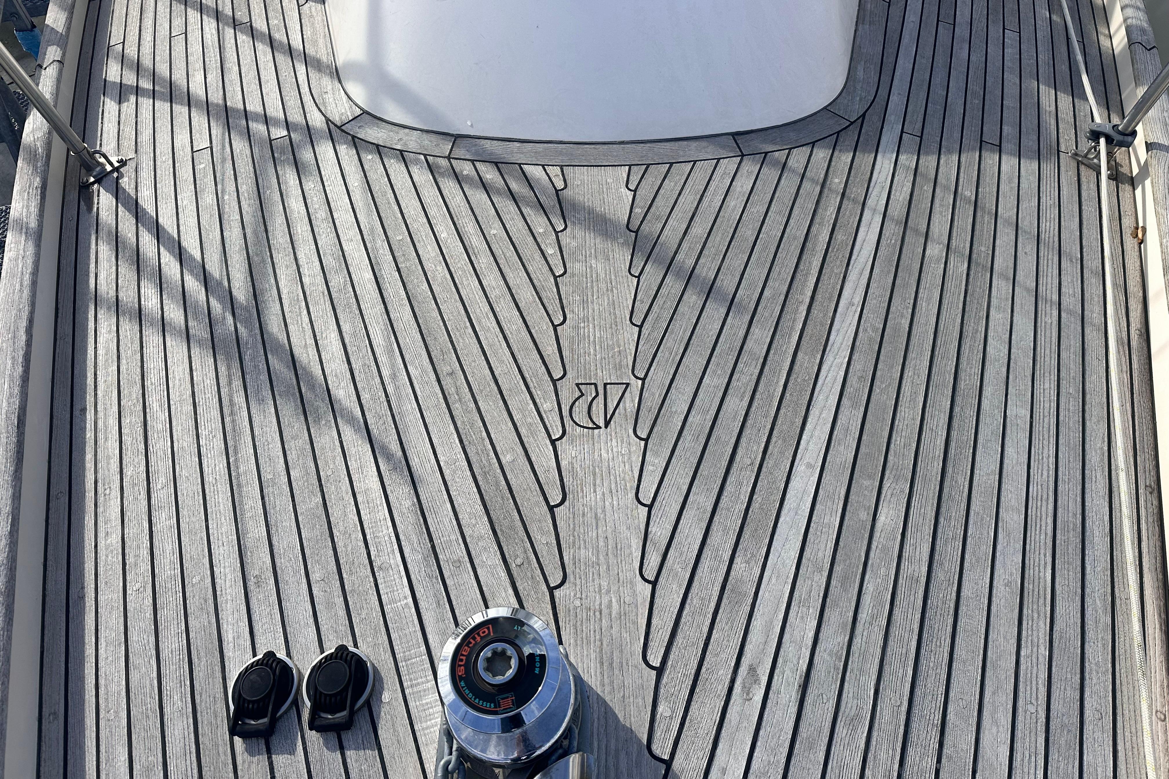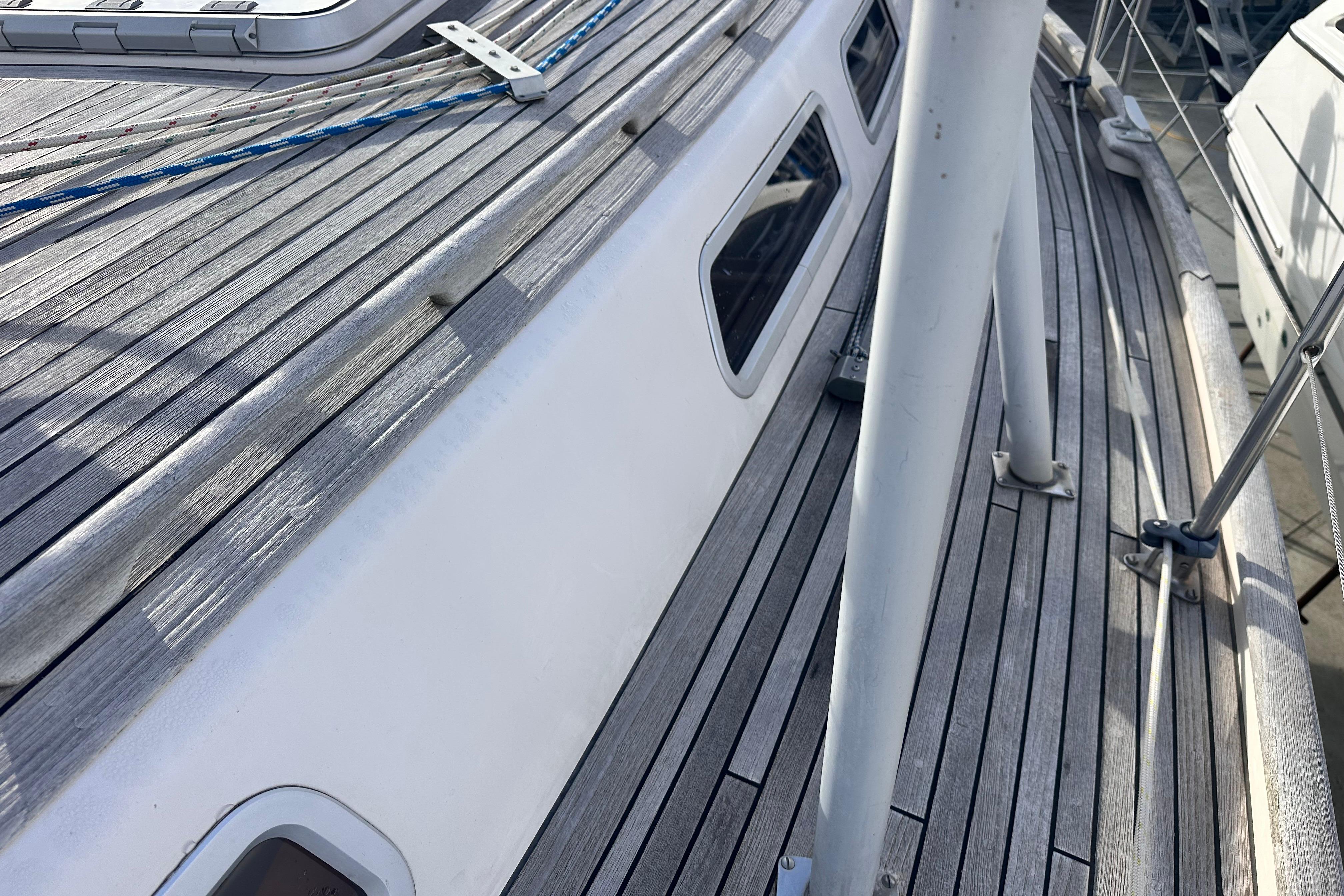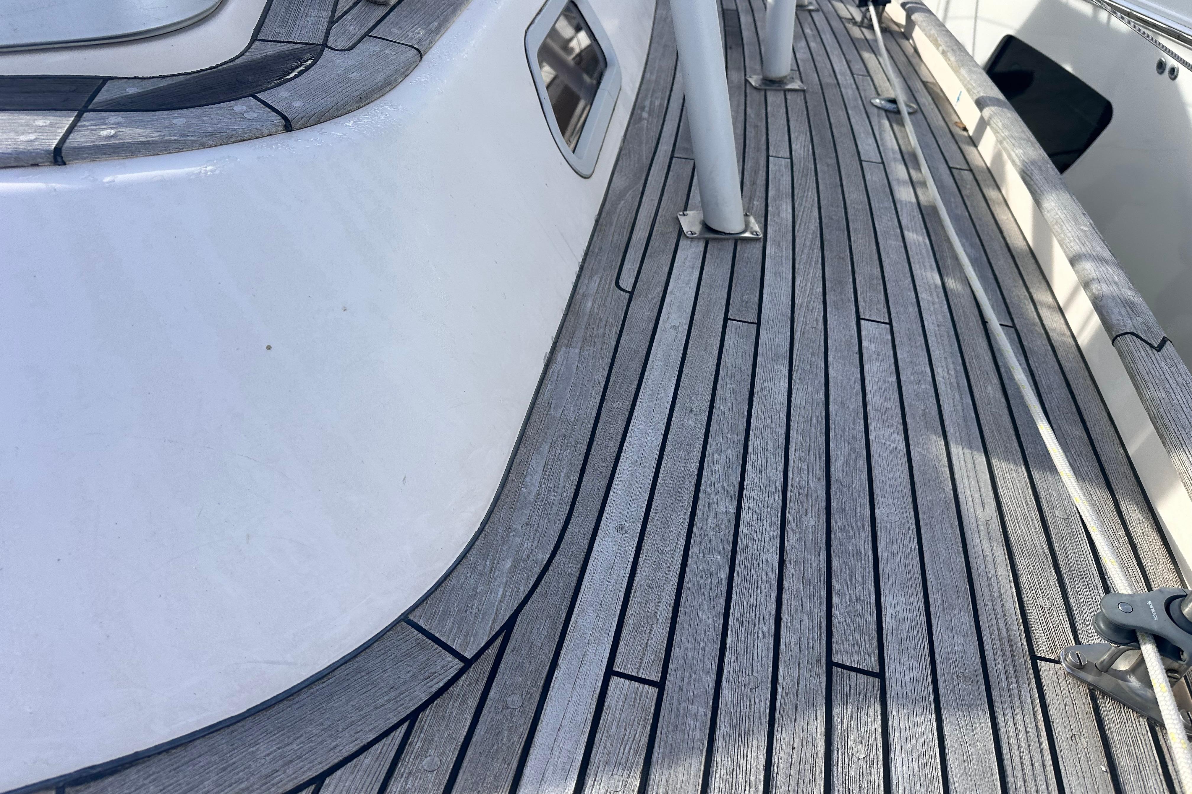 Deck, toerail, handrails, cockpit seats, integral bathing platform with folding ladder, cockpit floor and side trims in teak.