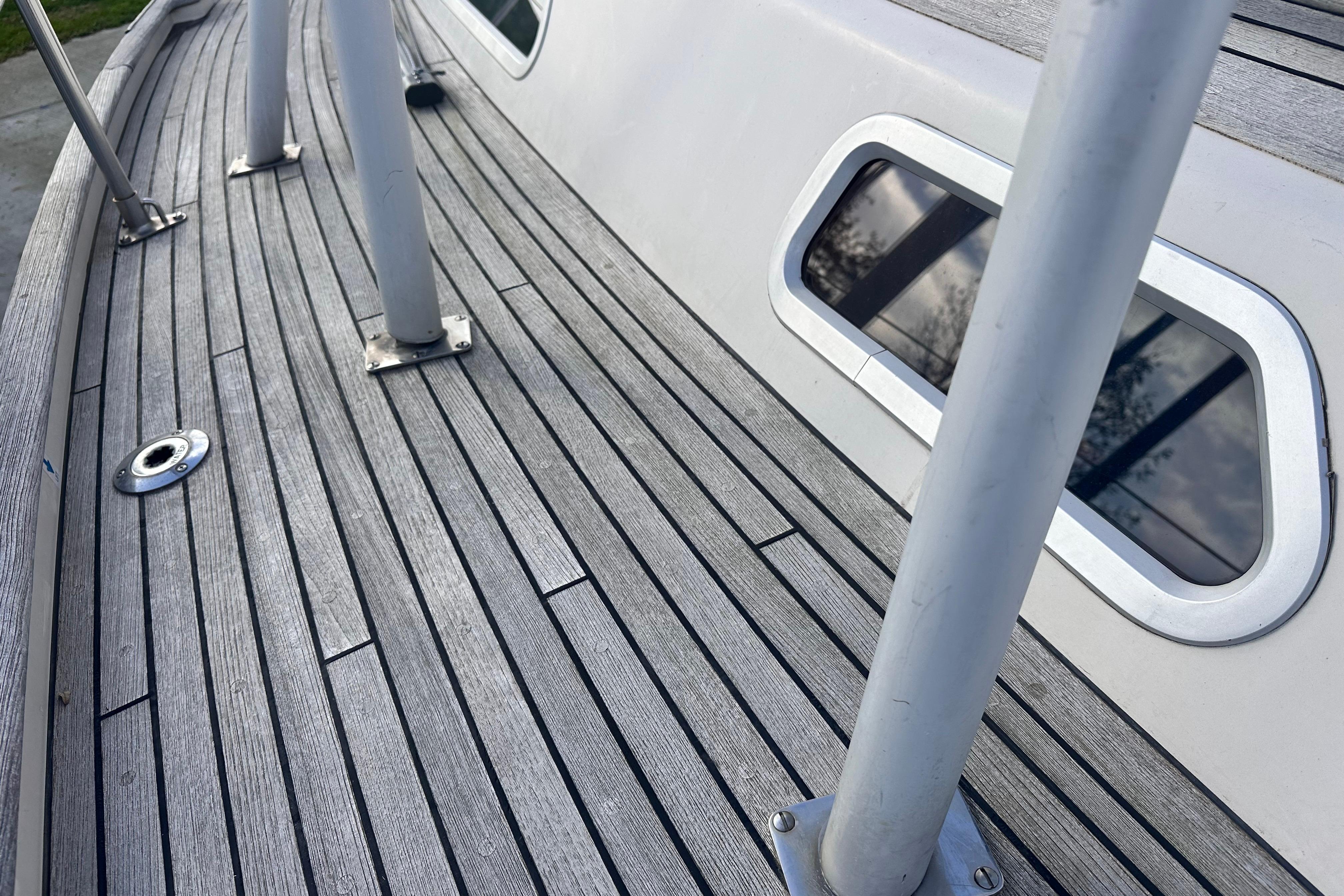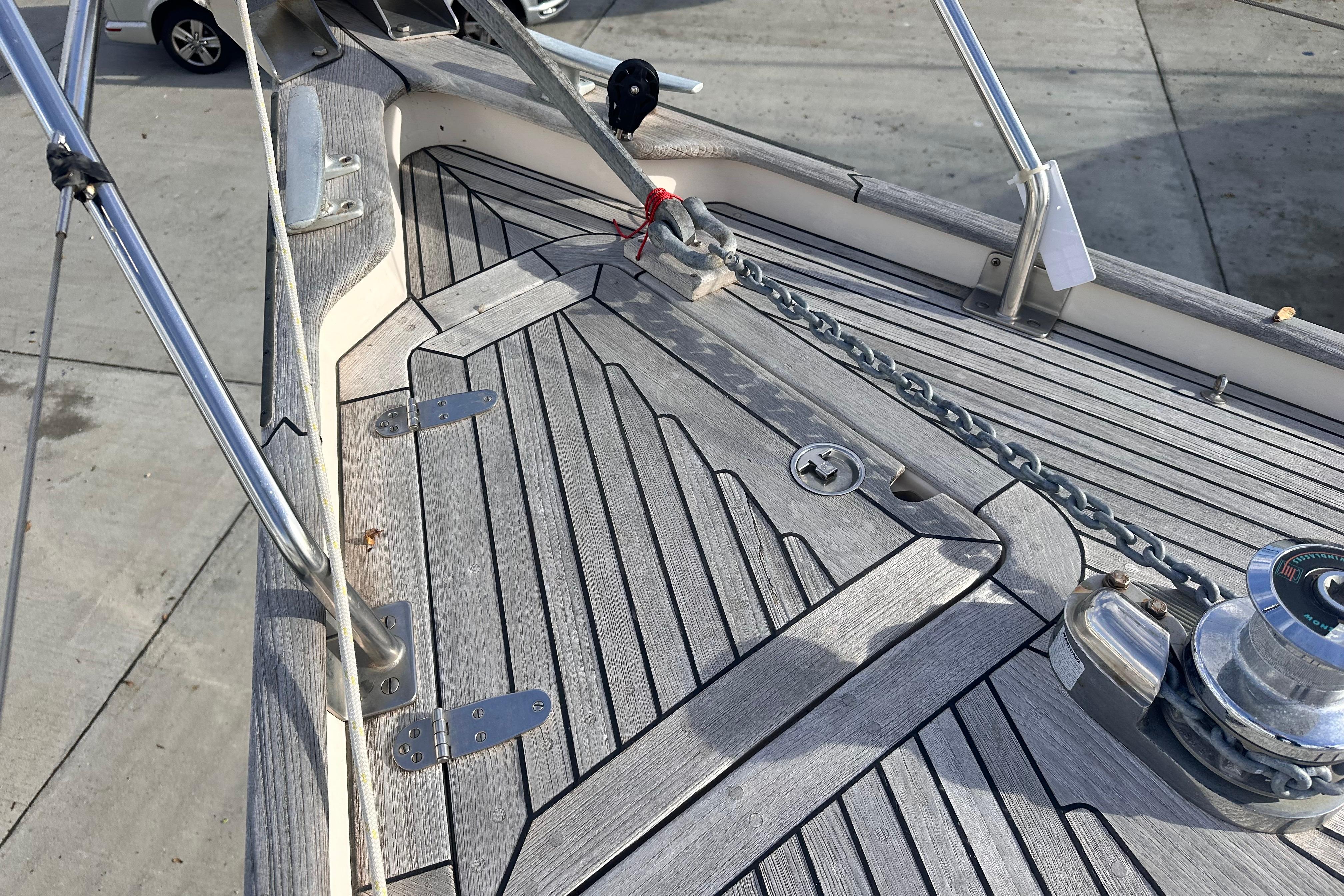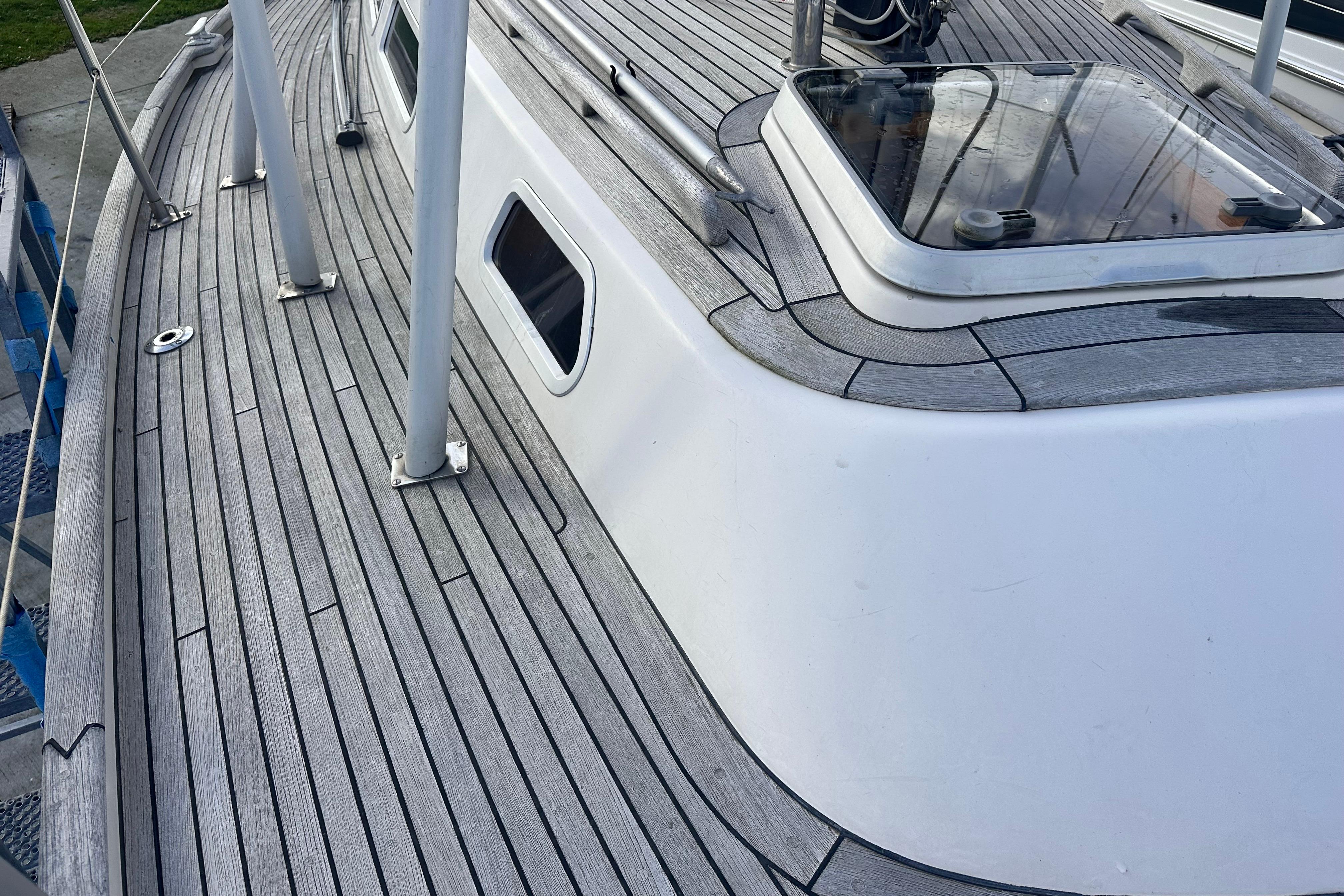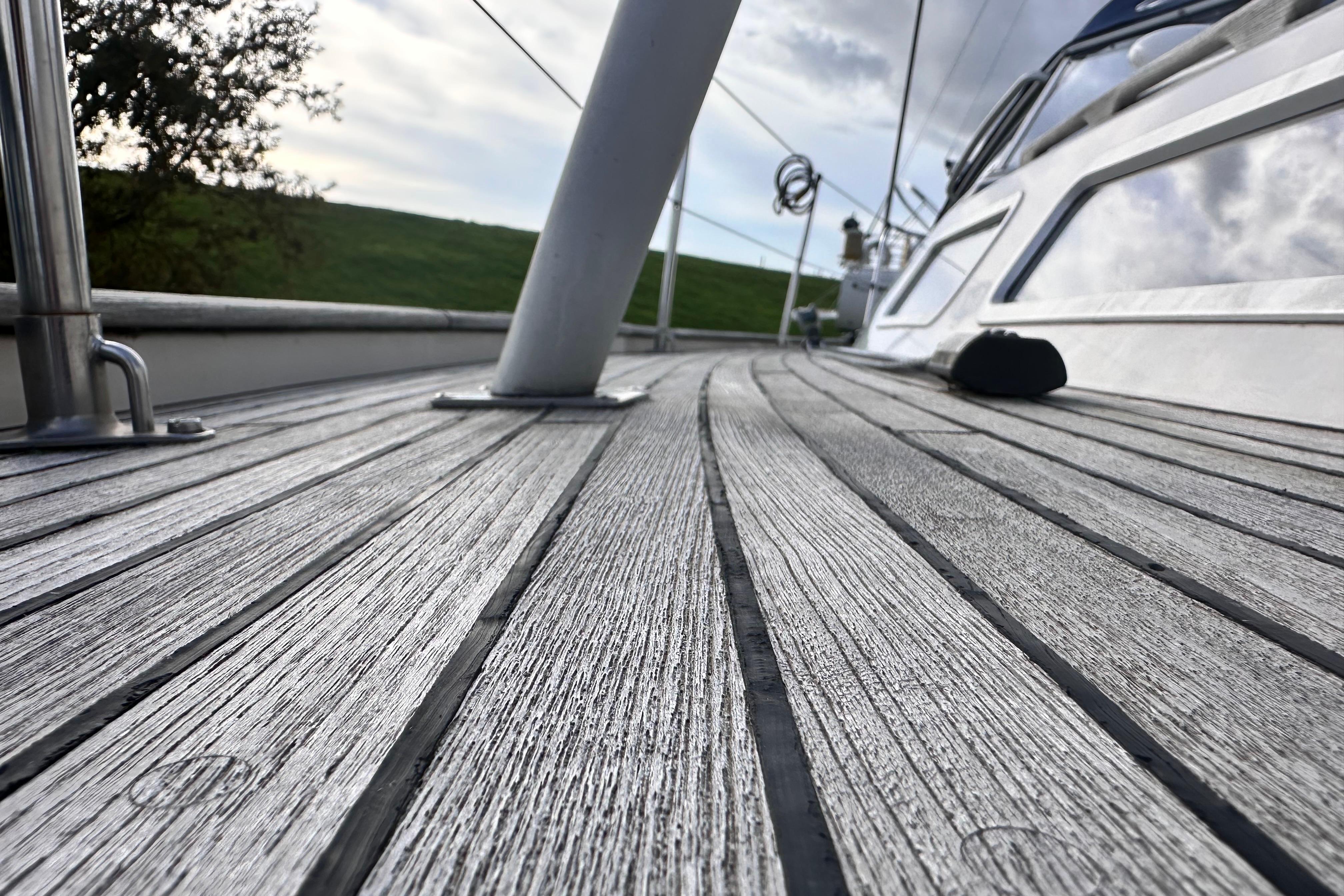 Deck, toerail, handrails, cockpit seats, integral bathing platform with folding ladder, cockpit floor and side trims in teak.
