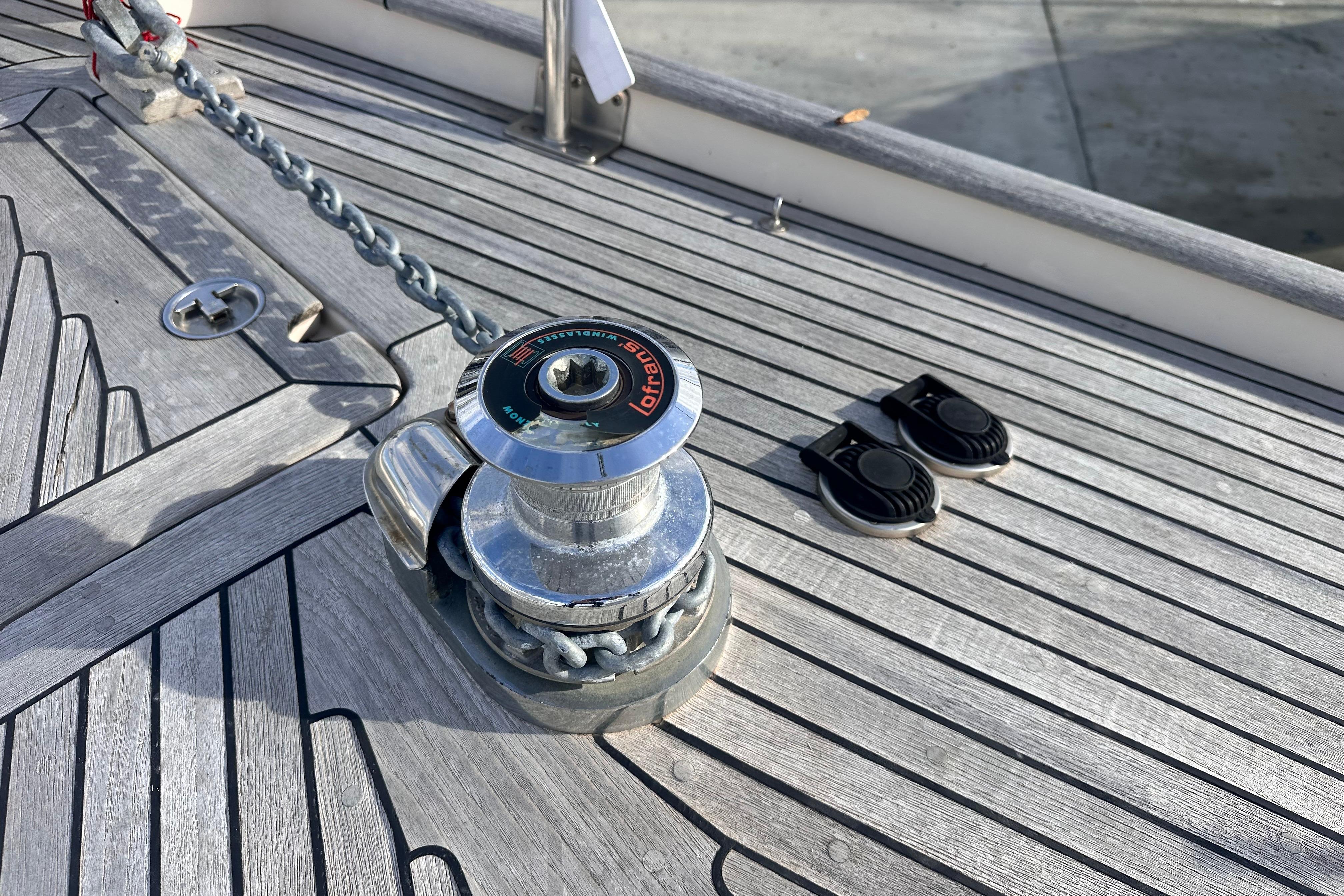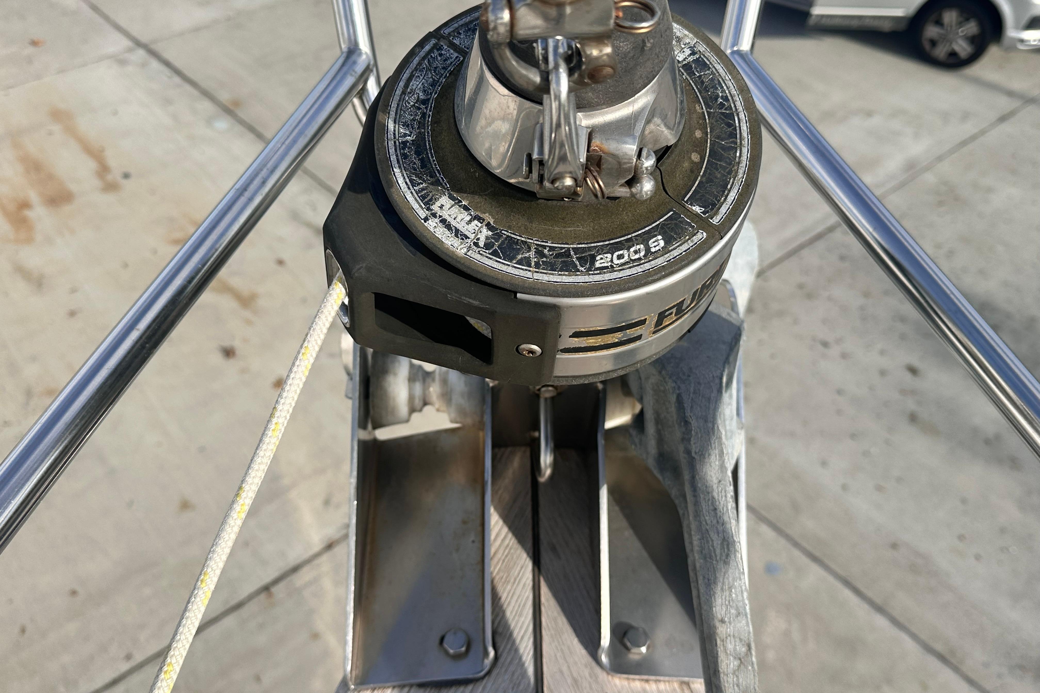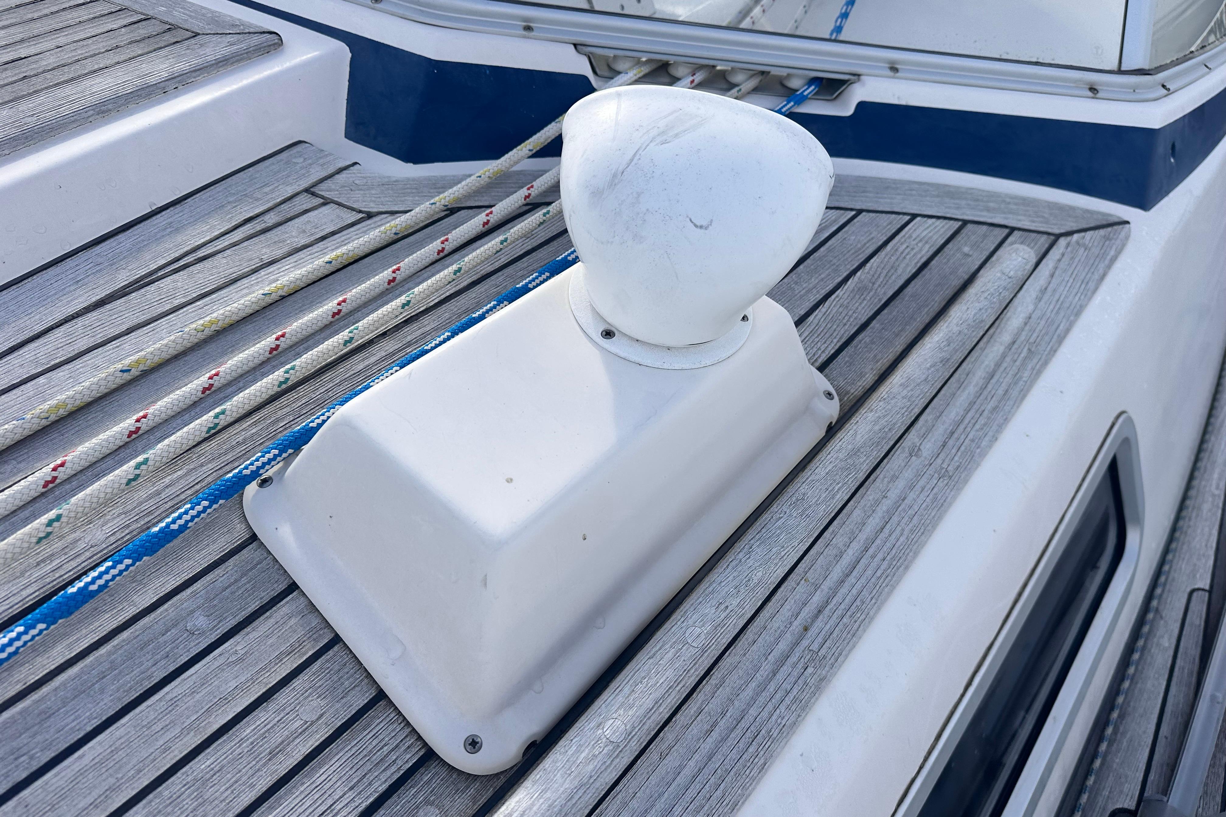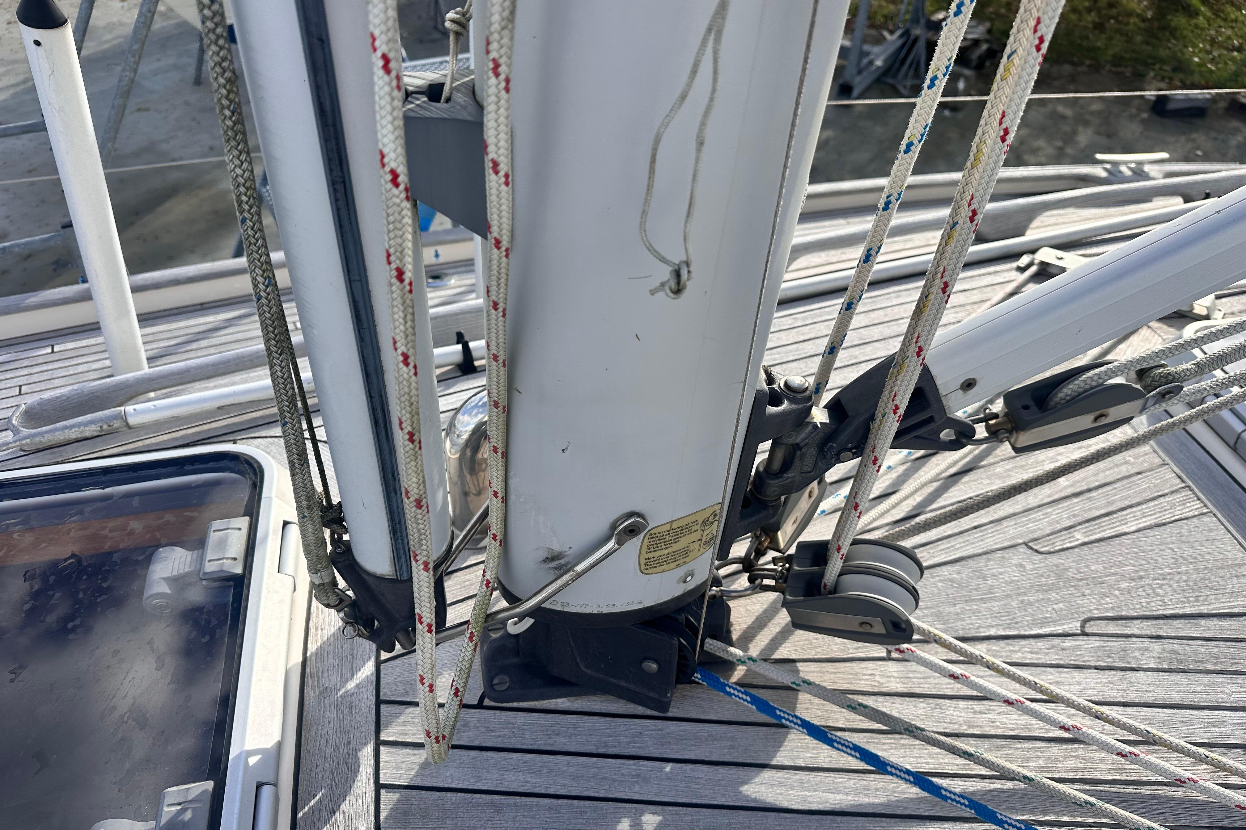 Halyards and lines lead into cockpit through 8 jammers to two winches under the windscreen – replaced Spring 2018