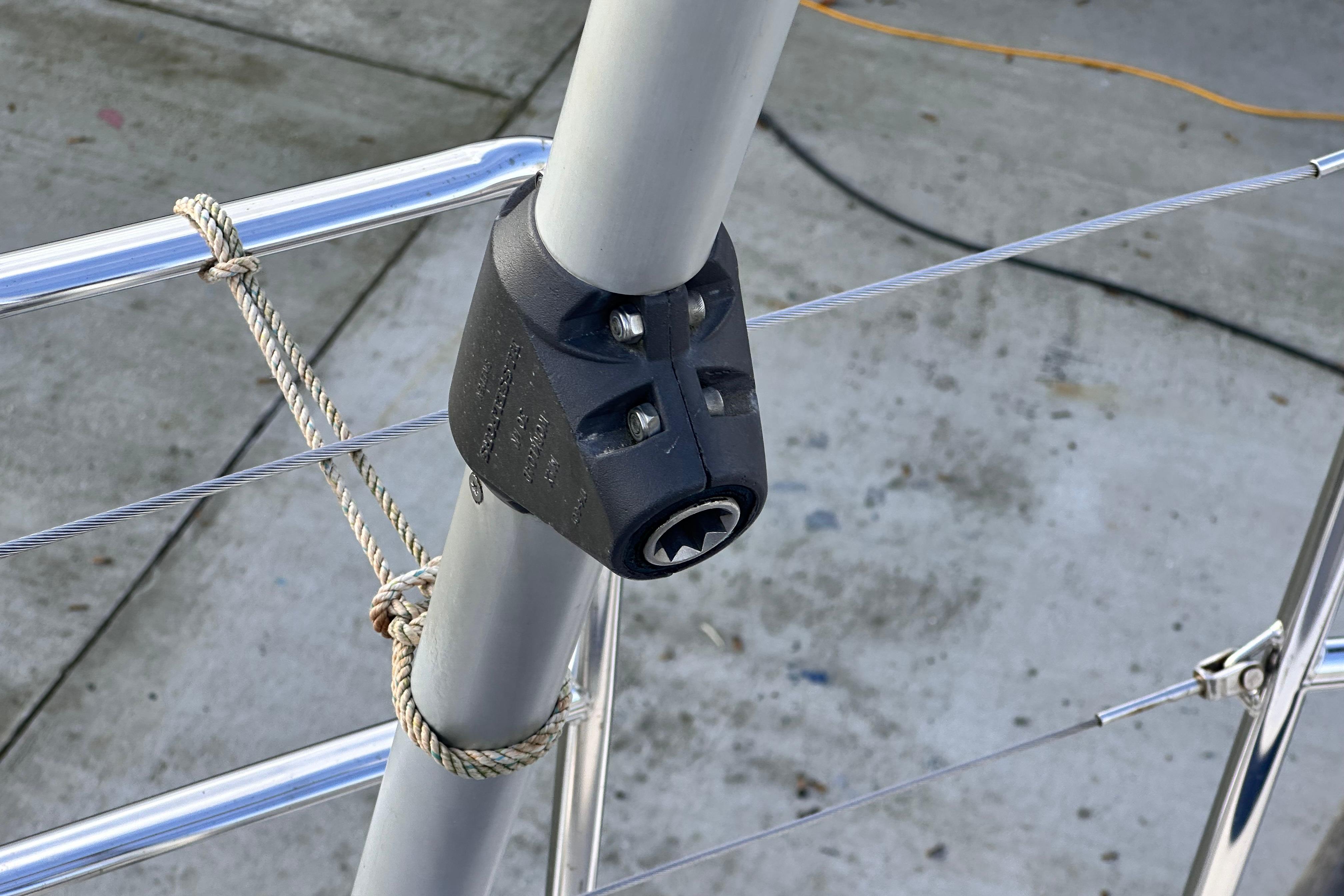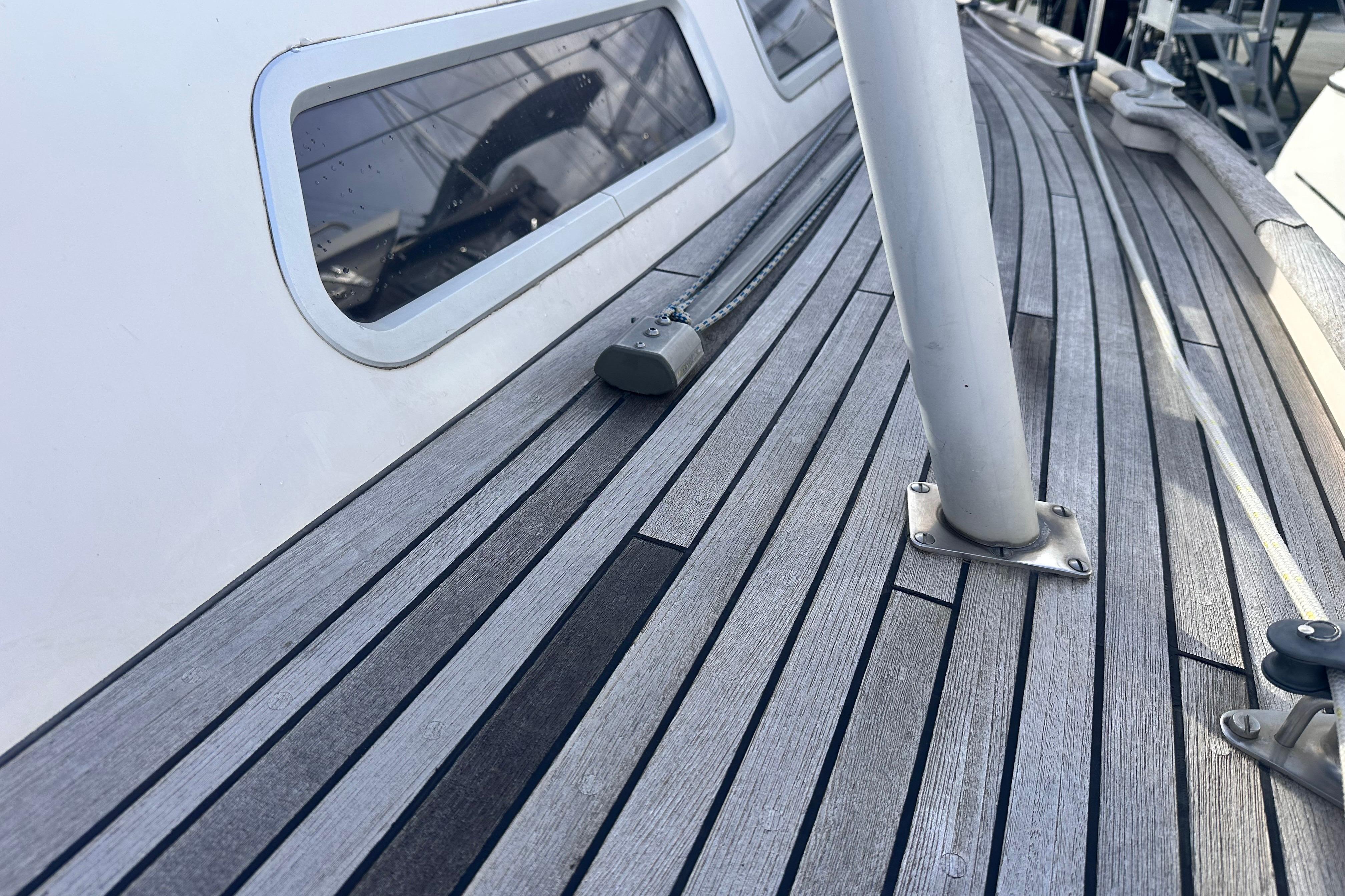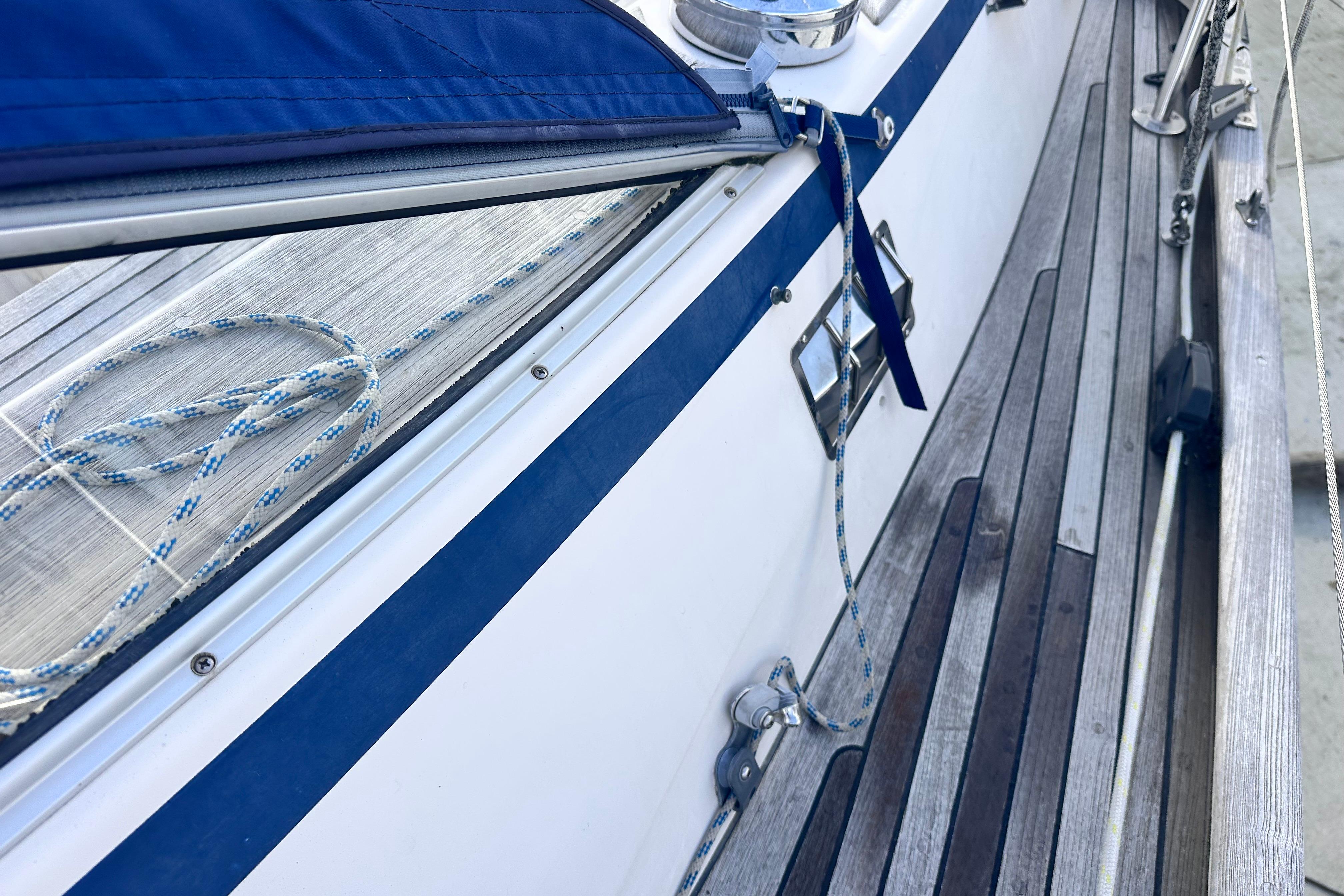Halyards and lines lead into cockpit through 8 jammers to two winches under the windscreen – replaced Spring 2018