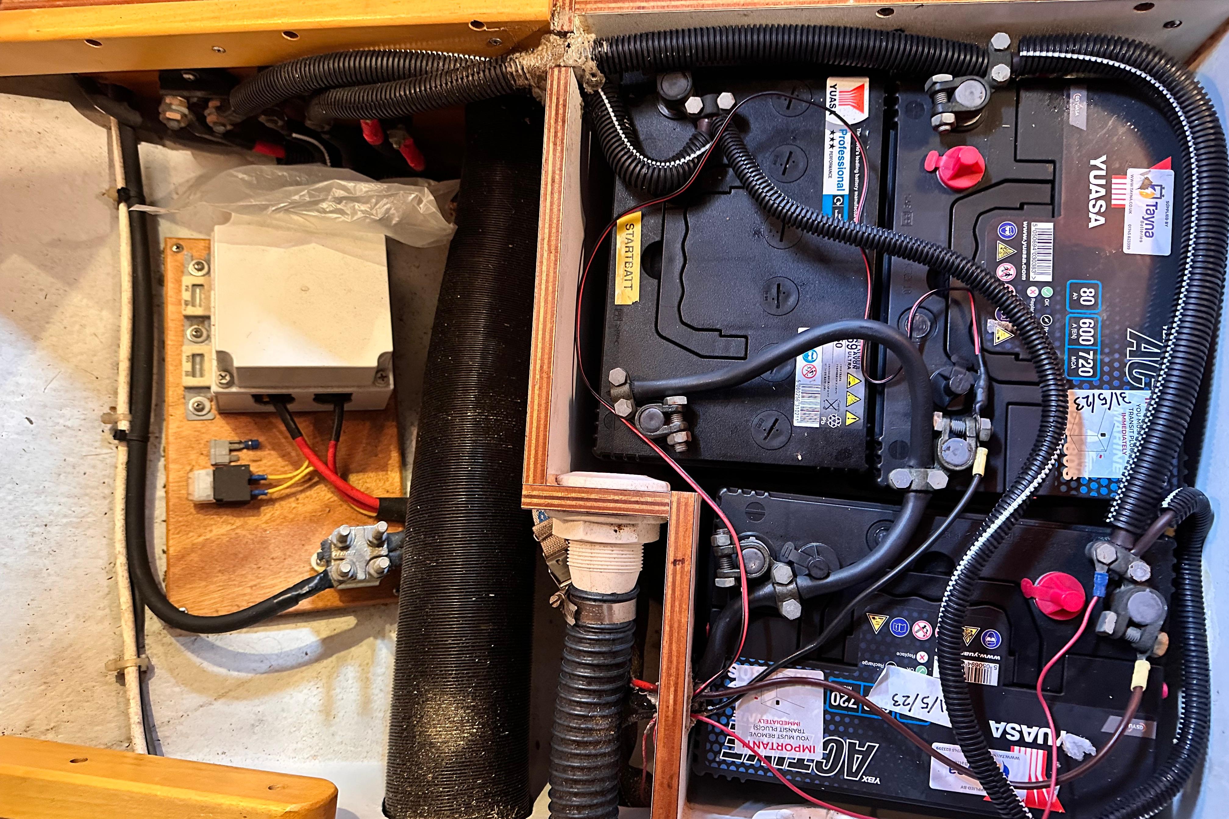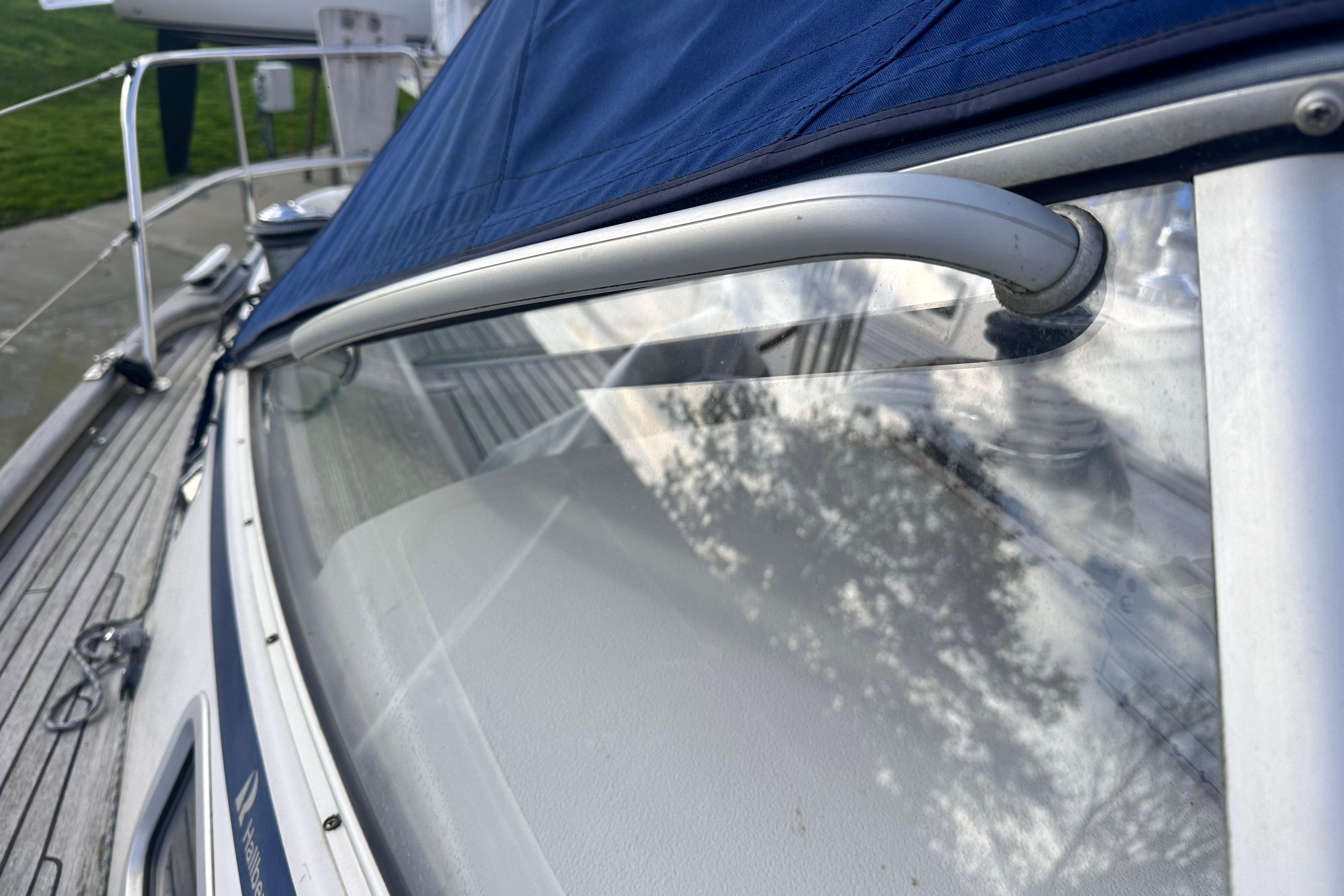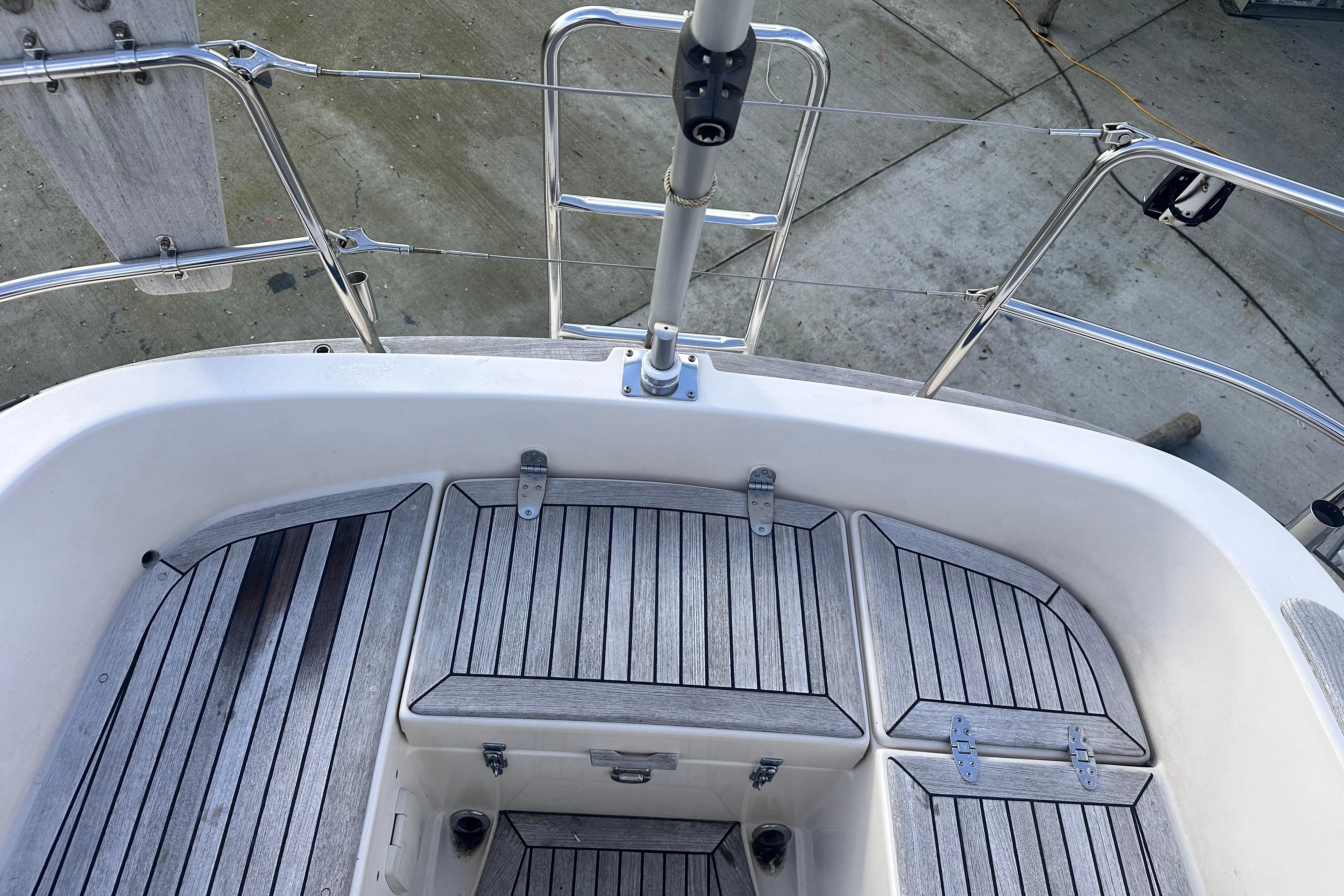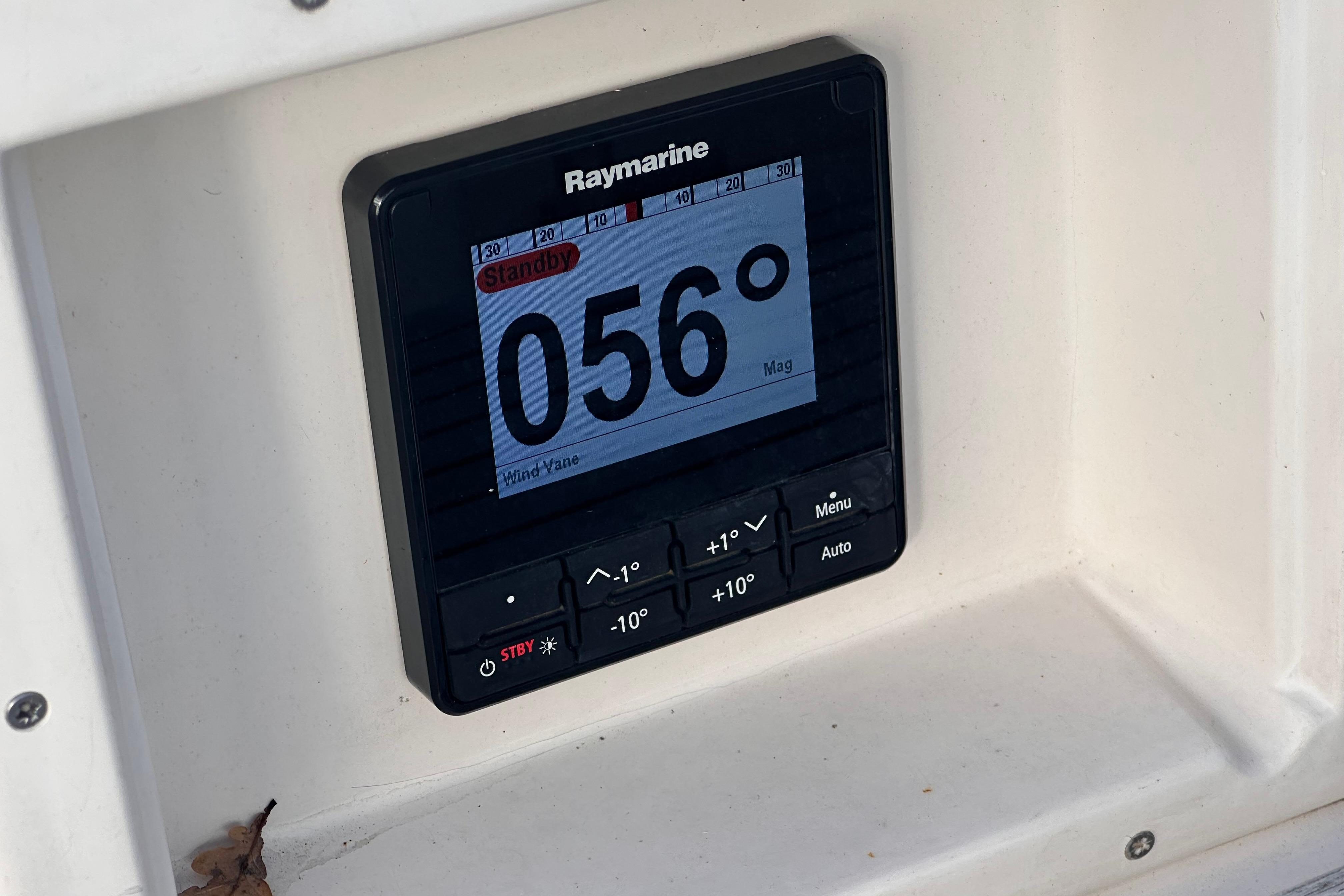 Halyards and lines lead into cockpit through 8 jammers to two winches under the windscreen – replaced Spring 2018