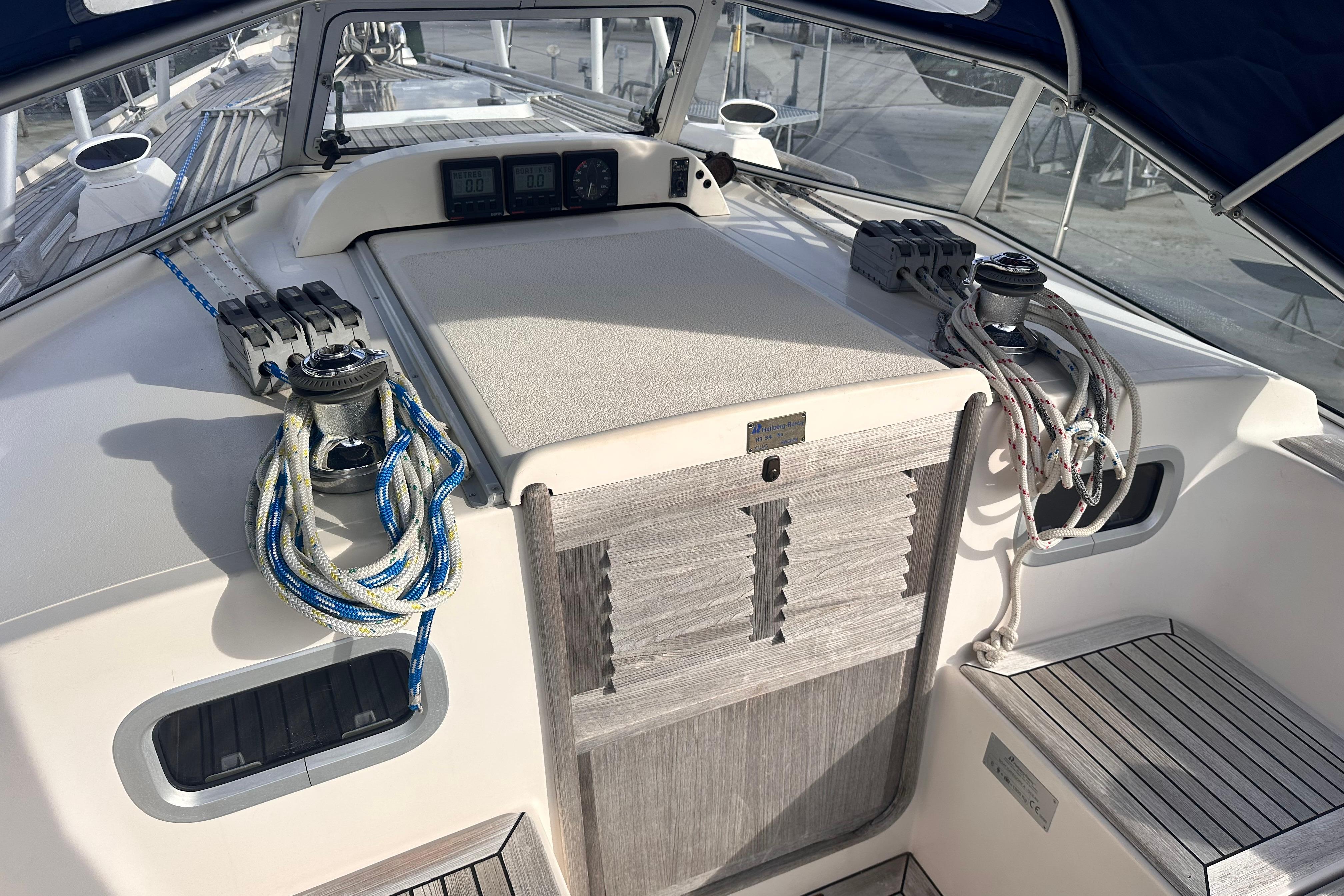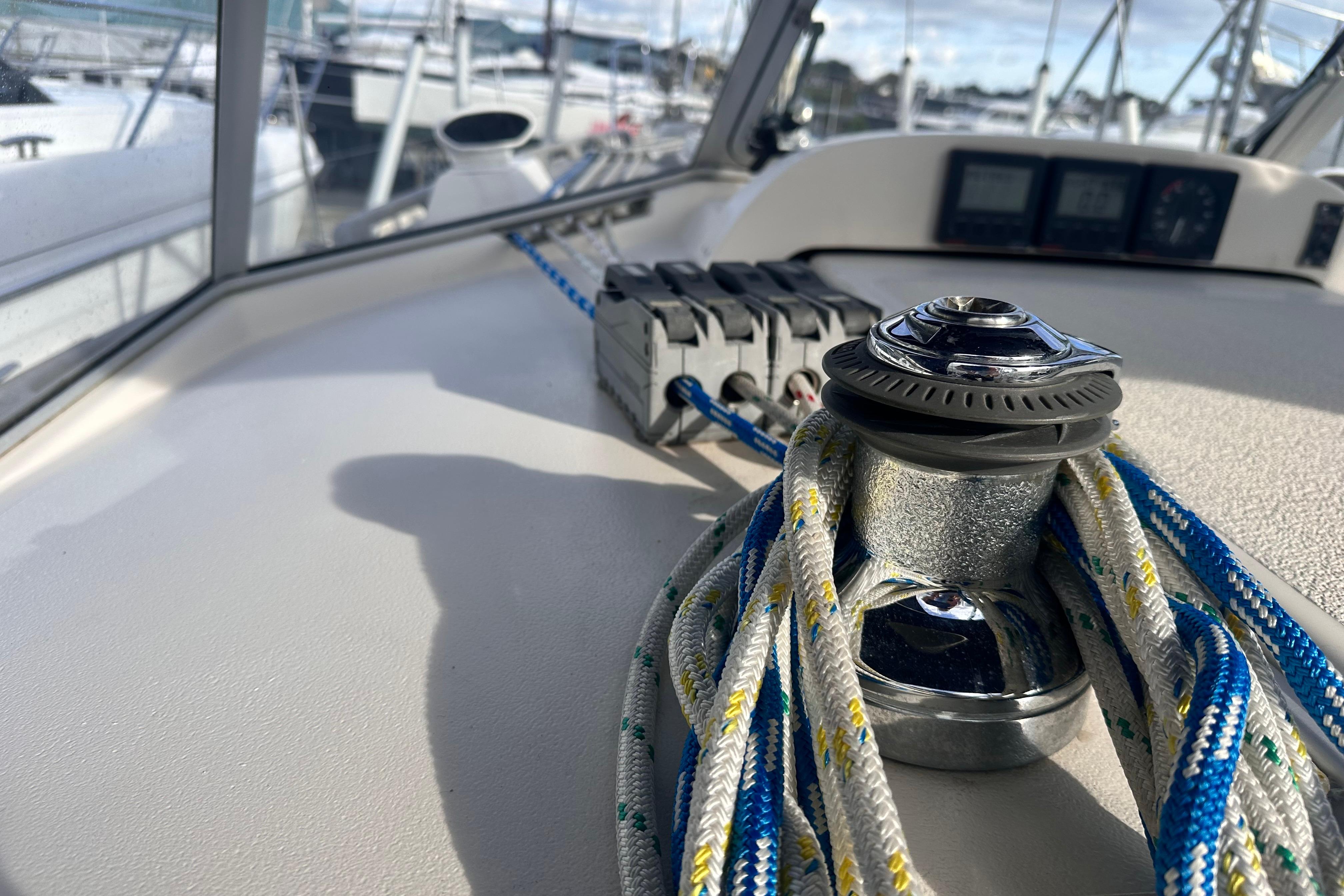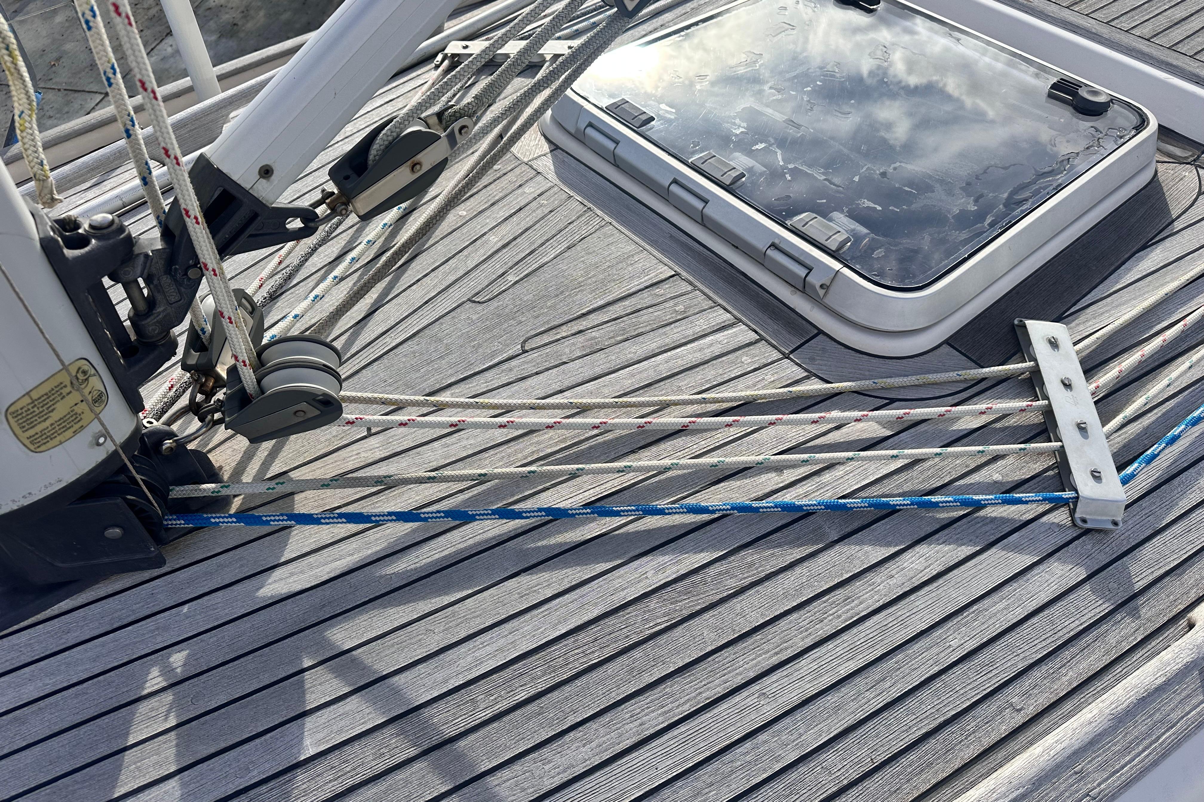 Halyards and lines lead into cockpit through 8 jammers to two winches under the windscreen