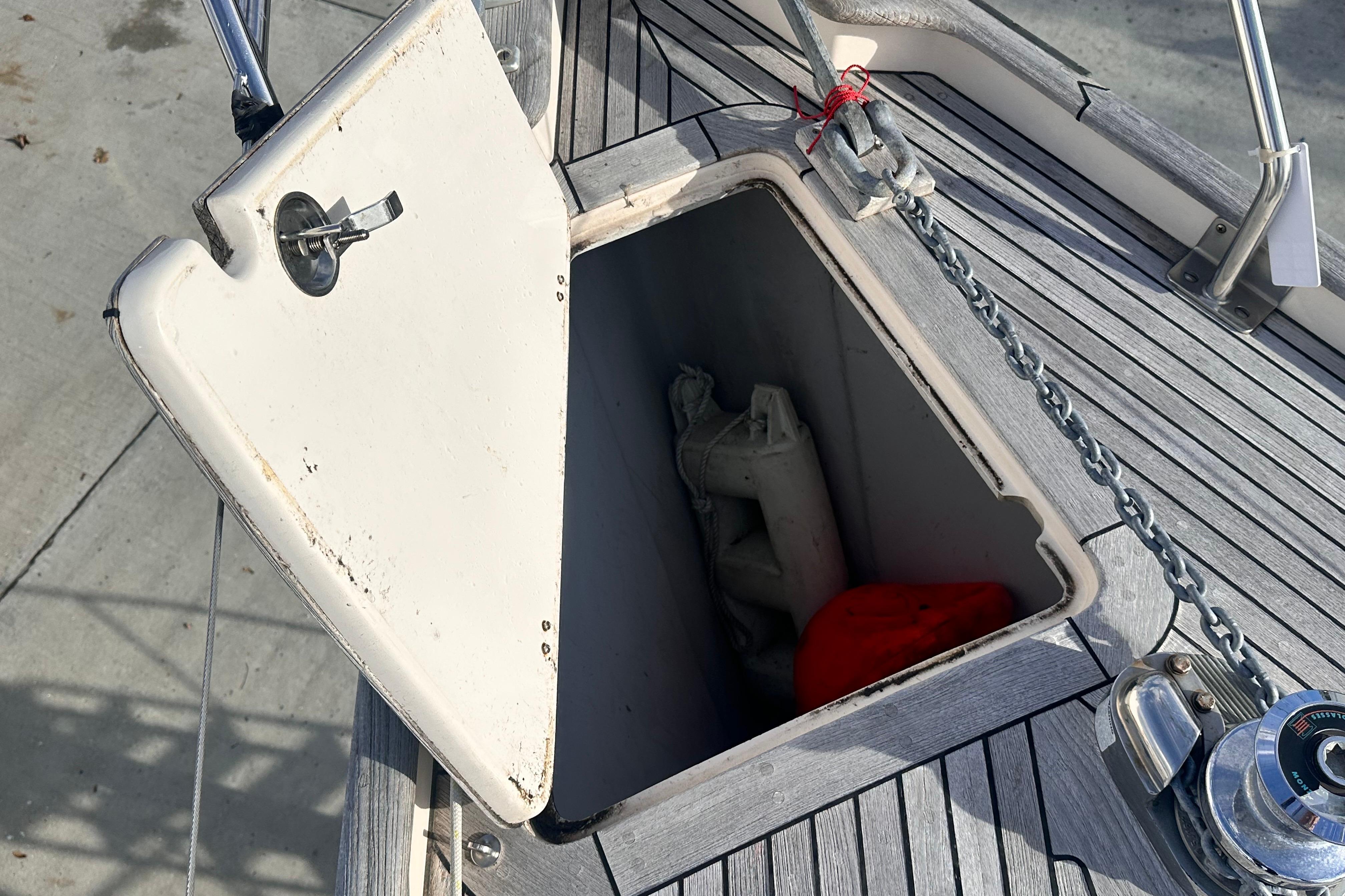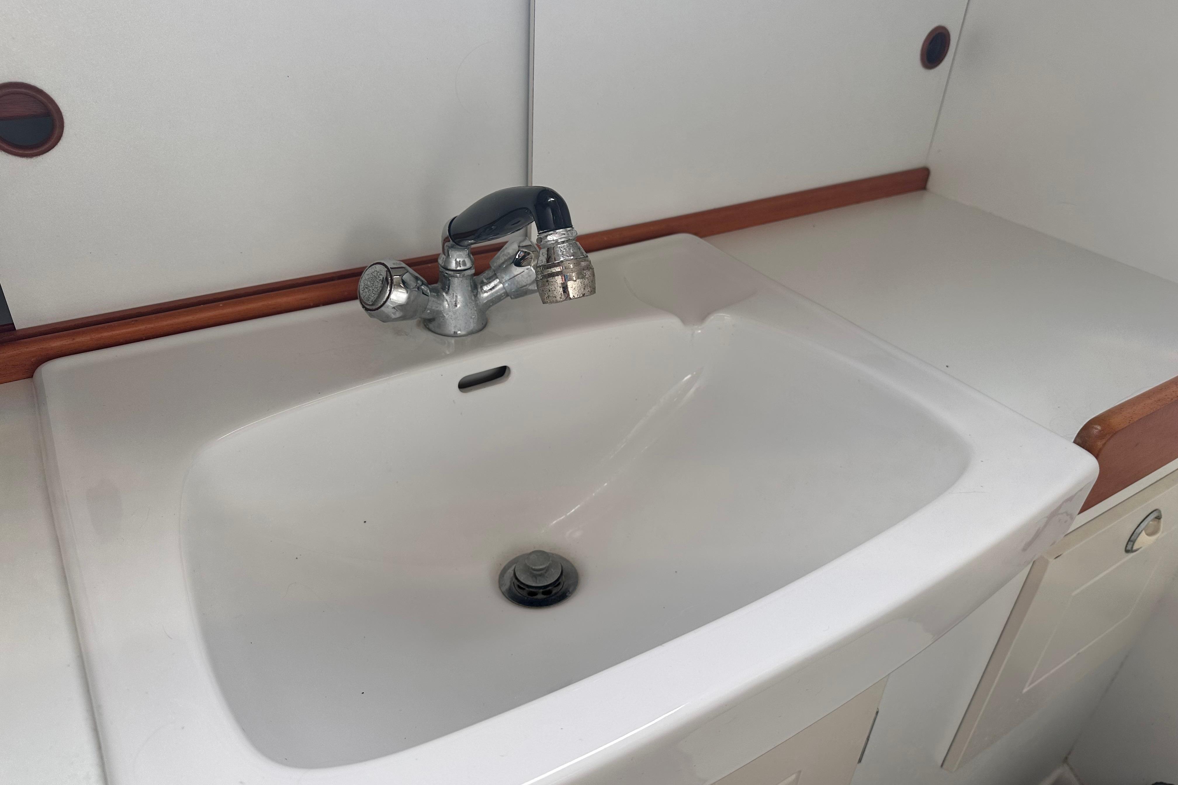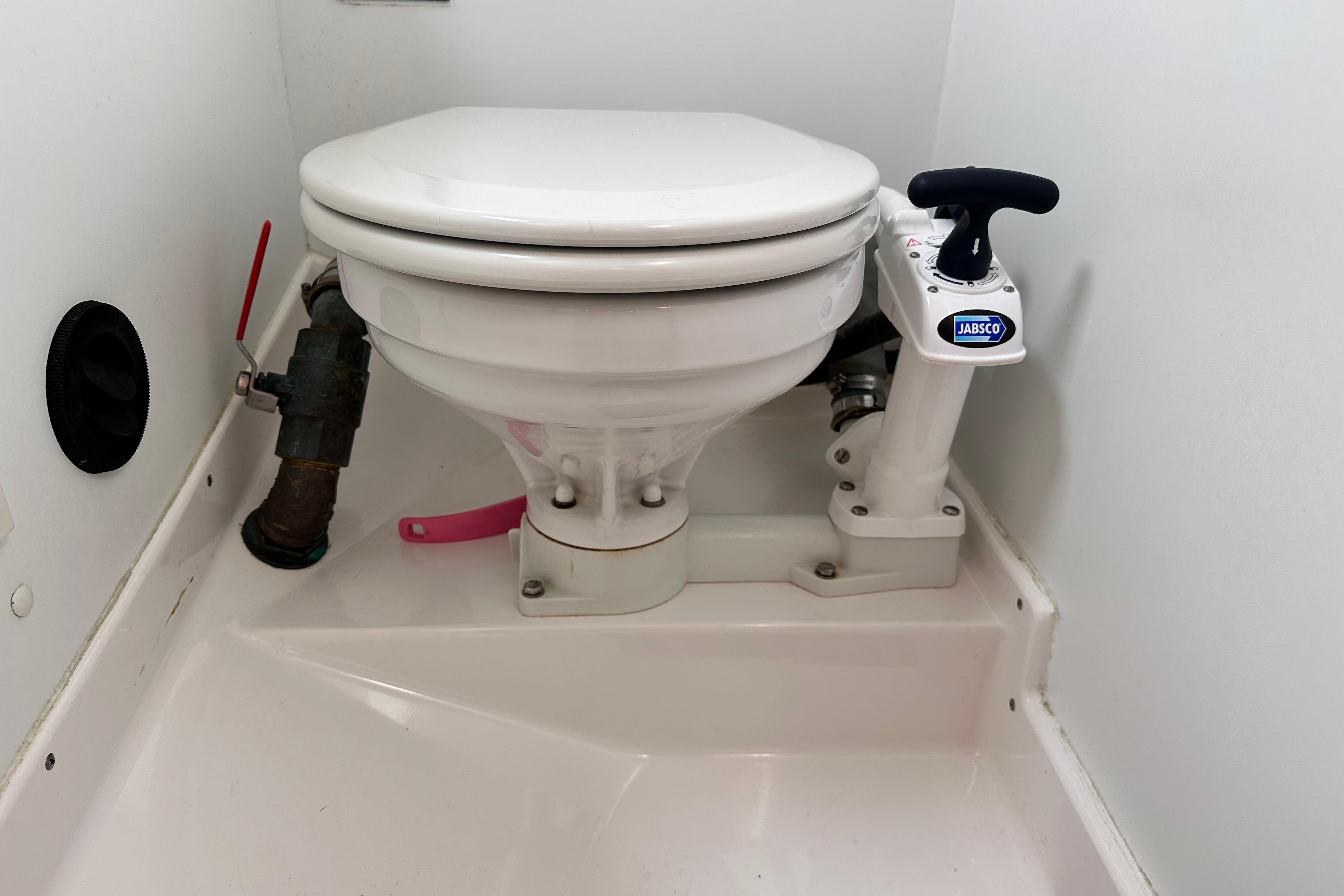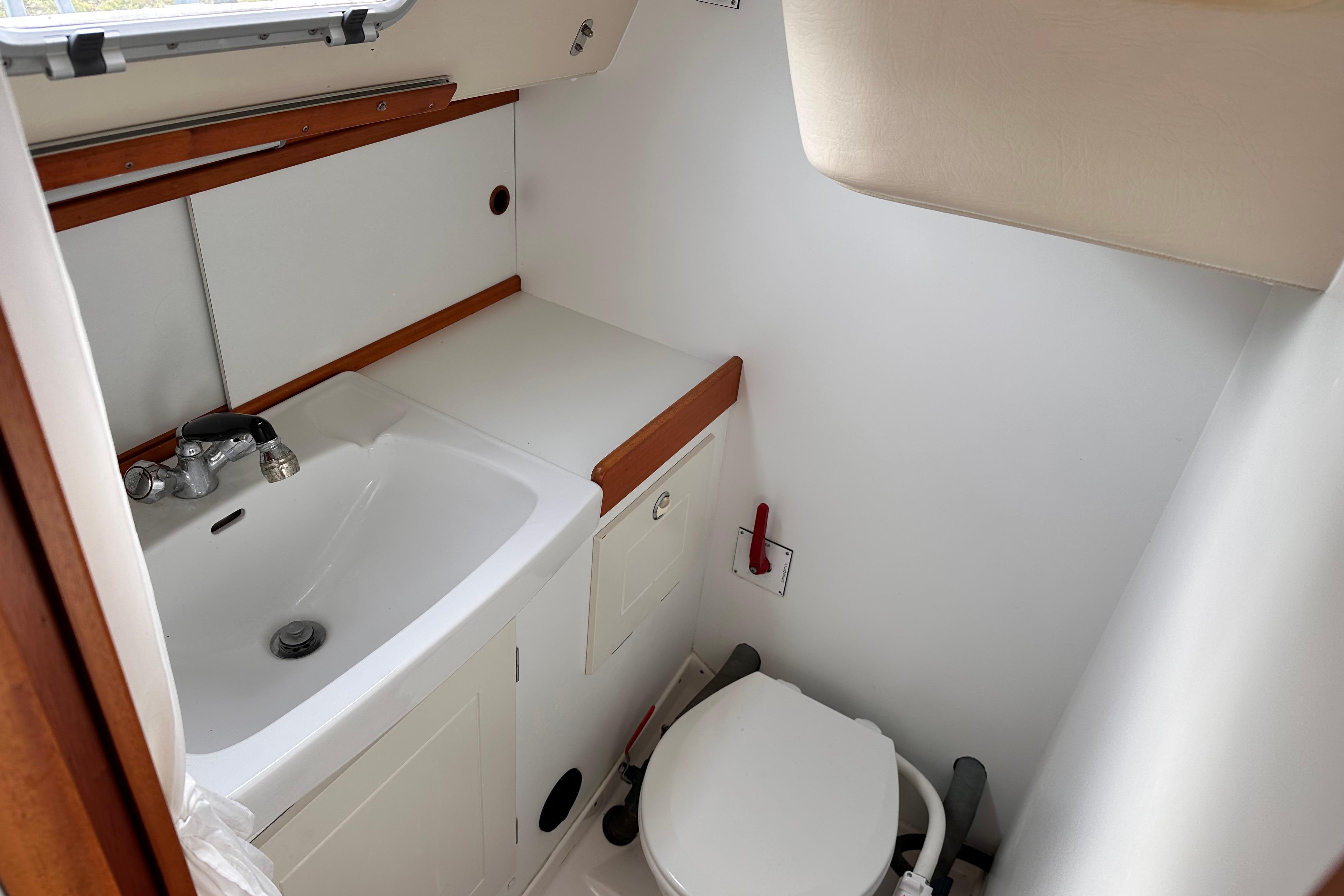 - HEADS COMPARTMENT: Interior lining and lockers in white laminate. Watertight shower stall with teak grating. Manual pump action sea toilet. Stainless steel holding tank, can be emptied by gravity or deck pump-out. Porcelain wash basin with stowage above and below. Mirror. 2 Opening ports for ventilation.