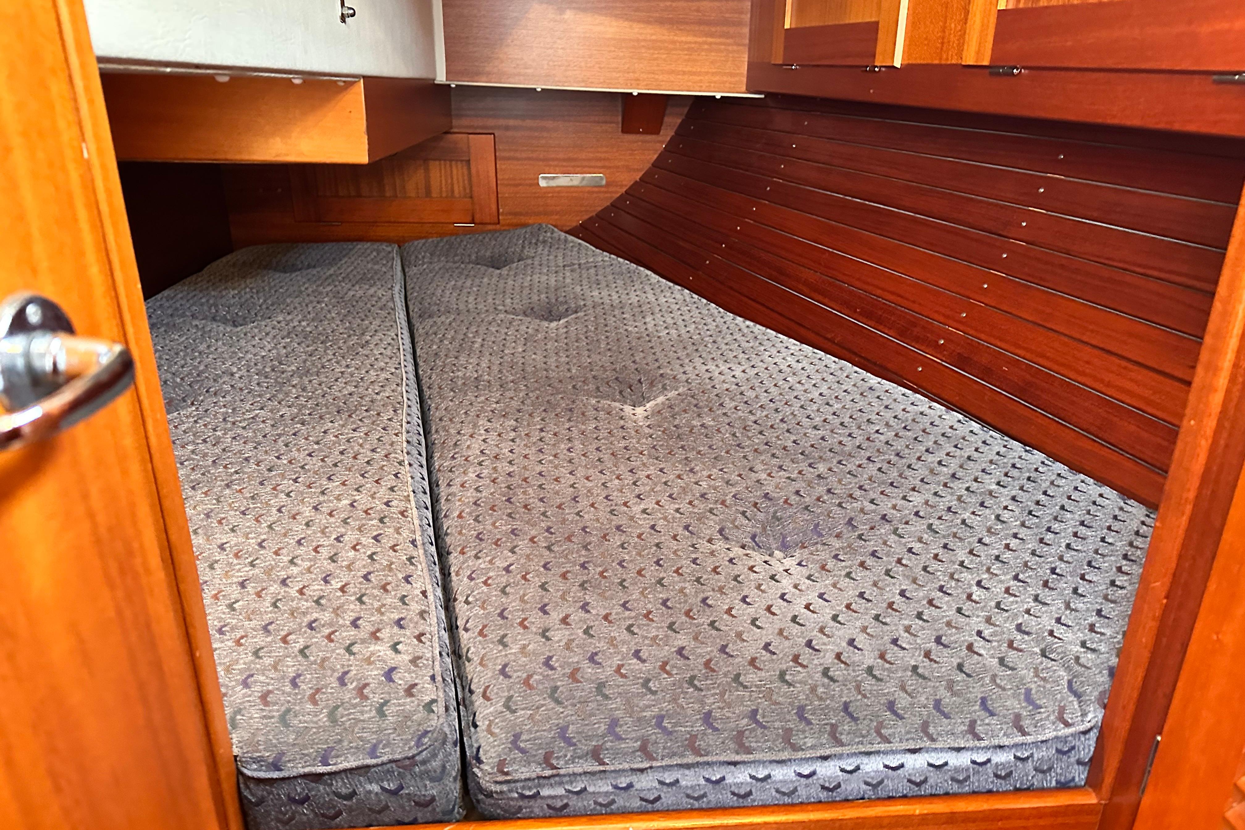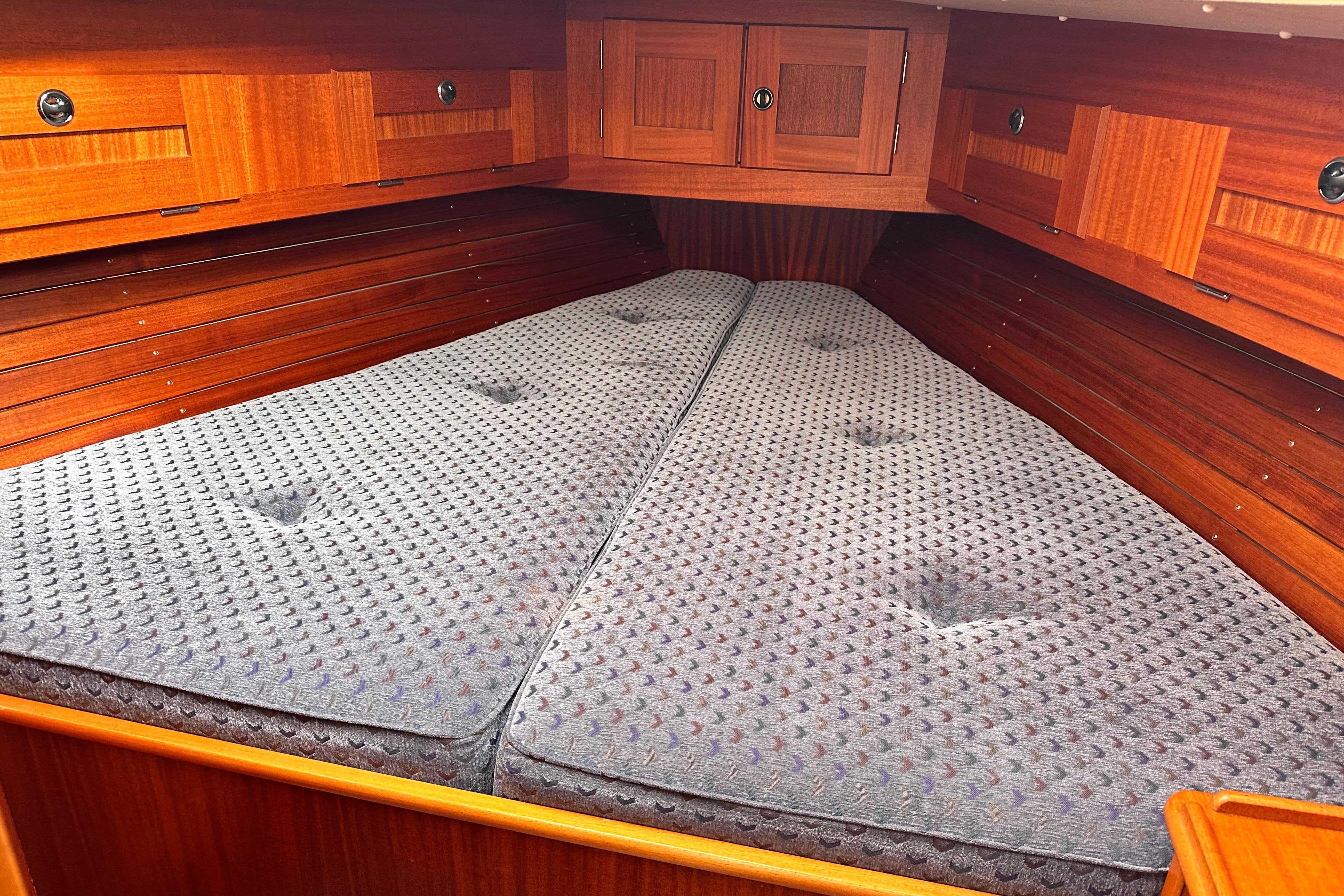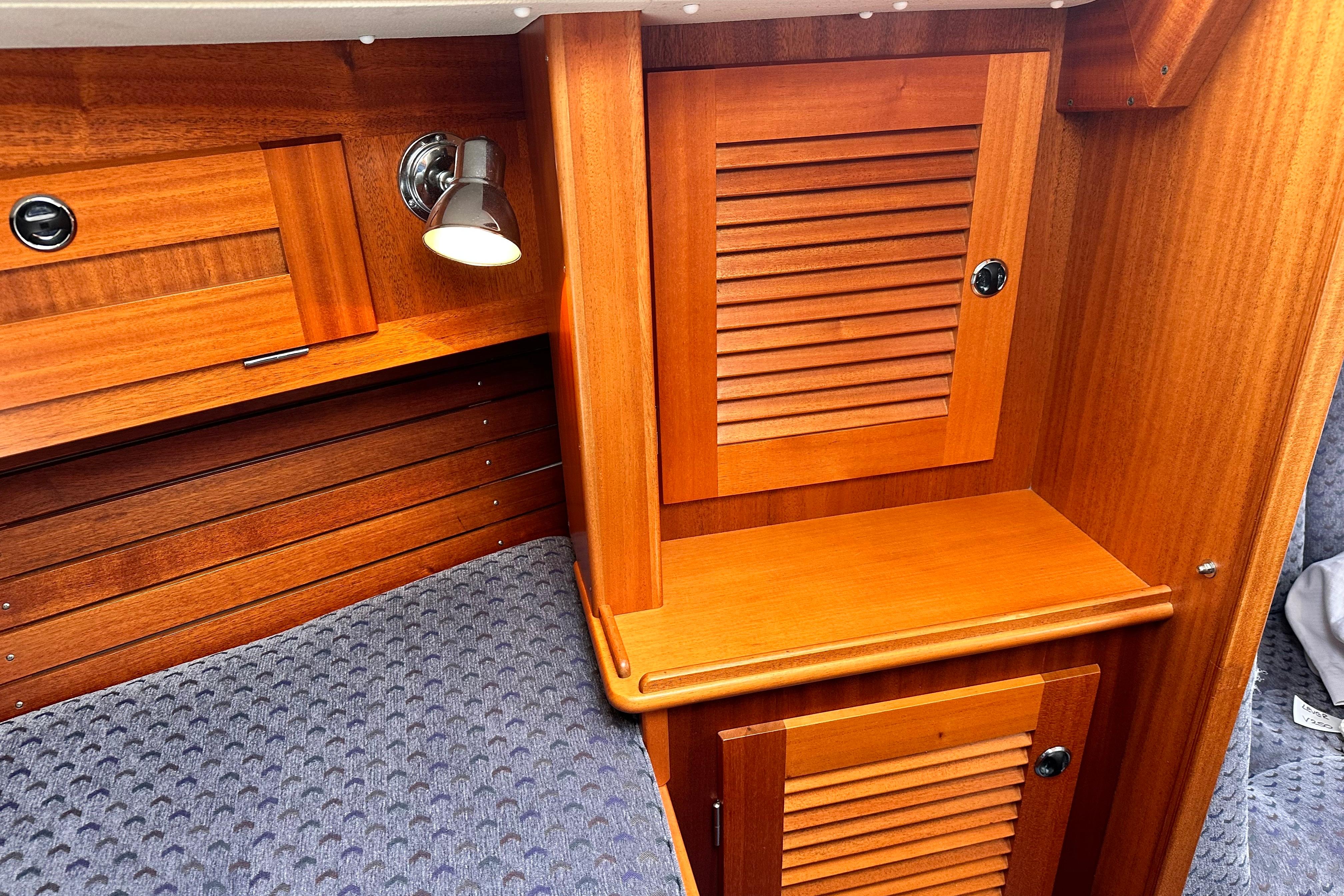 - FORWARD CABIN: Double berth 2.03m long and 2.04m wide at the widest part. On both sides, there are lockers above and generous stowage below. Hanging locker on the port side and various lockers on the starboard side. Door leading to saloon.