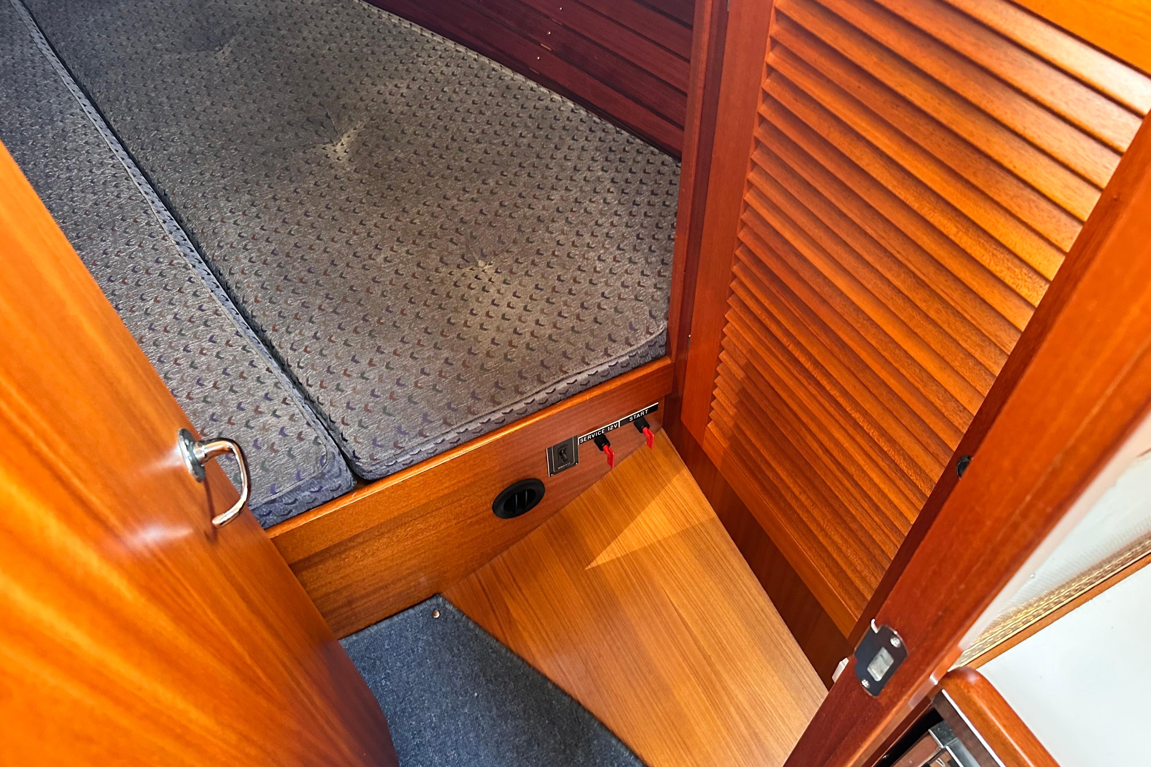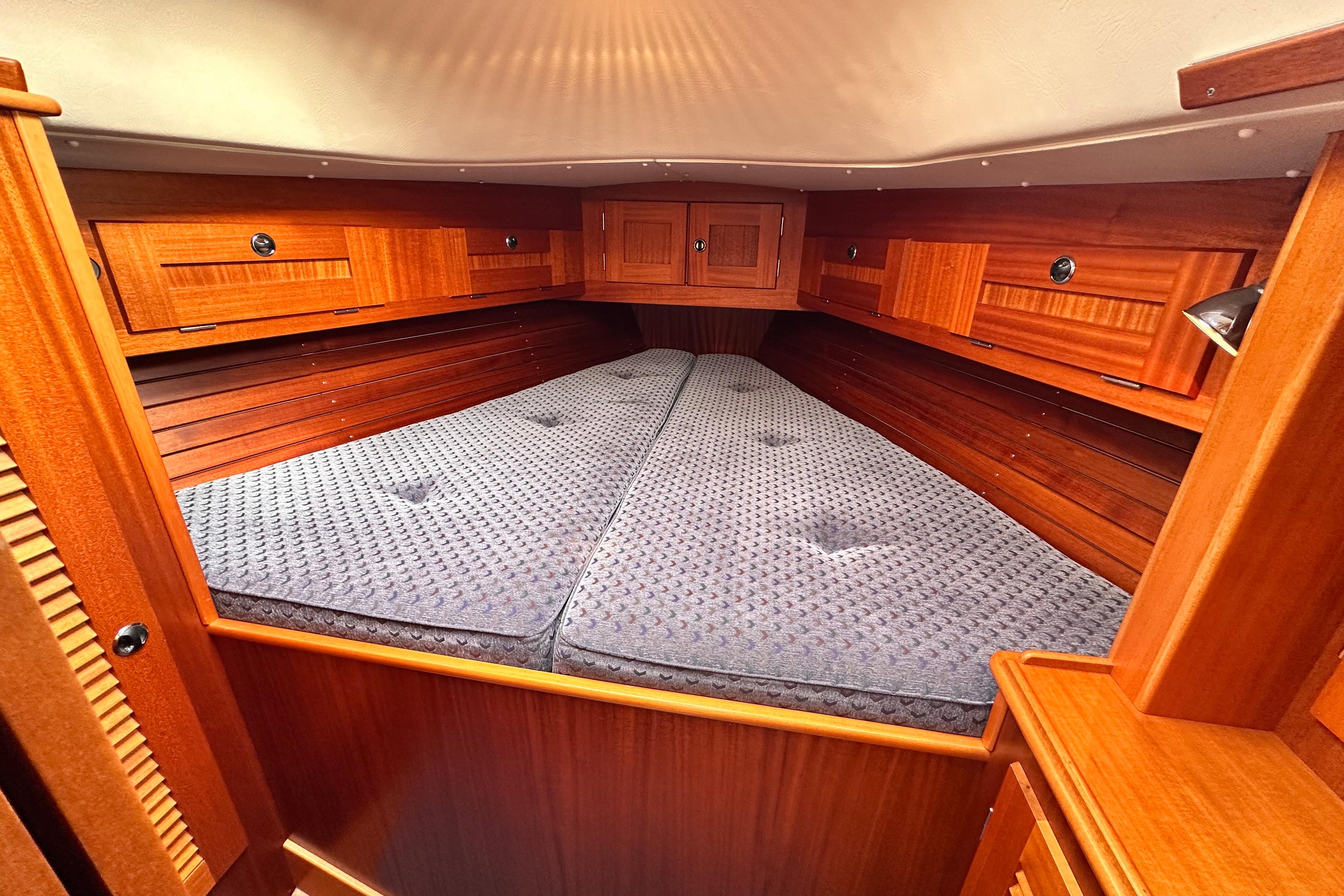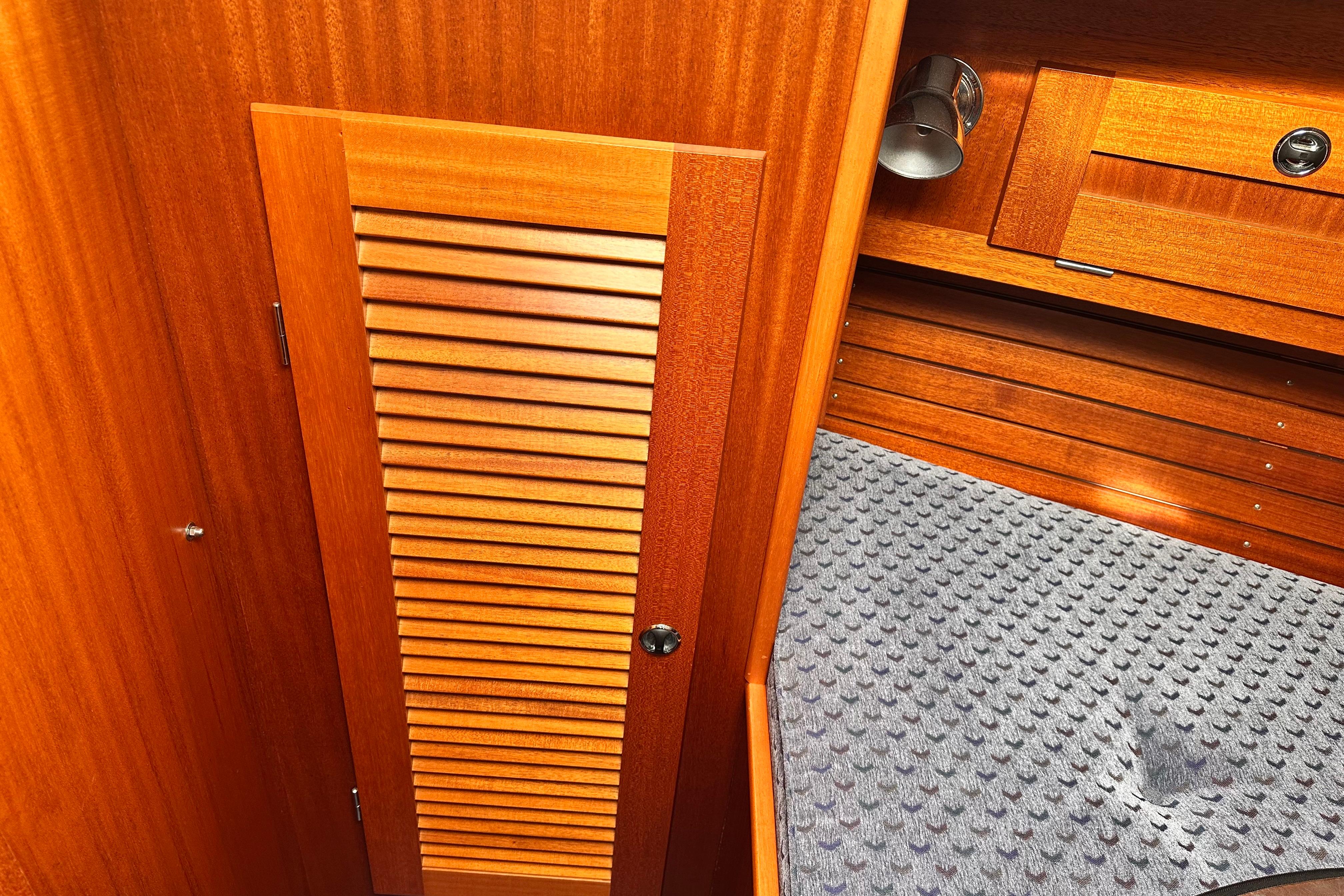 - FORWARD CABIN: Double berth 2.03m long and 2.04m wide at the widest part. On both sides, there are lockers above and generous stowage below. Hanging locker on the port side and various lockers on the starboard side. Door leading to saloon.