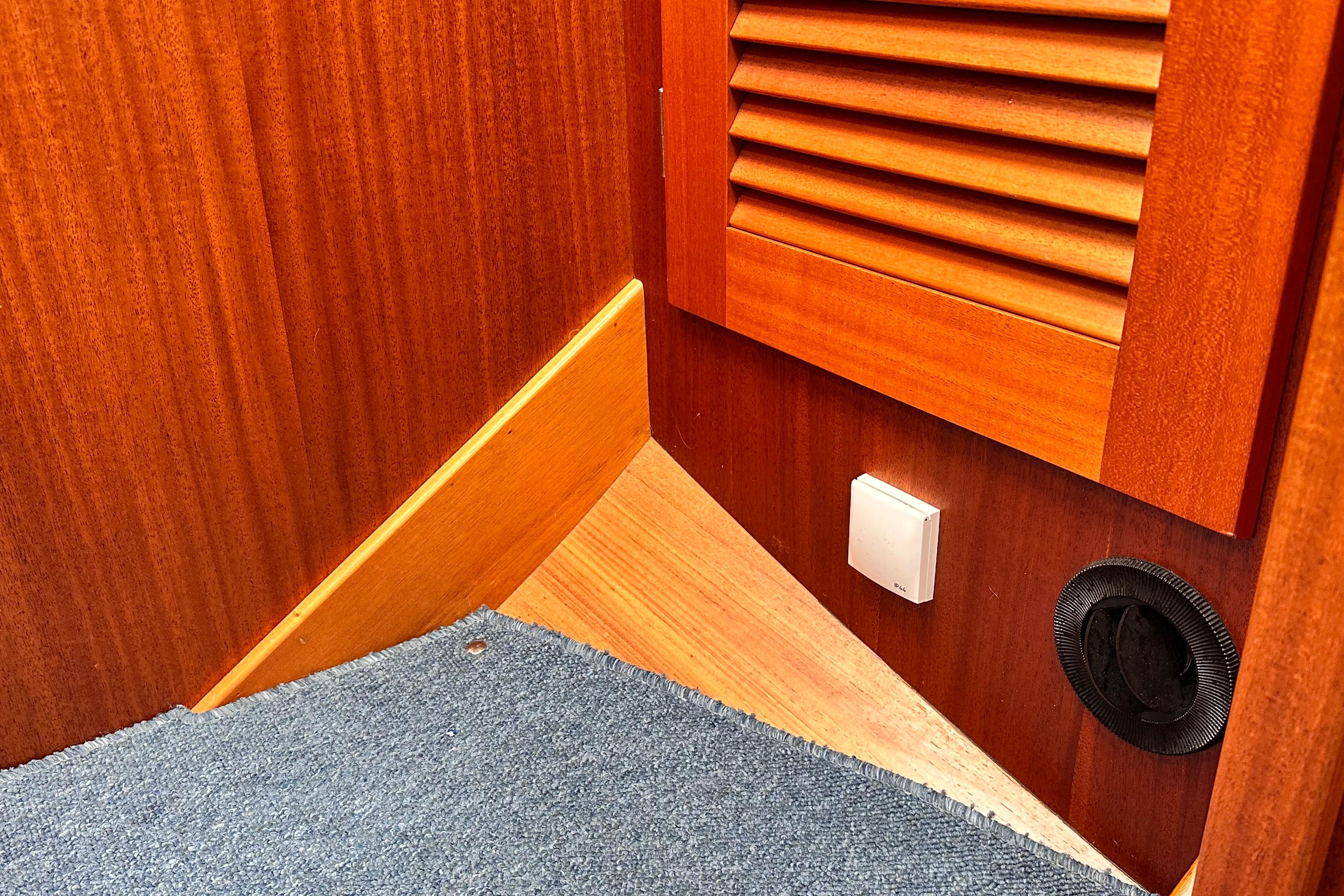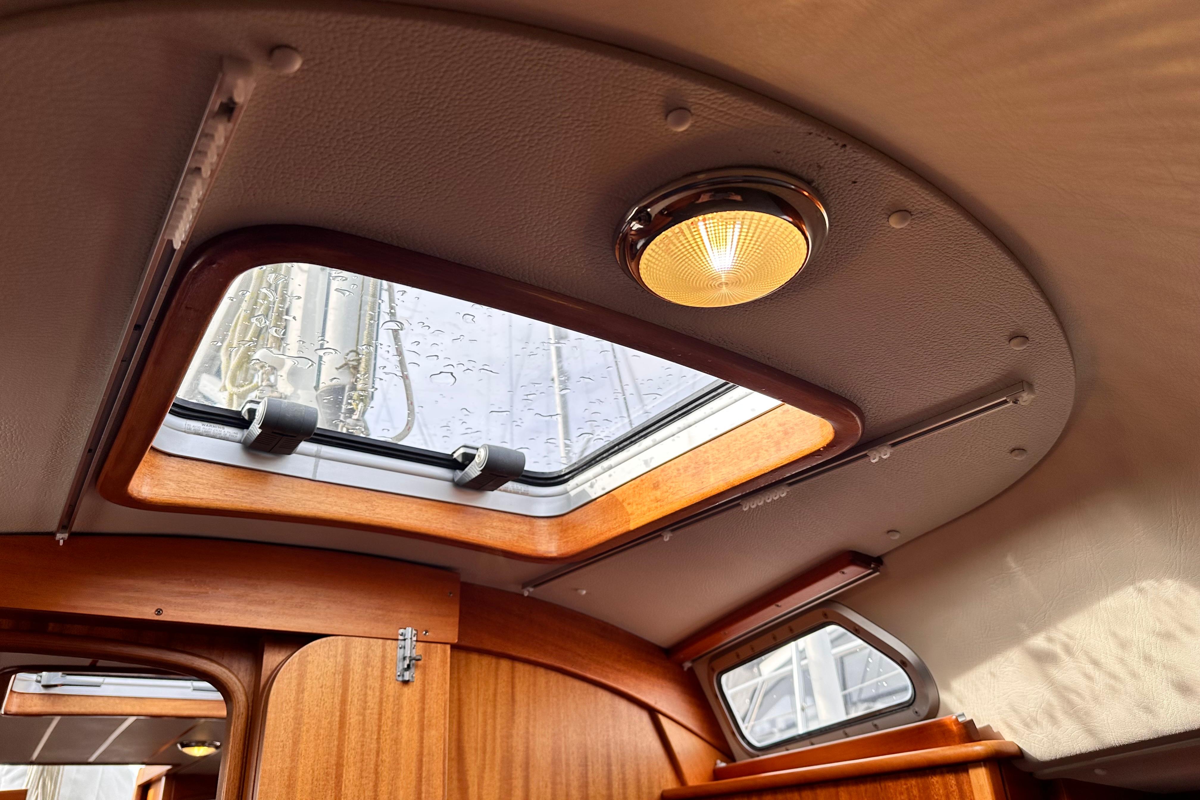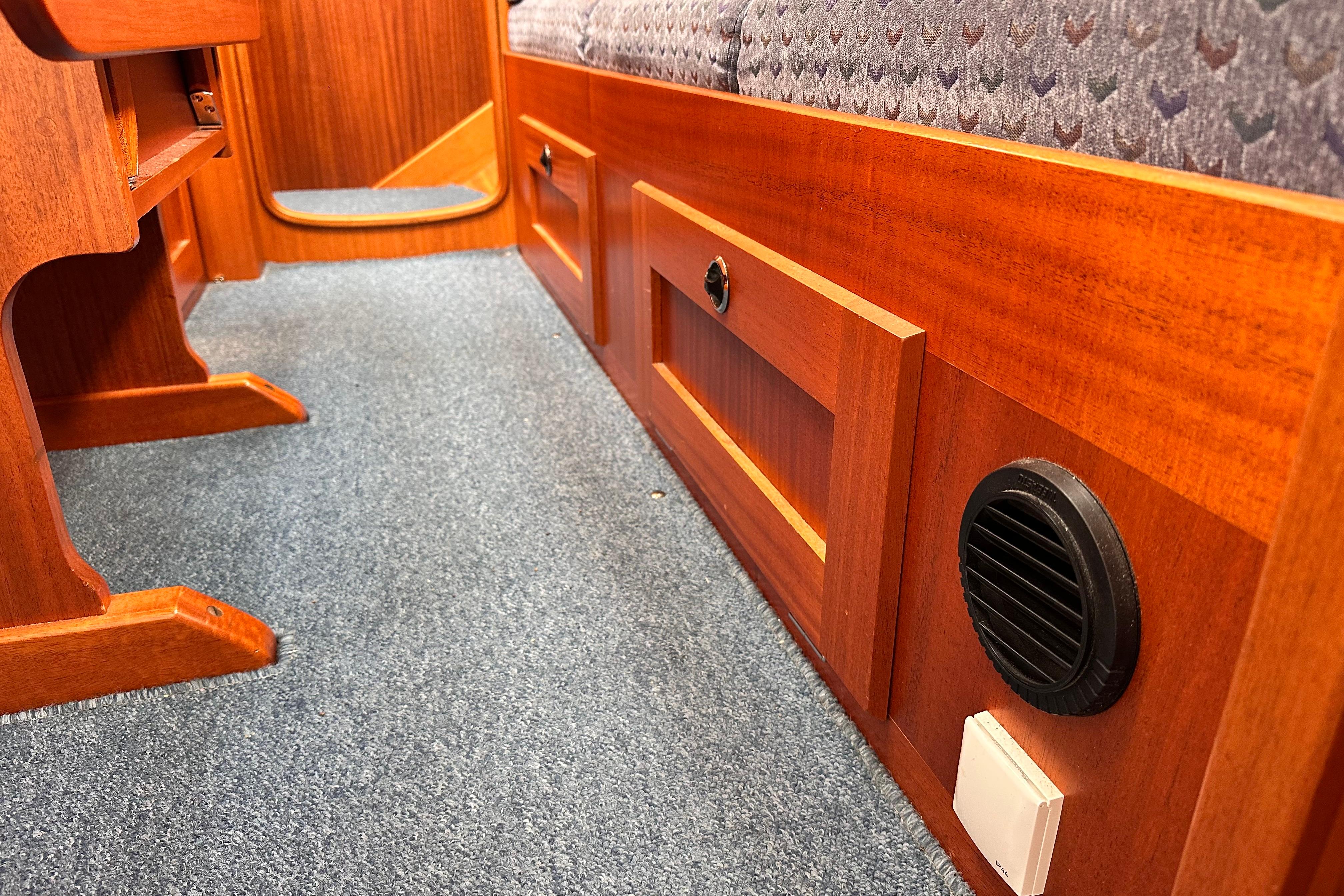 Interior finished in mahogany with matt silk varnish. Full headroom throughout the boat. Blinds to cabin and head portlights. Carpet over varnished sole boards of teak with inlaid holly inlay. Ivory headlining accentuated with mahogany inlays. Webasto cabin heating with outlets in all cabins.
