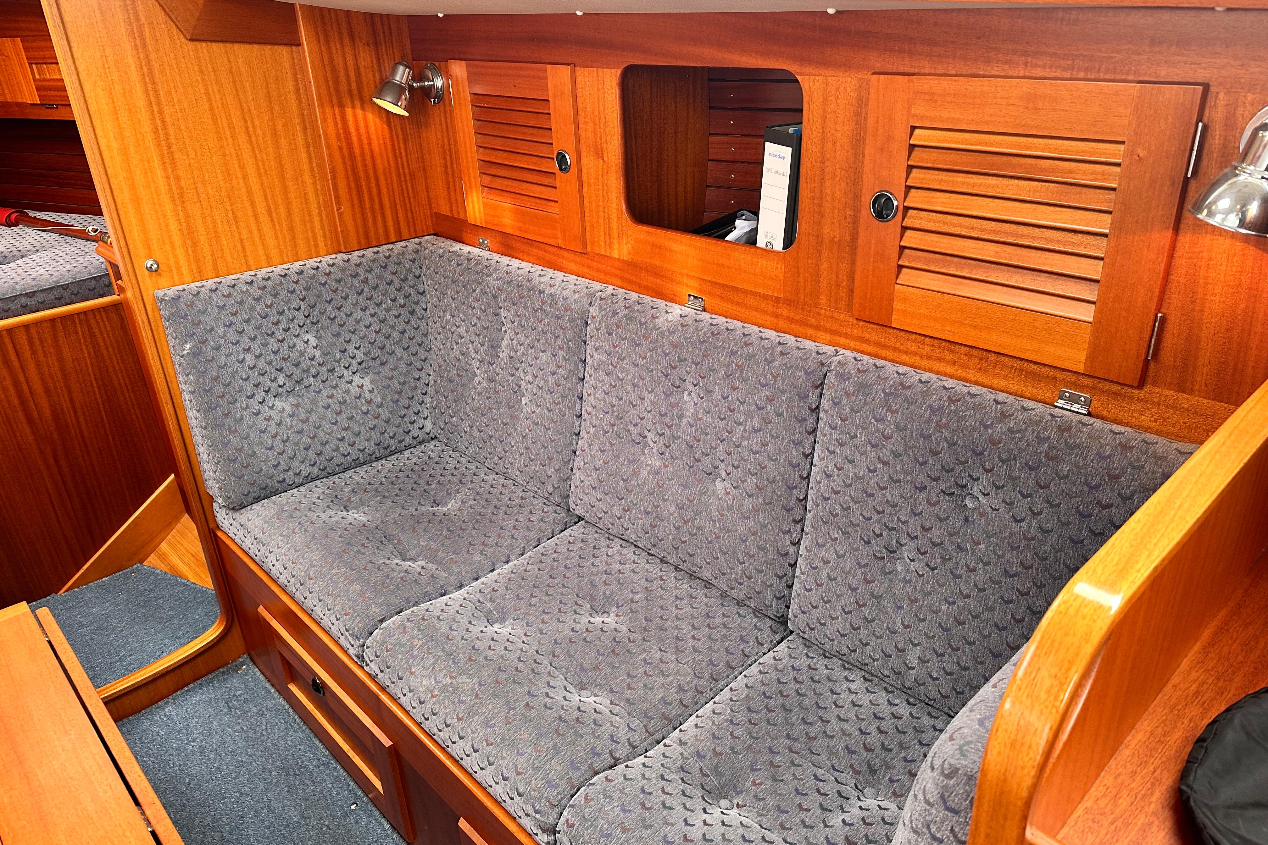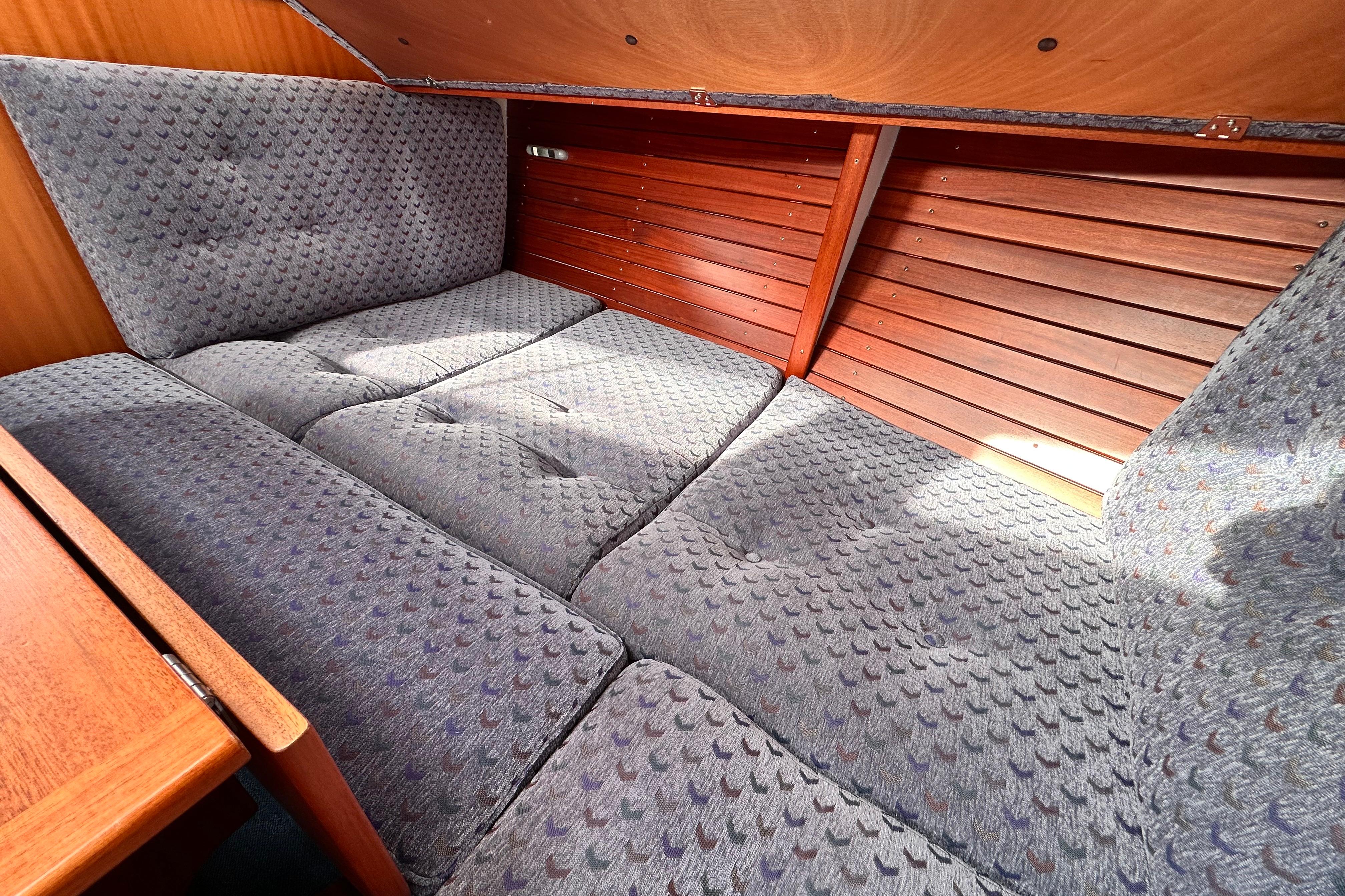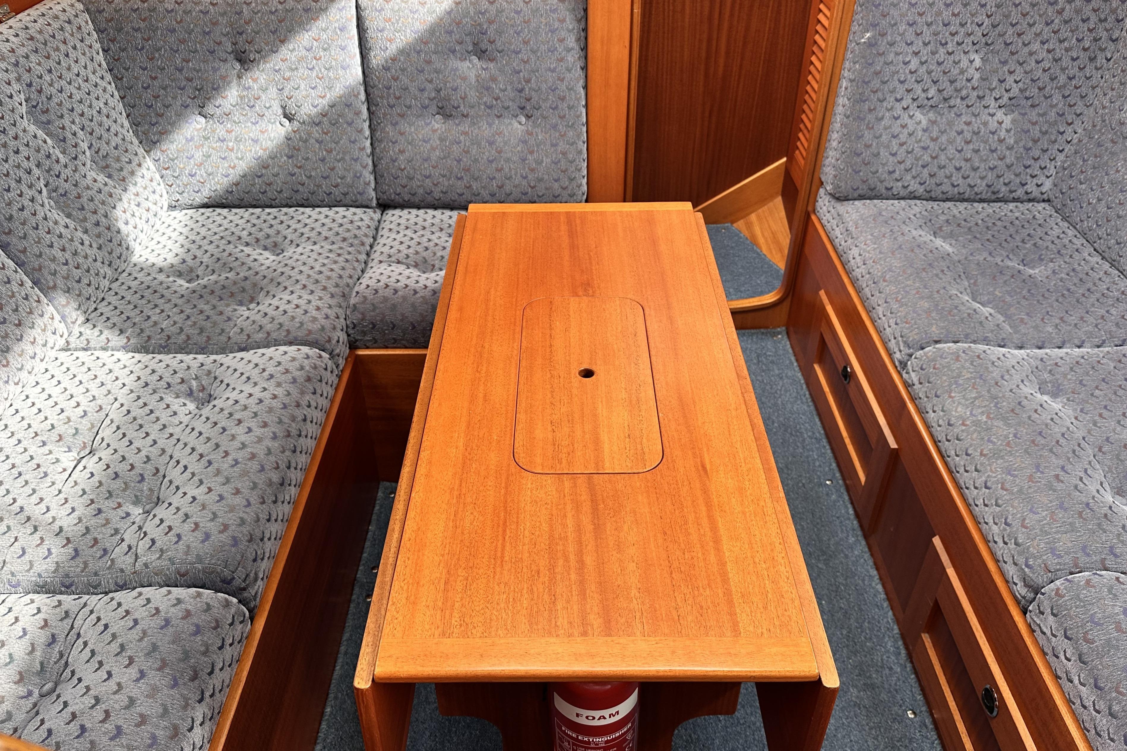 - SALOON: Two sofas, starboard side 2.16m and on port side a 1.84m long L-shaped sofa with lockers above and stowage space underneath. Infill extension to L-shaped sofa to make double berth. Stbd saloon berth extended. Lee cloths port and starboard. Bookshelves on both sides. Centreline dropleaf table with bottle stowage in the centre section. Headroom 1.86m.