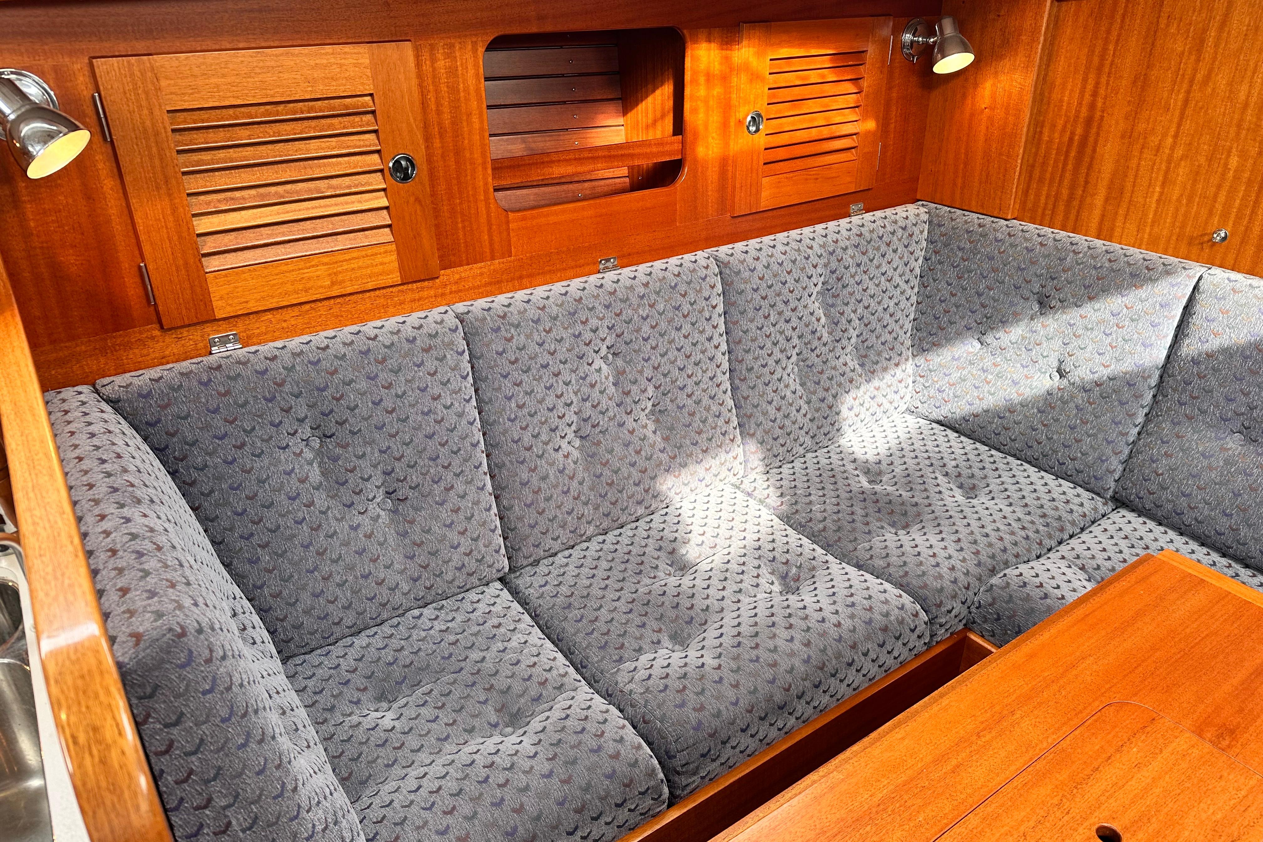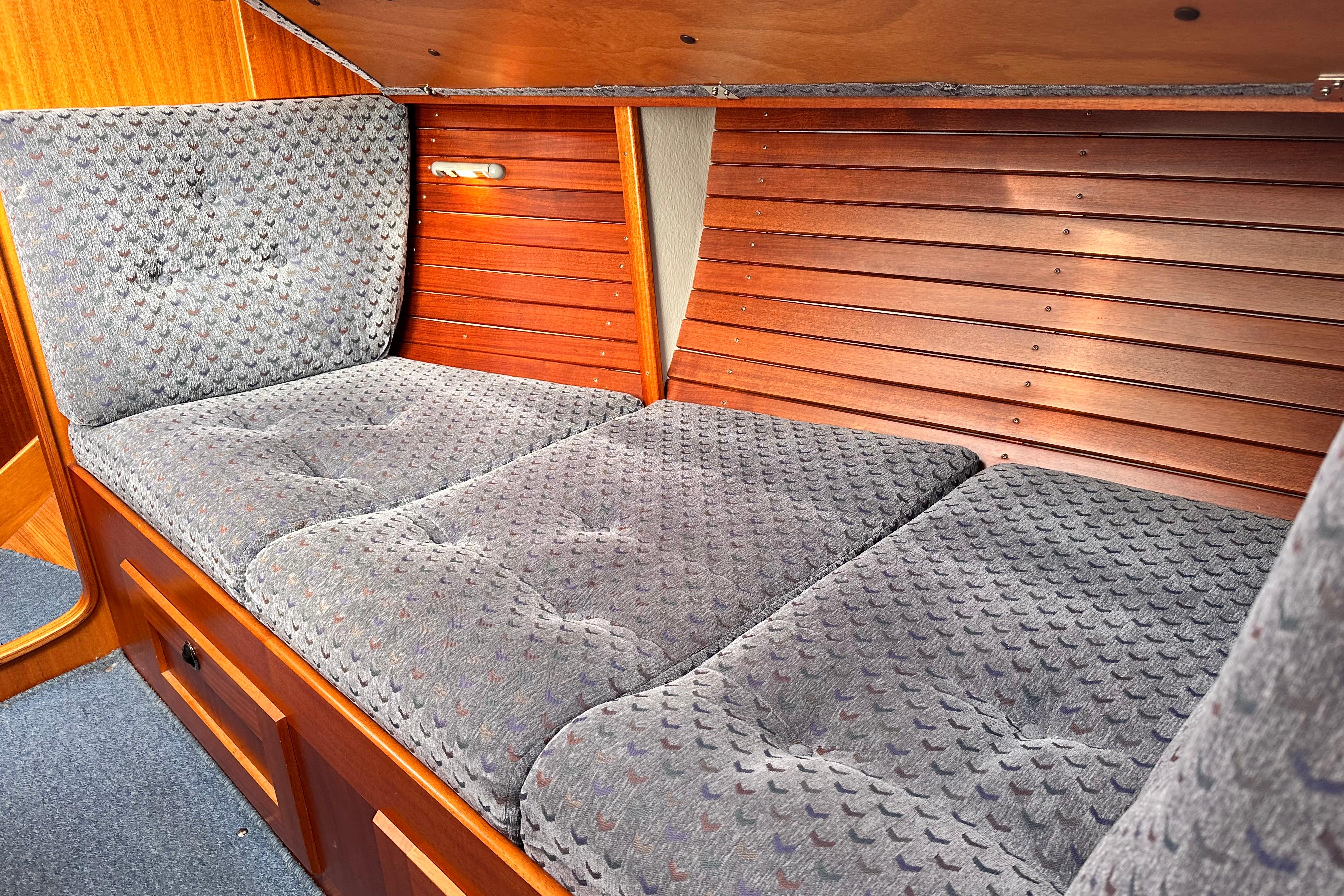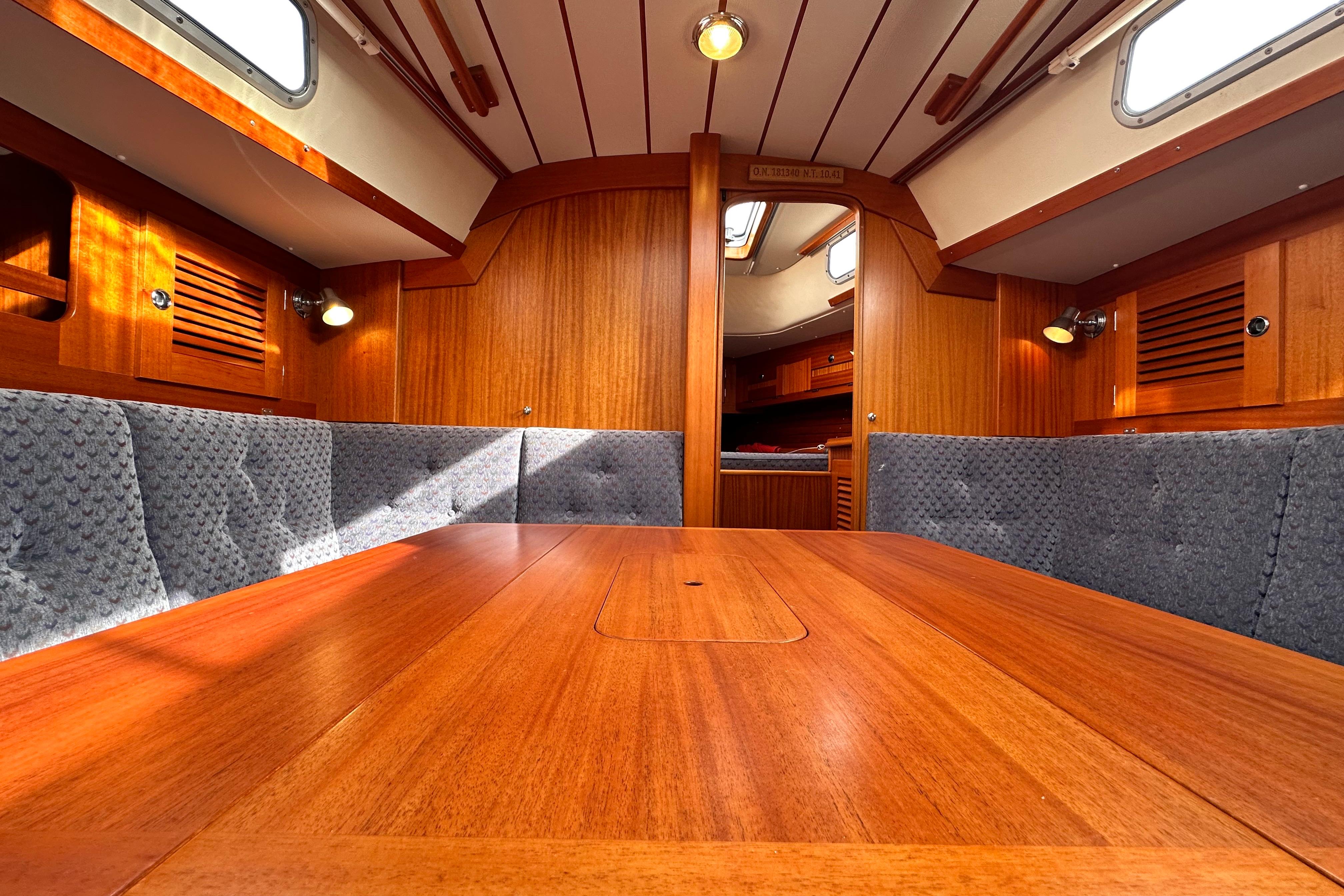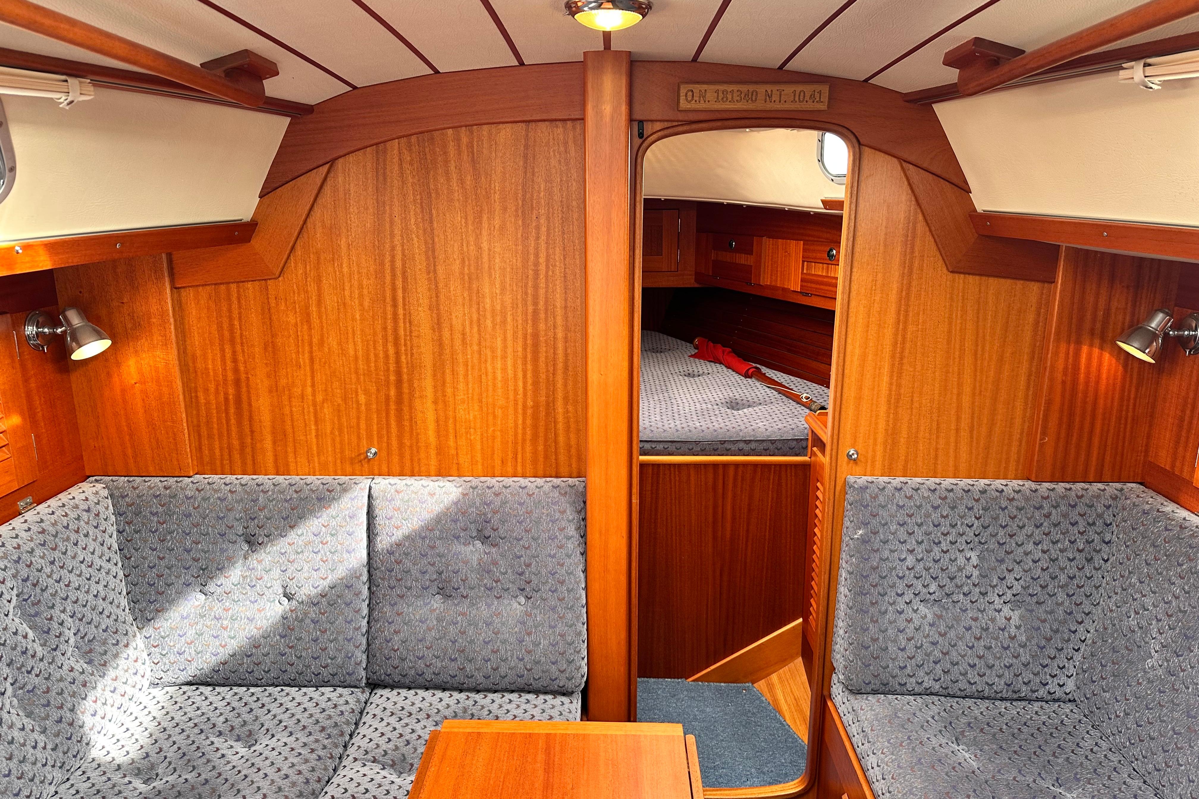 - SALOON: Two sofas, starboard side 2.16m and on port side a 1.84m long L-shaped sofa with lockers above and stowage space underneath. Infill extension to L-shaped sofa to make double berth. Stbd saloon berth extended. Lee cloths port and starboard. Bookshelves on both sides. Centreline dropleaf table with bottle stowage in the centre section. Headroom 1.86m.