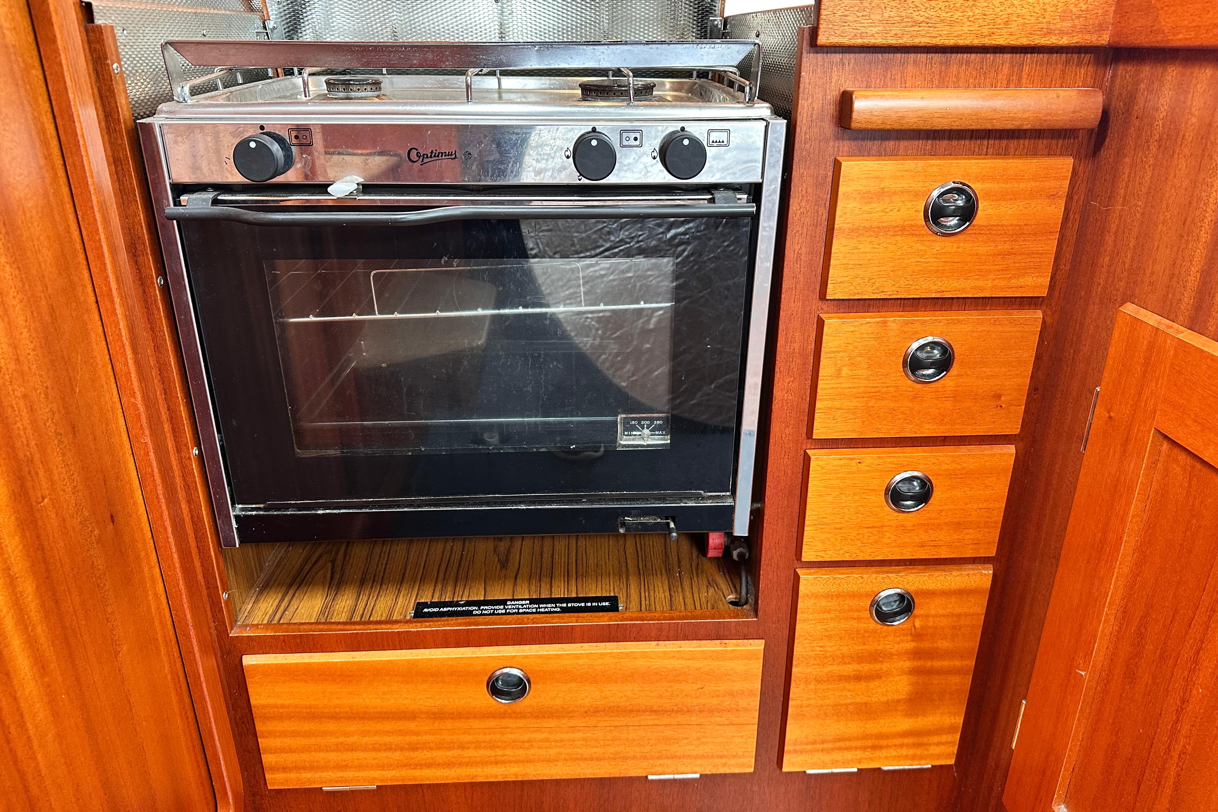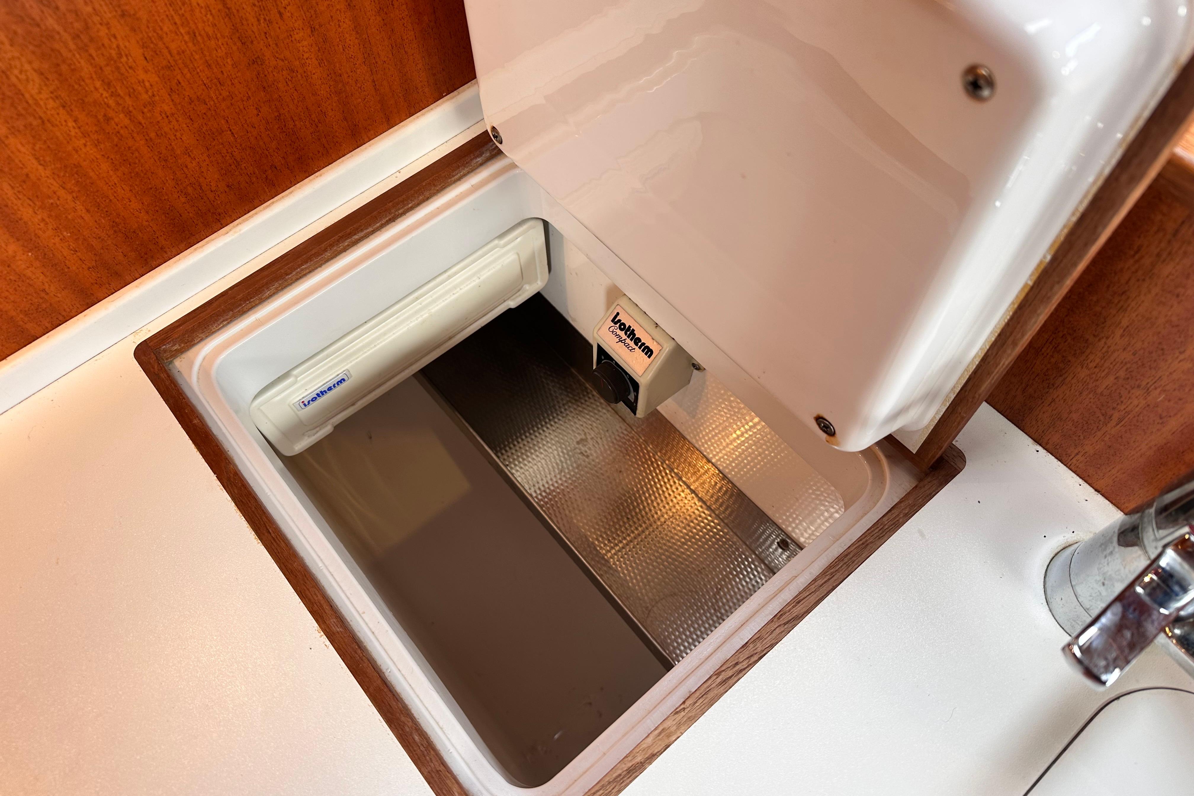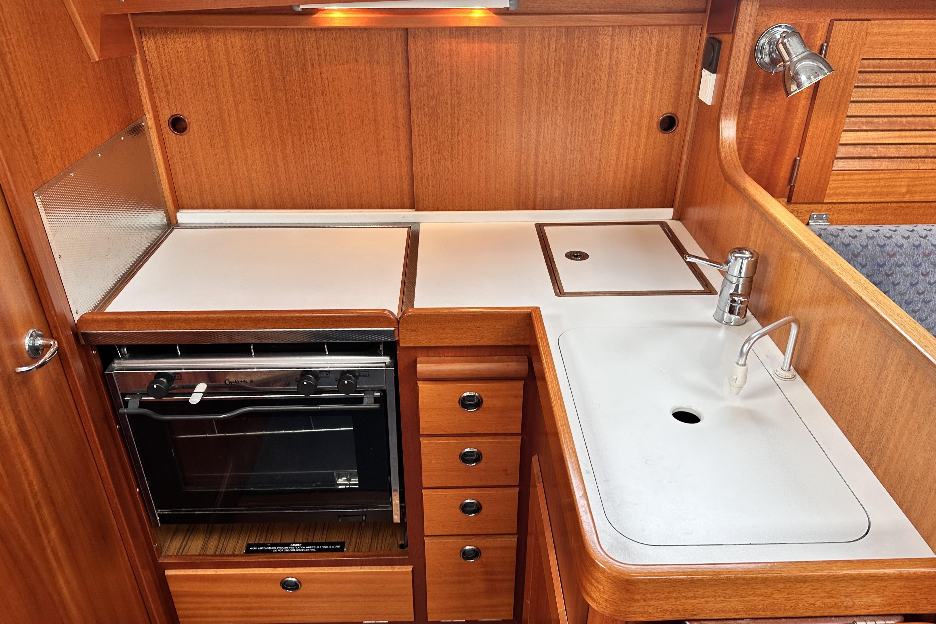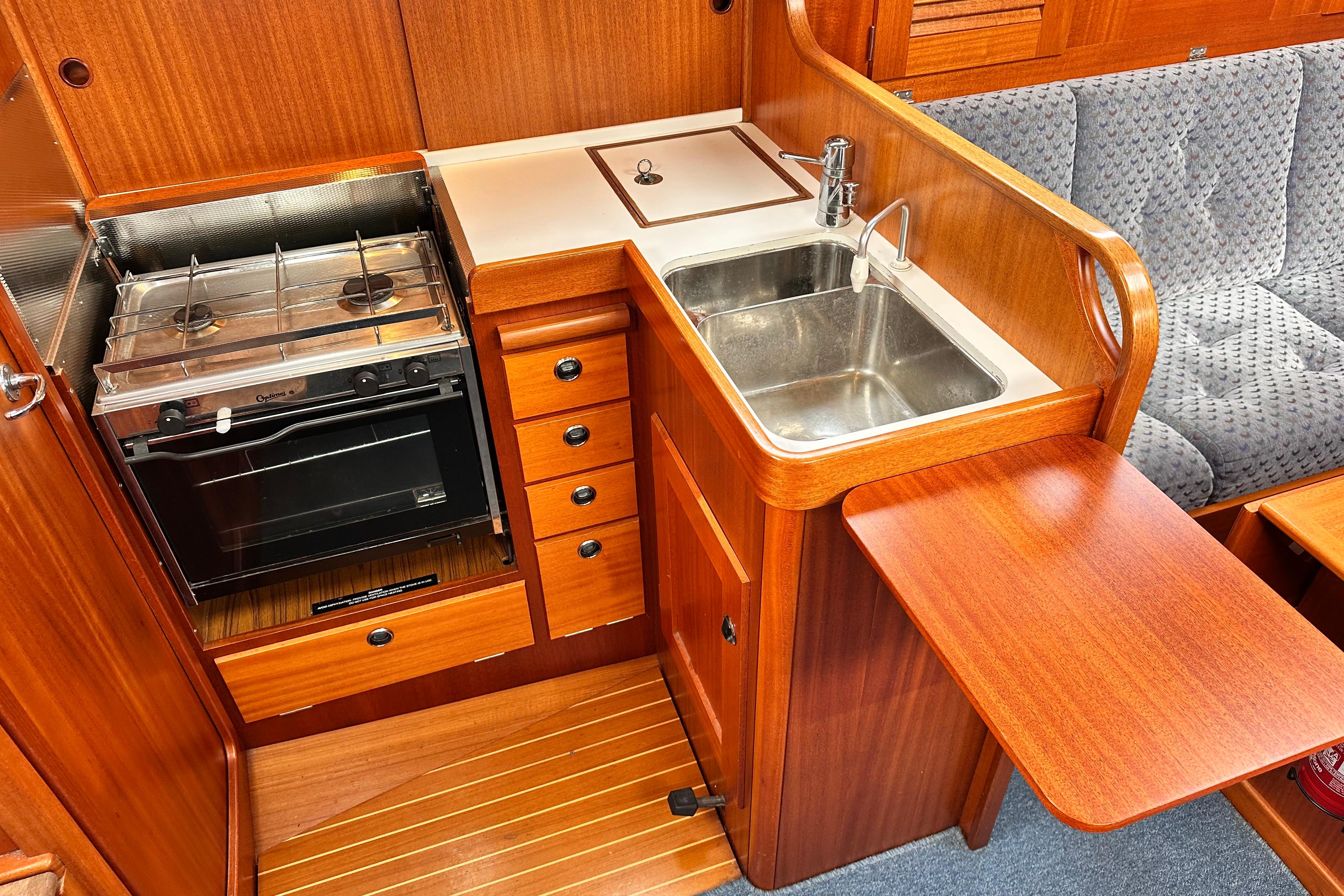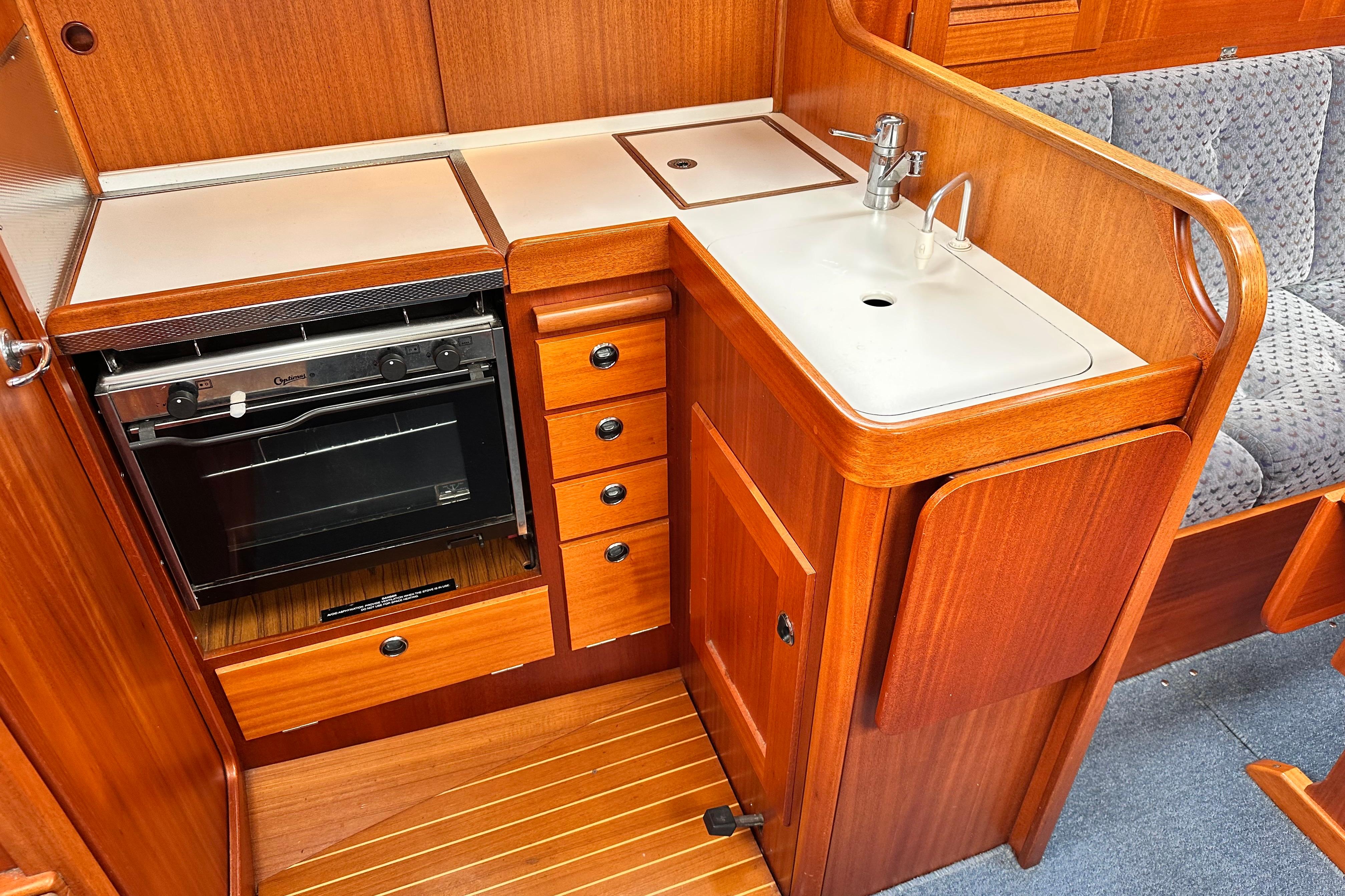- GALLEY: On port side with Eno Open Sea cooker with oven and 2 burner hob, complete overhaul and refurbishment 2021, deep stainless steel sinks. Stowage above and below work surface, chopping board, drawers and waste bin. Insulated coolbox with 12v refrigeration unit, New Danfoss control box fitted 2021. Opening window above the galley.