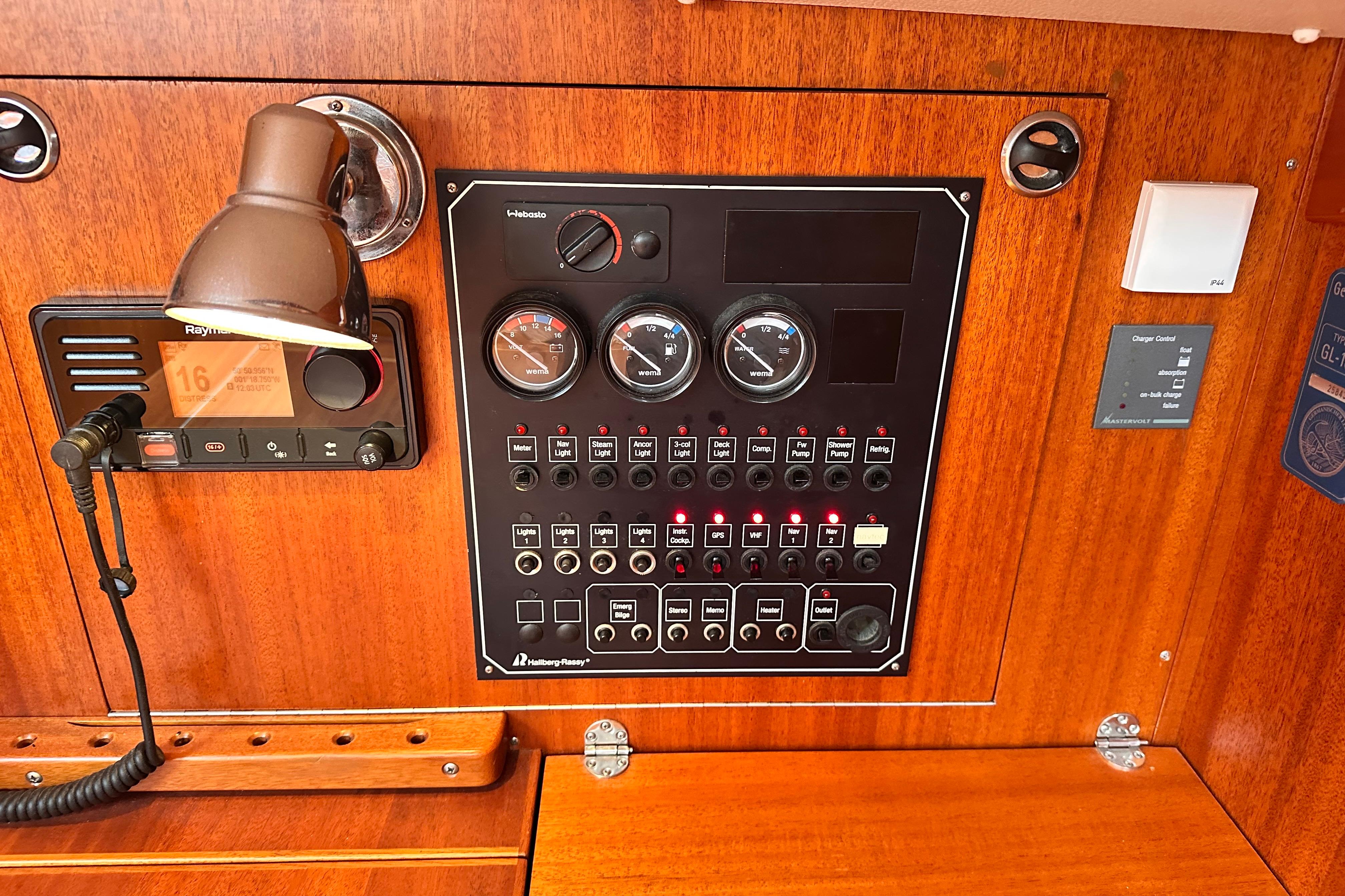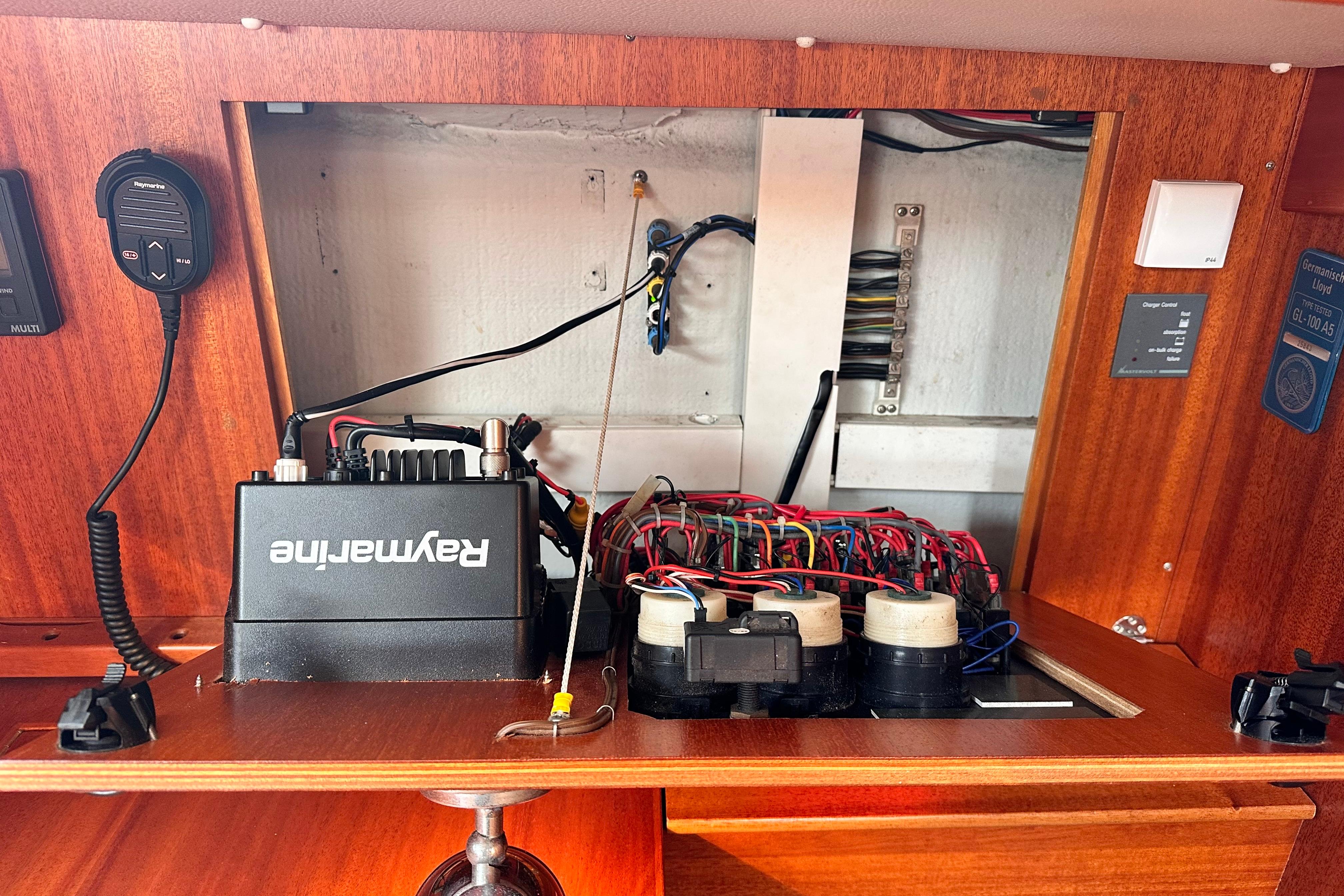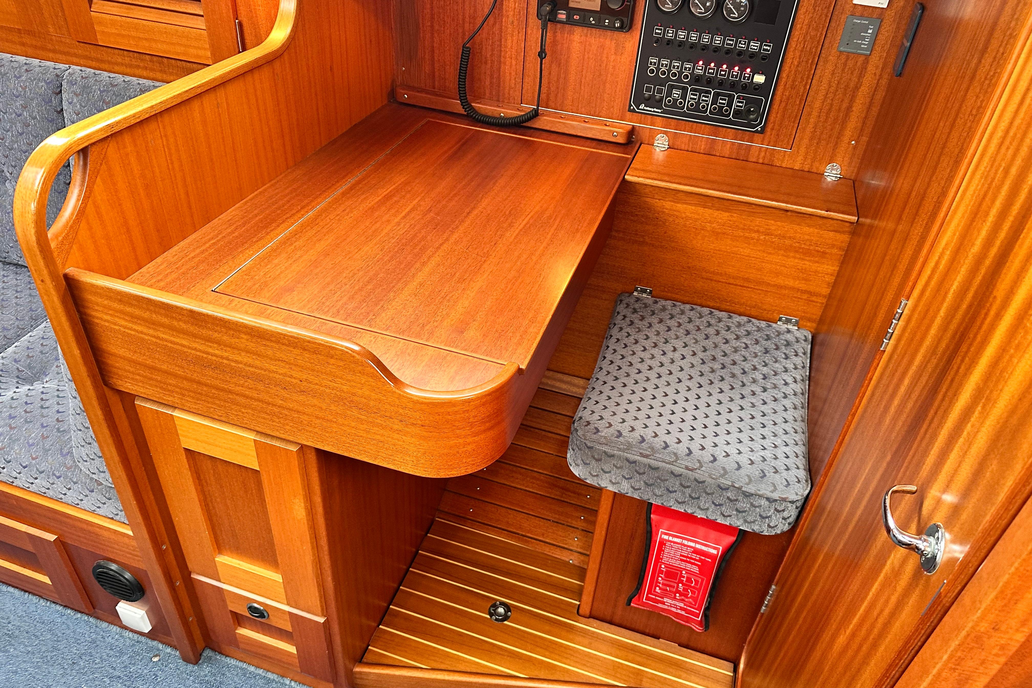 - CHART TABLE: Chart table with chart stowage under. Instrument shelf for navigation instruments. Electric switch panel. Comfortable navigator's seat with stowage under.