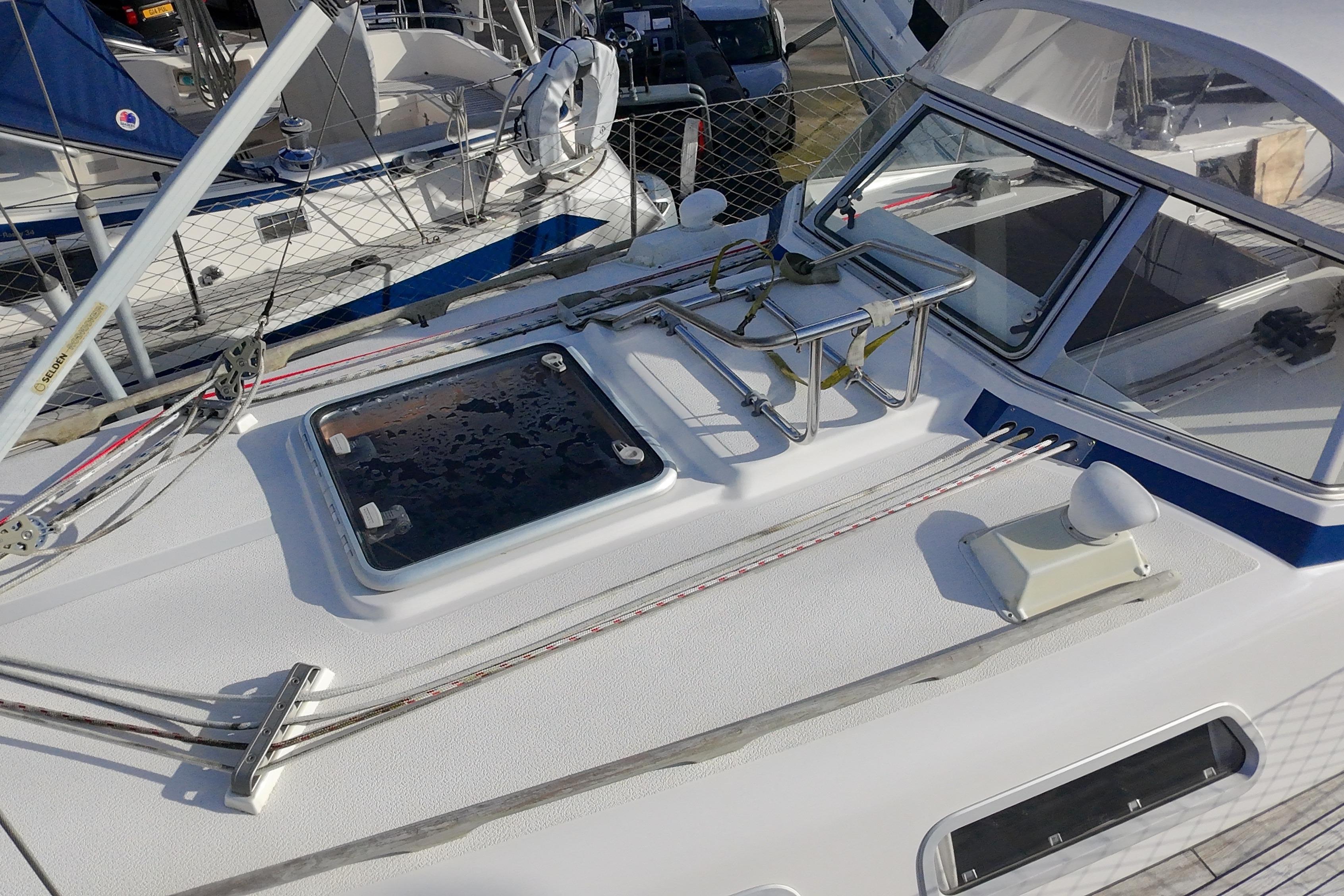 Double berth 2.14m long and 2.07m wide at the widest part. The foot end is 57cm wide. On both sides there are lockers above and generous stowage below the berth. Hanging locker and various lockers on starboard side. Vanity unit to port. Vanity mirror and coat hanger on on bulkhead Large opening deck hatch with Oceanair skyscreen. Two opening portlights. Door leading to saloon.