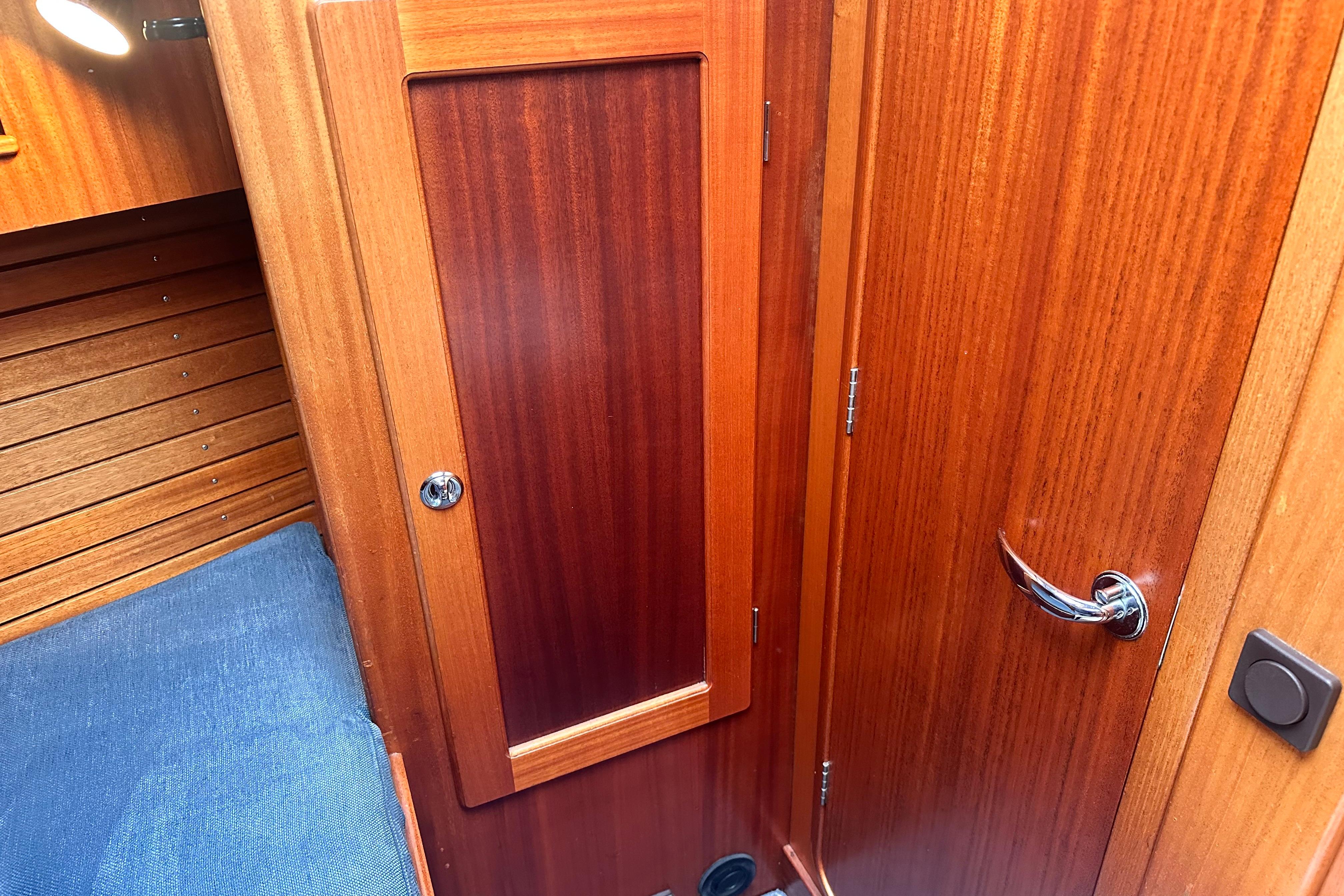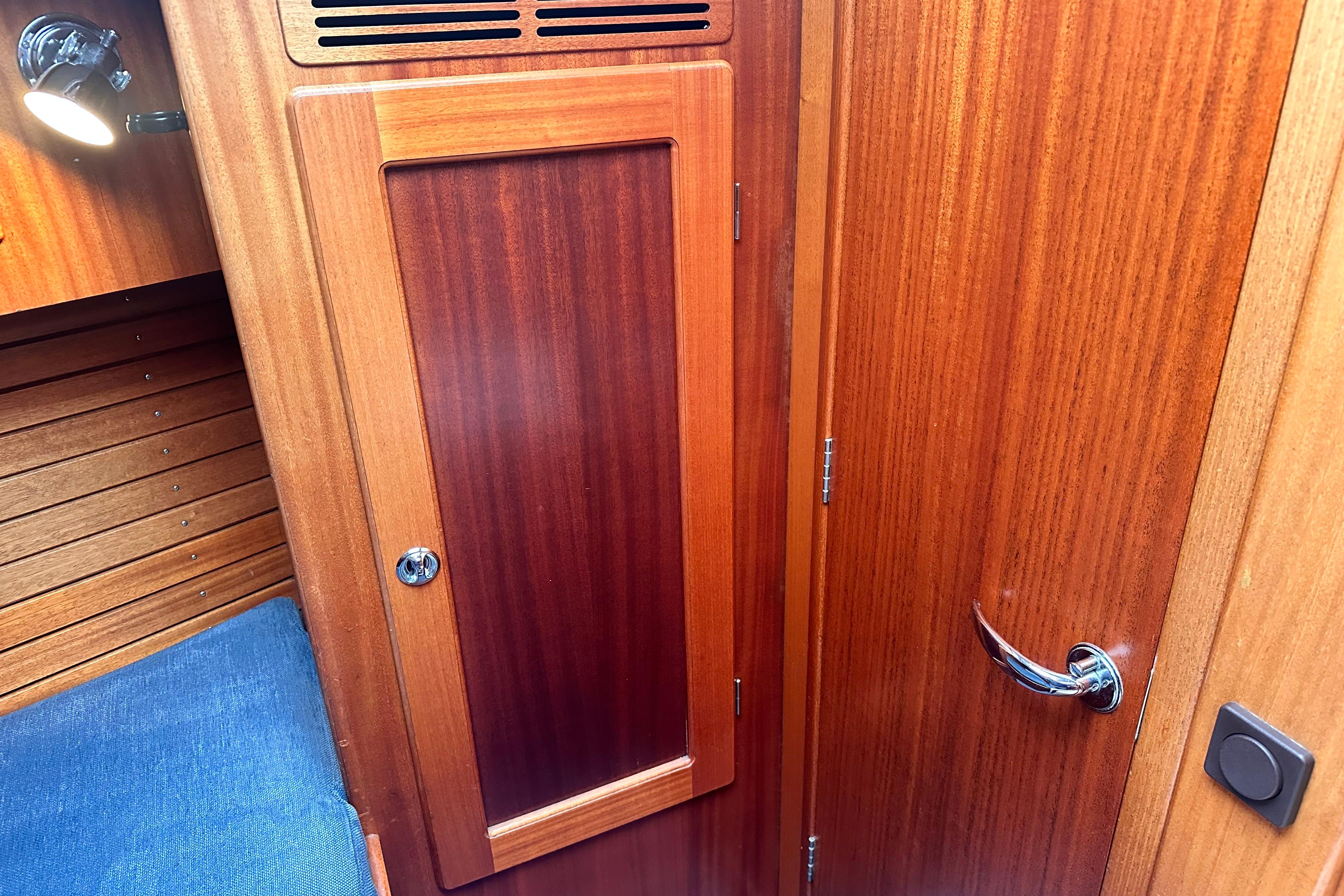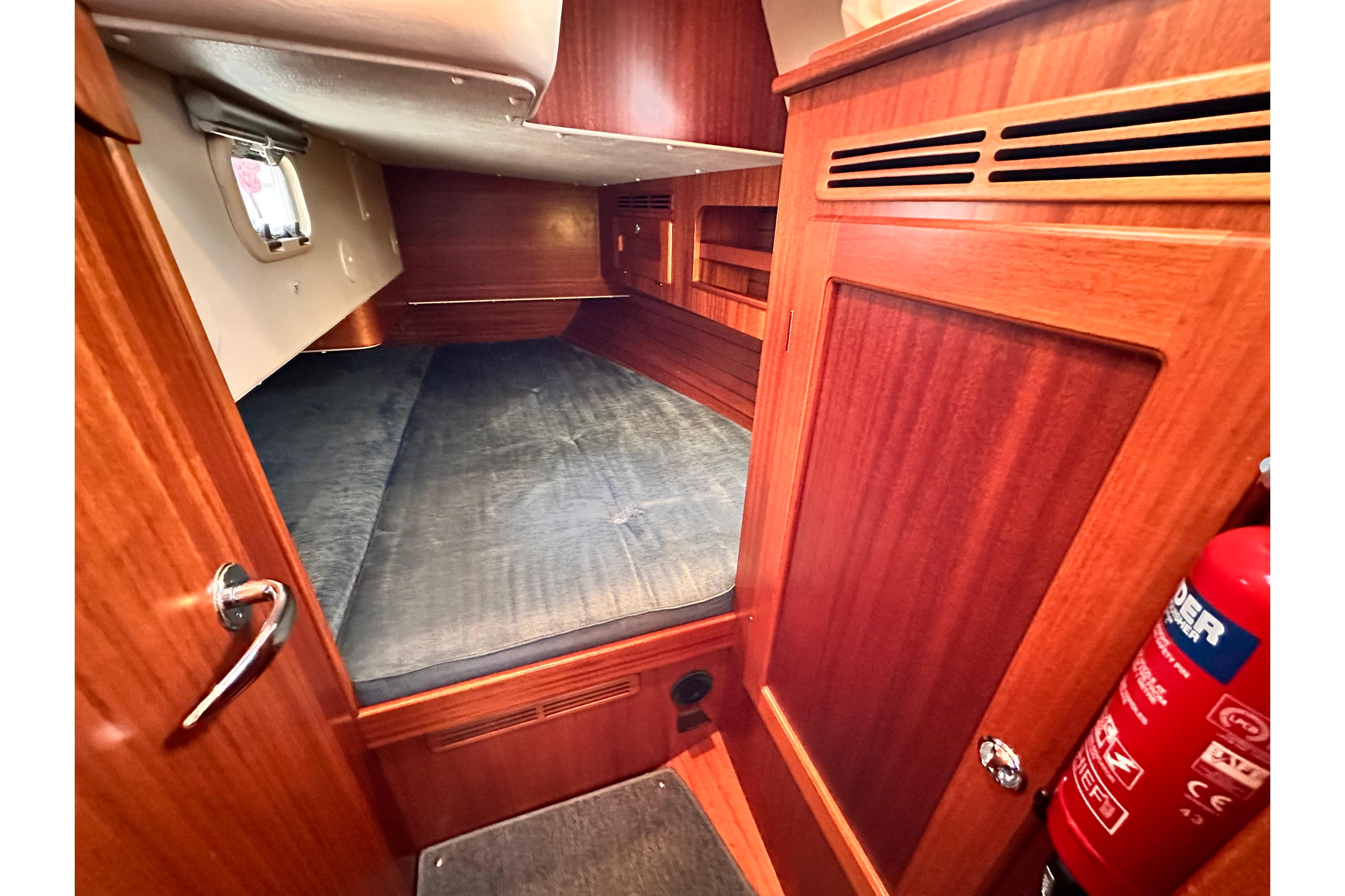 2.16m long berth, 1.76m wide at widest part. The foot end is 1.11m wide. Spacious hanging locker. Coat hook beside door. Lockers above berth and stowage below. Door leading to saloon with vanity mirror. Two opening portlights for light and ventilation, one of which opens into cockpit.