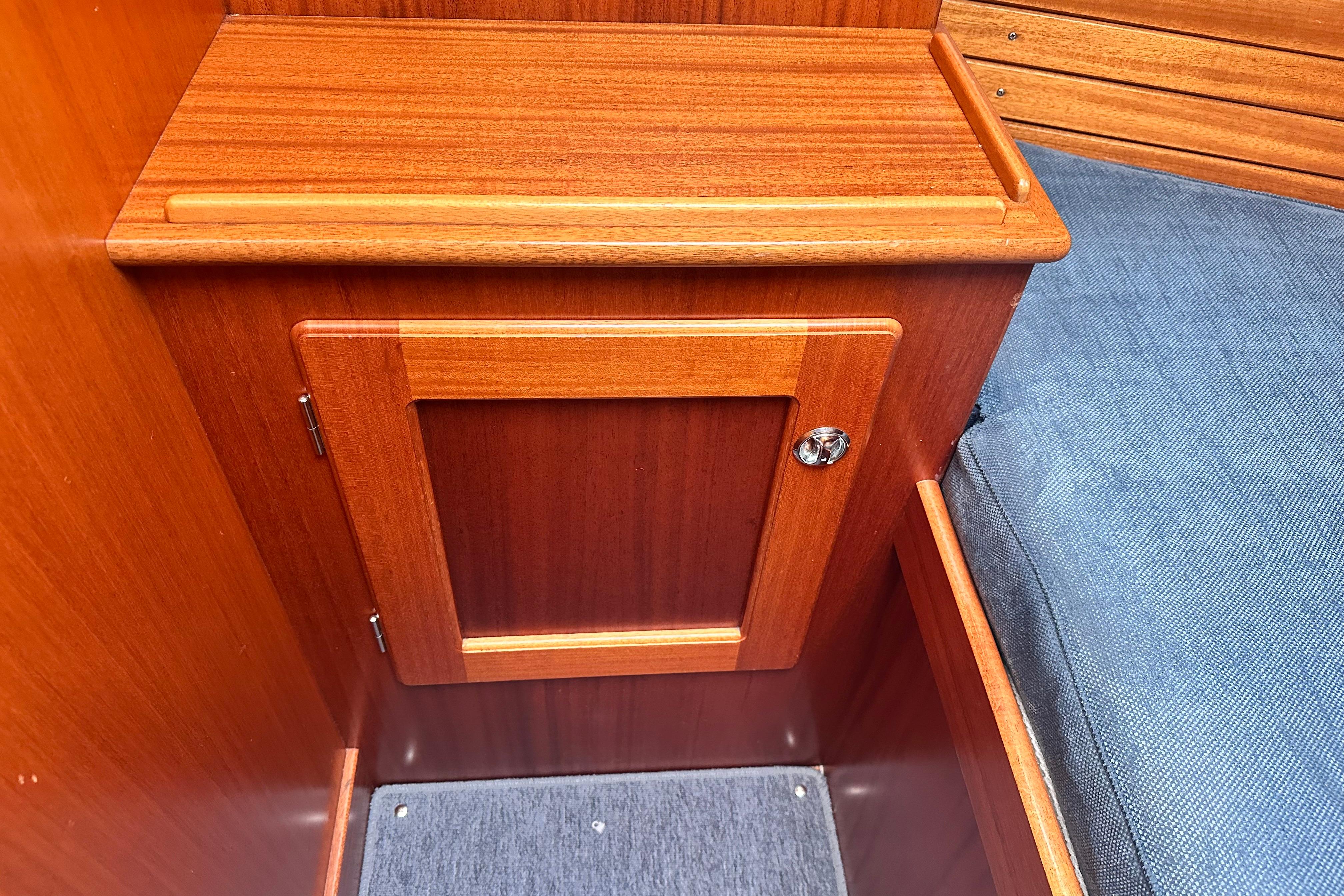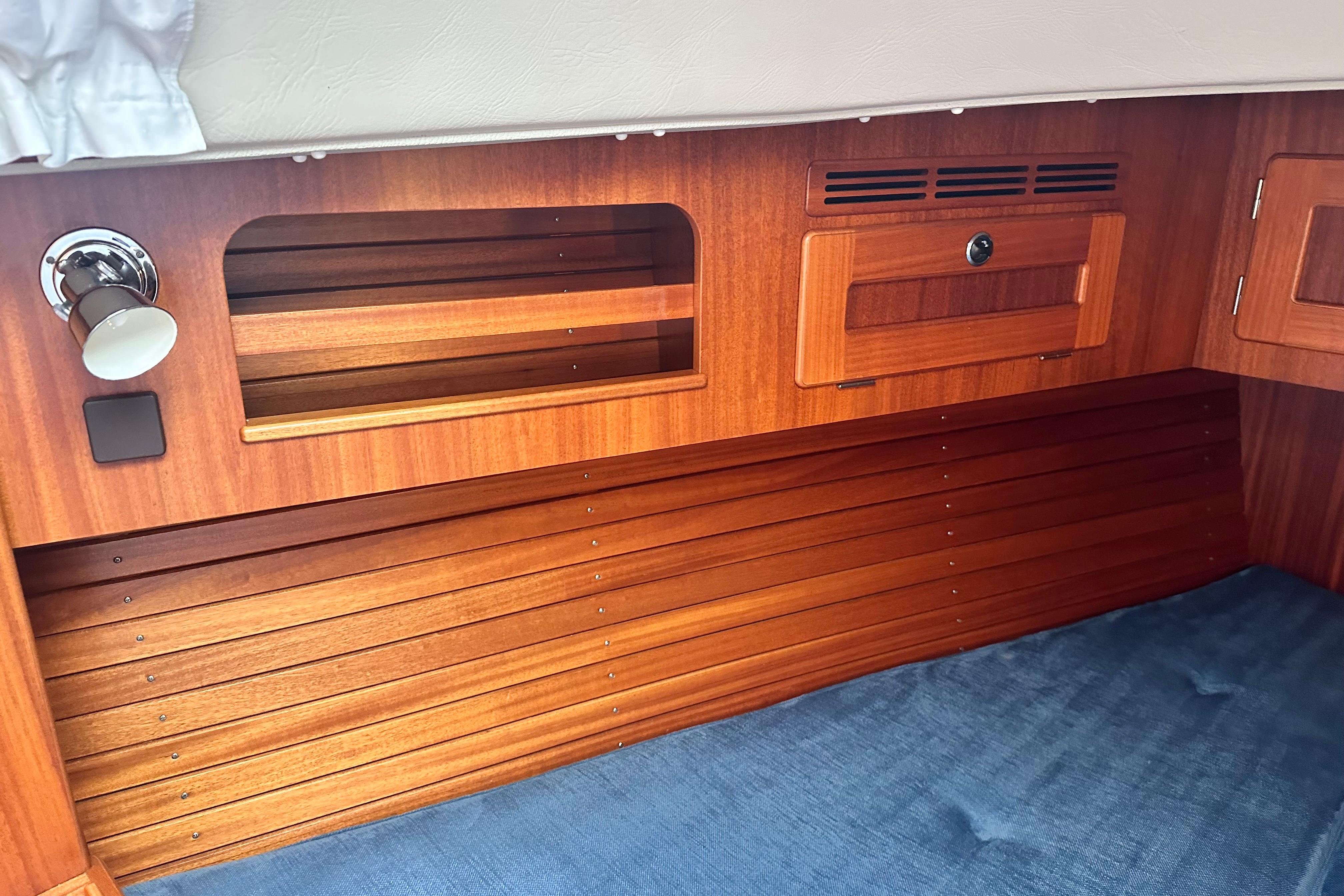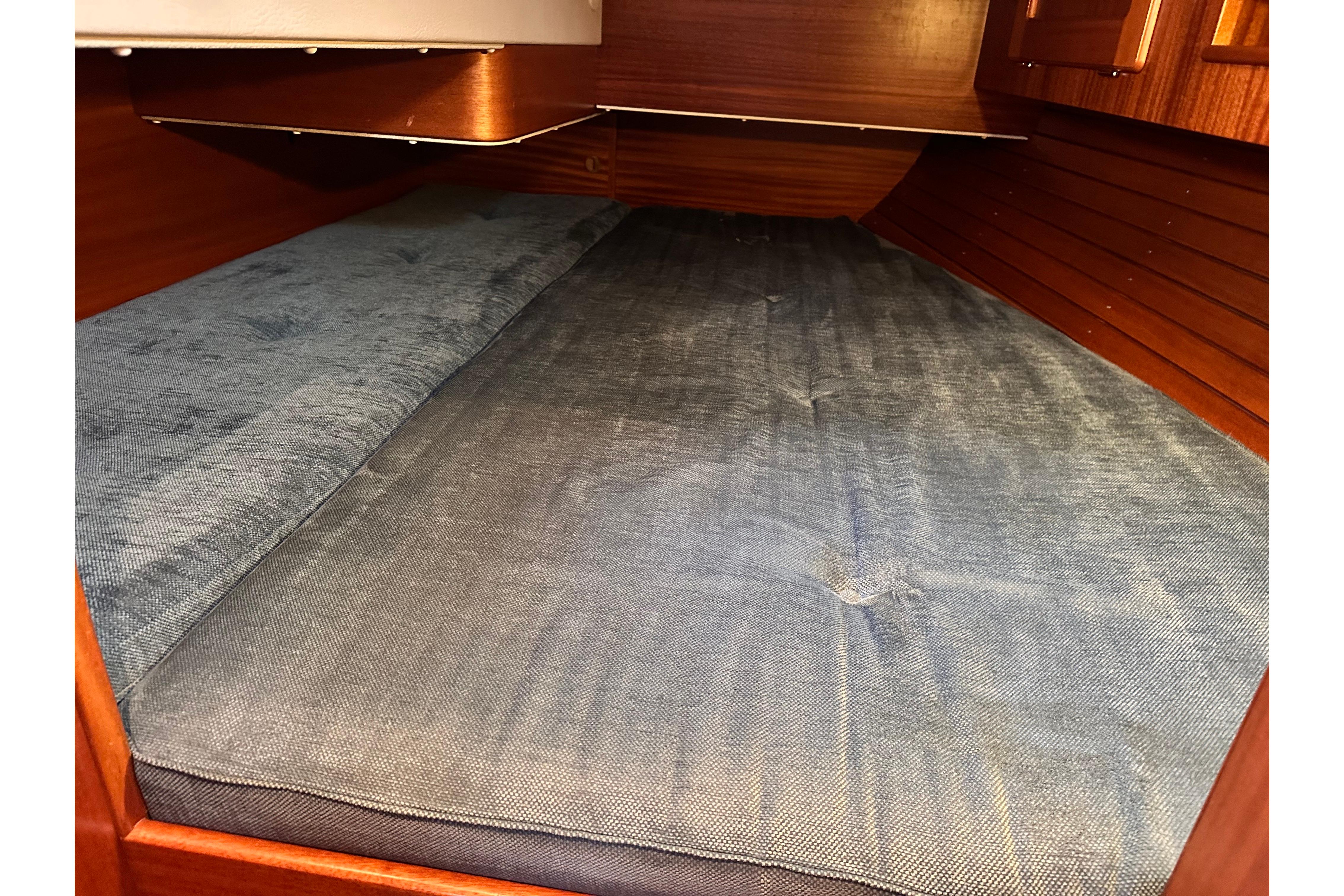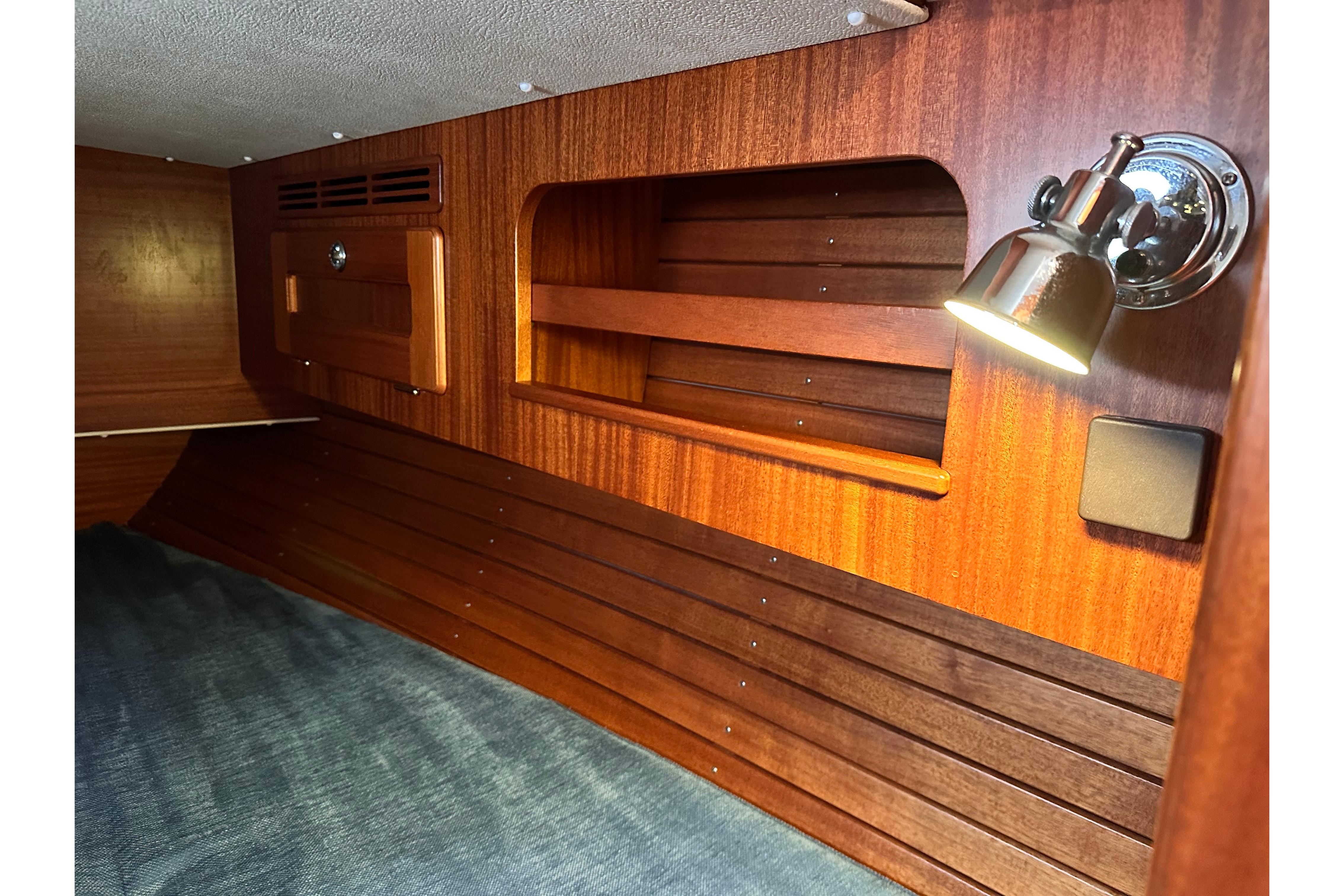 2.16m long berth, 1.76m wide at widest part. The foot end is 1.11m wide. Spacious hanging locker. Coat hook beside door. Lockers above berth and stowage below. Door leading to saloon with vanity mirror. Two opening portlights for light and ventilation, one of which opens into cockpit.