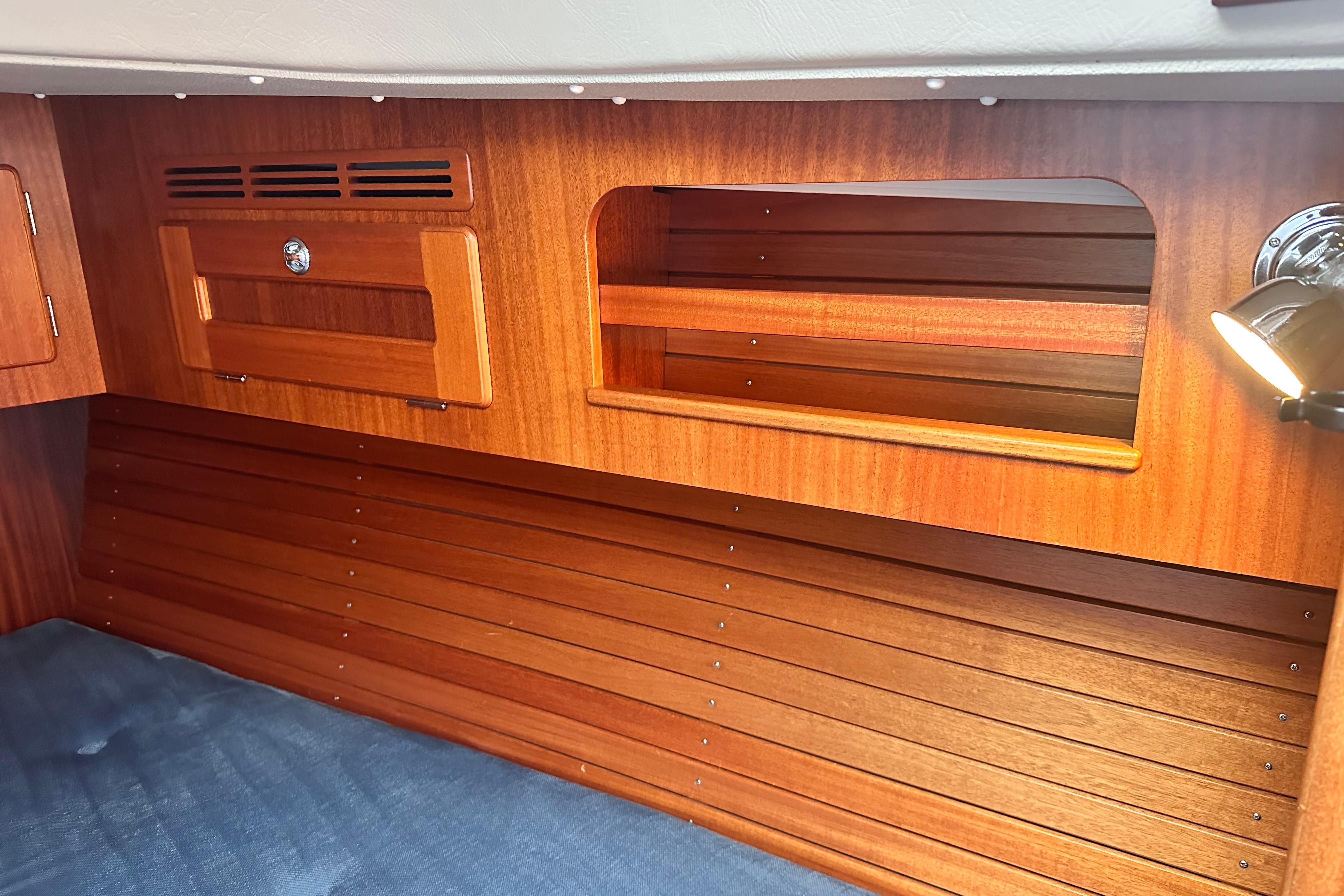 Interior finished in mahogany with matt silk varnish. Deluxe upholstery in Copenhagen blue. Off white side curtains and skylight blinds. Blue carpet (New 2019) over teak soleboards with inlaid holly stripes. Ivory headlining accentuated with mahogany inlays. Webasto cabin heating with outlets throughout the boat.