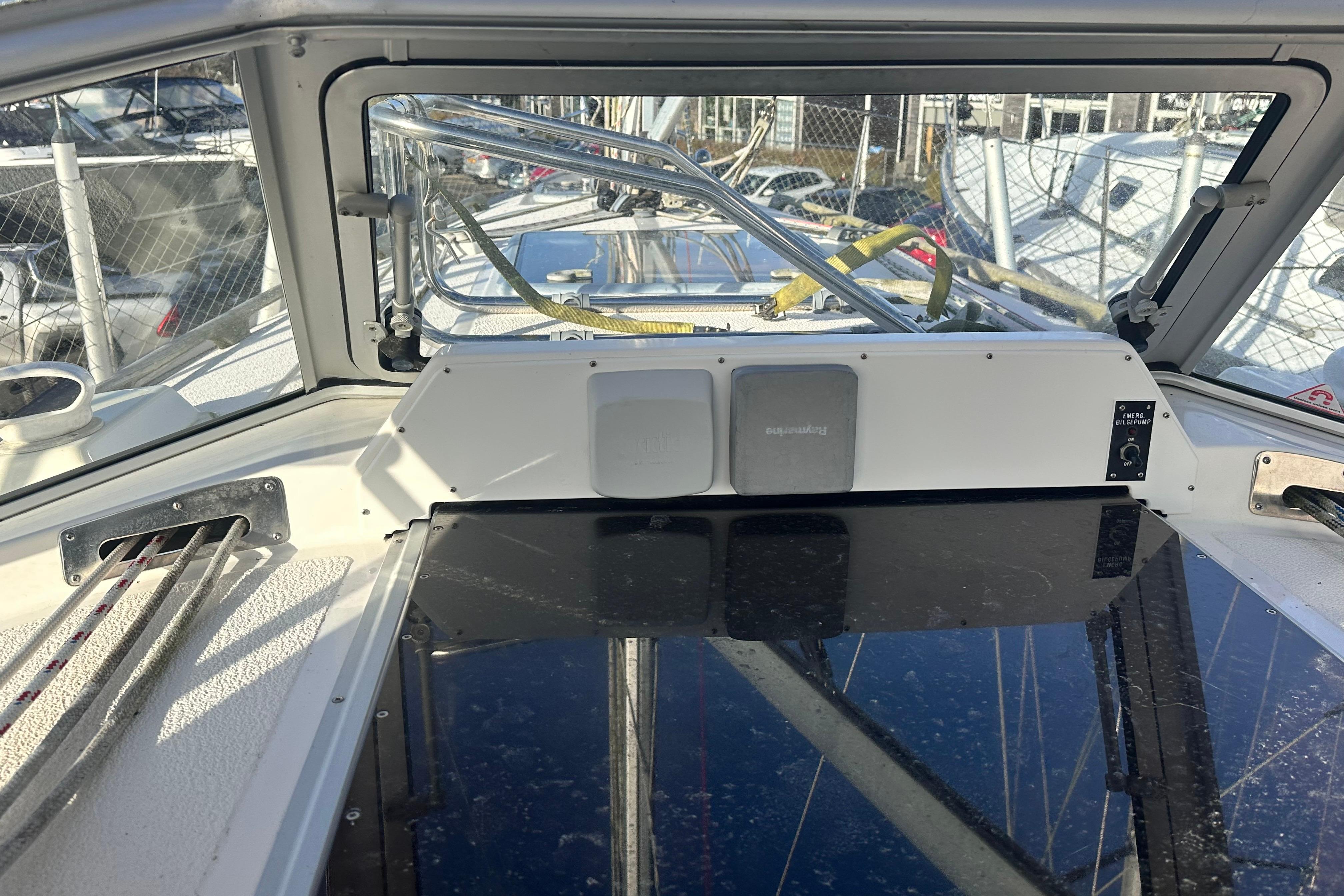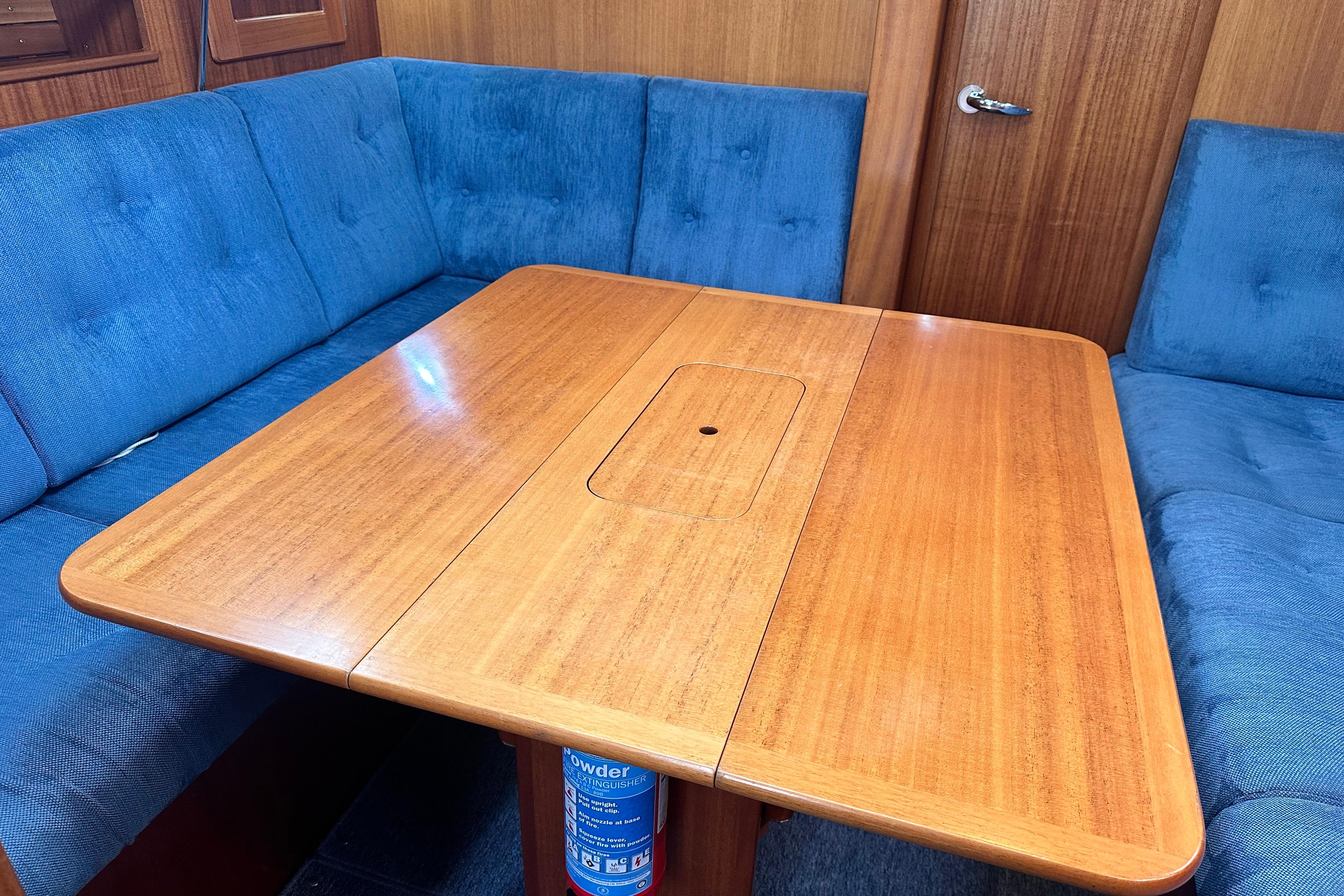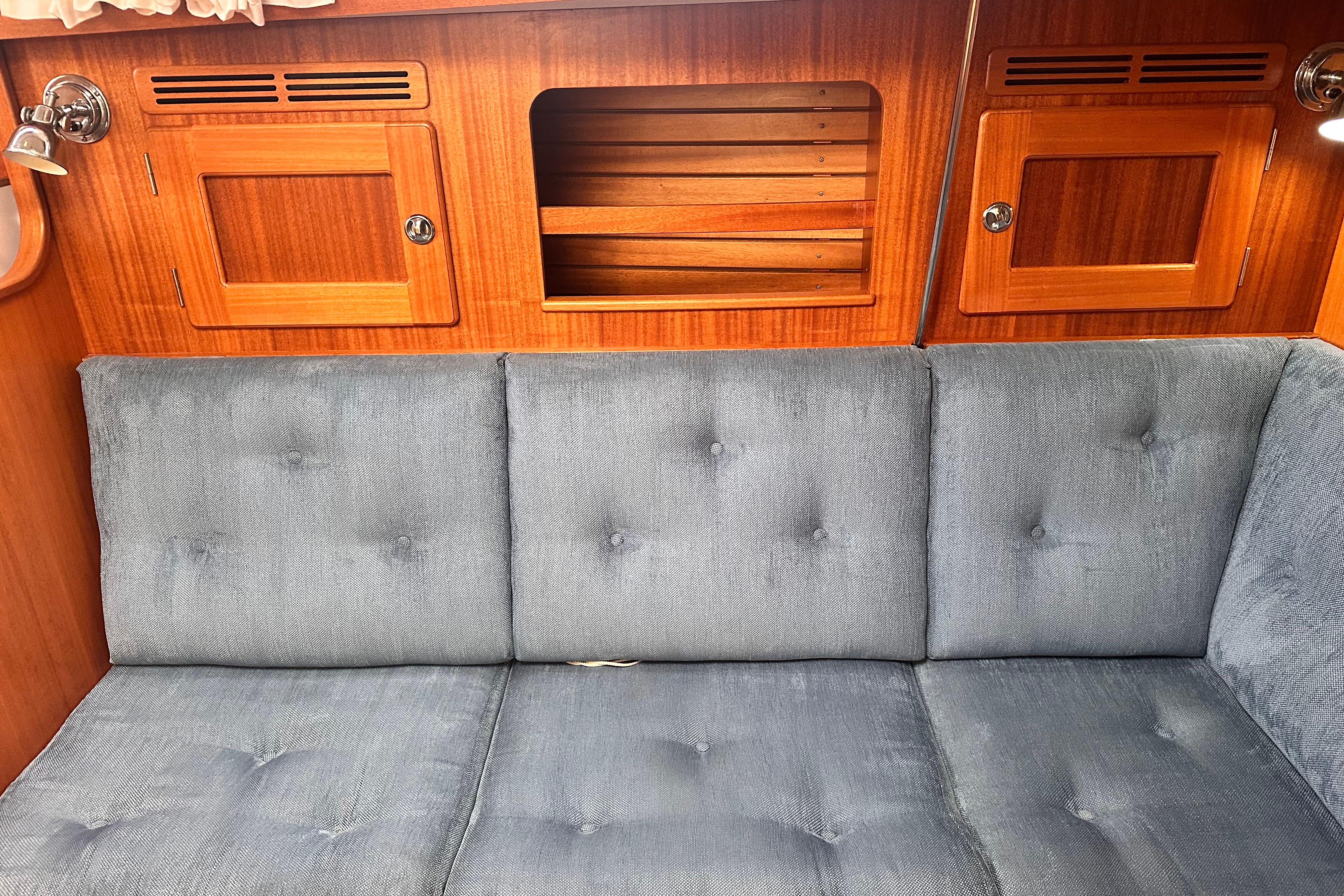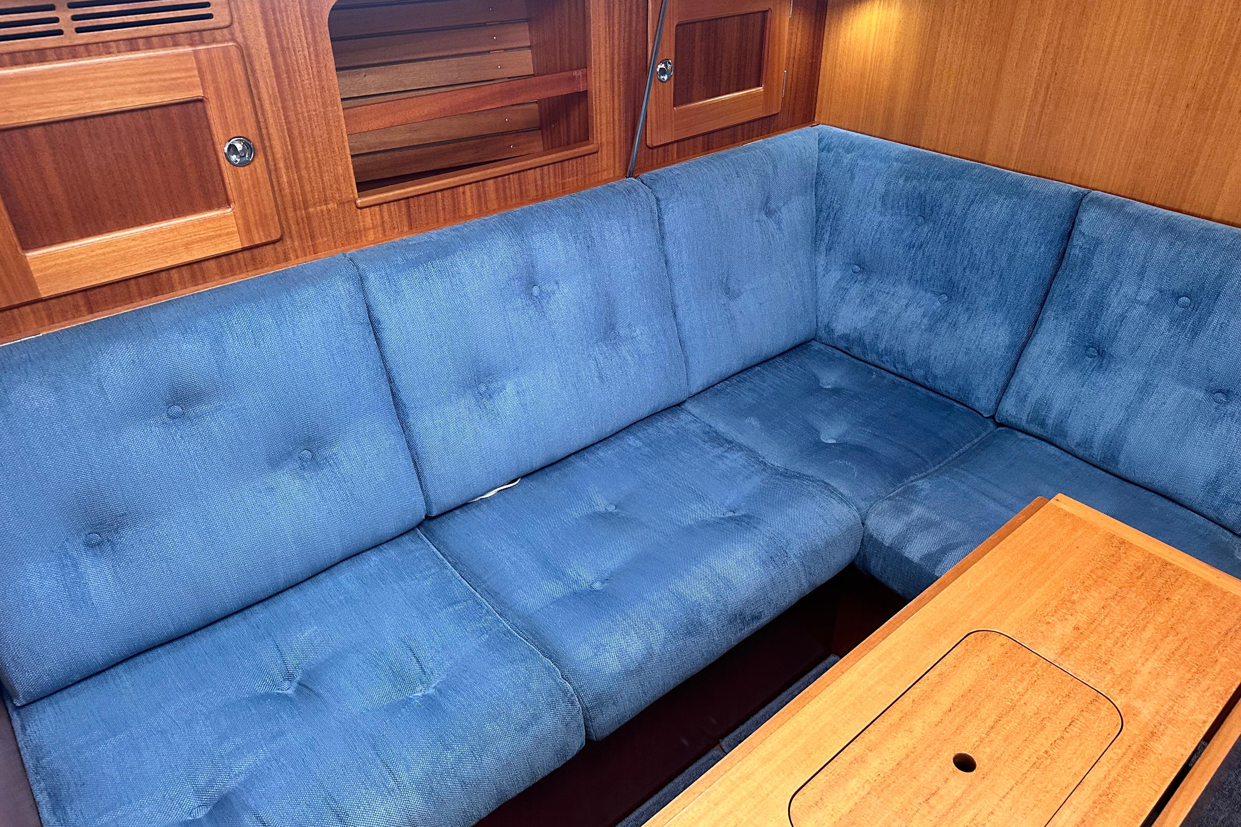 Two settee berths, on port side a 1.9m long L-shaped sofa and on starboard side 2.15m with berth extension under the chart table. Stbd side settee backrest as extra berth. Lockers above the sofas and small locker adjacent to the main bulkhead. Bookshelves on both sides. Dropleaf table on the centreline with bottle stowage in centre section. Large opening deck hatch with Oceanair skyscreen. Six opening portlights. Headroom 1.91m.