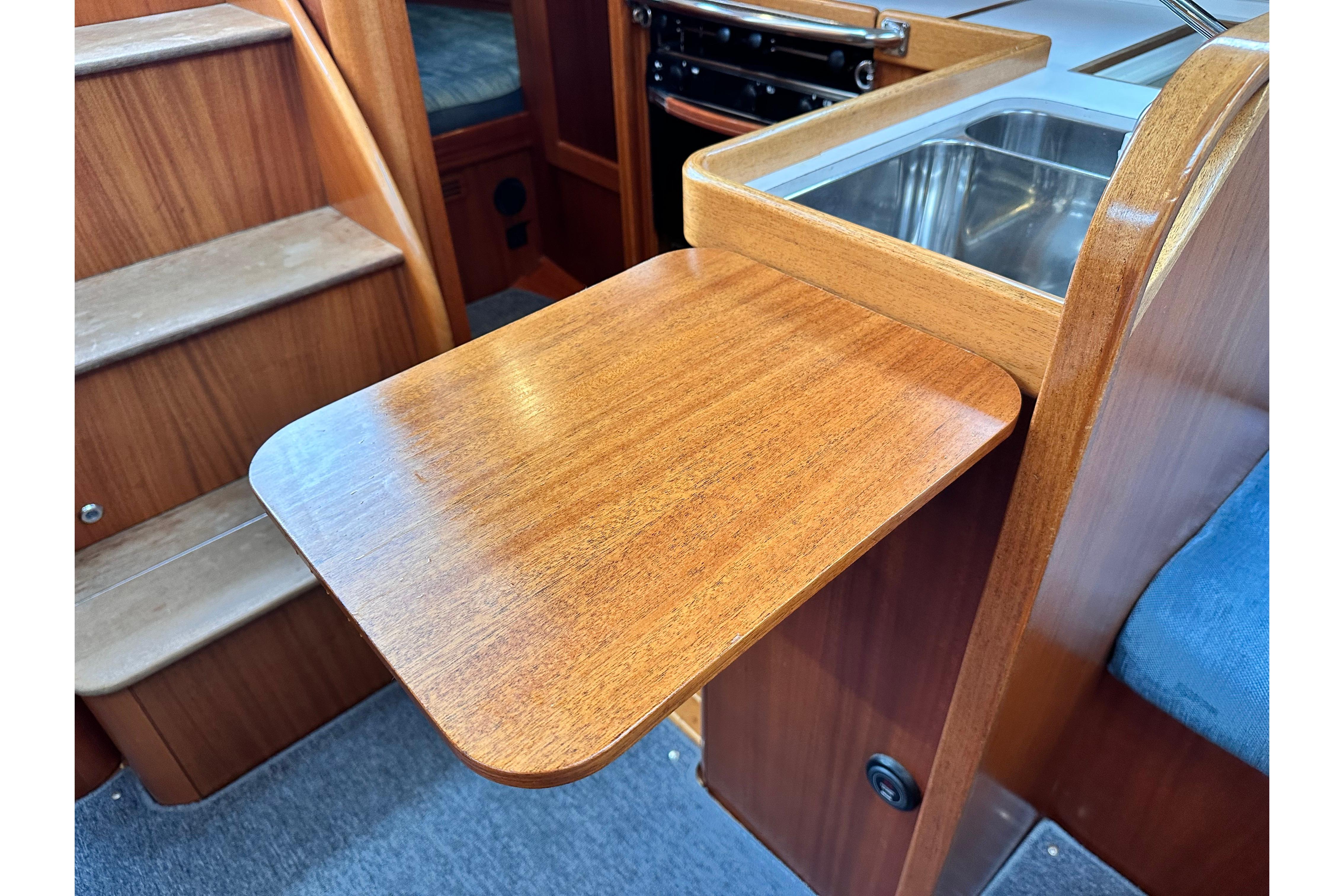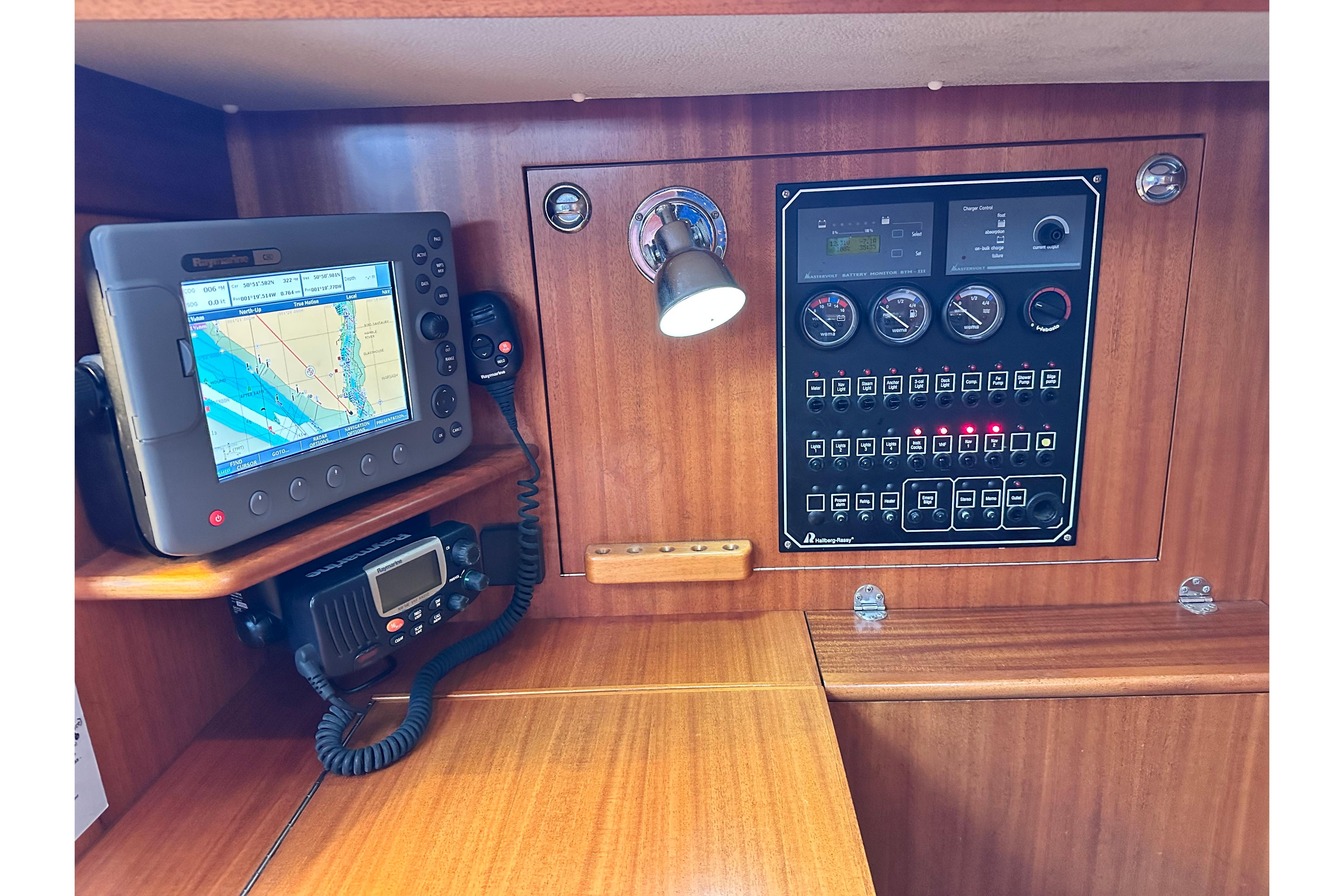 Chart table with seat. Stowage for charts shelf with radar/plotter above and VHF below. Electric switch panel. Opening portlights over both galley and chart table.