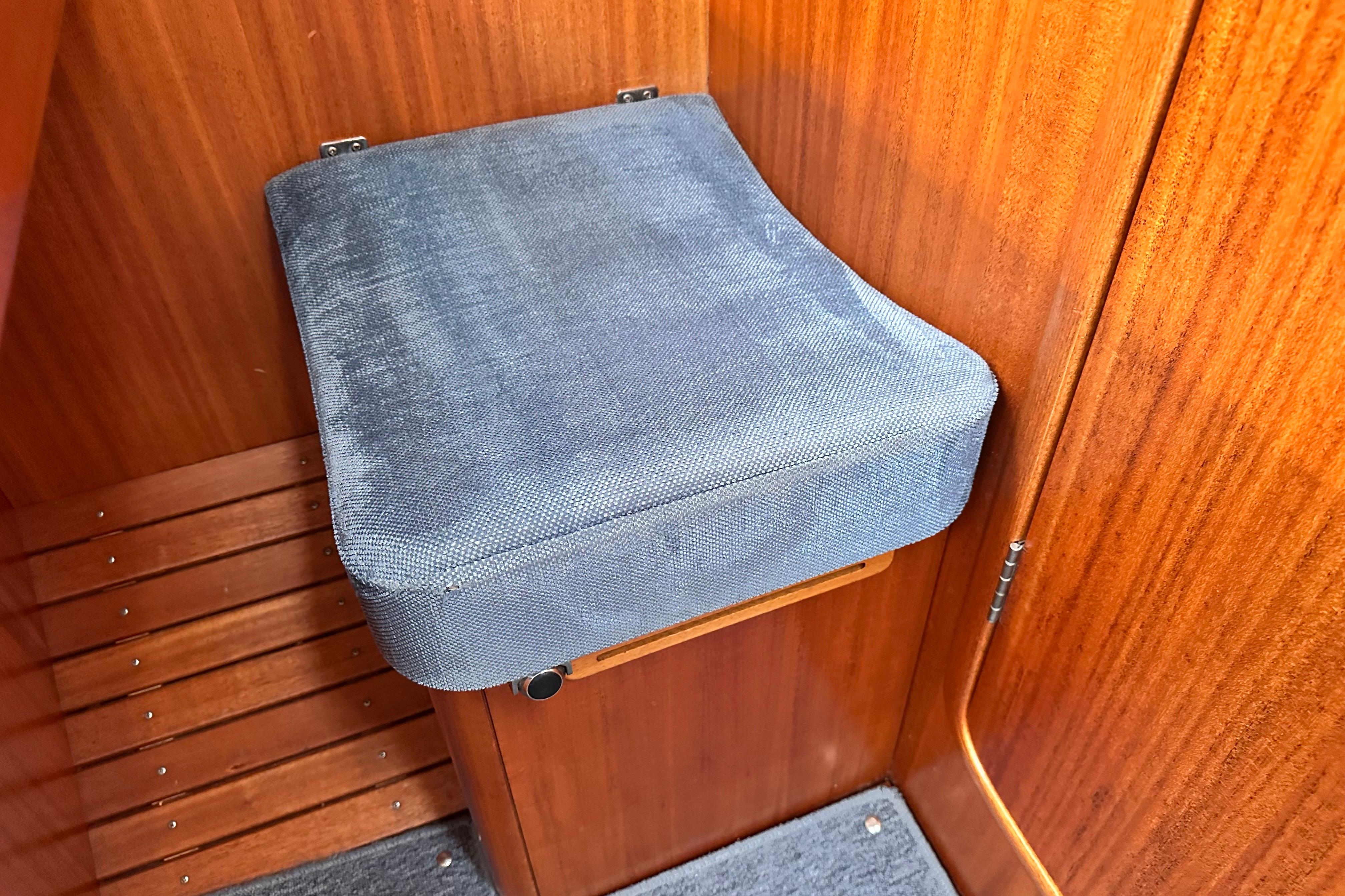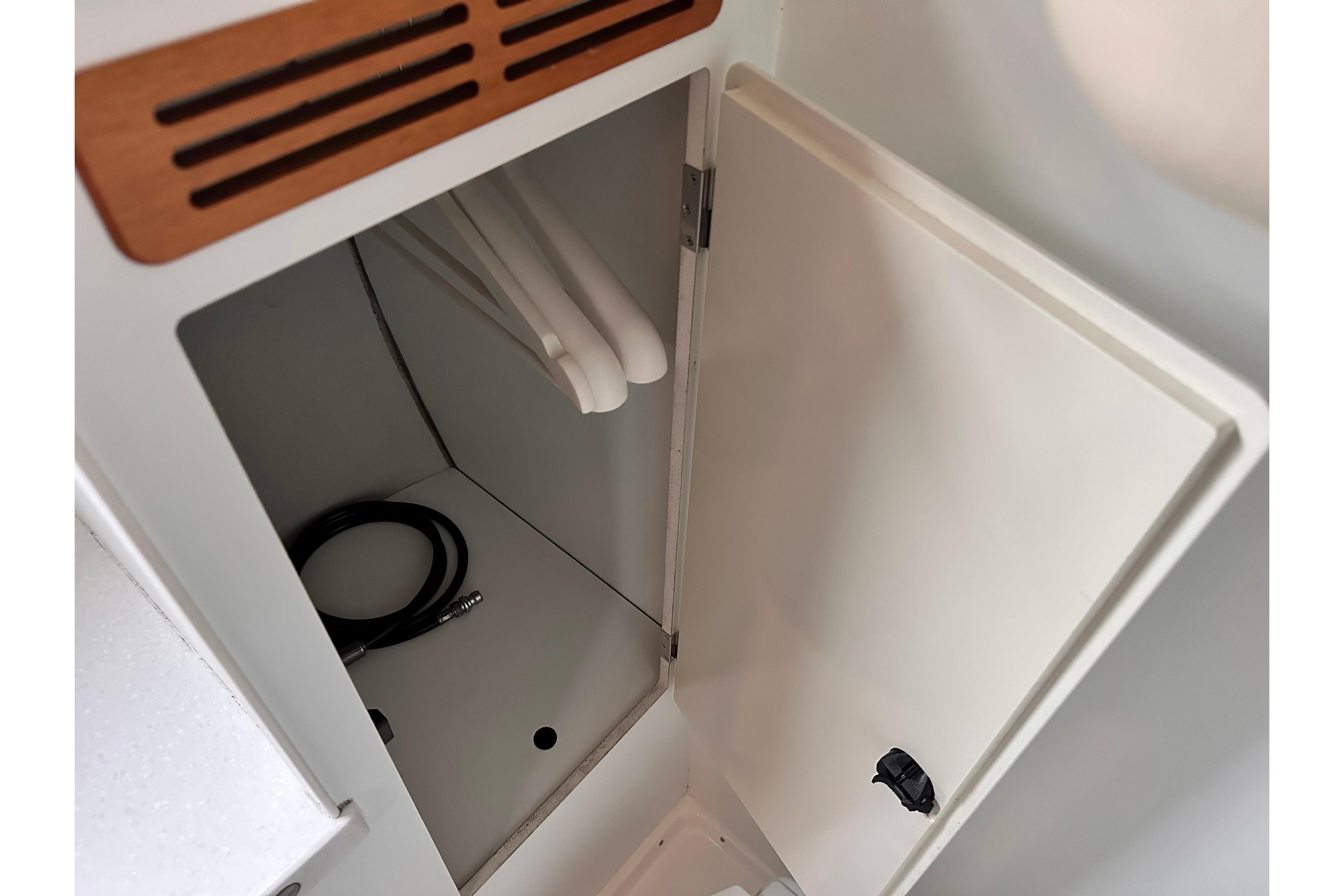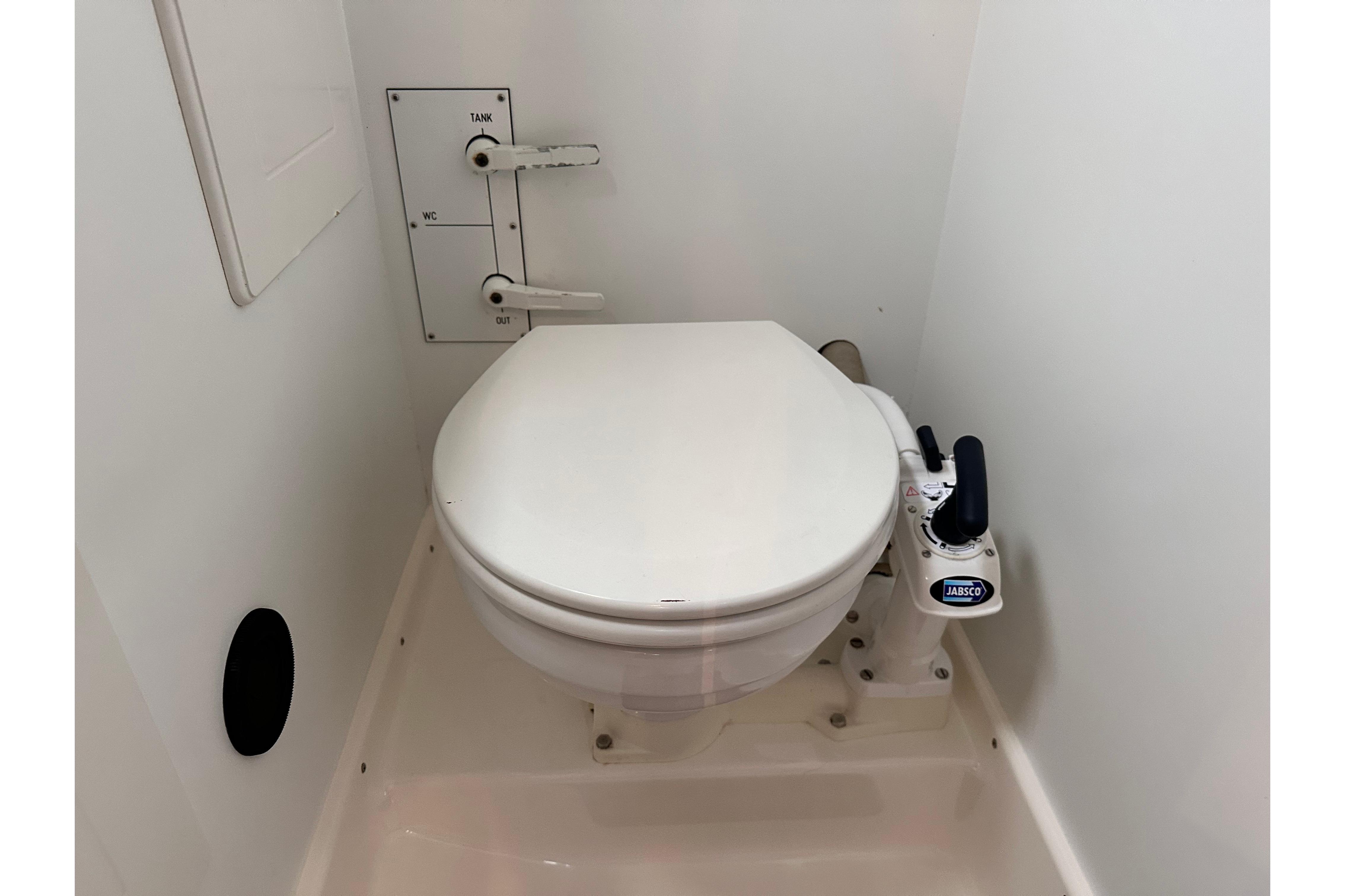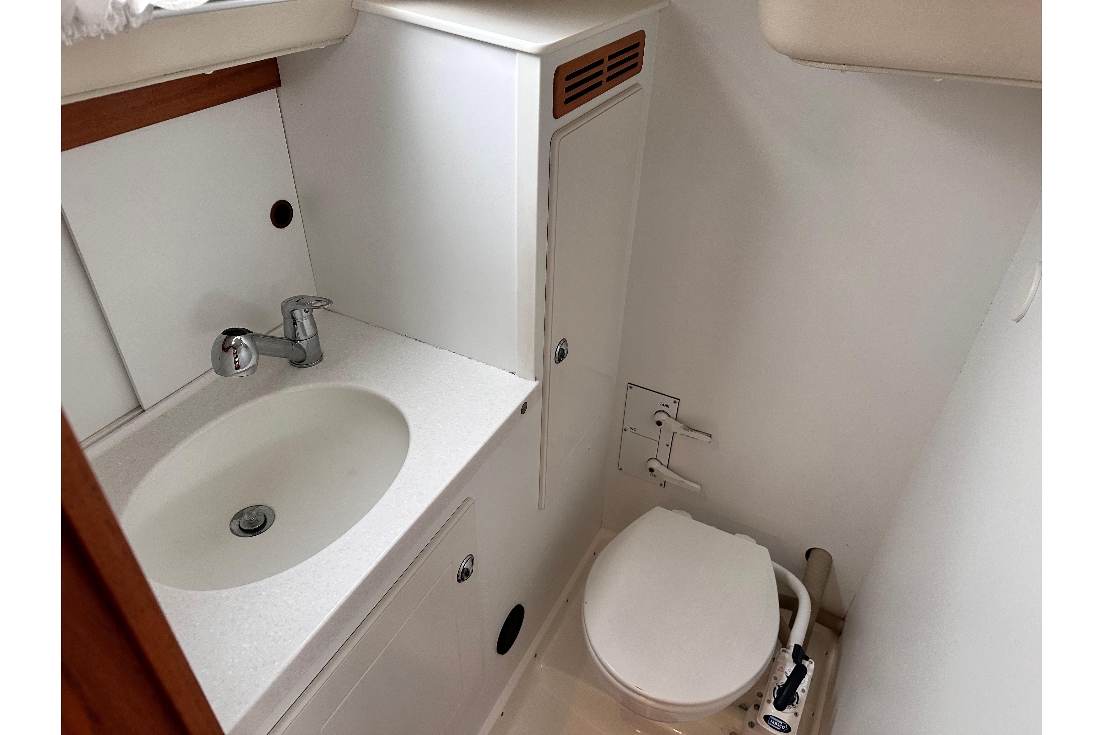 Interior lining and cupboard in white matt Resopal. Watertight shower stall with teak grating. 12v shower waste pump. Jabsco pump action toilet (replaced 2021) with stainless steel holding tank. PlexiCor composite stone wash basin and PlexiCor countertop and one lever mixer tap. Stowage above and below. Wet locker. Large mirror on door. Two opening portlights for ventilation. Six coat hooks for temporary hanging of wet