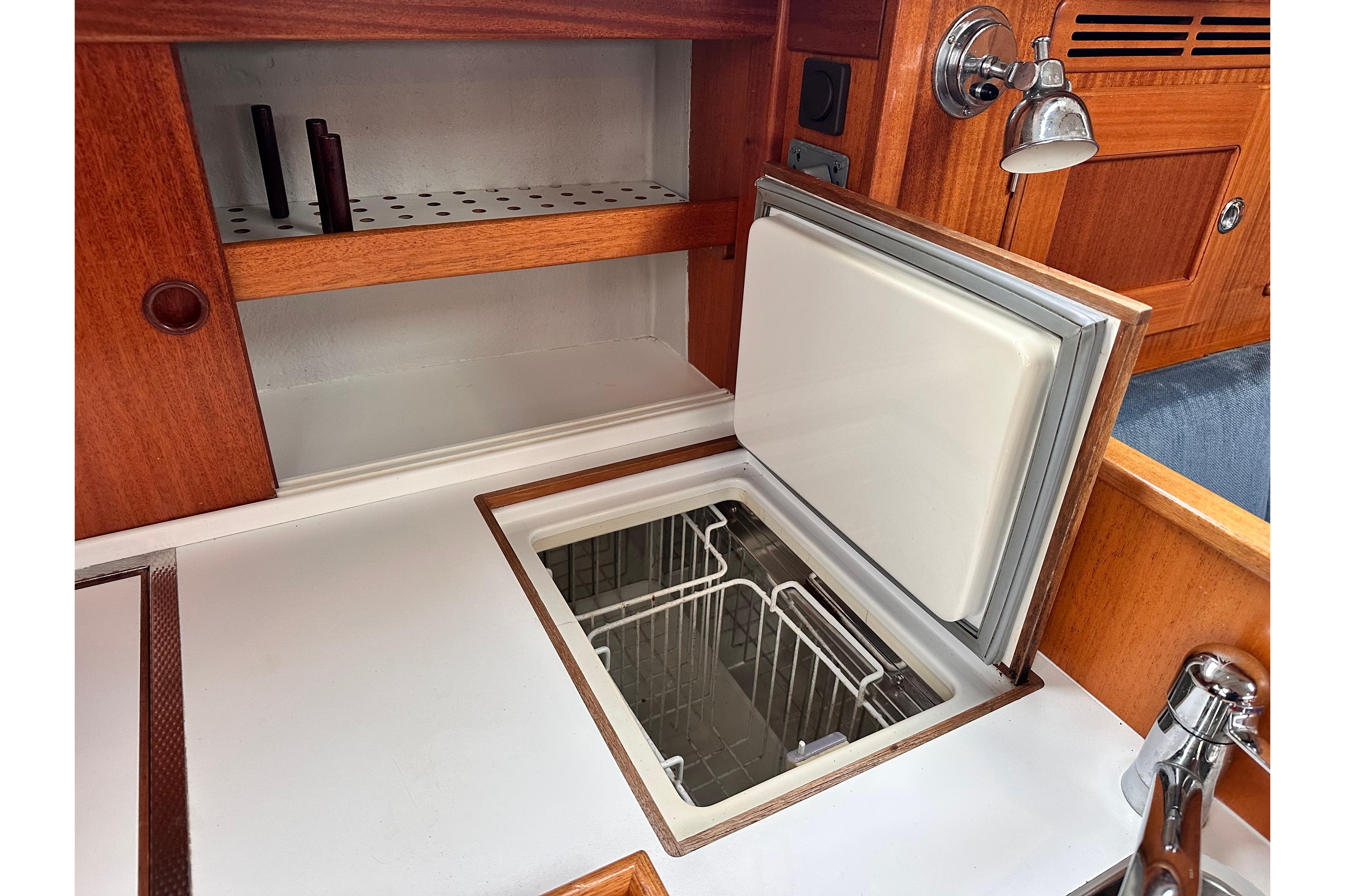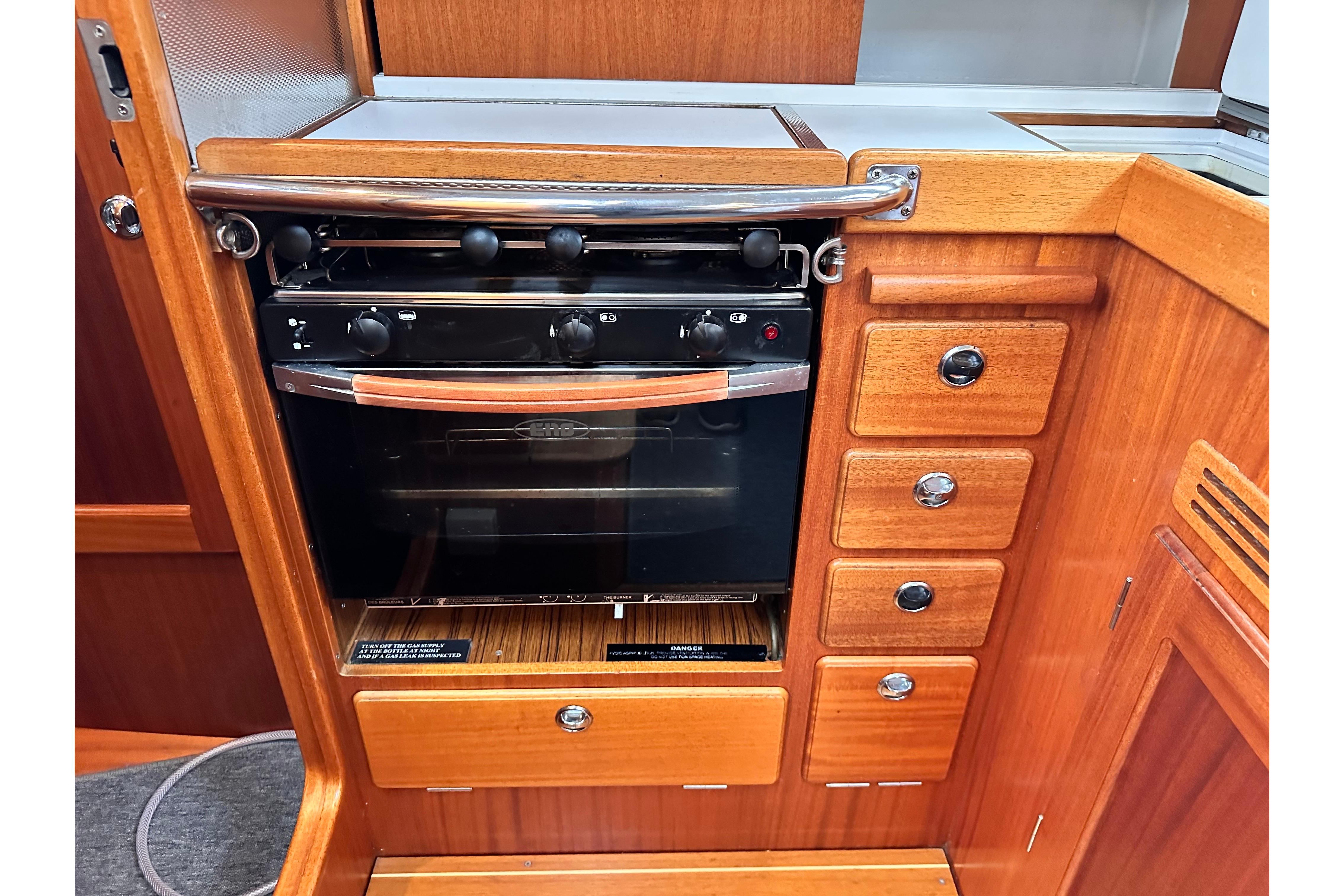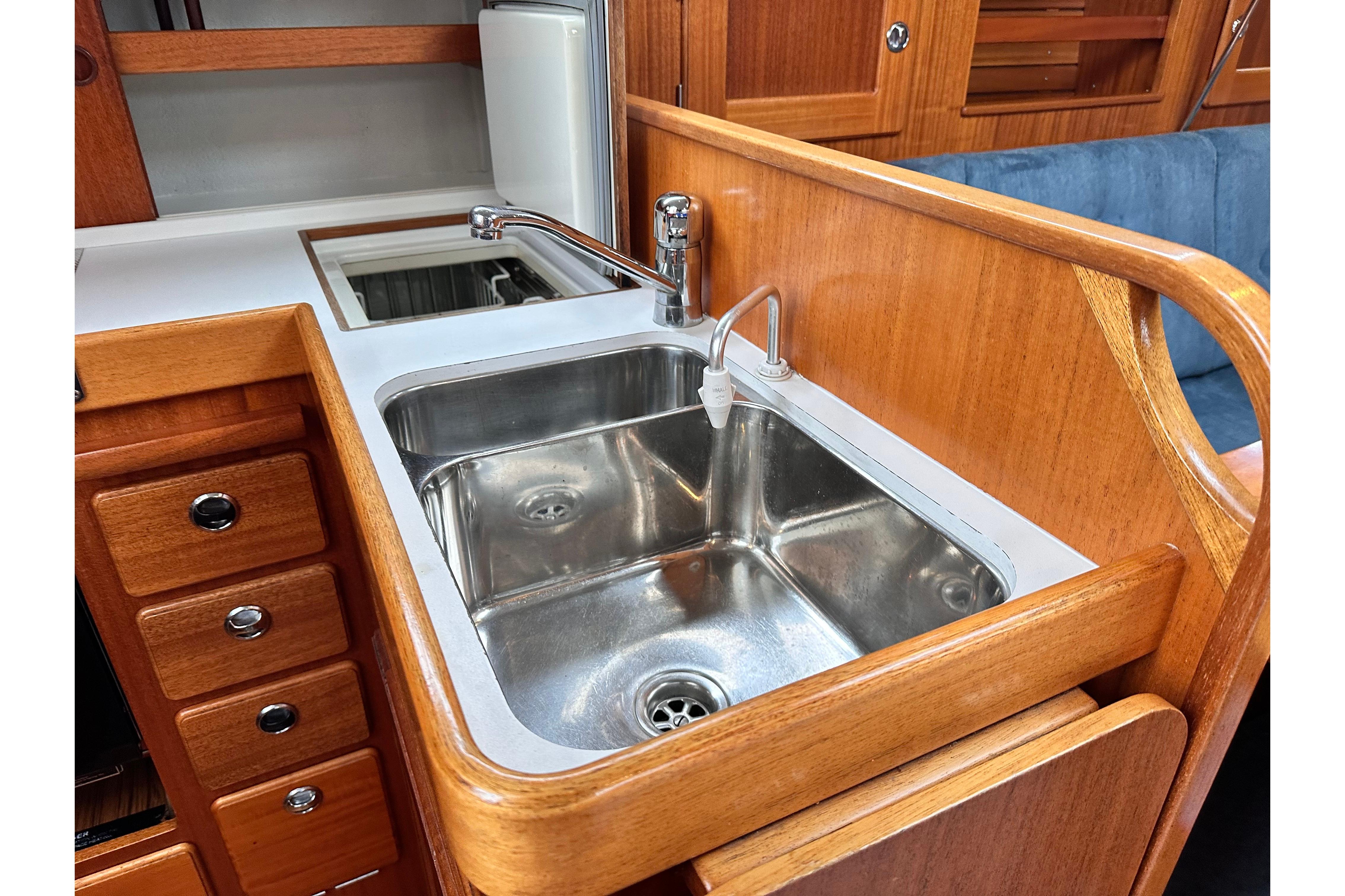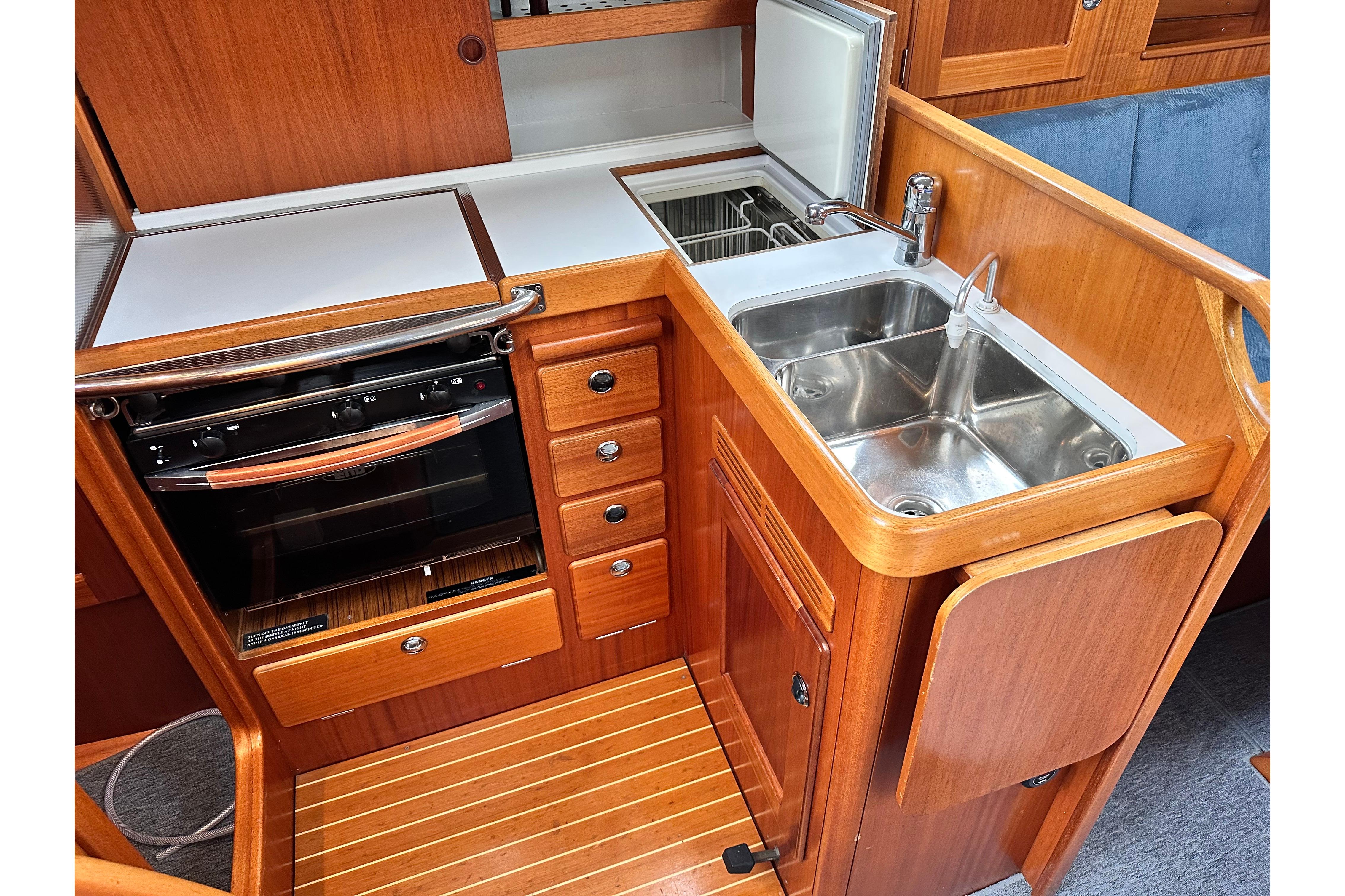 White galley working surfaces with mahogany fiddles. Gascogne gimballed 2-burner cooker with oven. Double sinks with pressurised hot and cold fresh water. Fresh water foot pump as reserve. Stowage room, chopping board, drawers and waste bin. Insulated fridge box with basket and Isotherm cooling unit with 12v compressor.