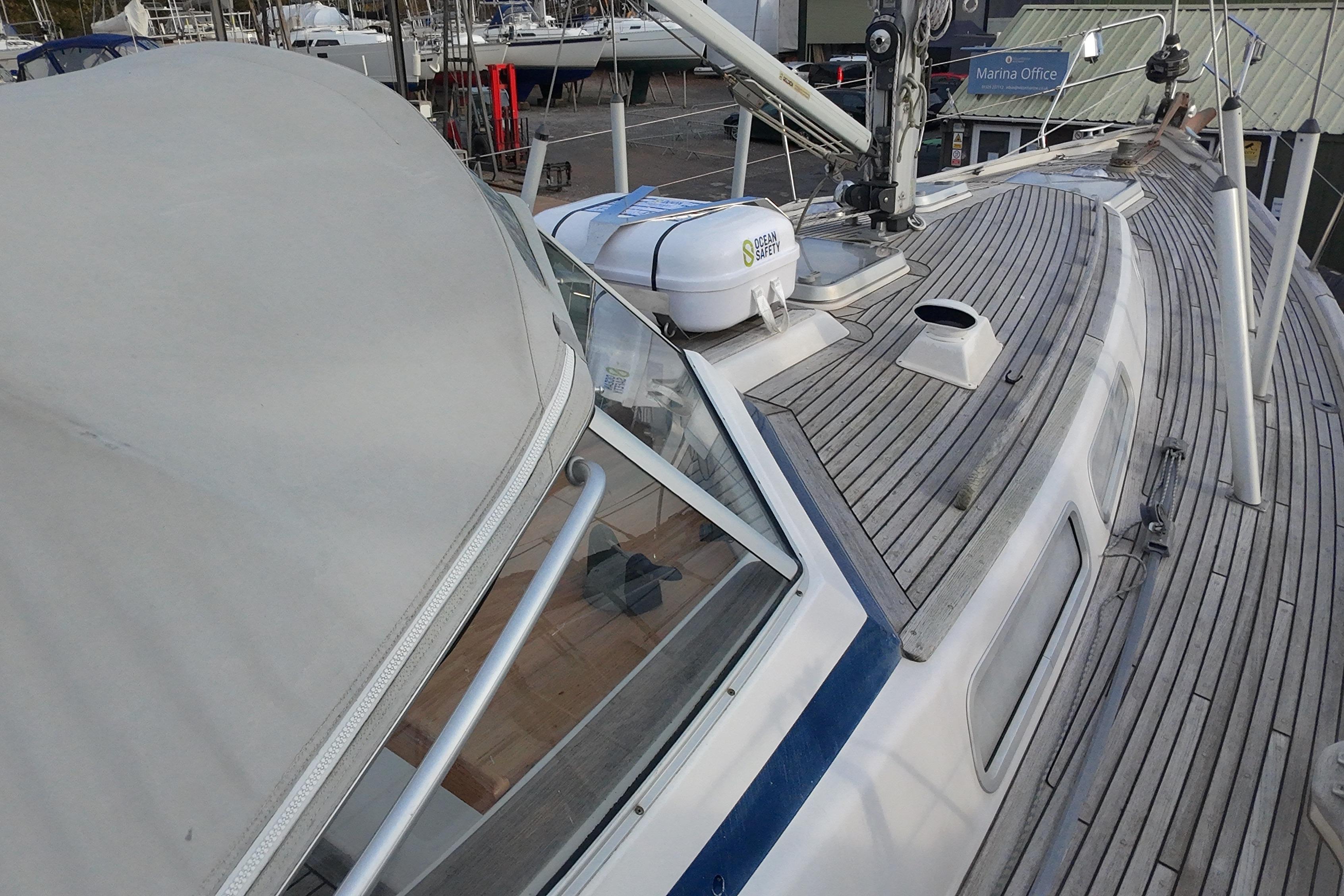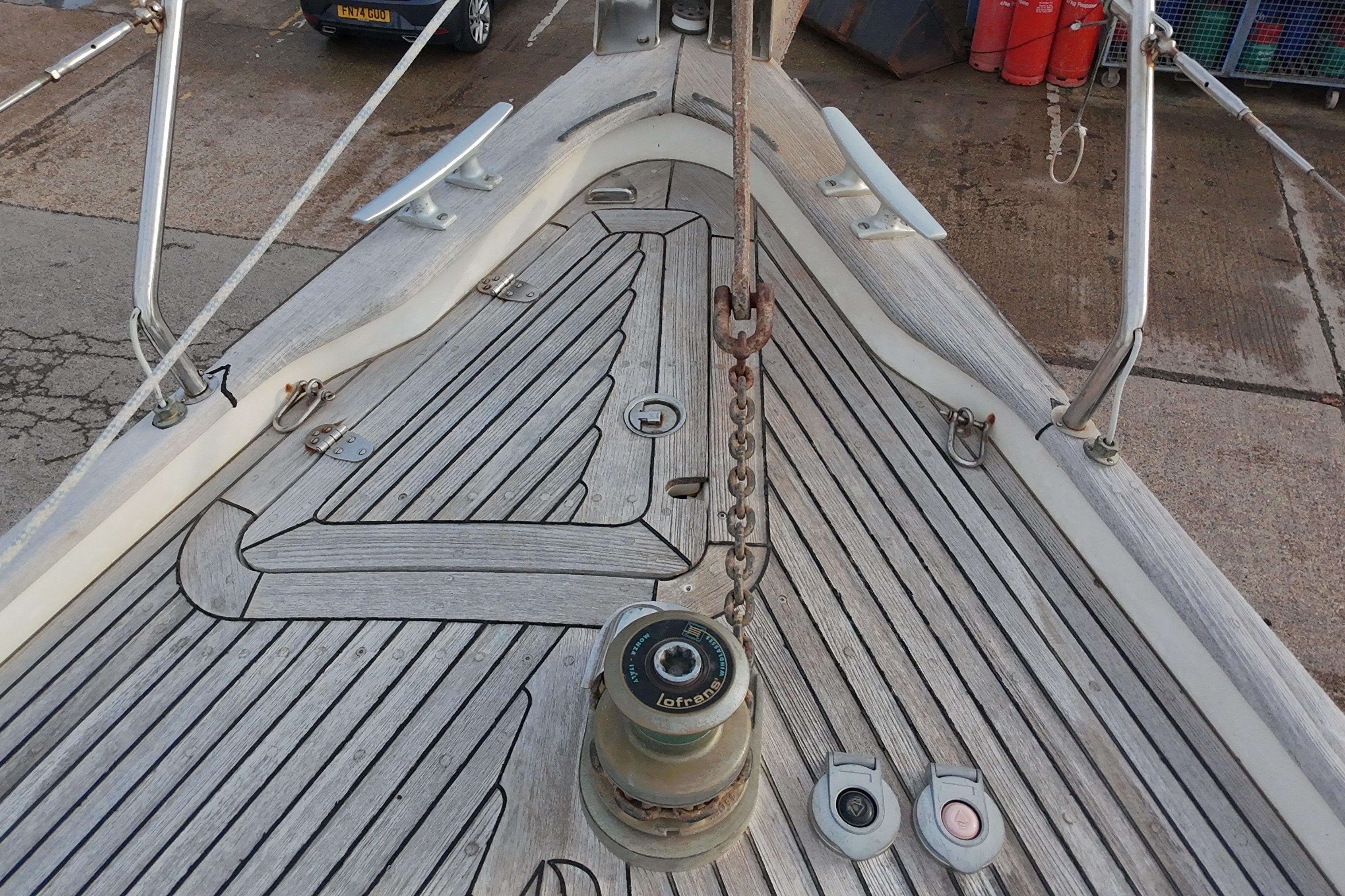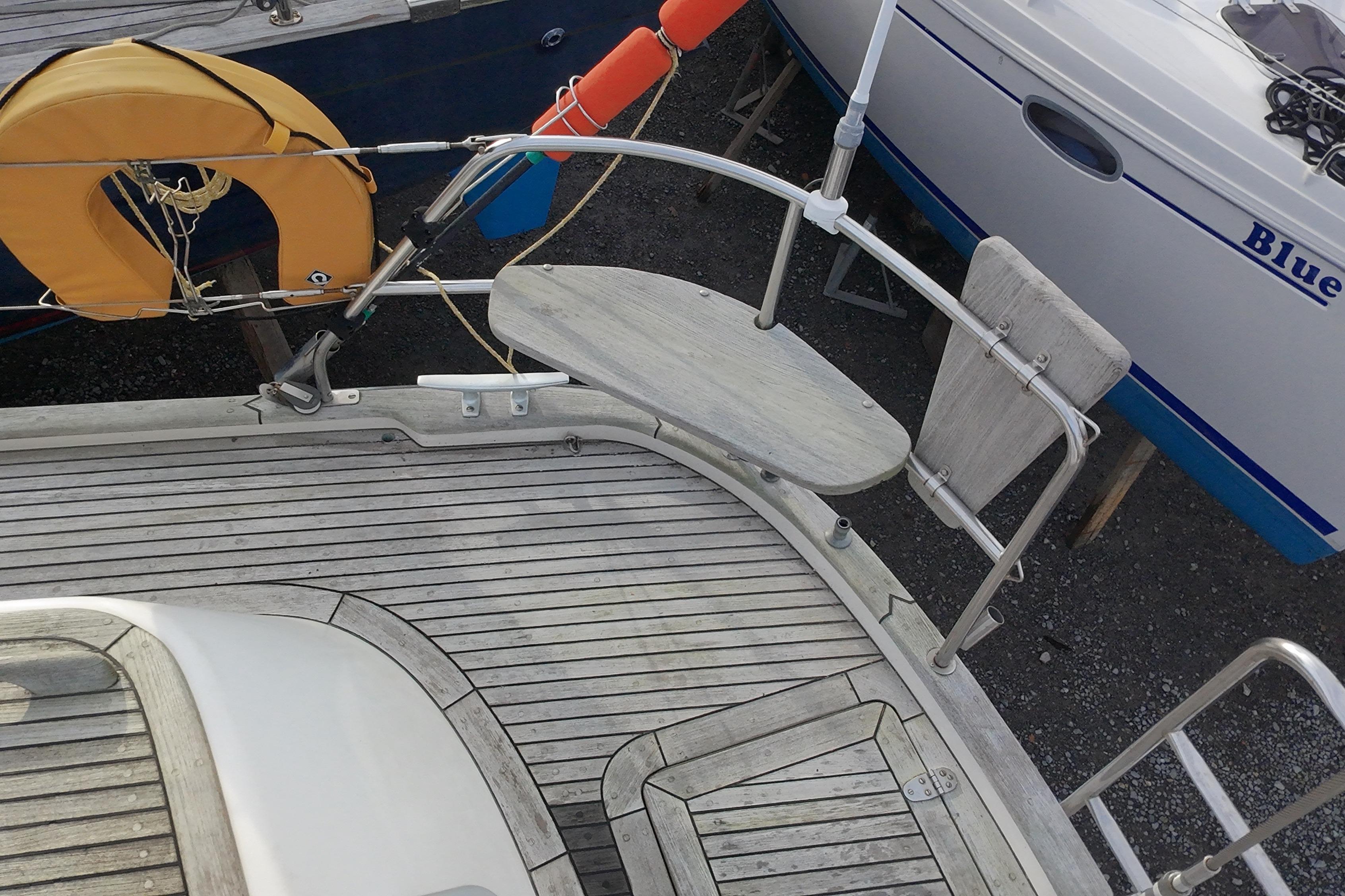 Toe rail, pushpit seats, outboard bracket, hand rails and all other woodwork on deck in solid teak.