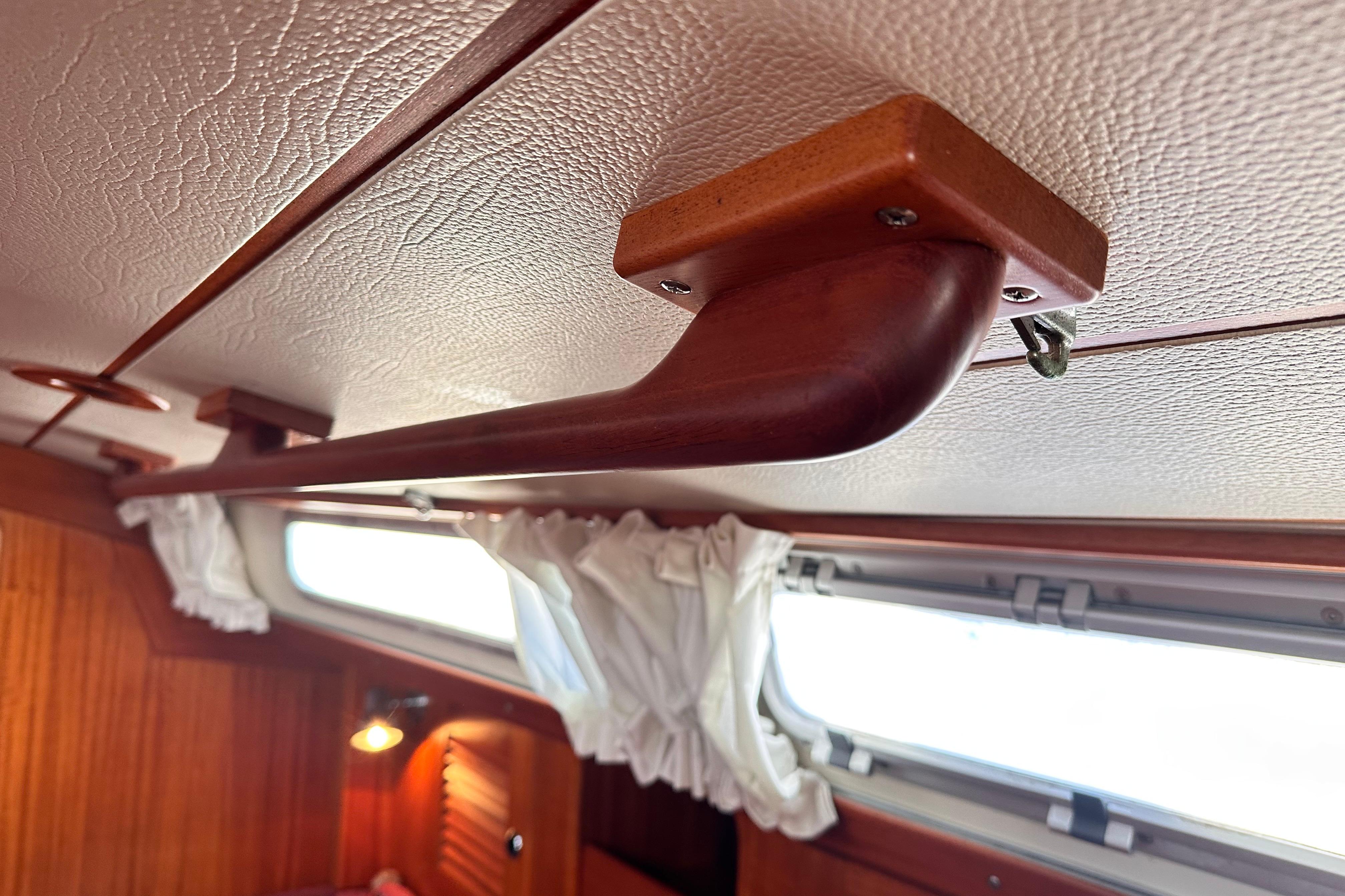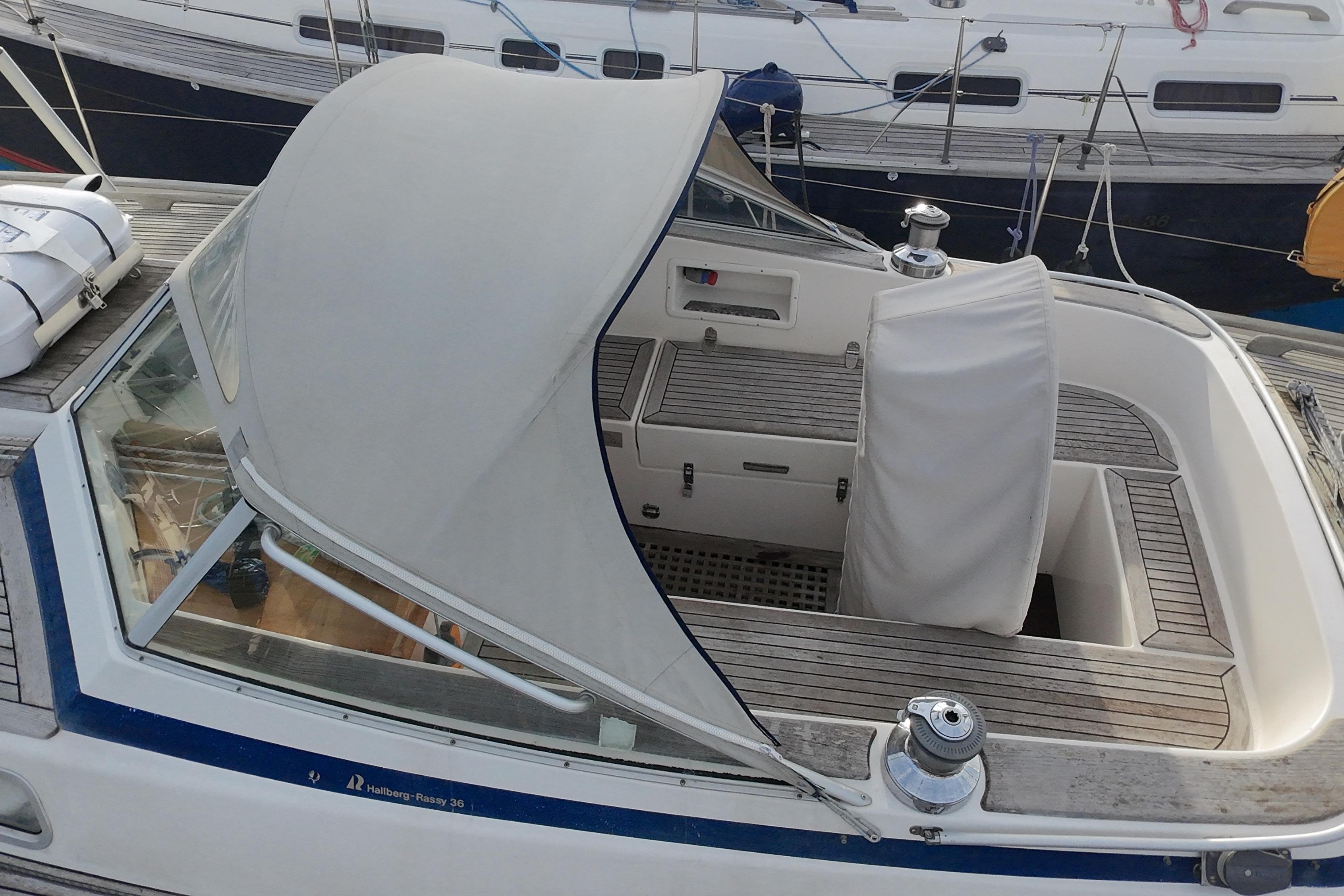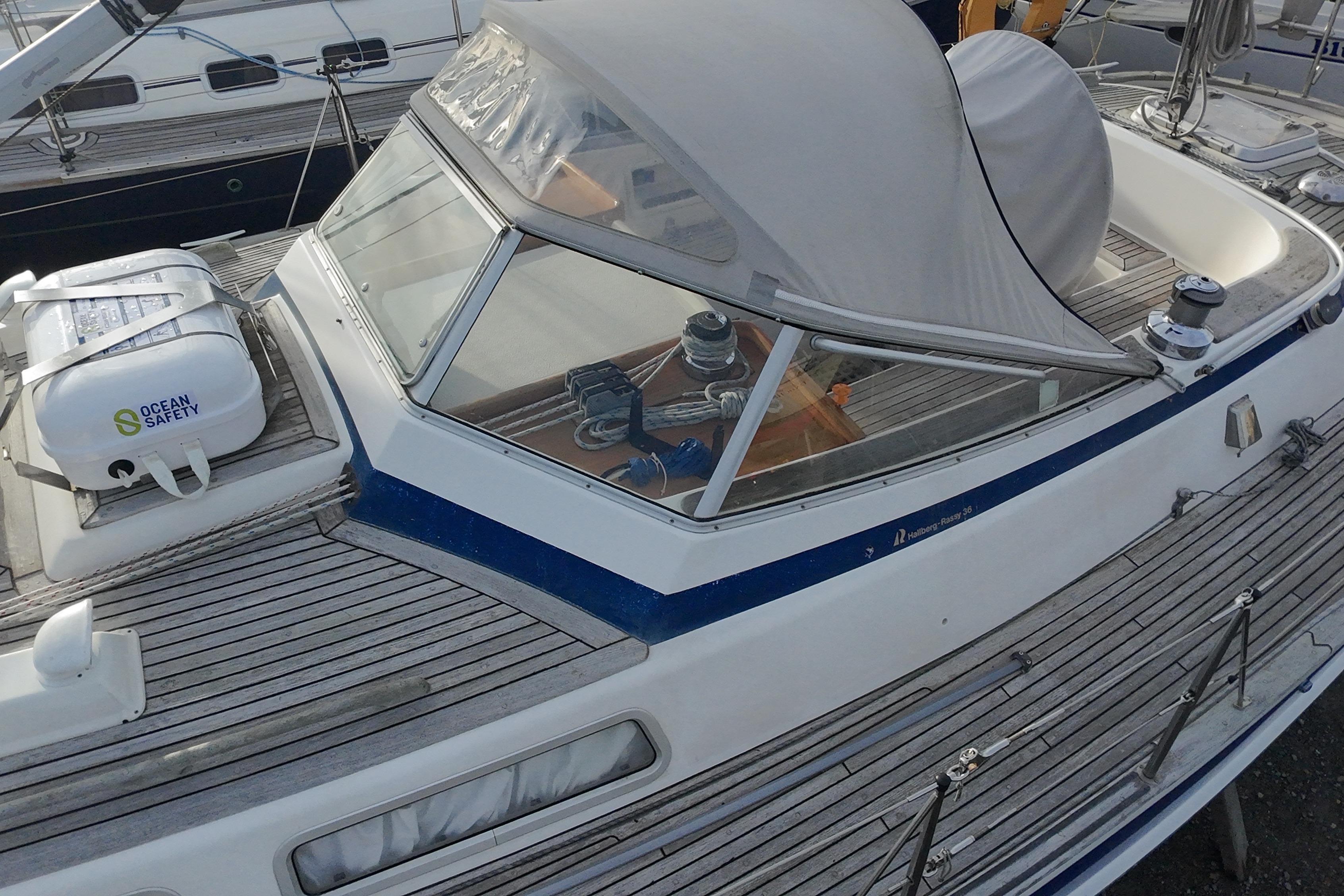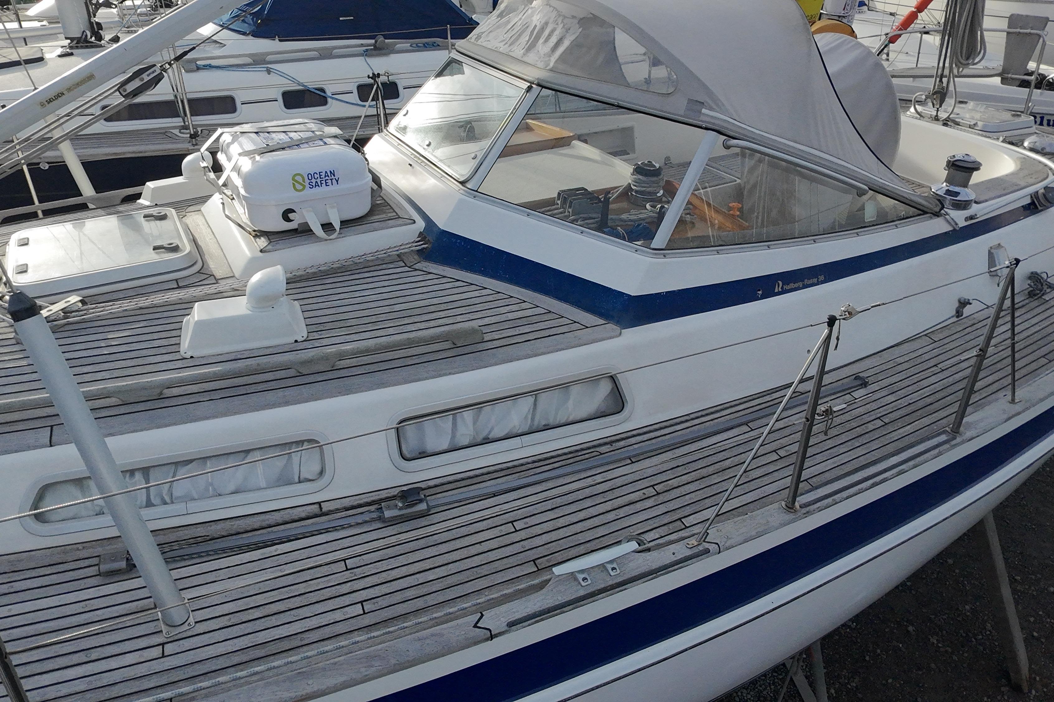 Toe rail, pushpit seats, outboard bracket, hand rails and all other woodwork on deck in solid teak.