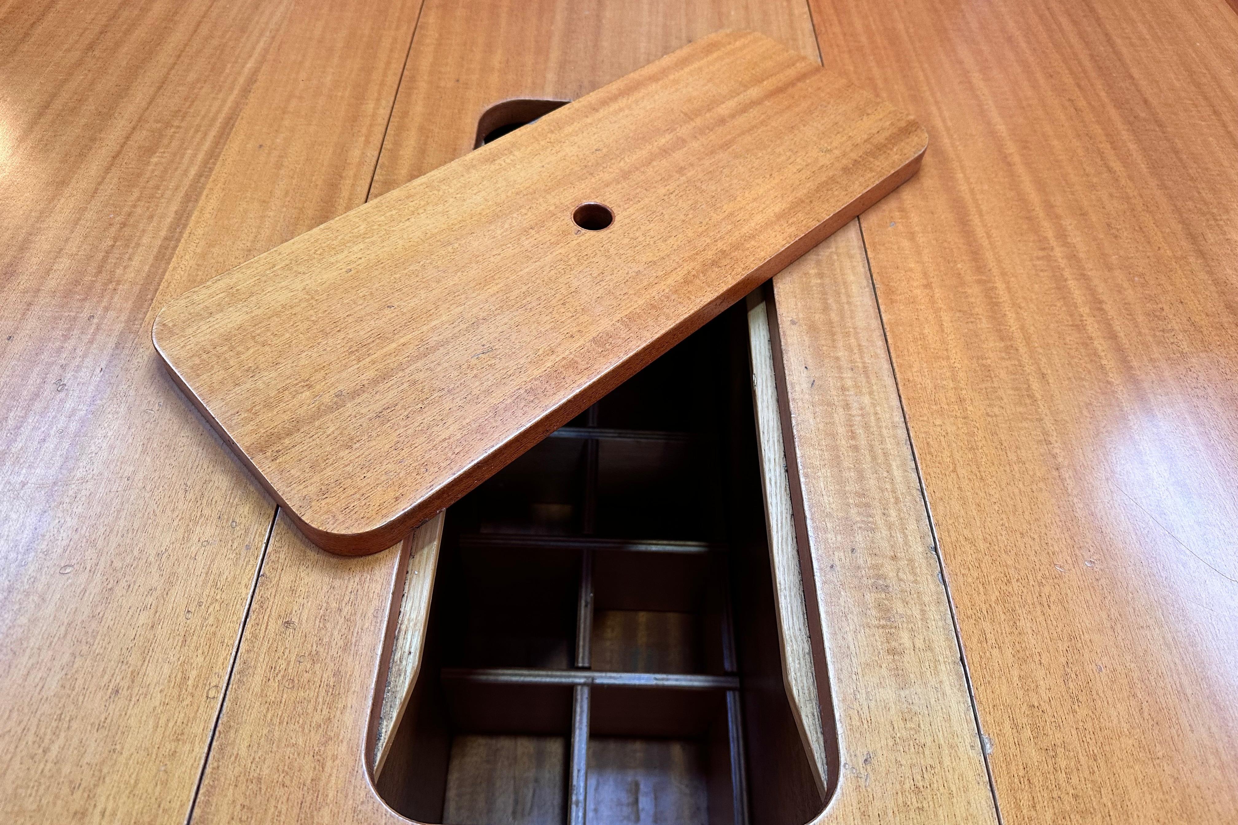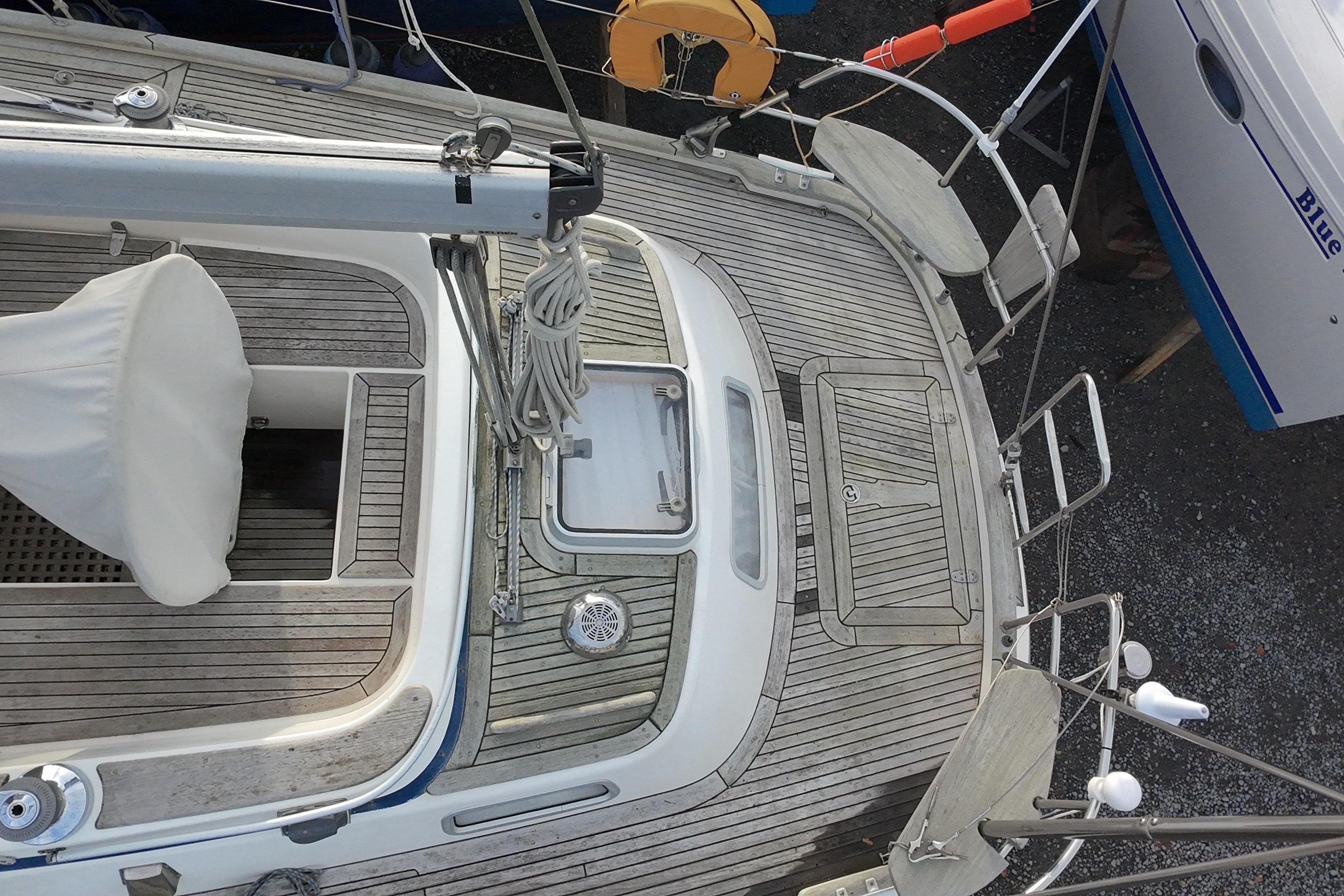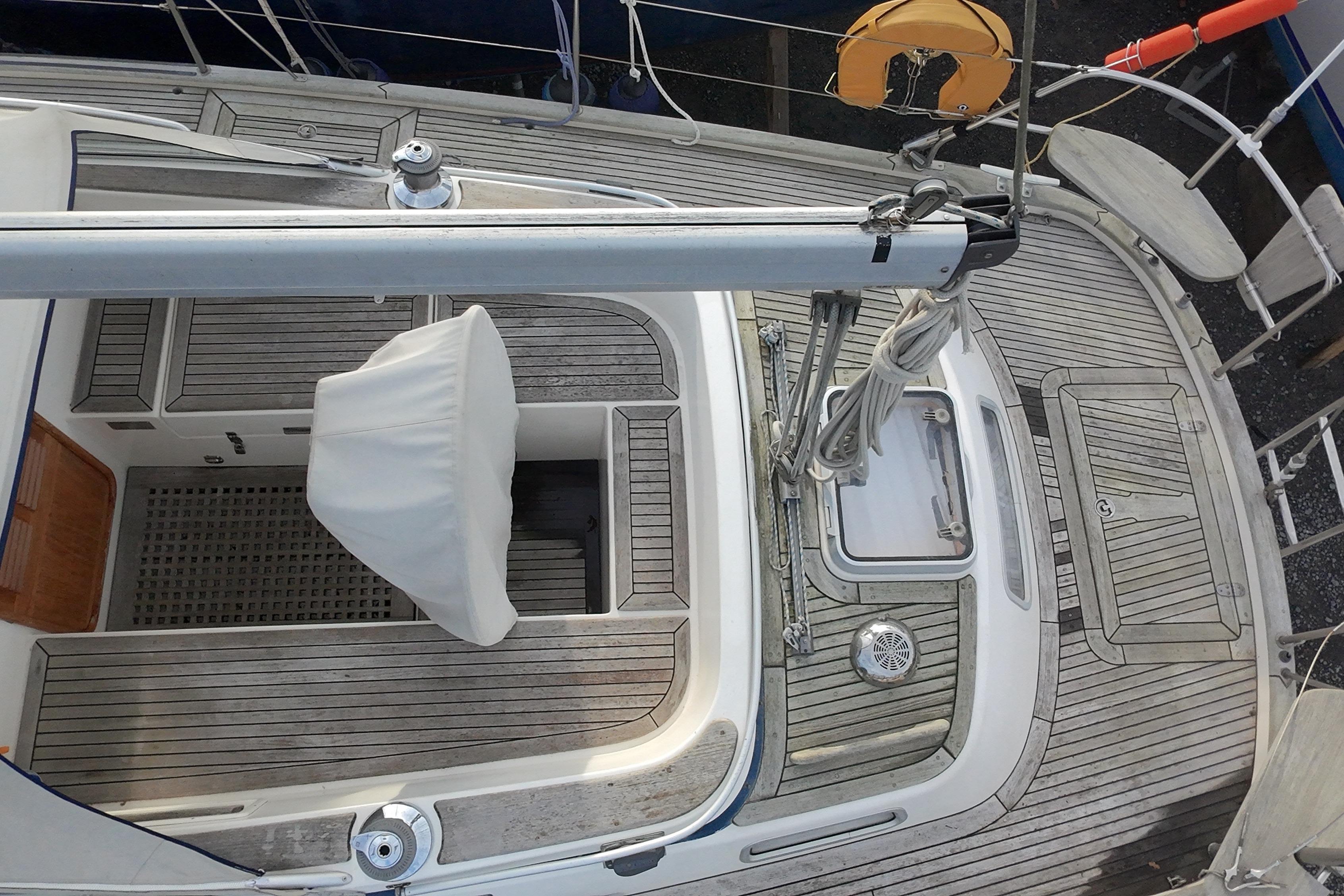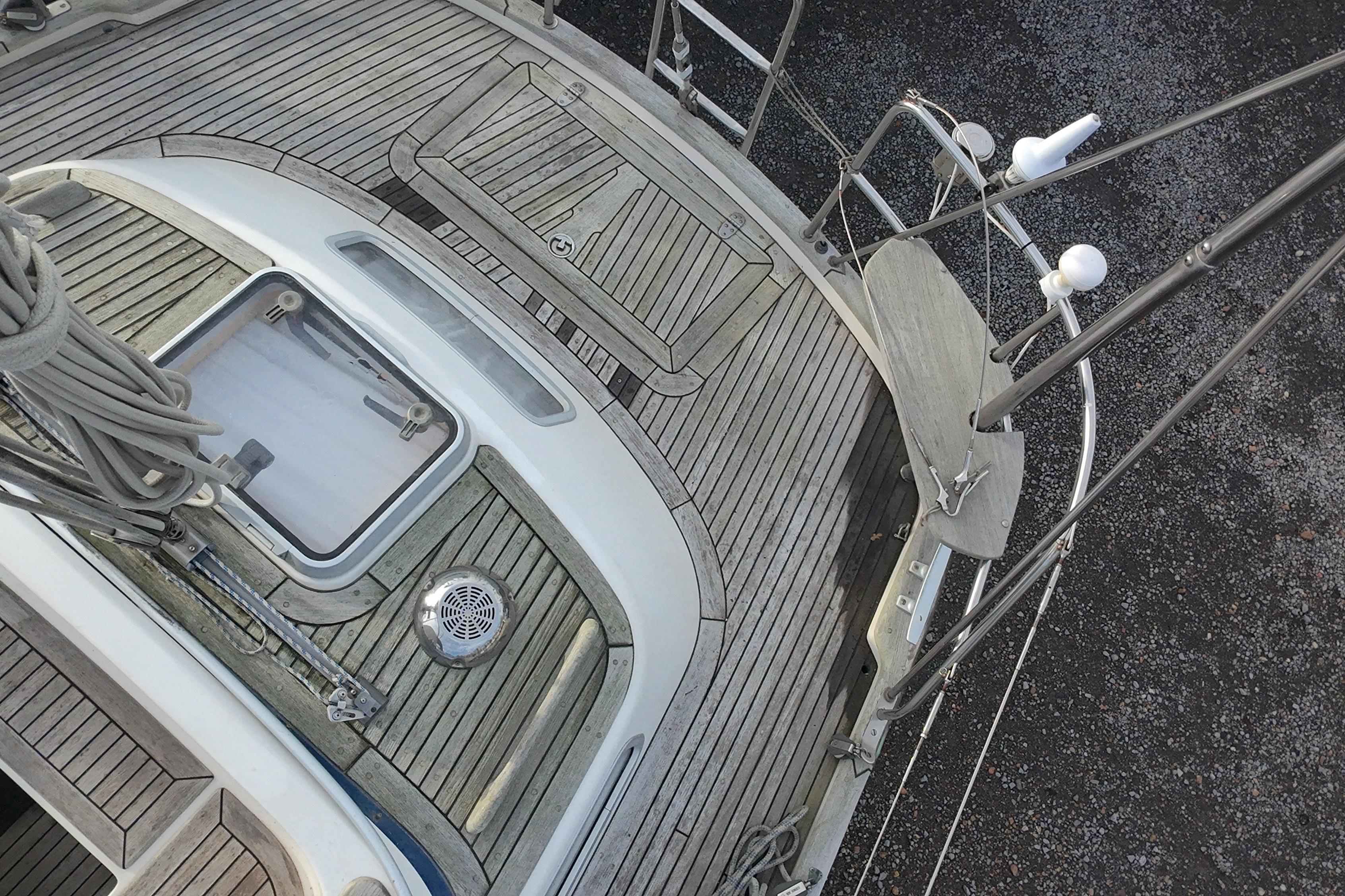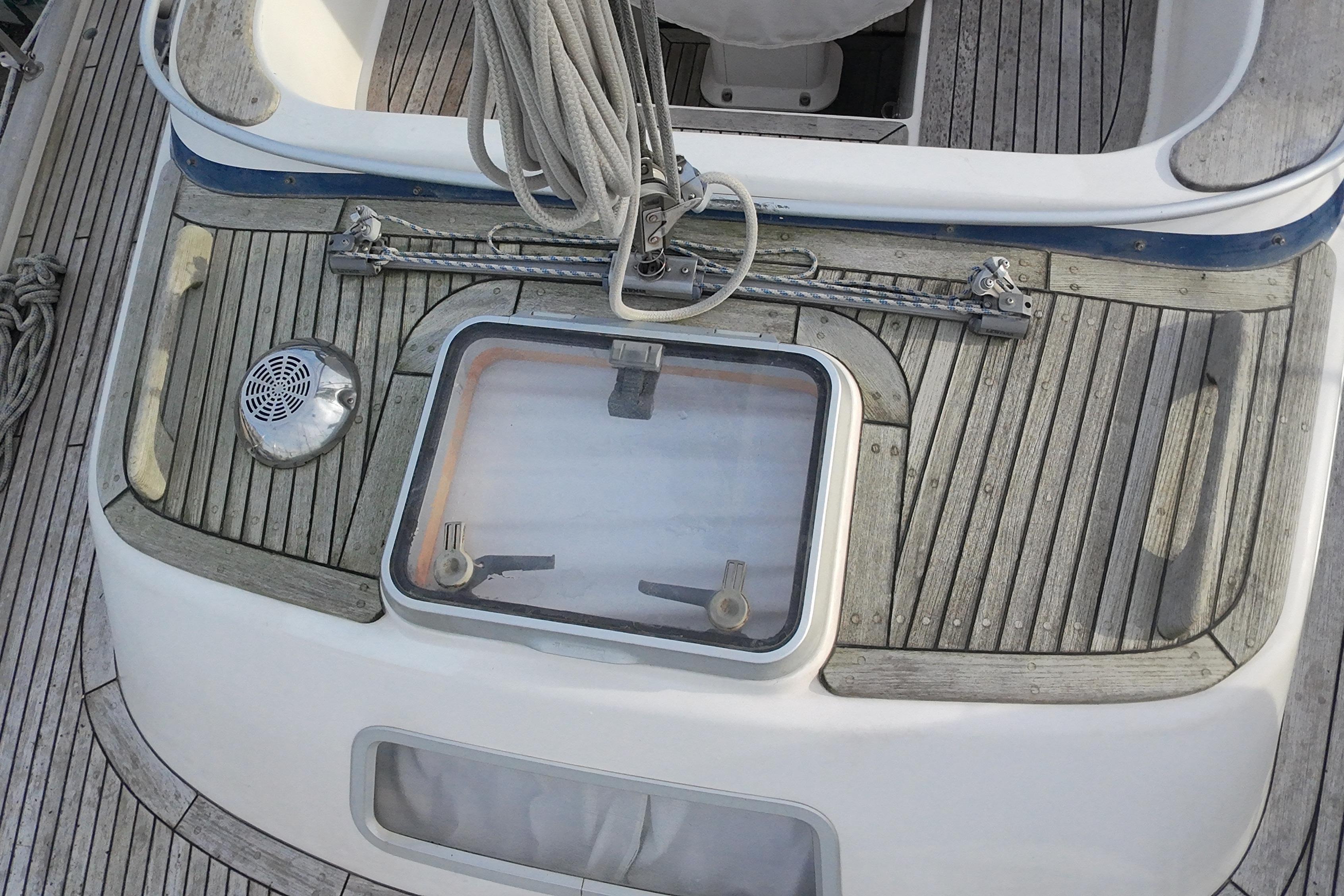Teak grating in forward section of self draining cockpit.