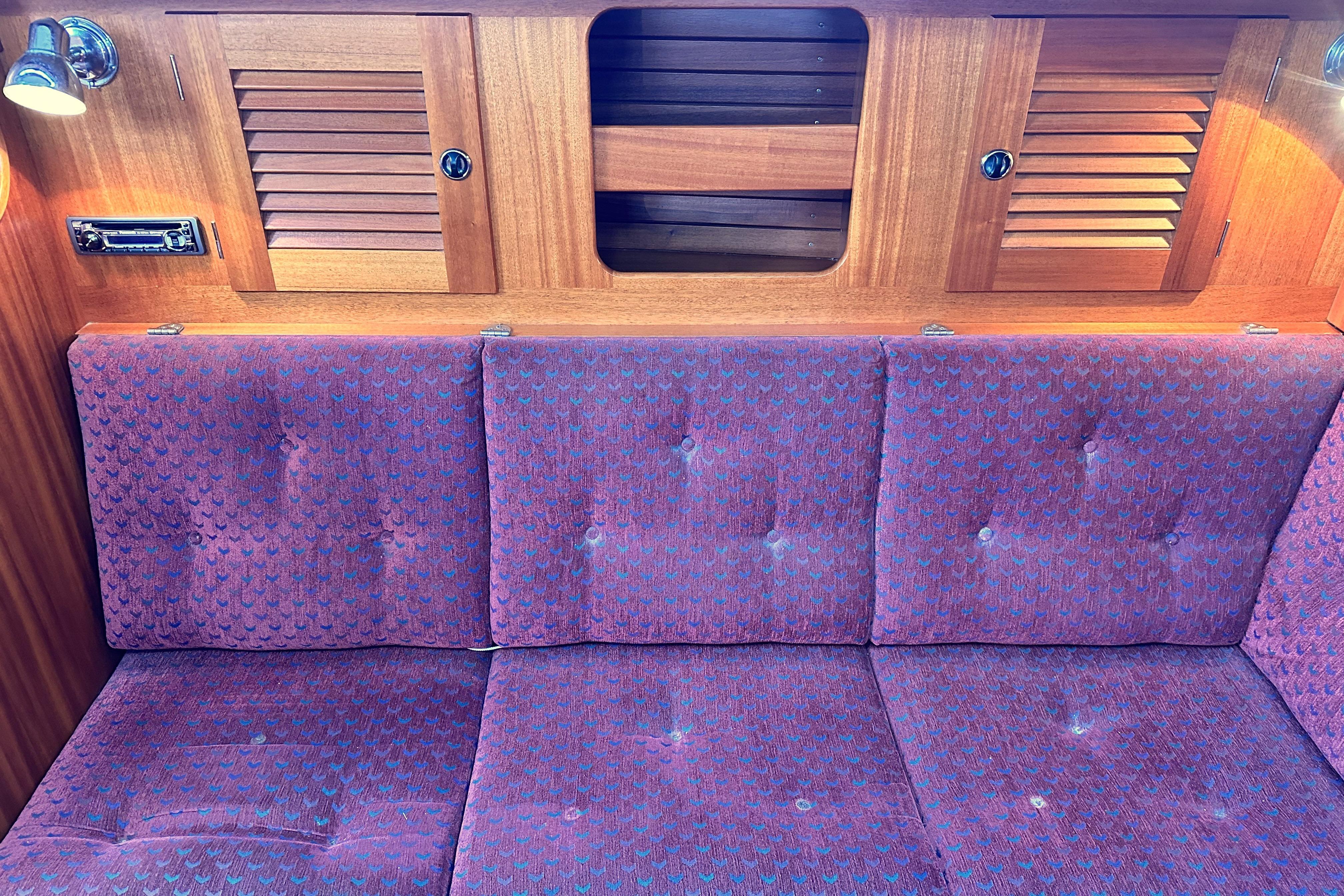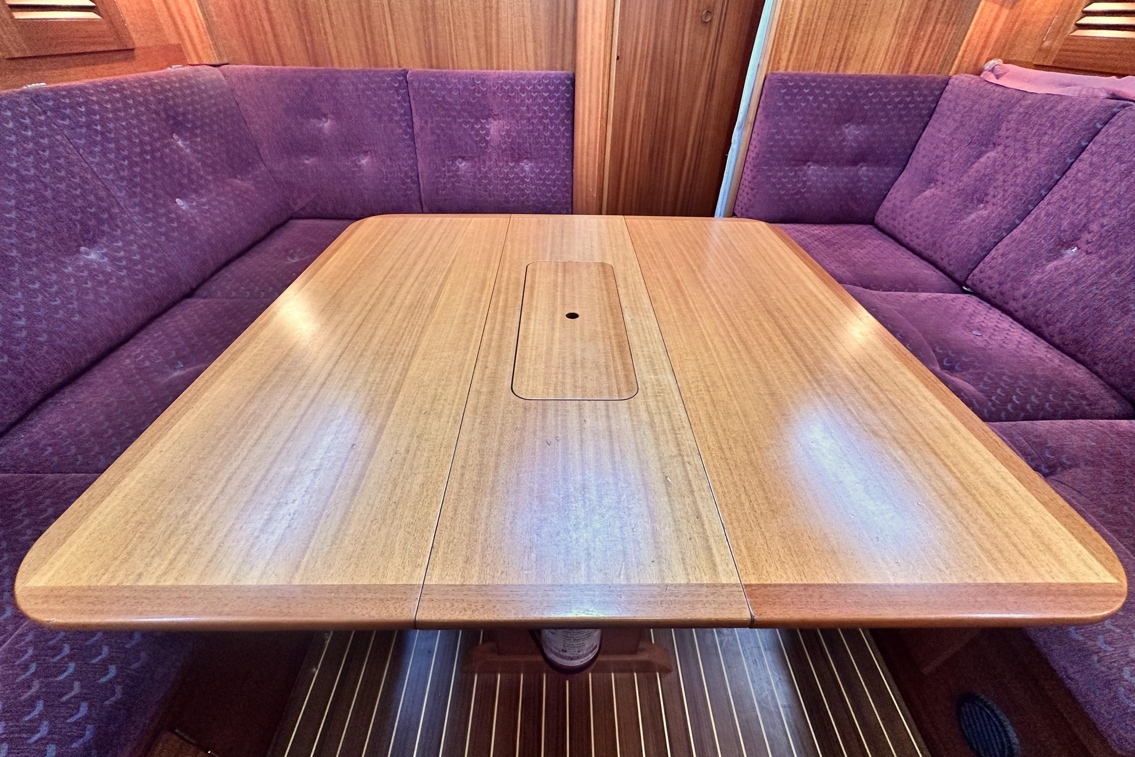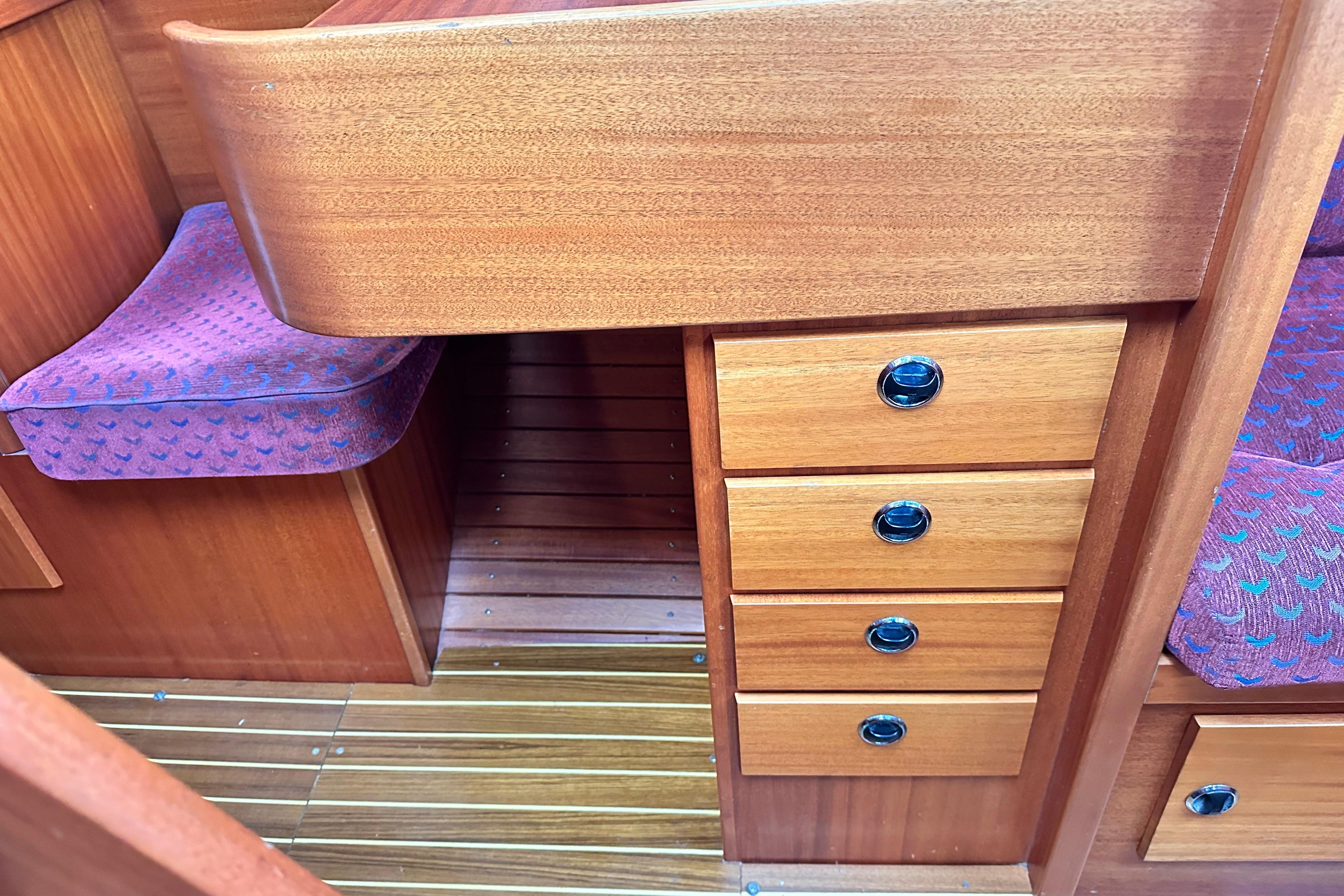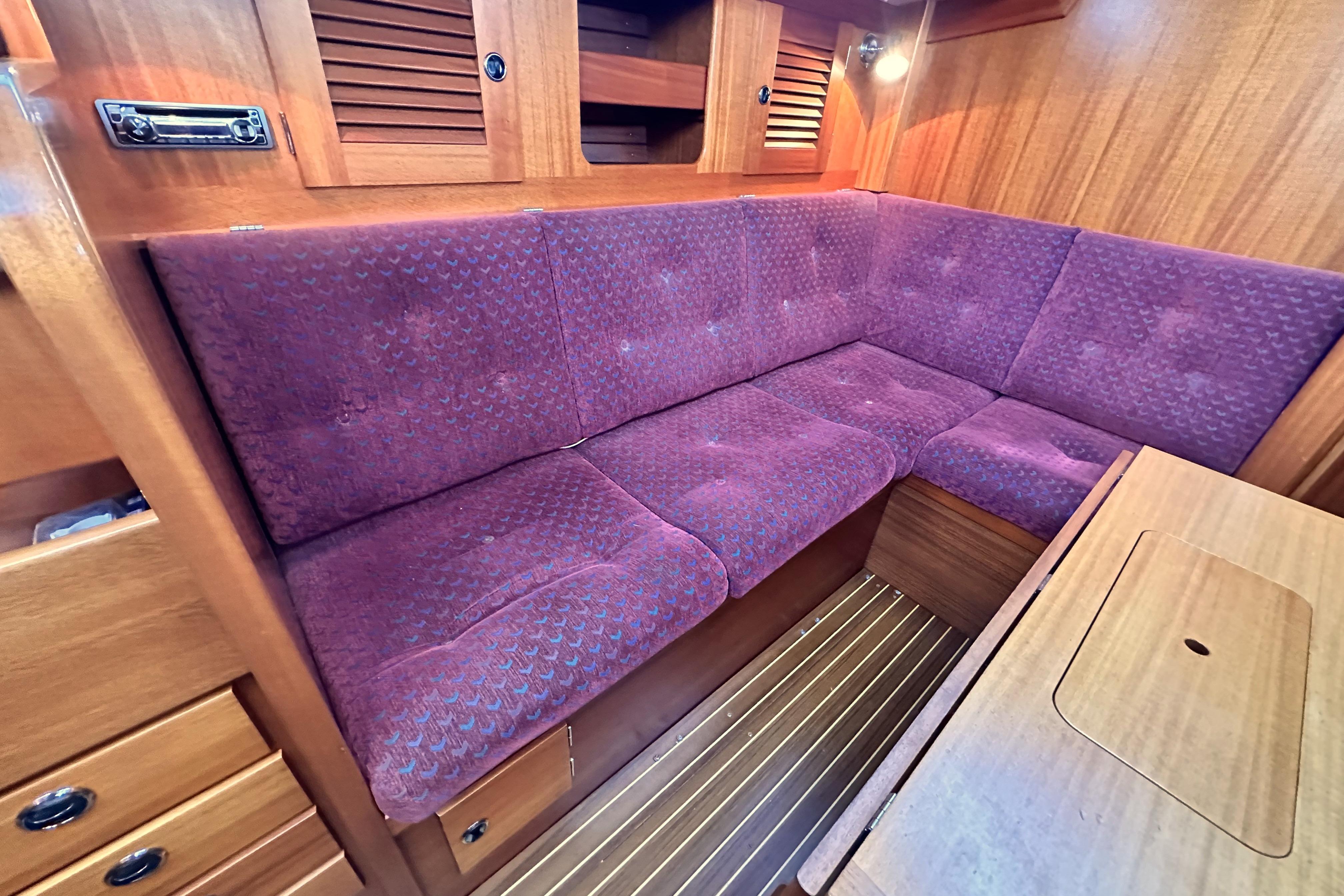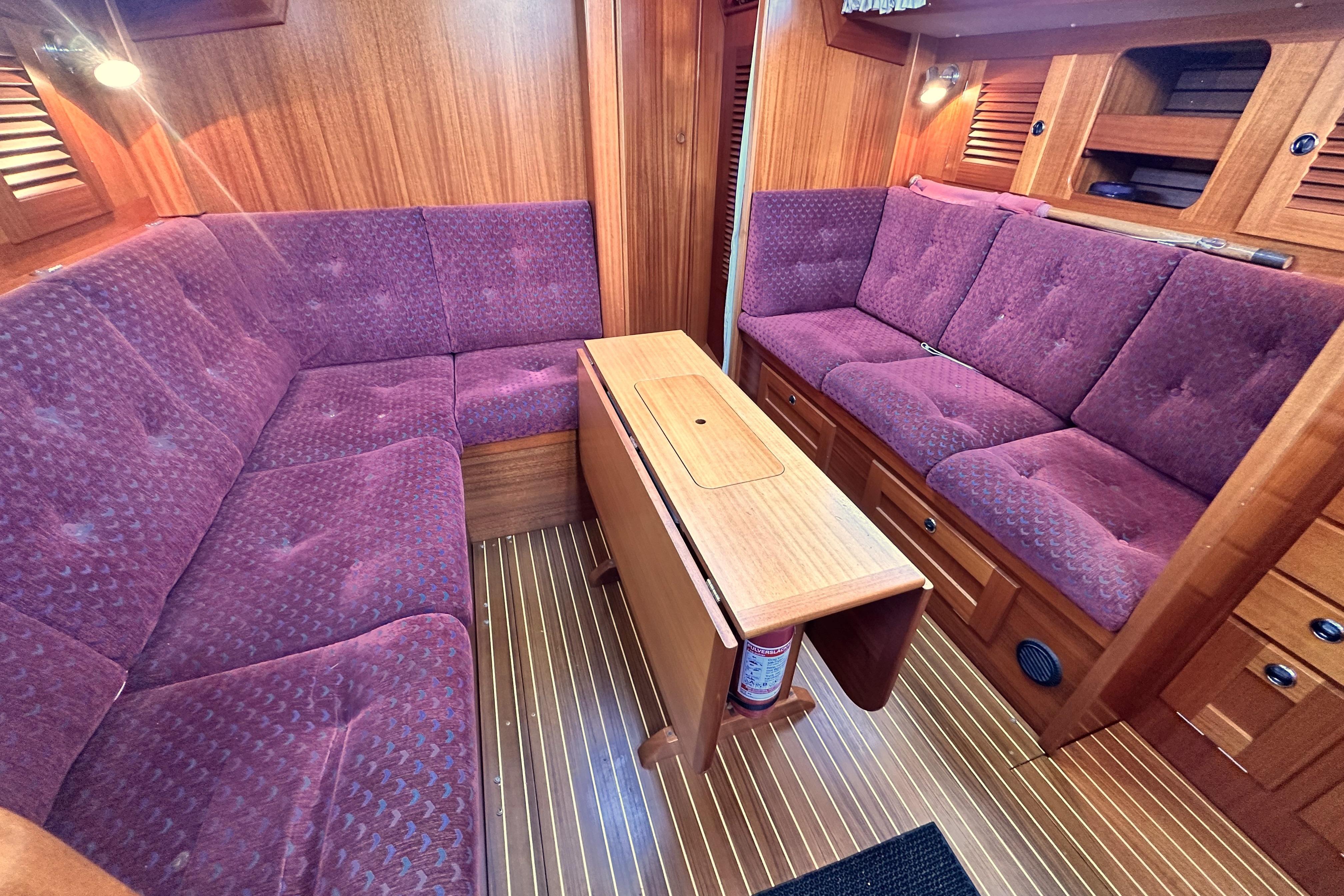 A solid mahogany mast support is fitted adjacent to the main bulkhead. On port side there is an L-shaped settee. On the starboard side there is a straight settee. Both settee backrests lift up to provide extra width for sleeping or additional stowage. Two opening Portlights. Large dropleaf table with bottle stowage in centre section. Panasonic radio (FM/AM/LW), stereo speakers in main saloon and in cockpit. Clock and aneroid barometer in main saloon. Small TV with Glomex antenna at masthead