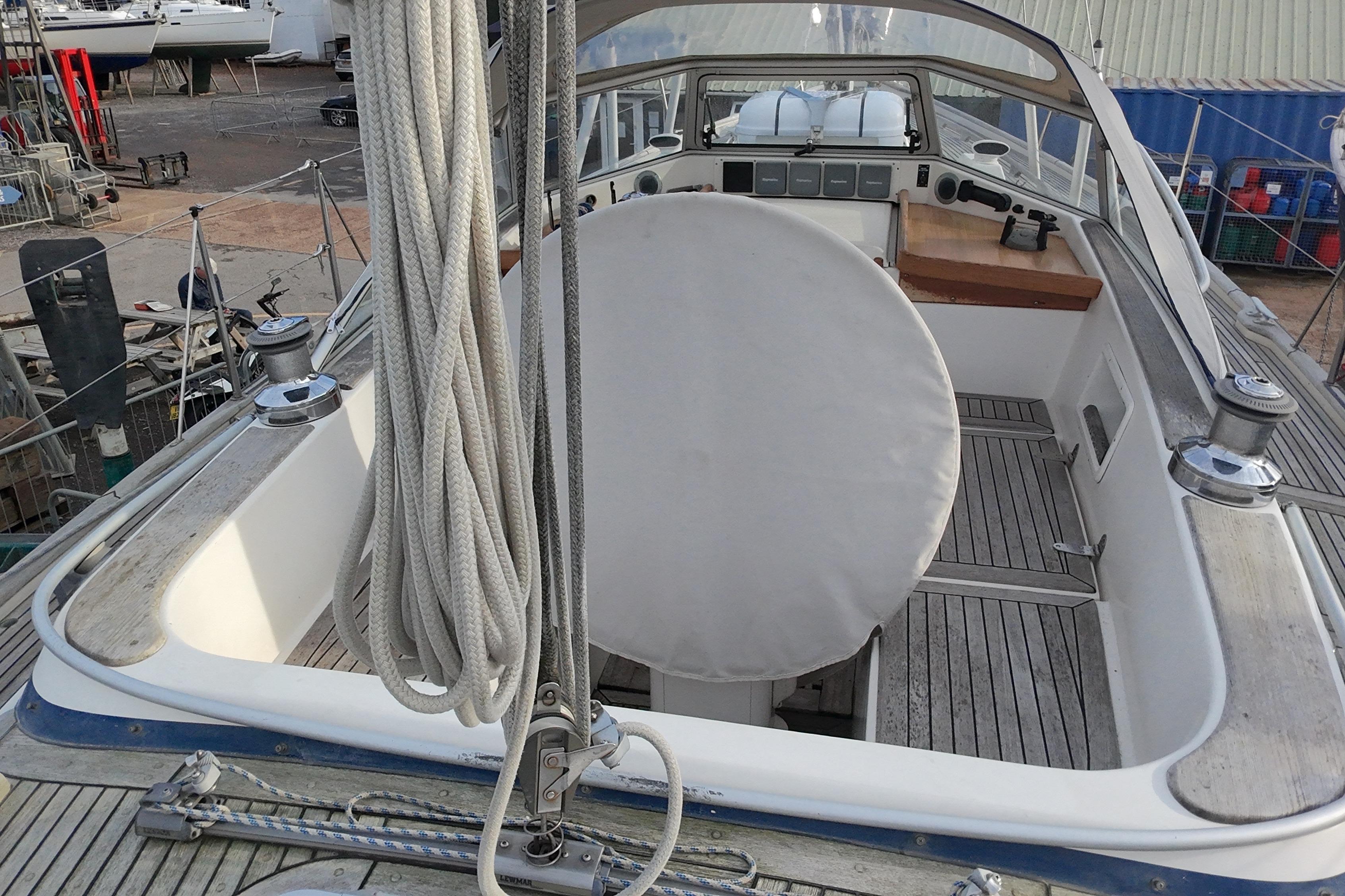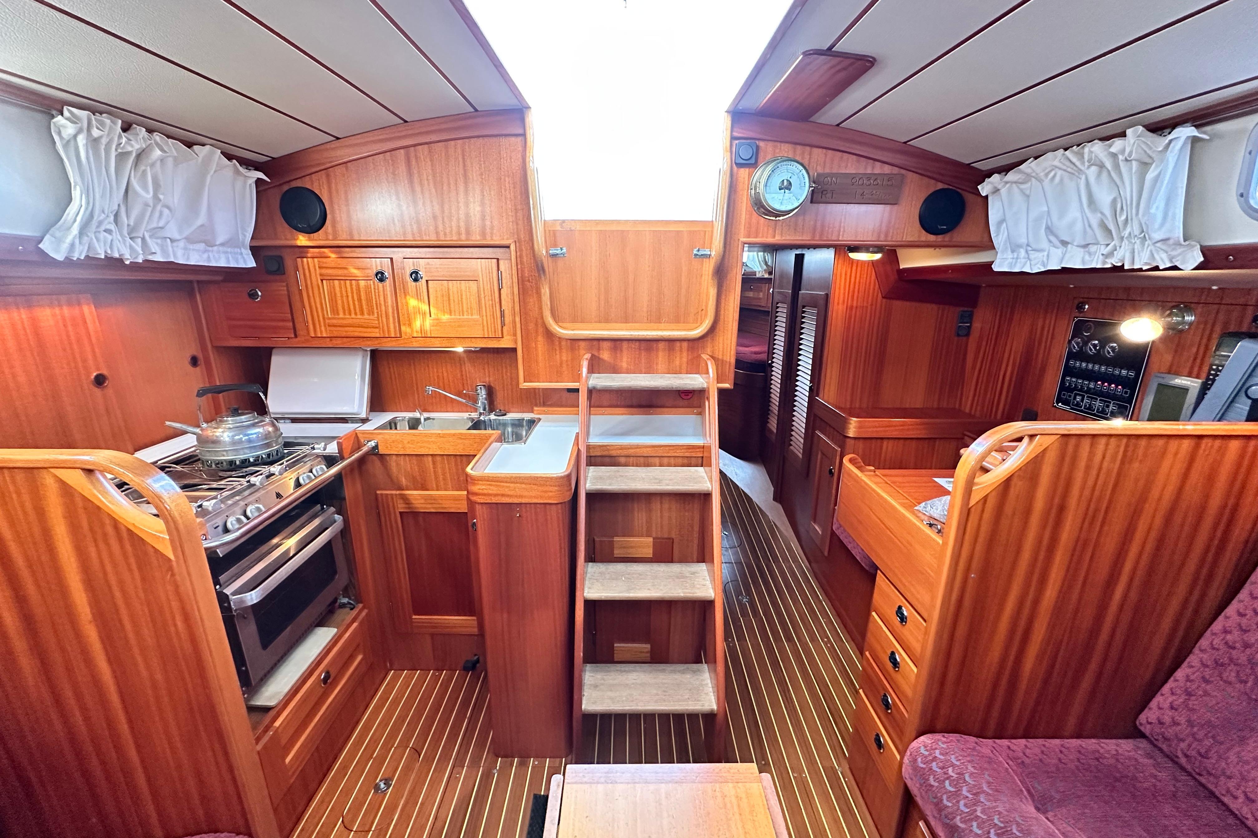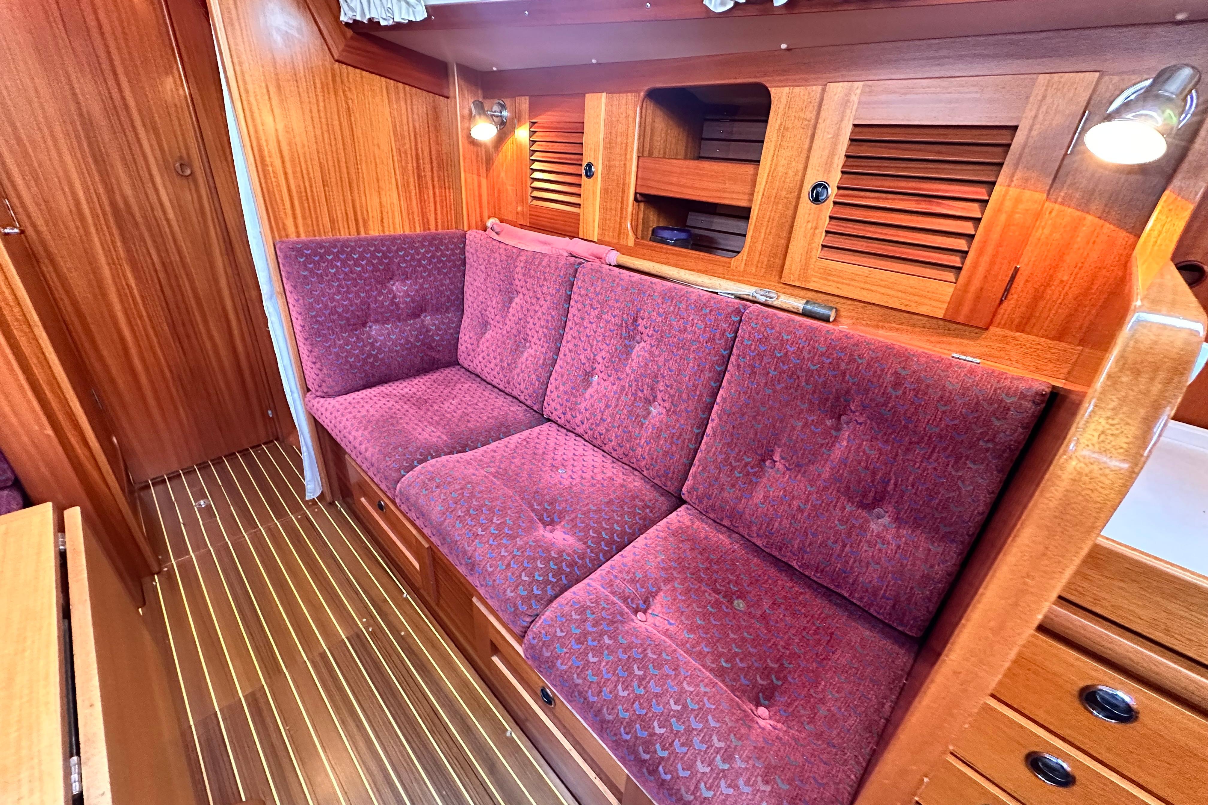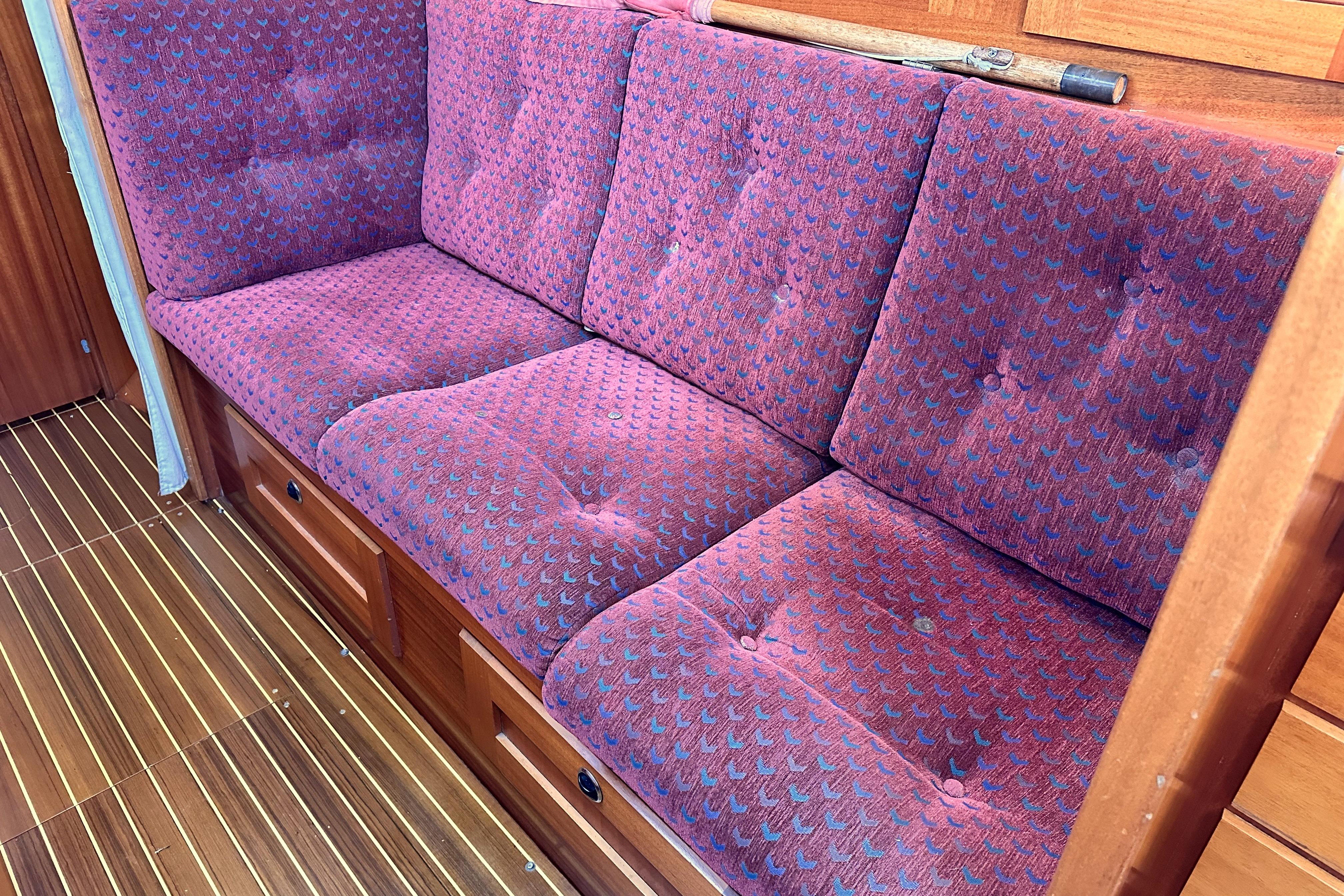 A solid mahogany mast support is fitted adjacent to the main bulkhead. On port side there is an L-shaped settee. On the starboard side there is a straight settee. Both settee backrests lift up to provide extra width for sleeping or additional stowage. Two opening Portlights. Large dropleaf table with bottle stowage in centre section. Panasonic radio (FM/AM/LW), stereo speakers in main saloon and in cockpit. Clock and aneroid barometer in main saloon. Small TV with Glomex antenna at masthead