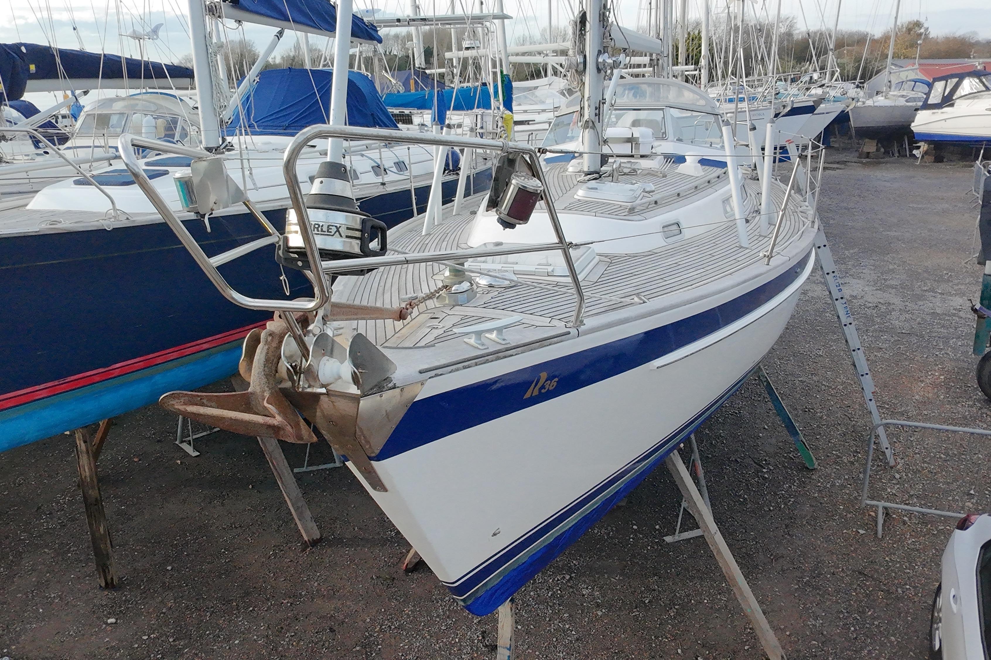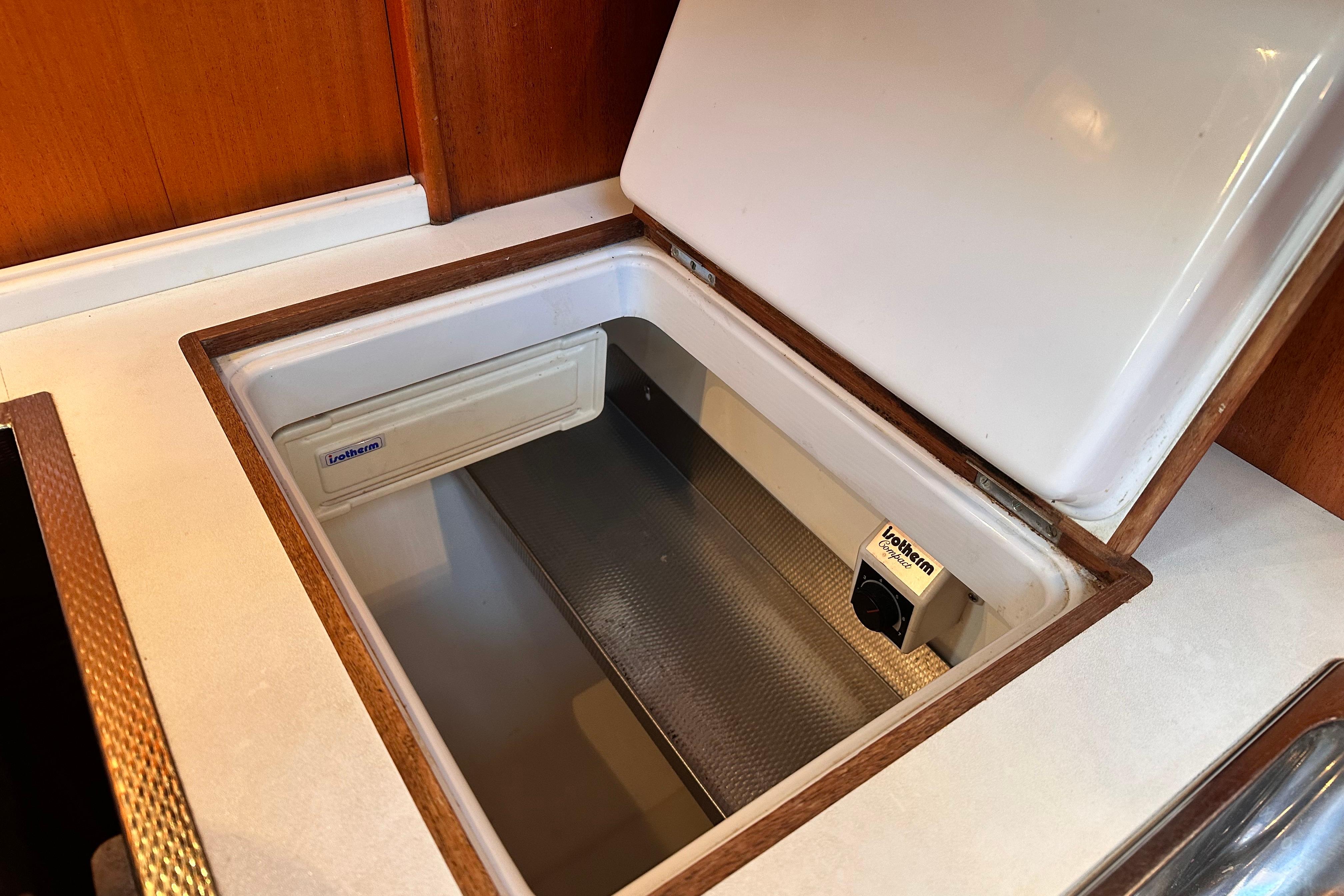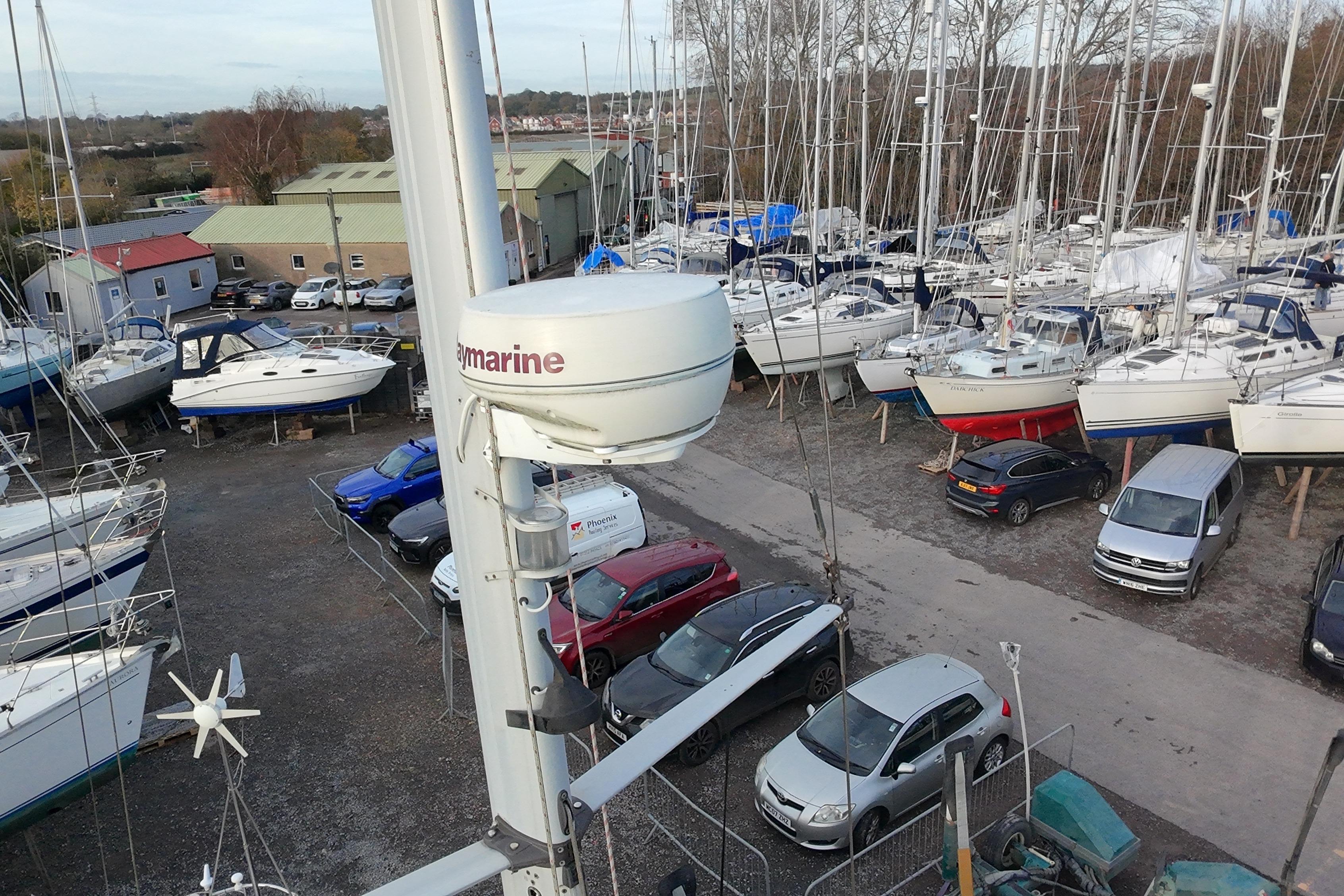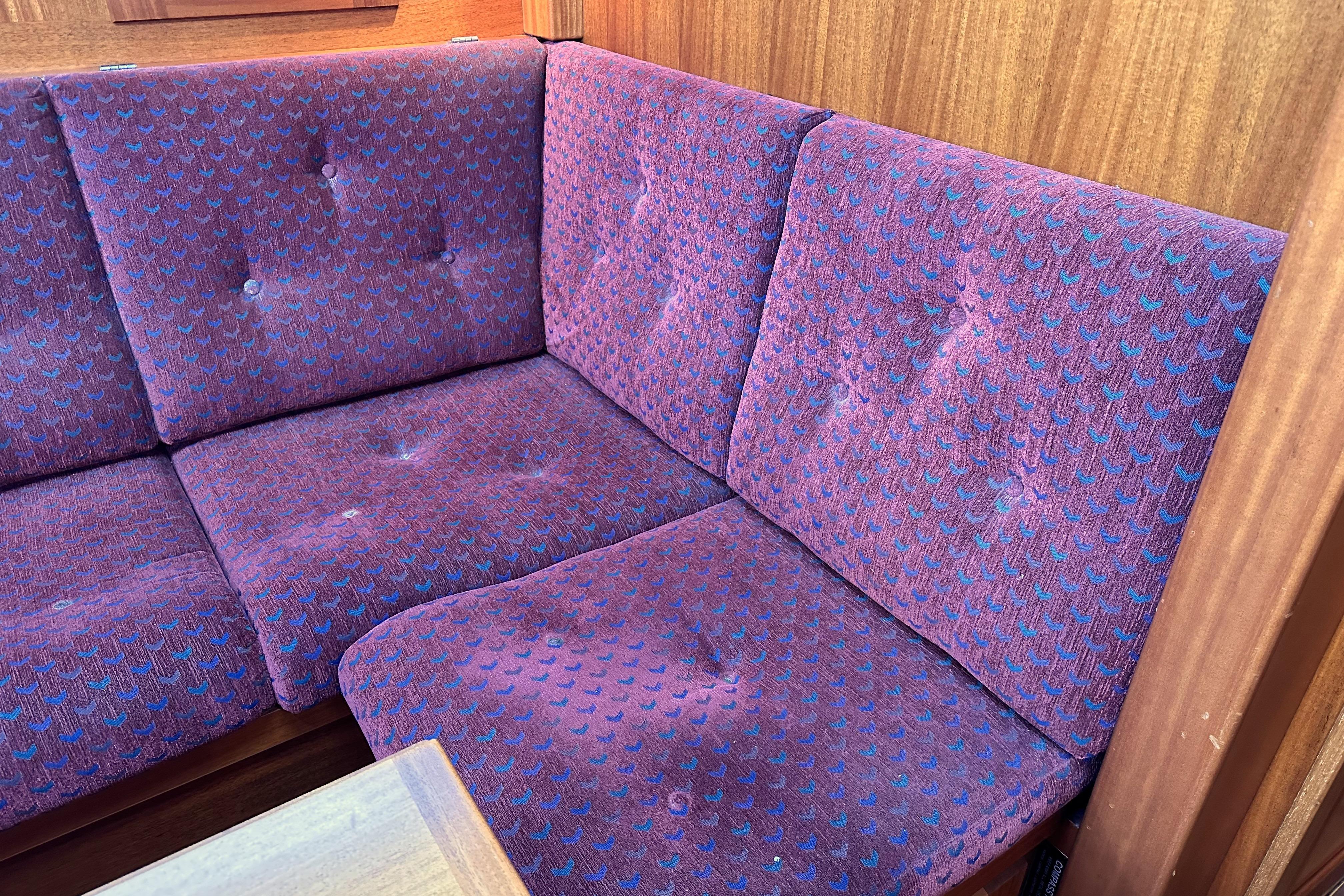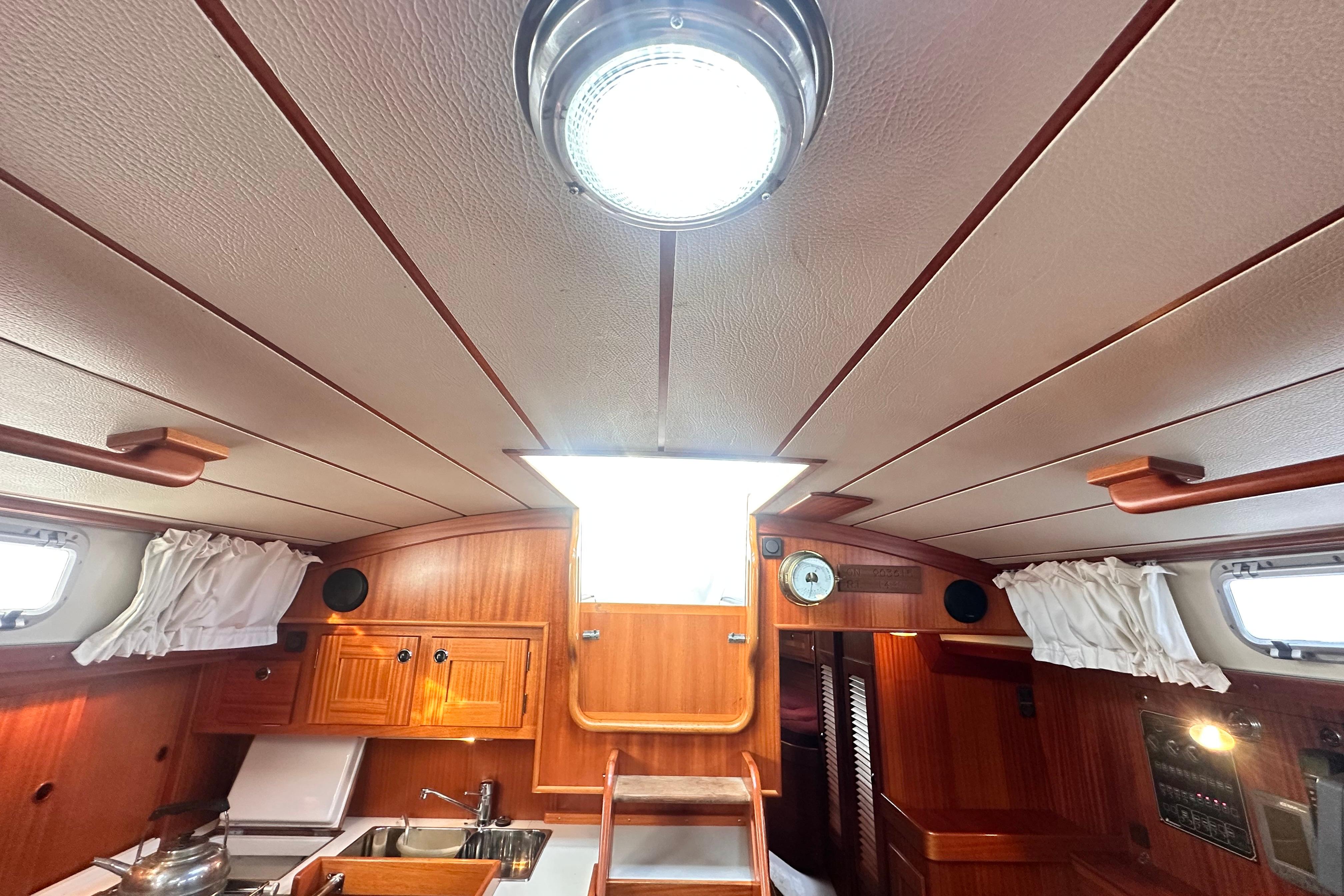 A solid mahogany mast support is fitted adjacent to the main bulkhead. On port side there is an L-shaped settee. On the starboard side there is a straight settee. Both settee backrests lift up to provide extra width for sleeping or additional stowage. Two opening Portlights. Large dropleaf table with bottle stowage in centre section. Panasonic radio (FM/AM/LW), stereo speakers in main saloon and in cockpit. Clock and aneroid barometer in main saloon. Small TV with Glomex antenna at masthead