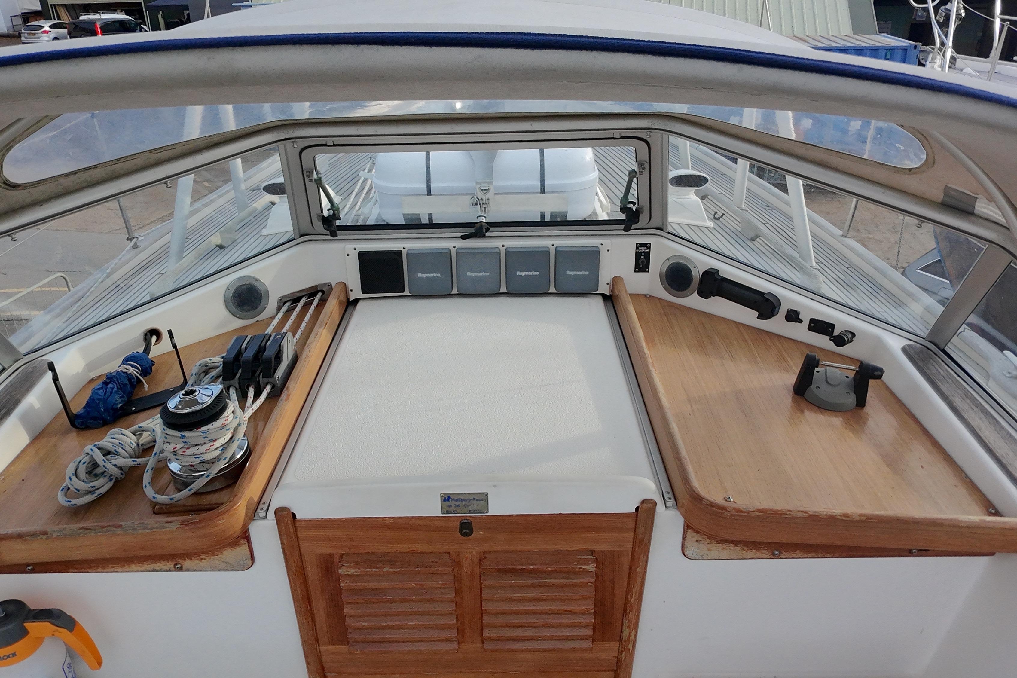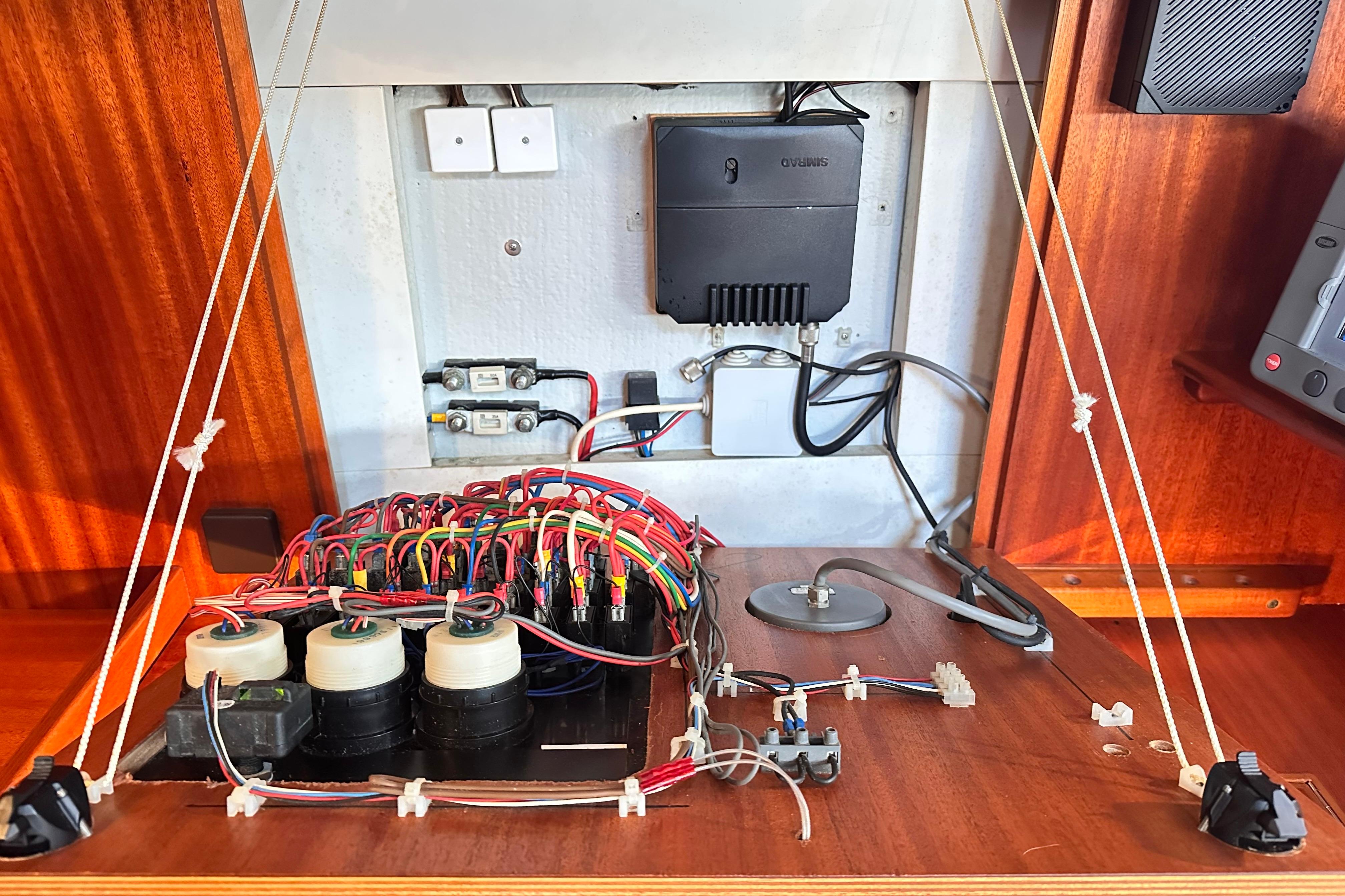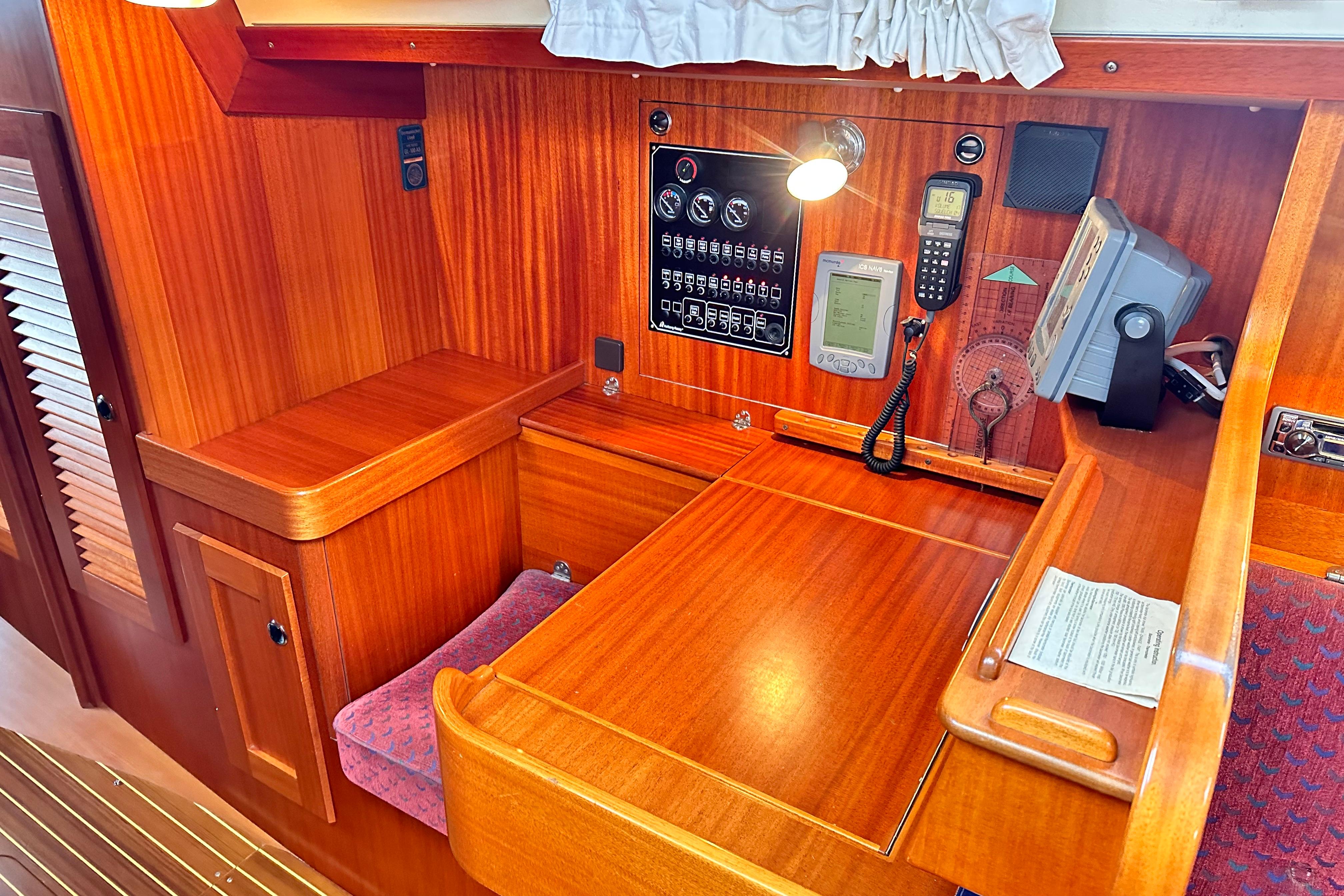 Chart table with seat. 4 drawers and stowage slots. Instrument shelf. There is a large rubber sealed 2-door access to the engine room from the walk through. On the port side there are various cupboards. Electrical switch panel.