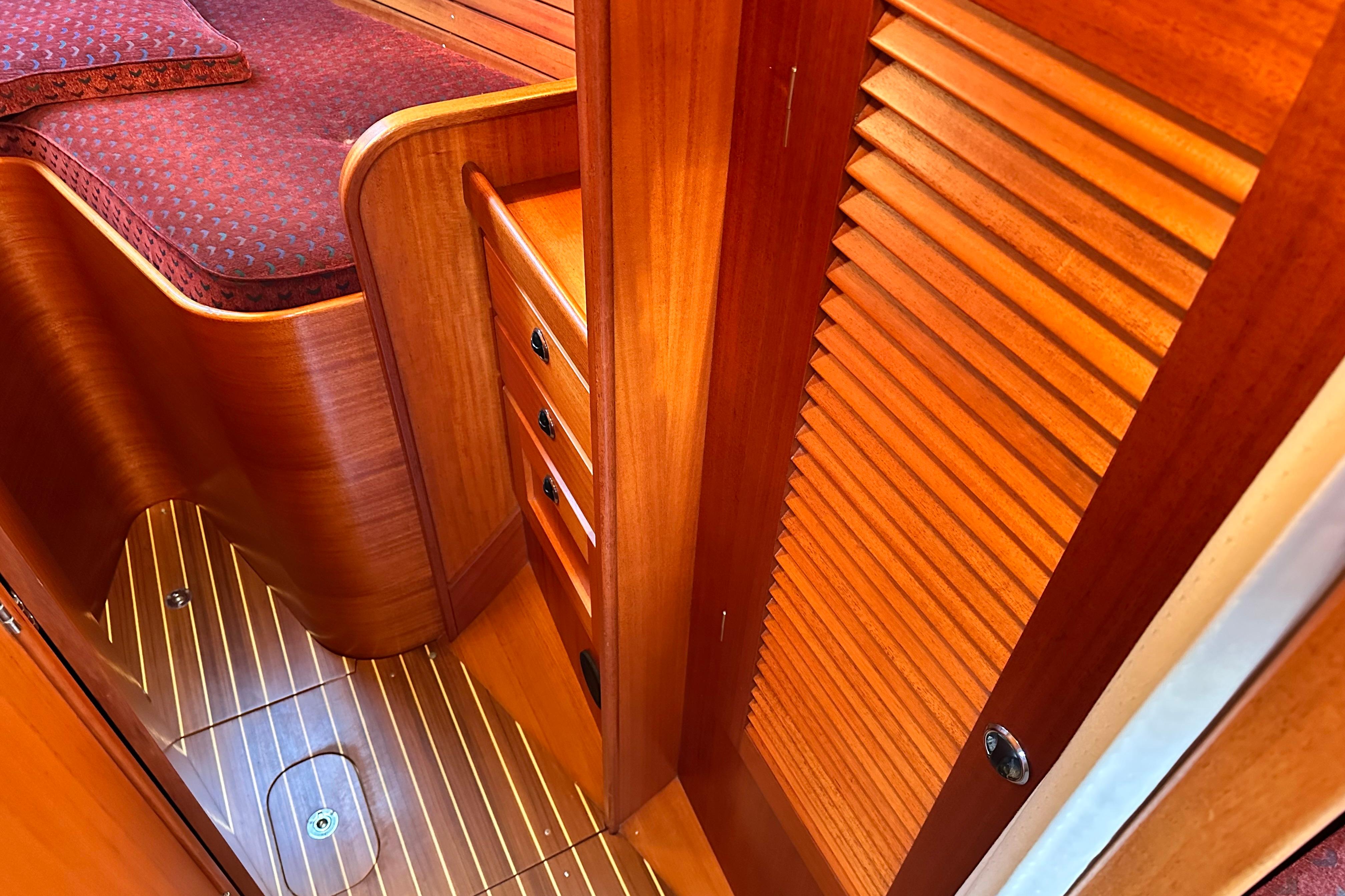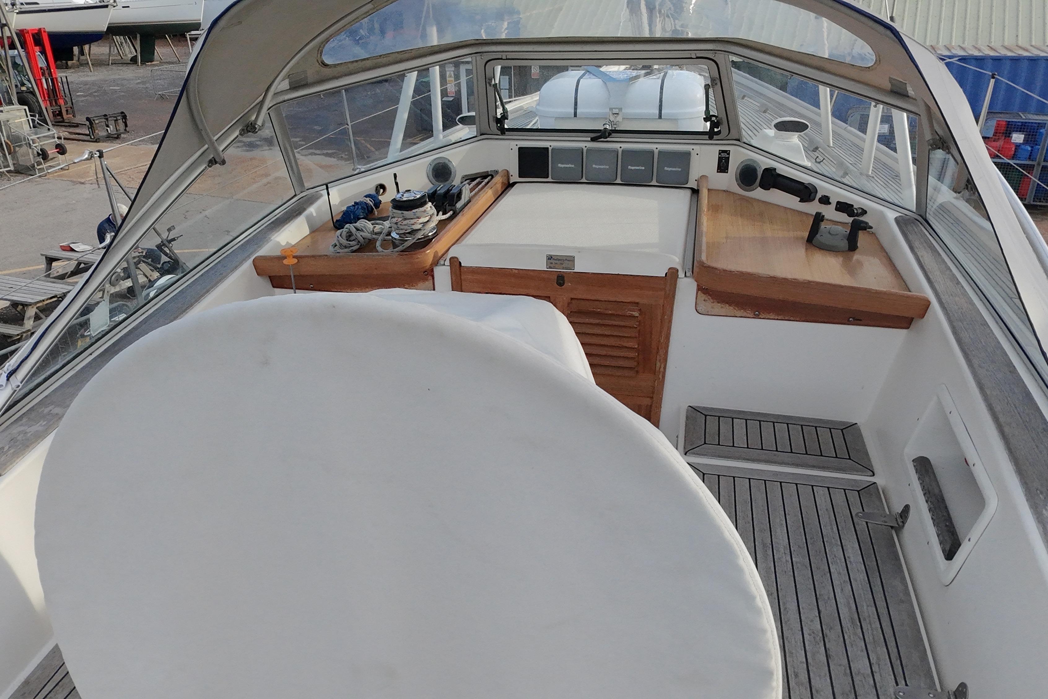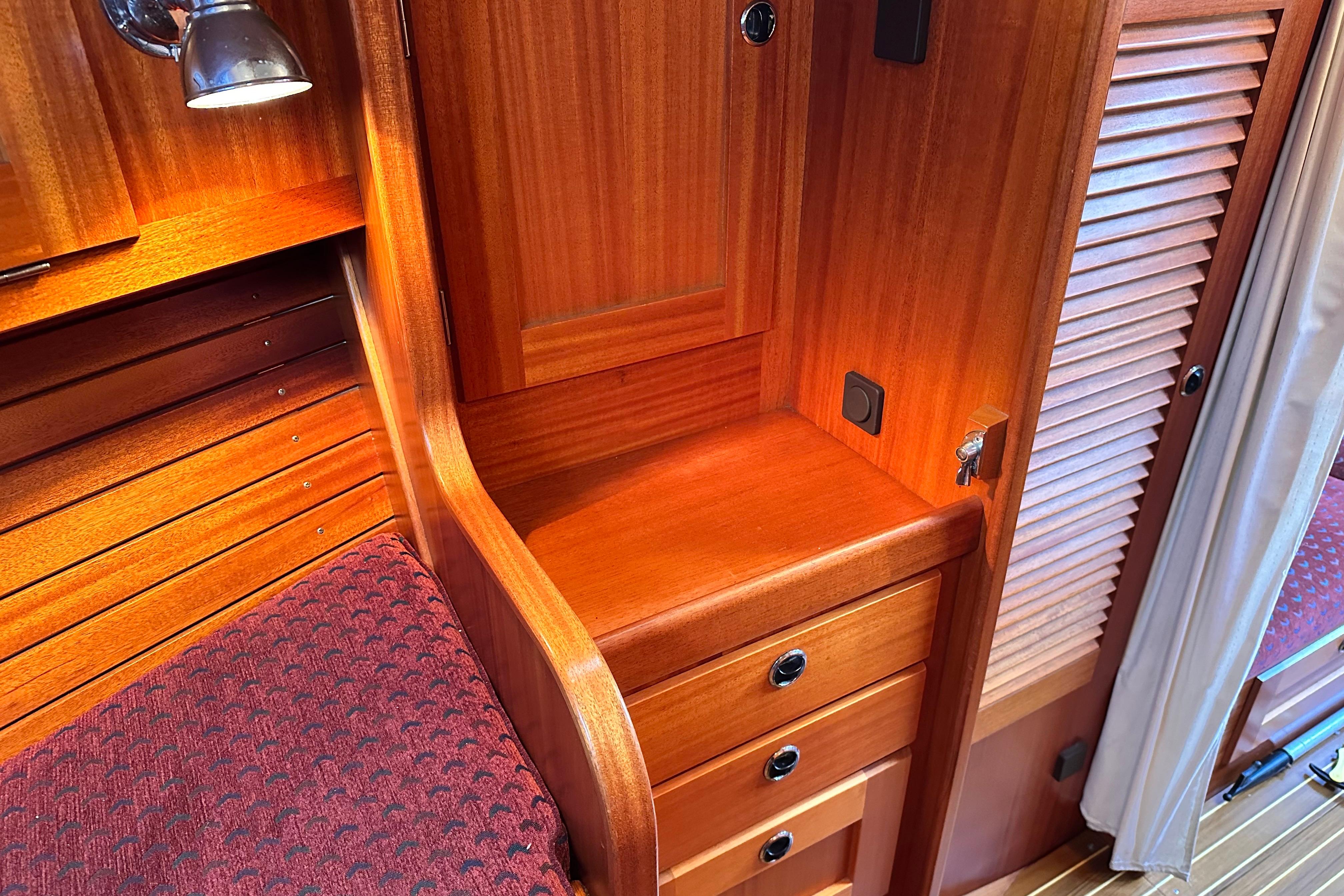 Chart table with seat. 4 drawers and stowage slots. Instrument shelf. There is a large rubber sealed 2-door access to the engine room from the walk through. On the port side there are various cupboards. Electrical switch panel.