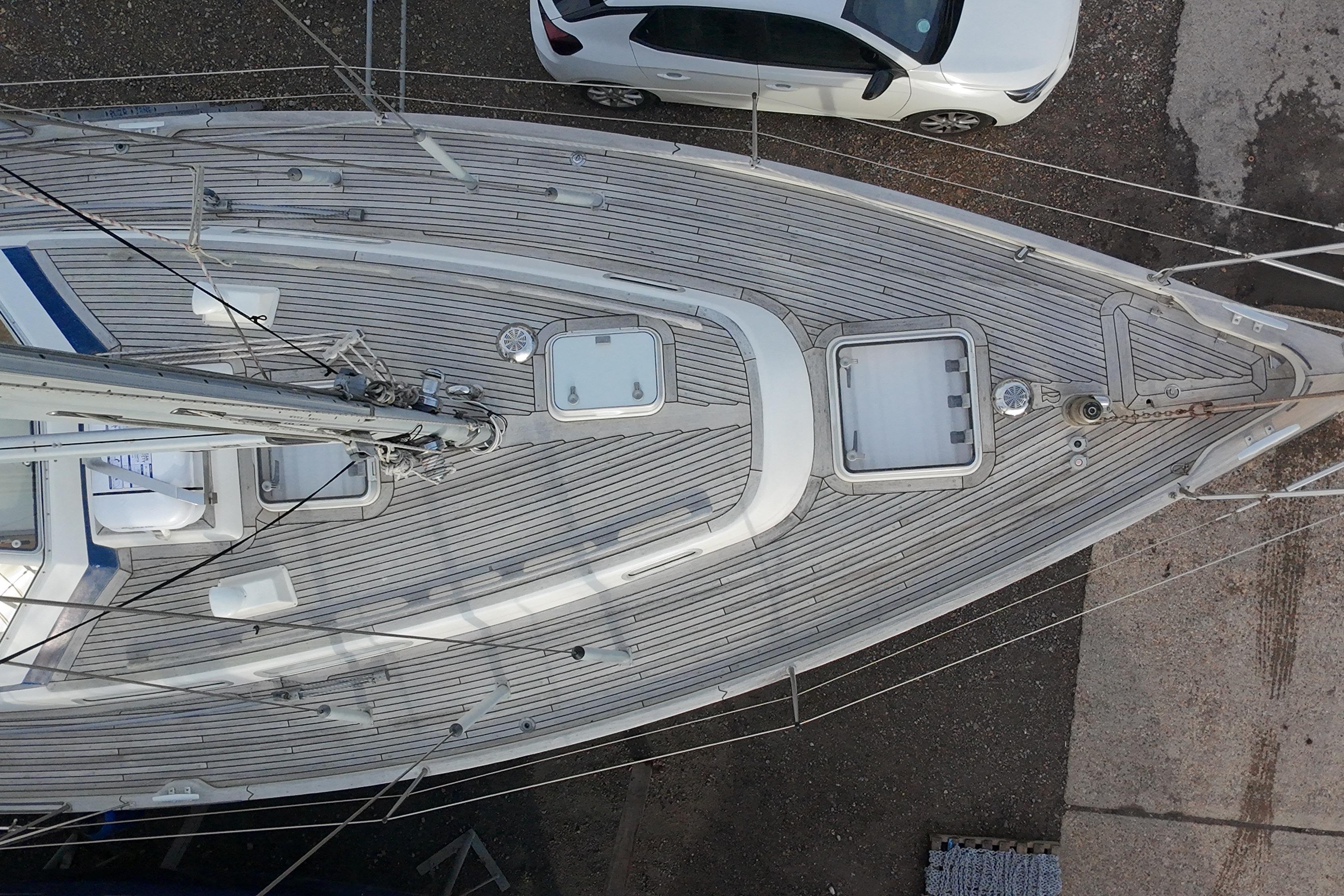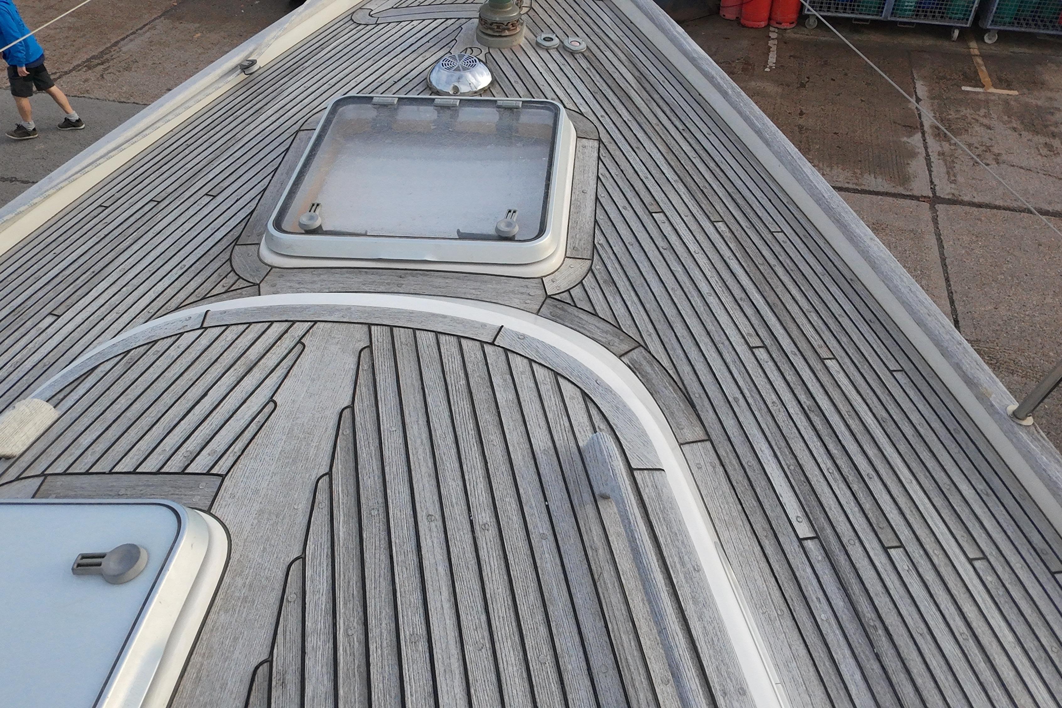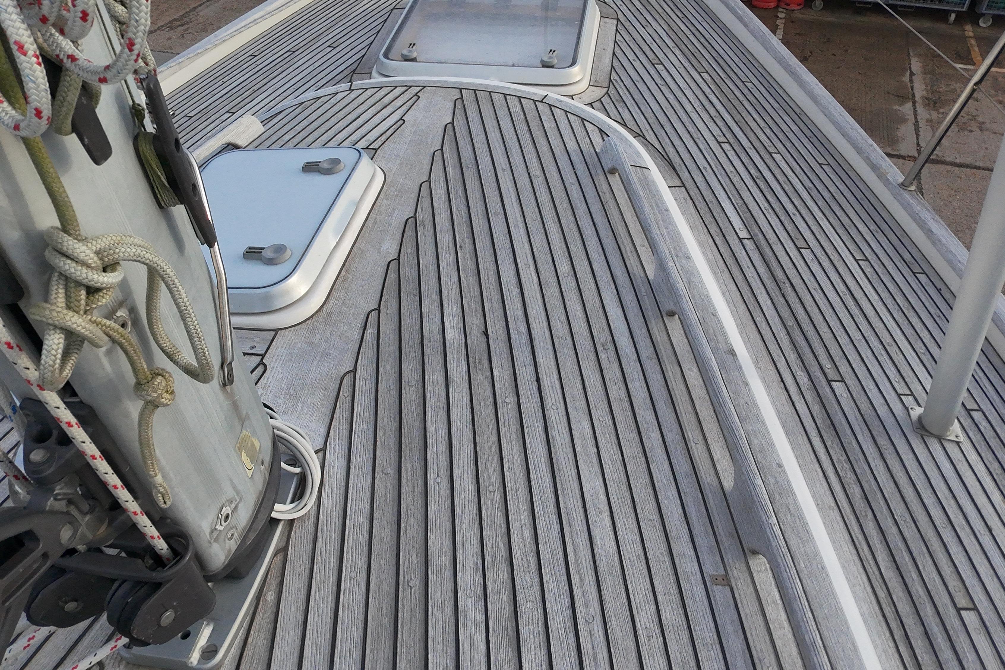 Teak side deck, aft deck, coachroof, bathing platform and cockpit seats in solid teak laid in rubber.