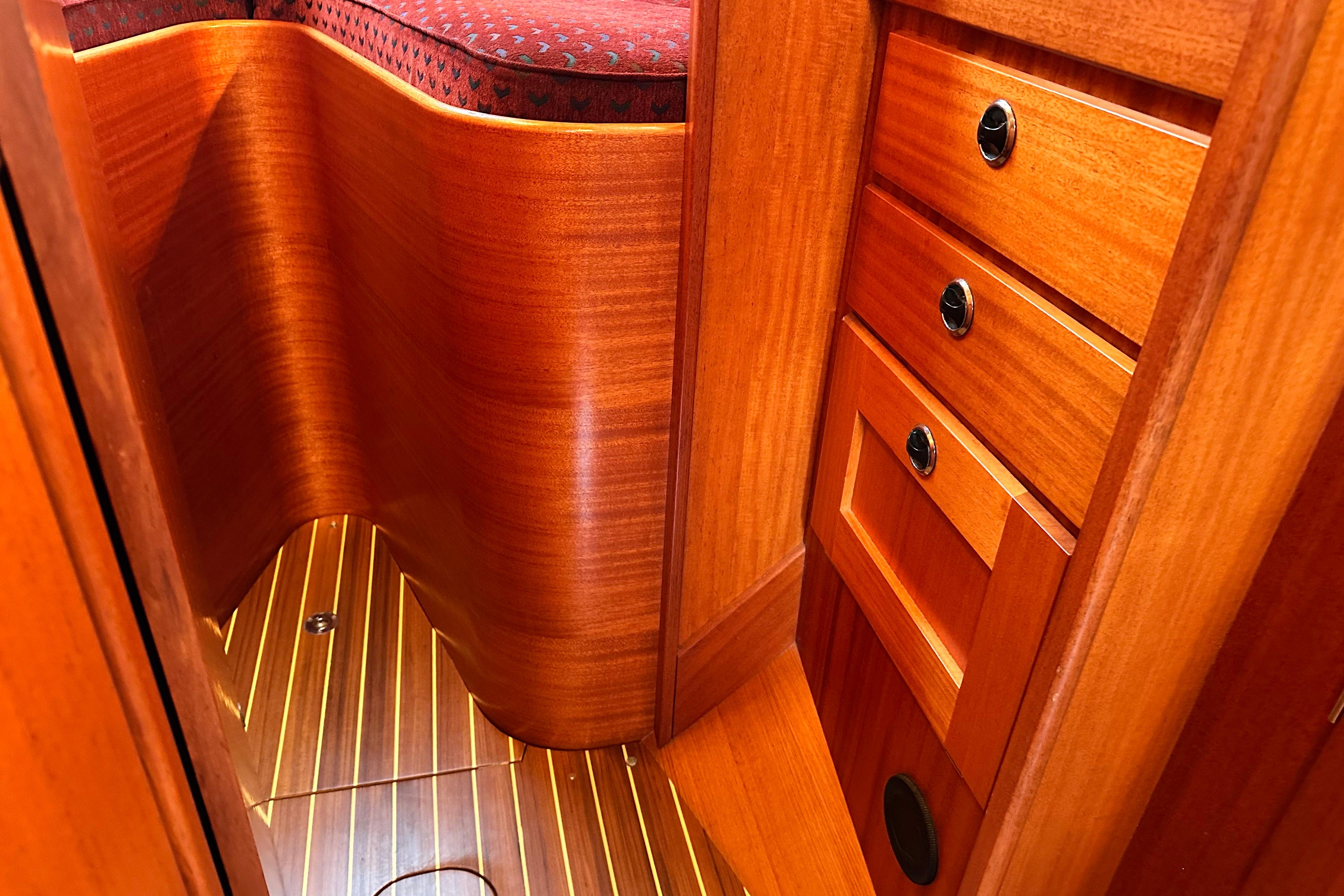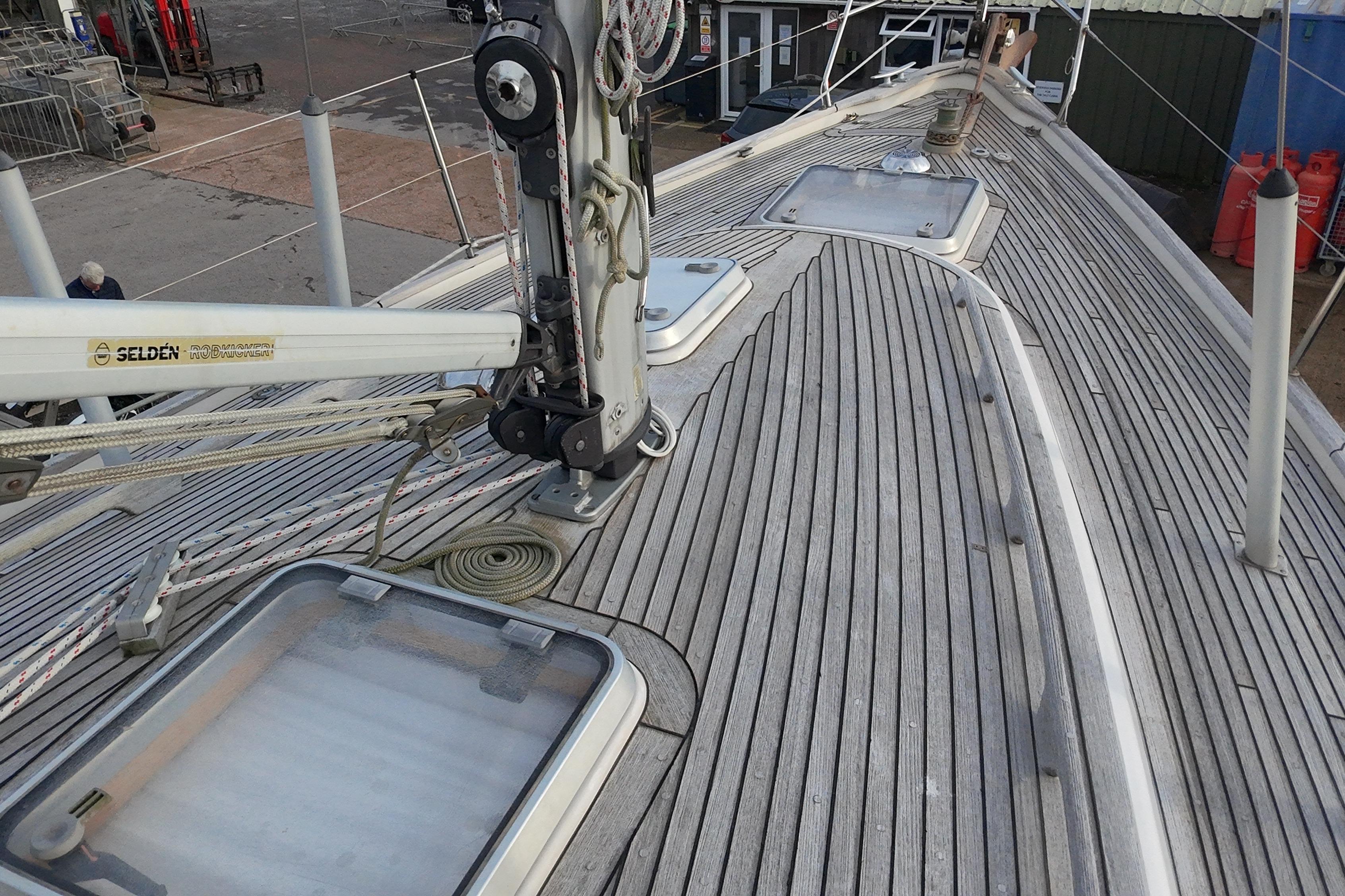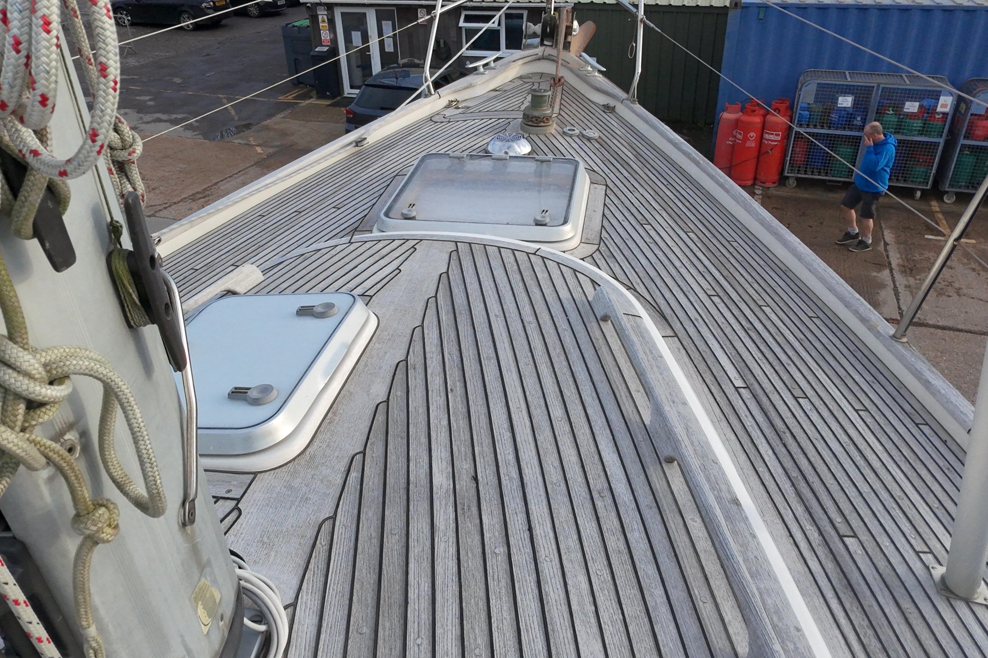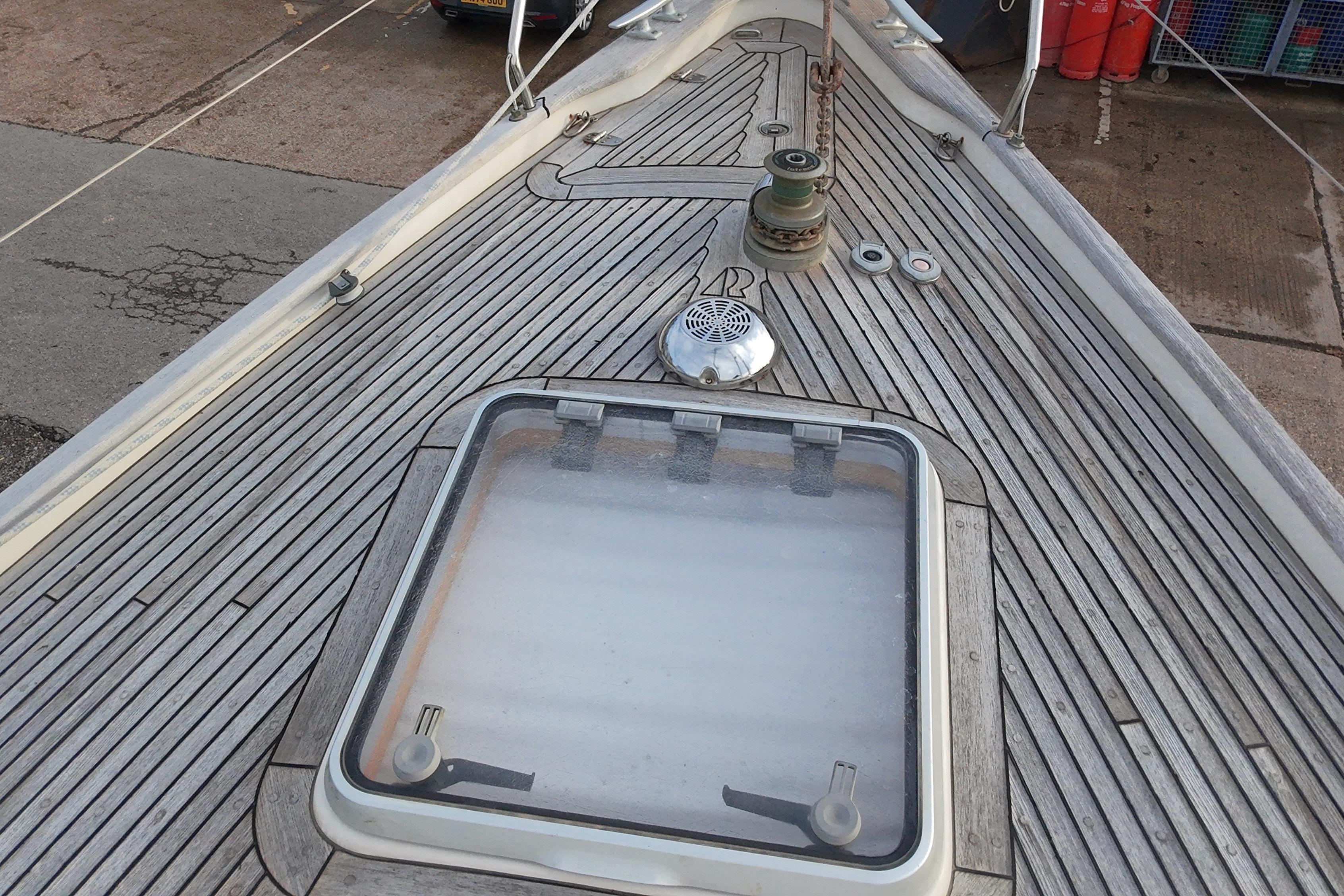 Teak side deck, aft deck, coachroof, bathing platform and cockpit seats in solid teak laid in rubber.
