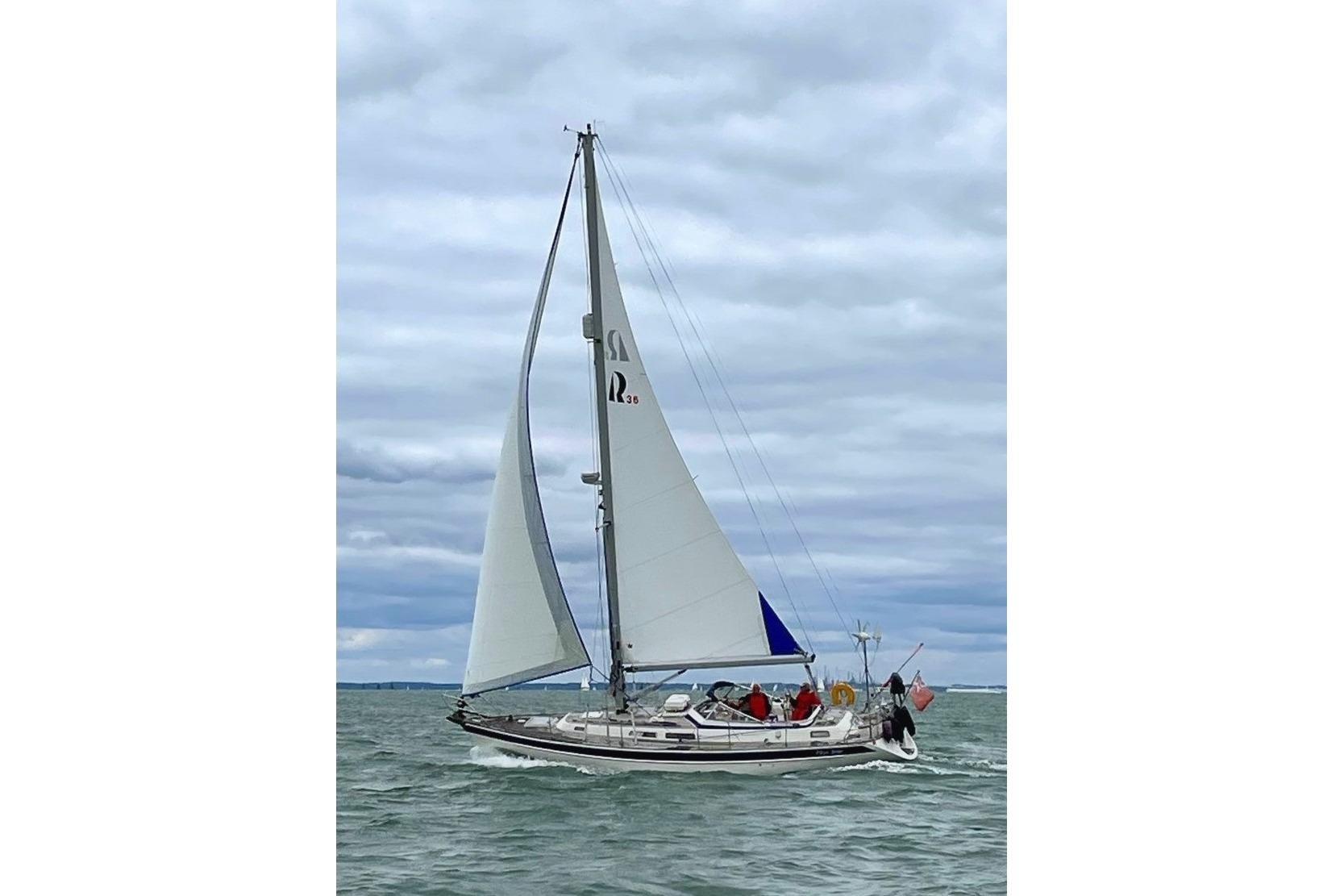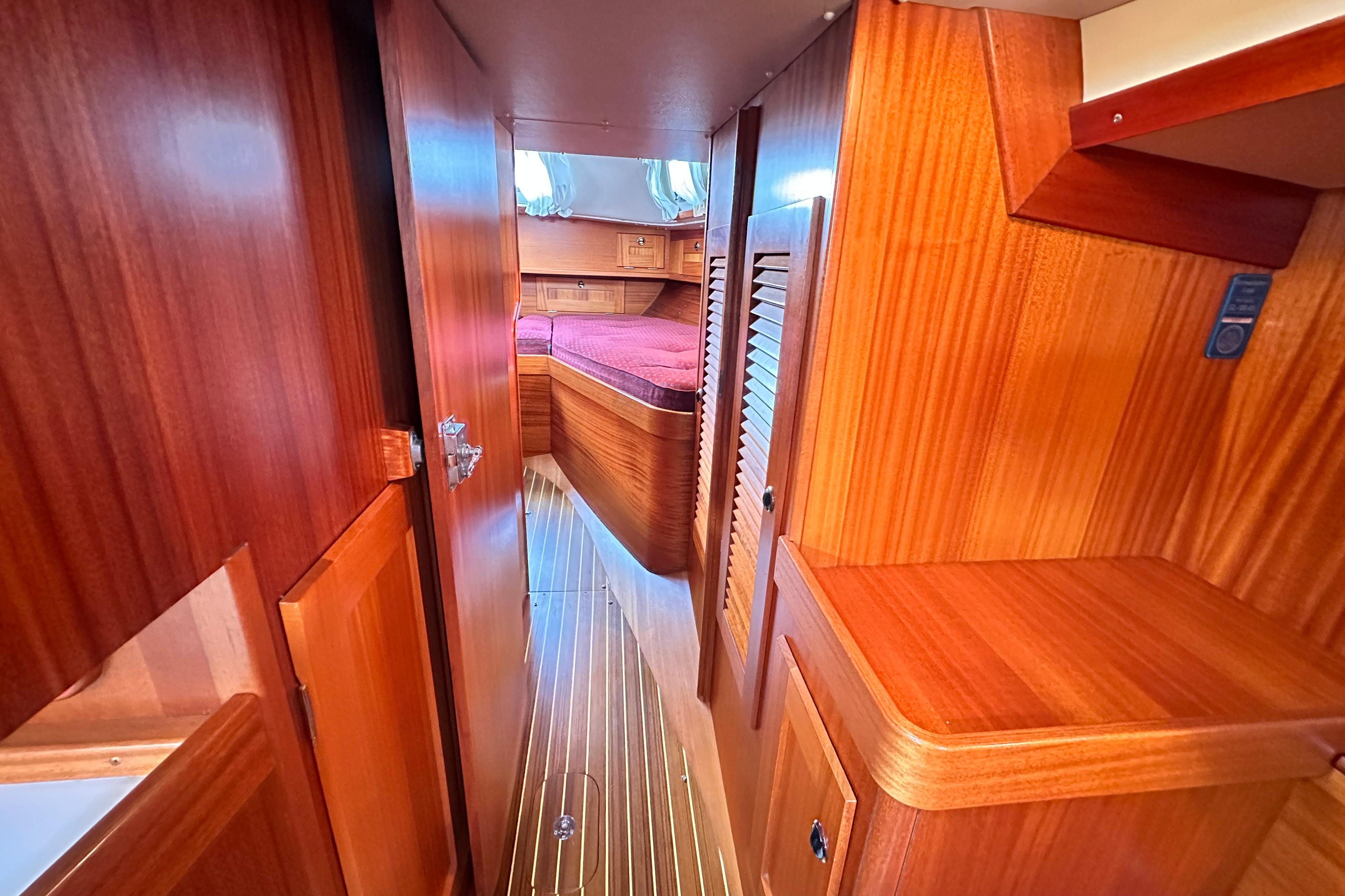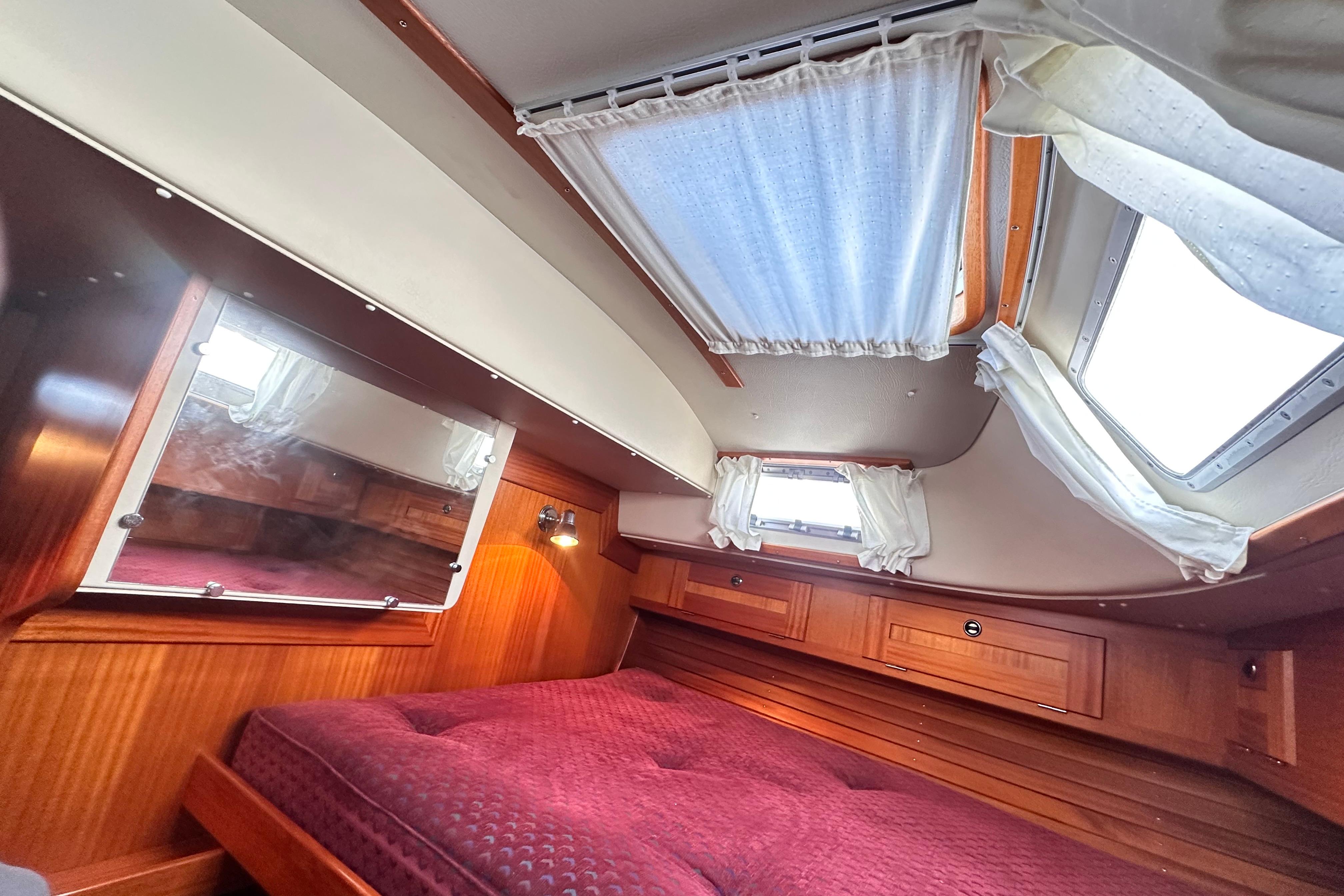 Aft cabin has two hanging lockers, one with removable shelves. One single berth to port and one double berth to starboard, 10cm wider than standard. Stowage room below and above. Central skylight. Two opening Port lights.