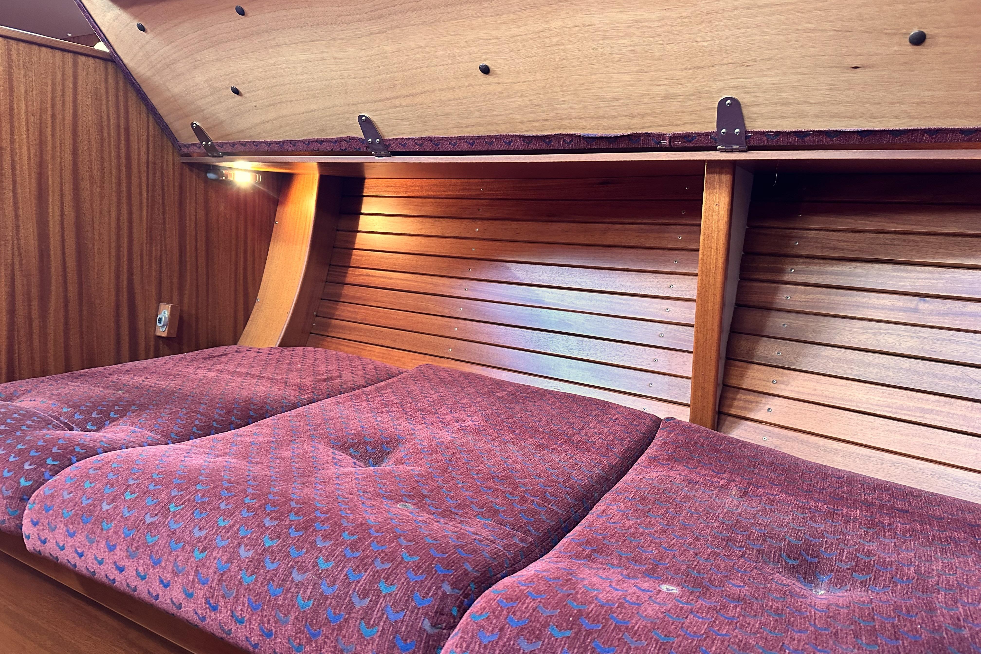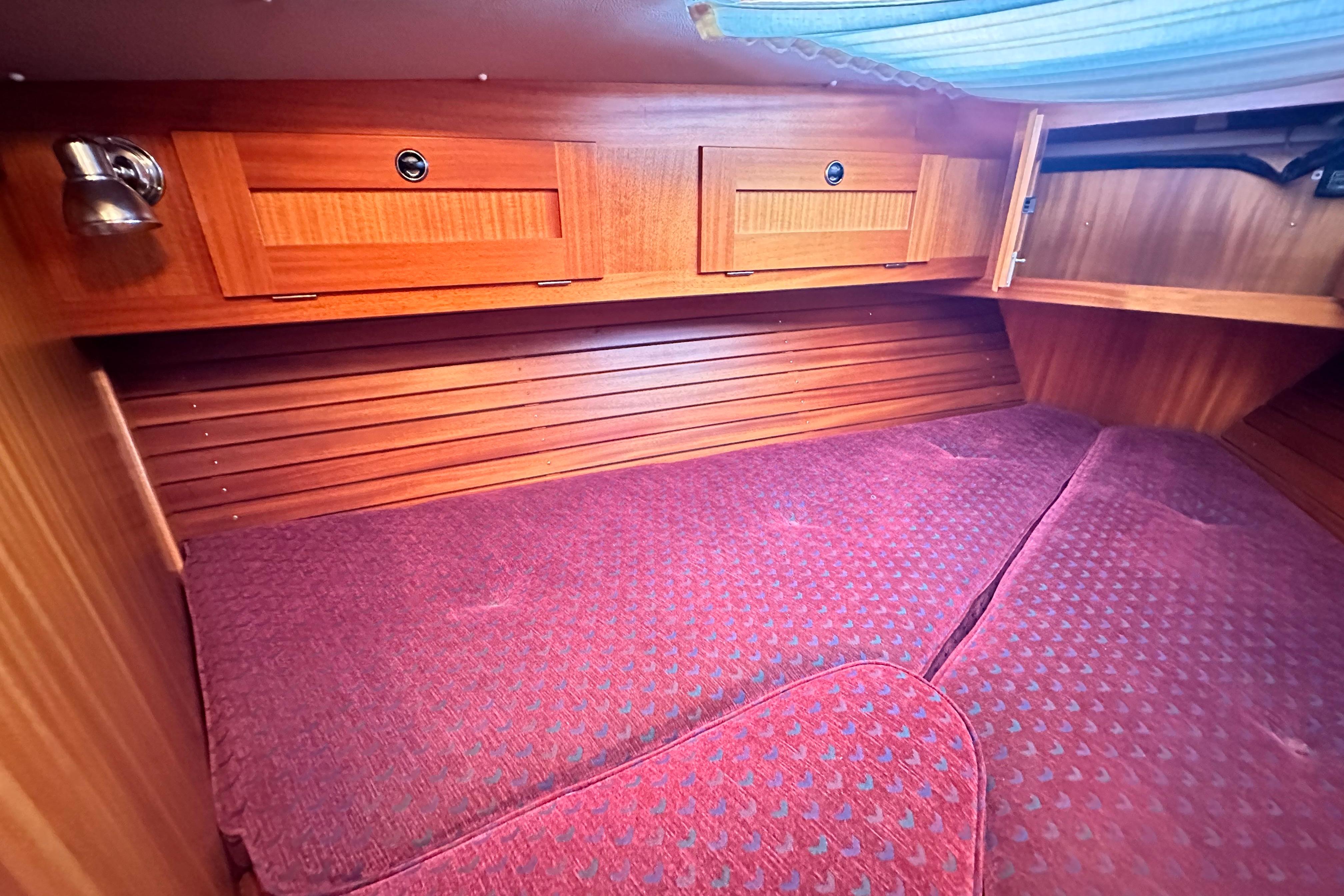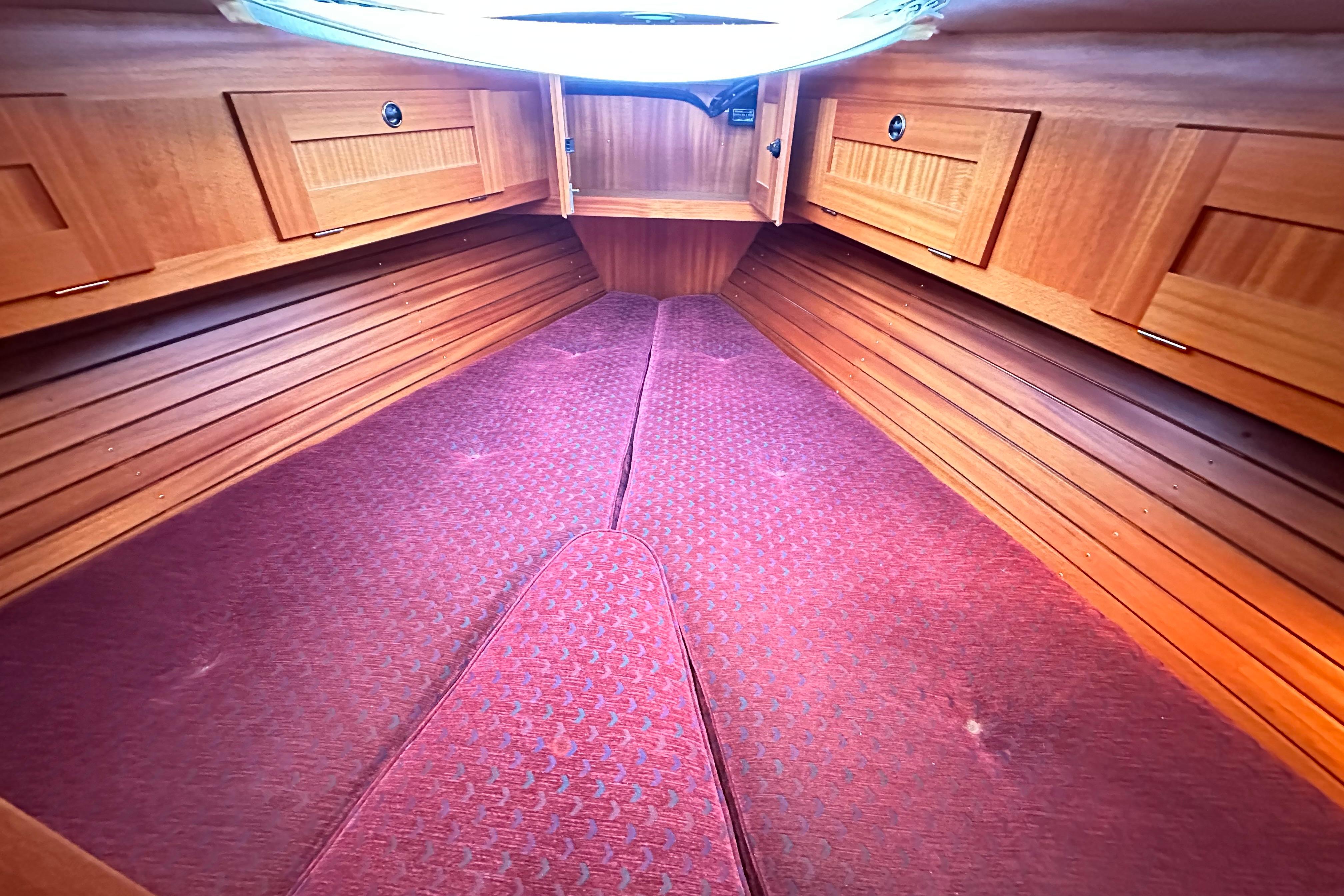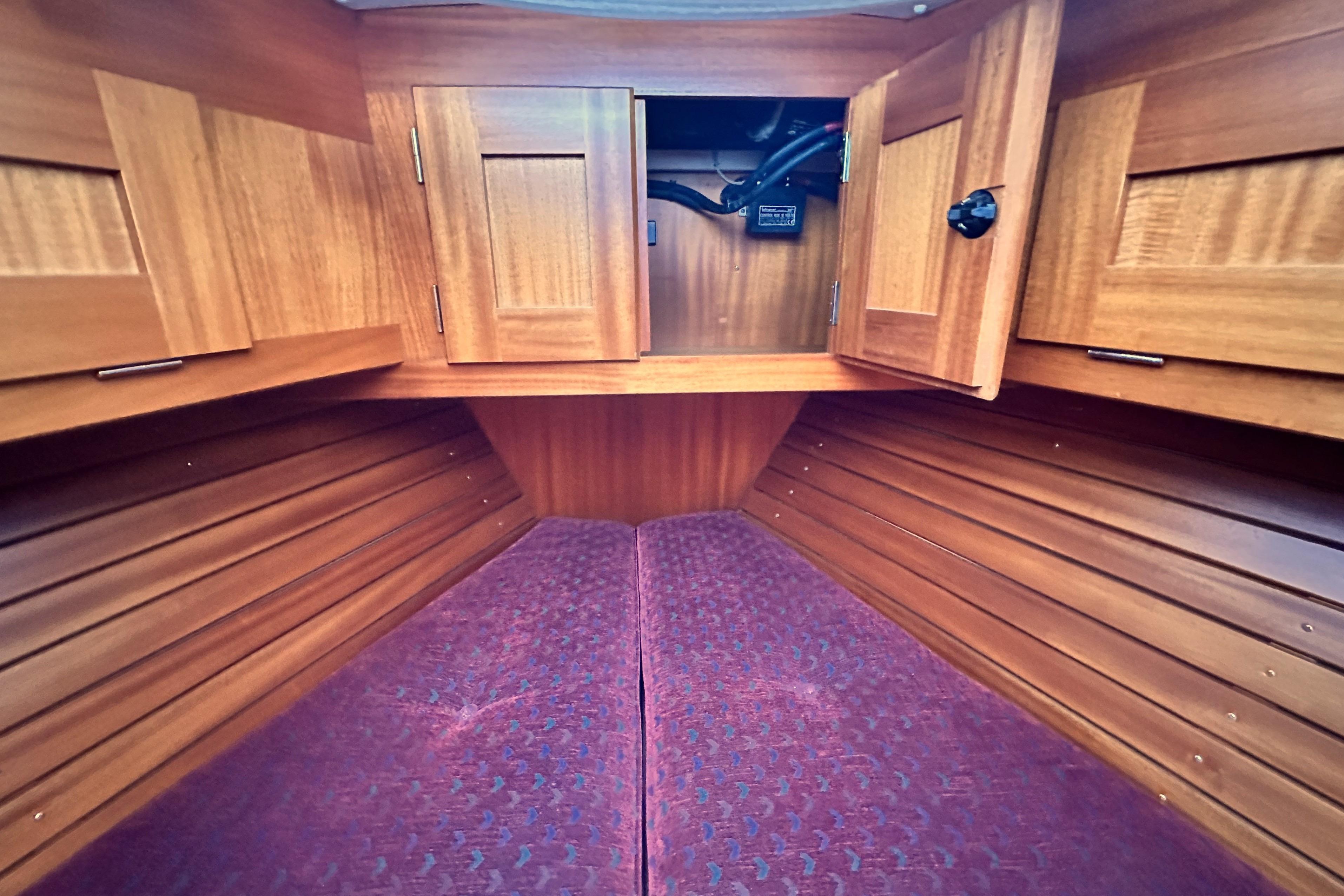 Two berths with ample stowage above and below and in addition a number of lockers. Hatch and opening porthole. Infill cushion.