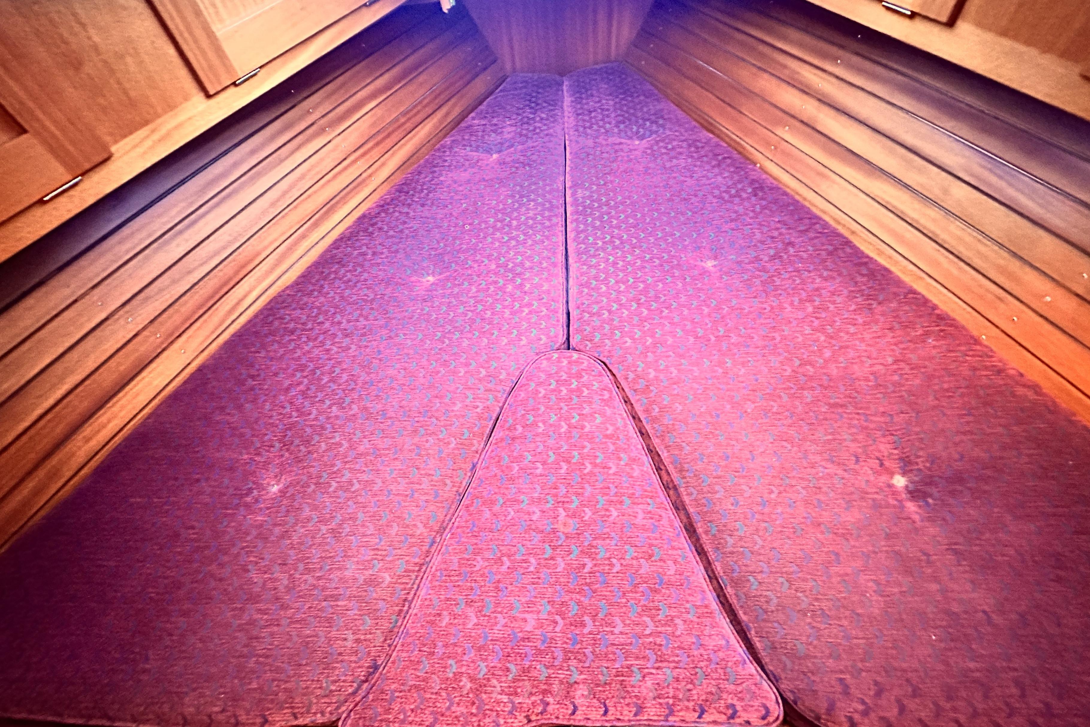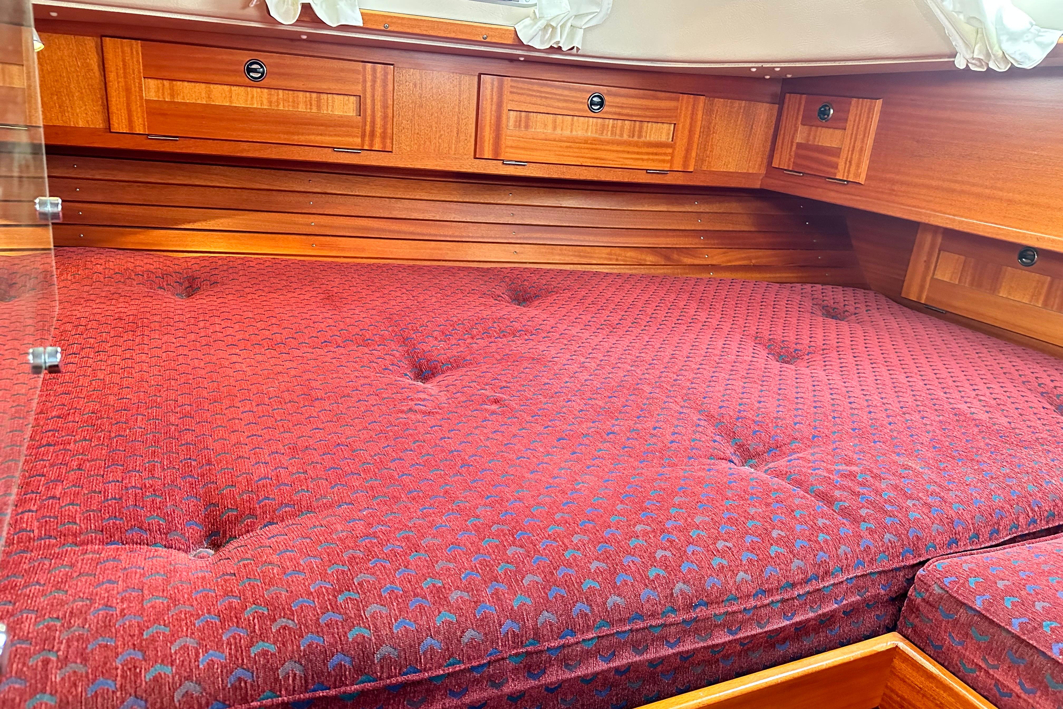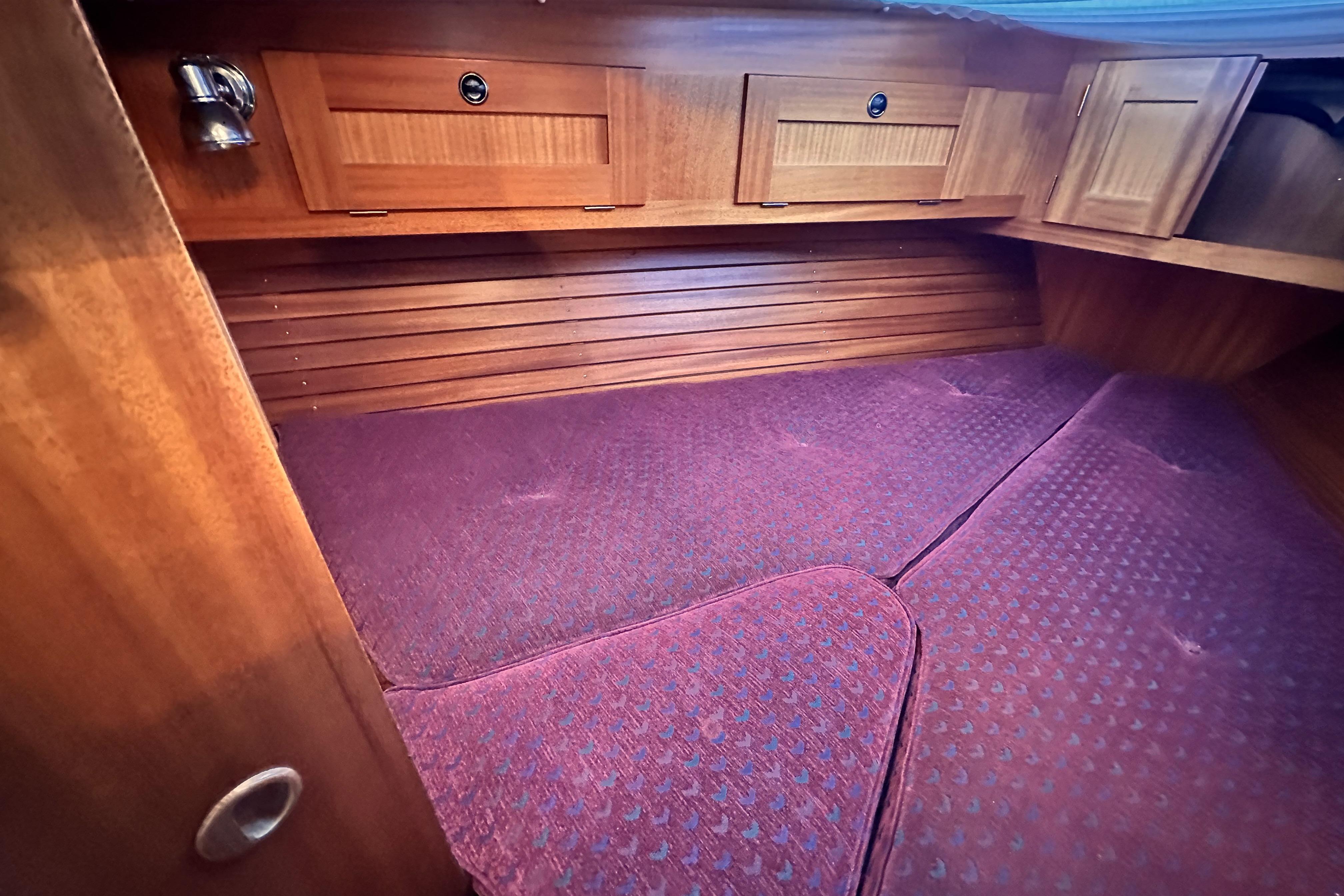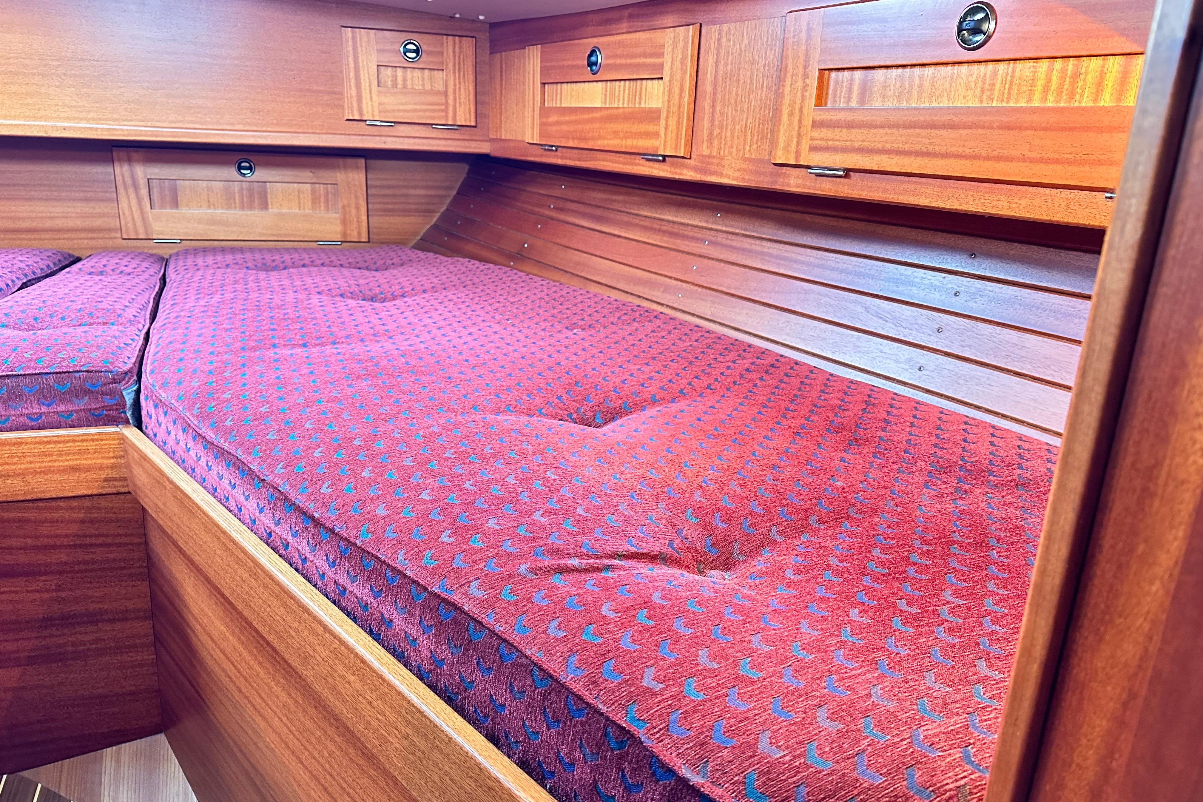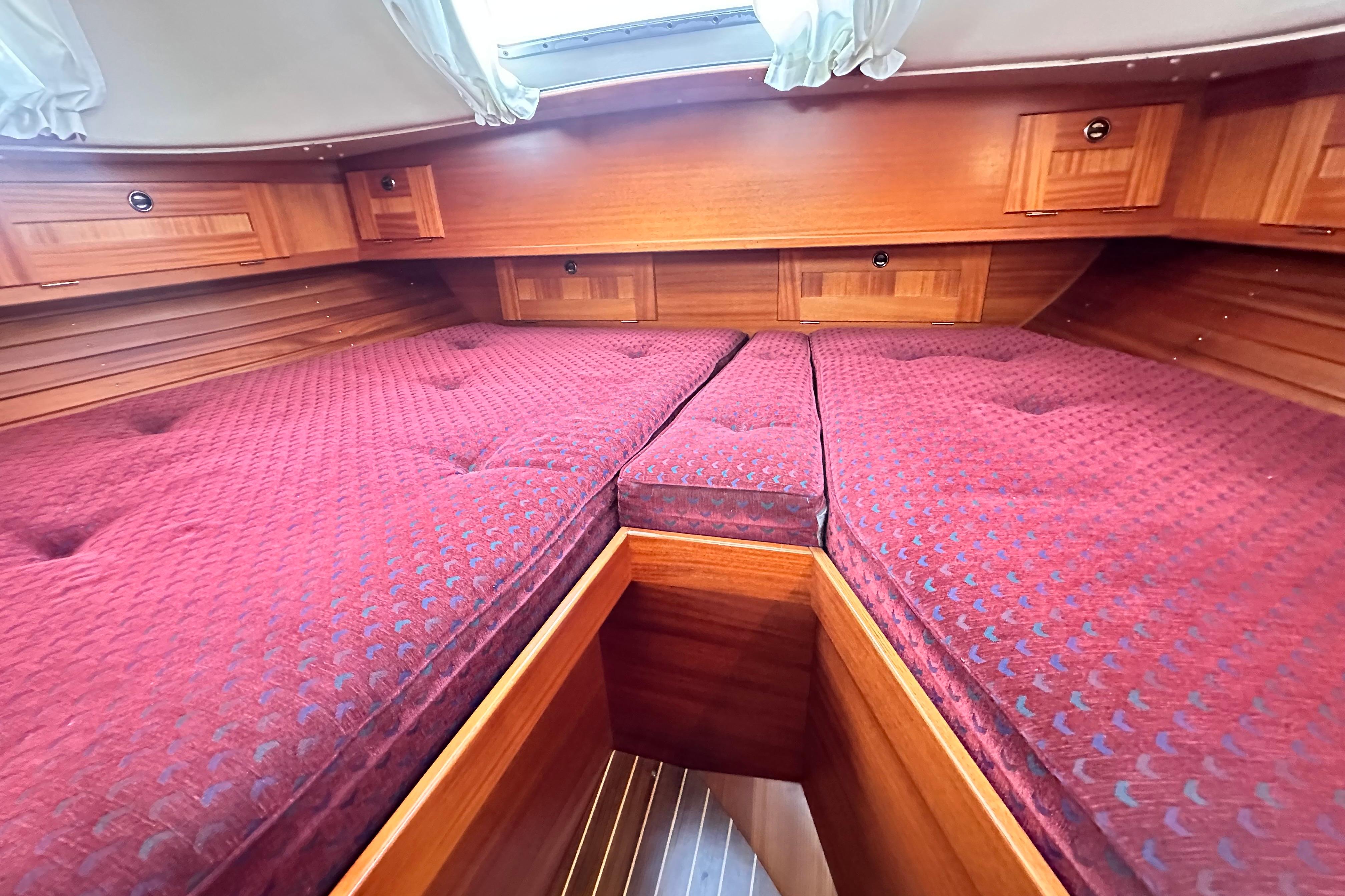 Two berths with ample stowage above and below and in addition a number of lockers. Hatch and opening porthole. Infill cushion.