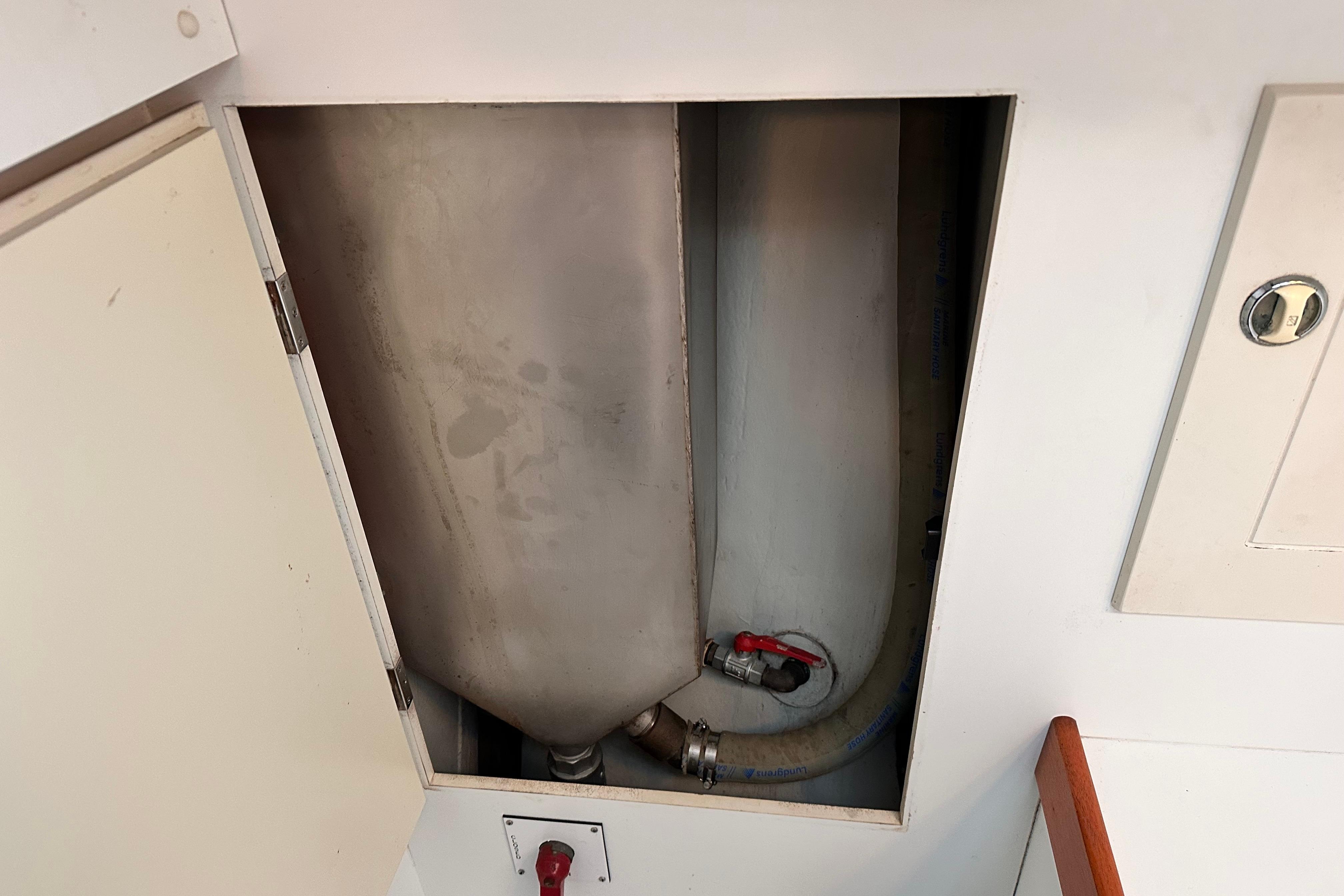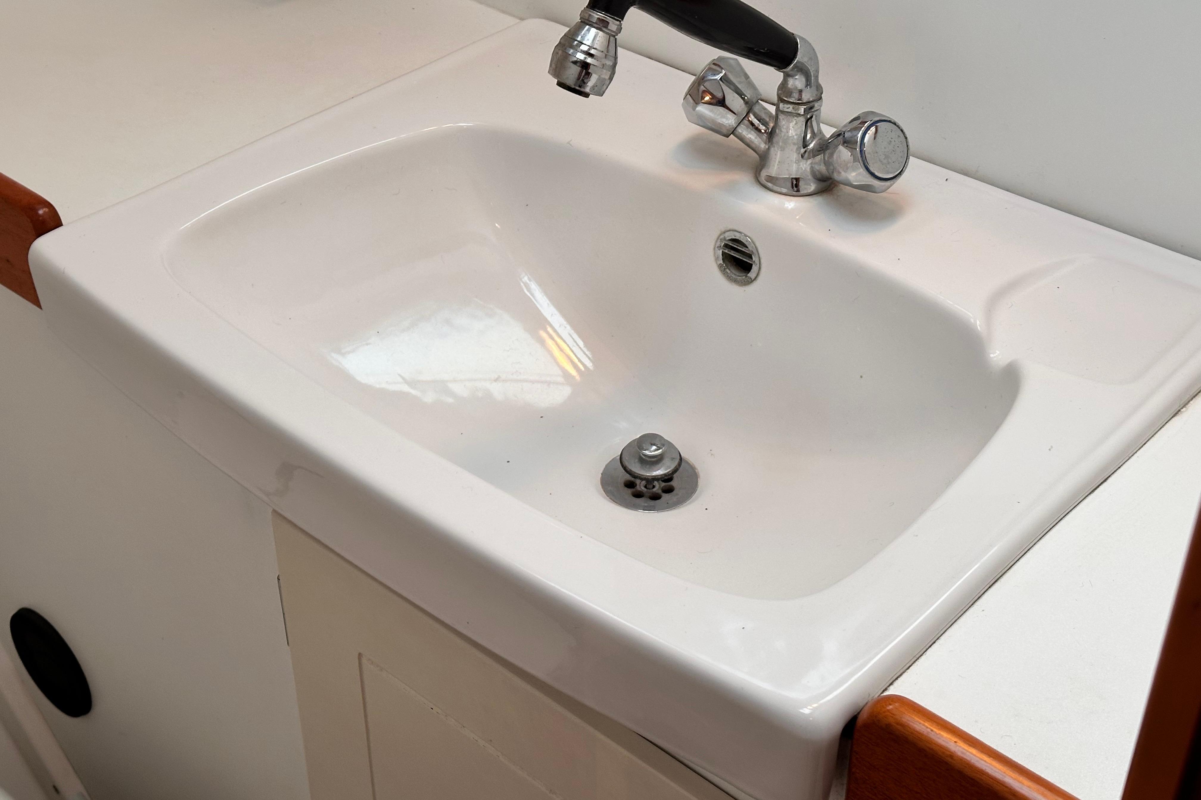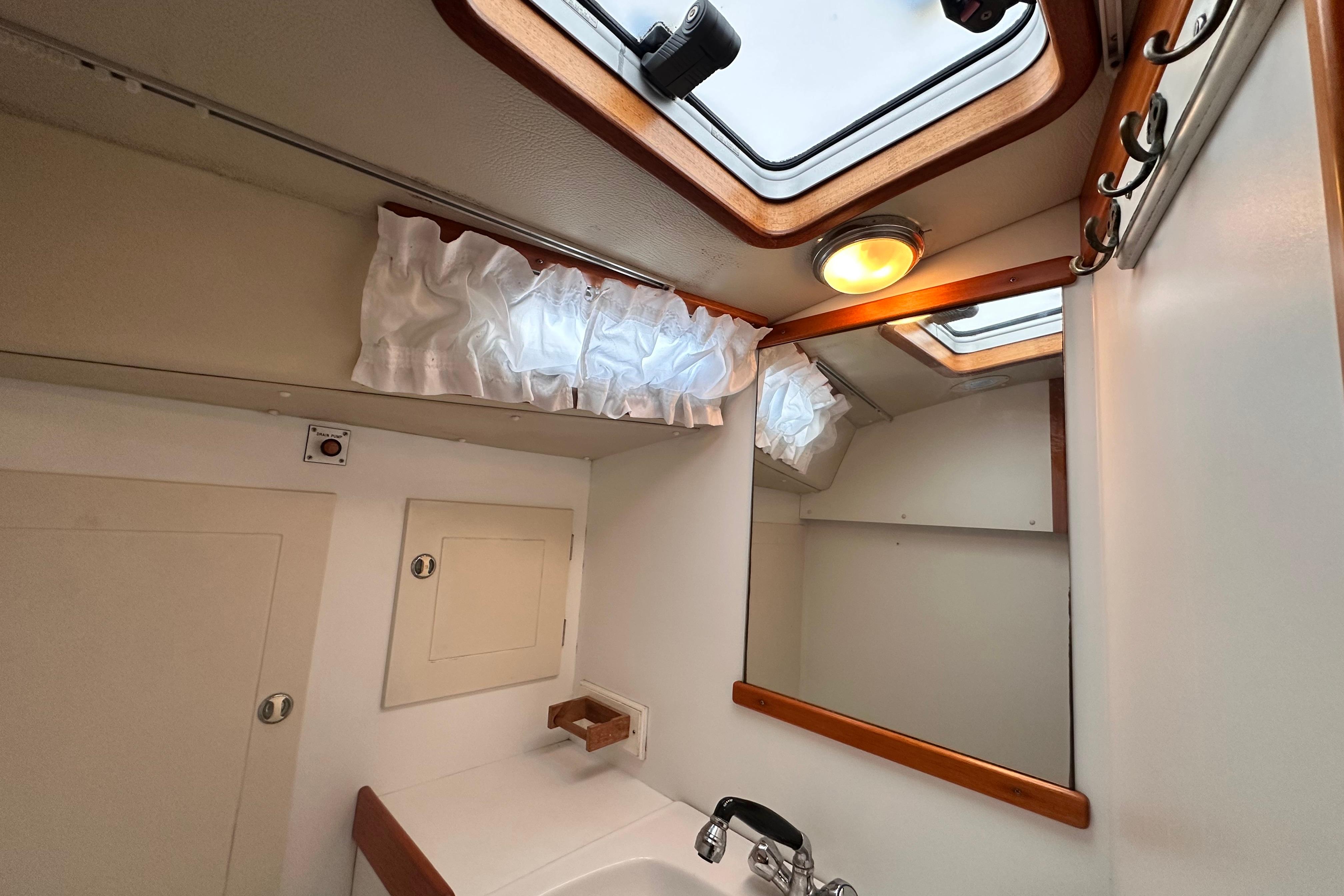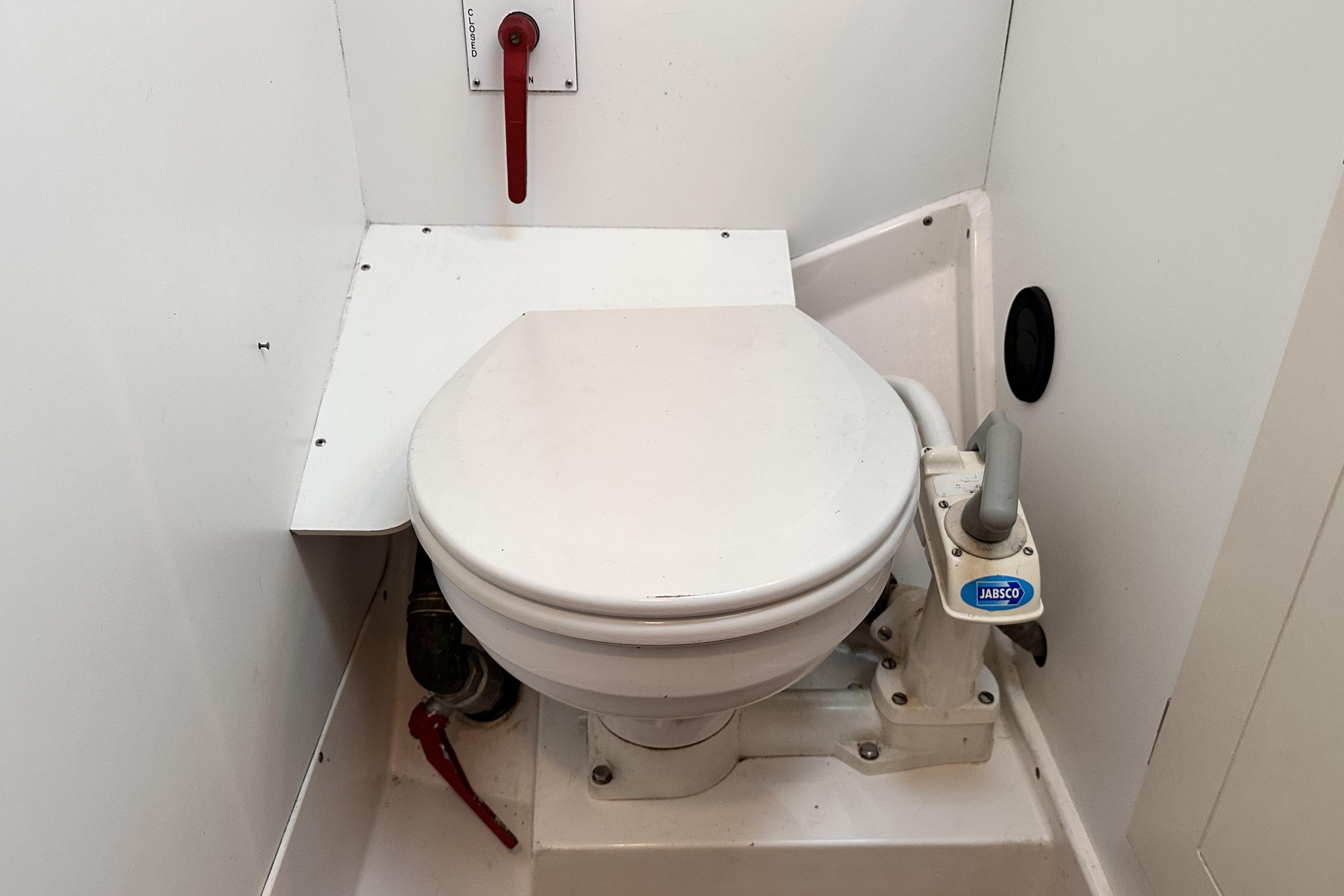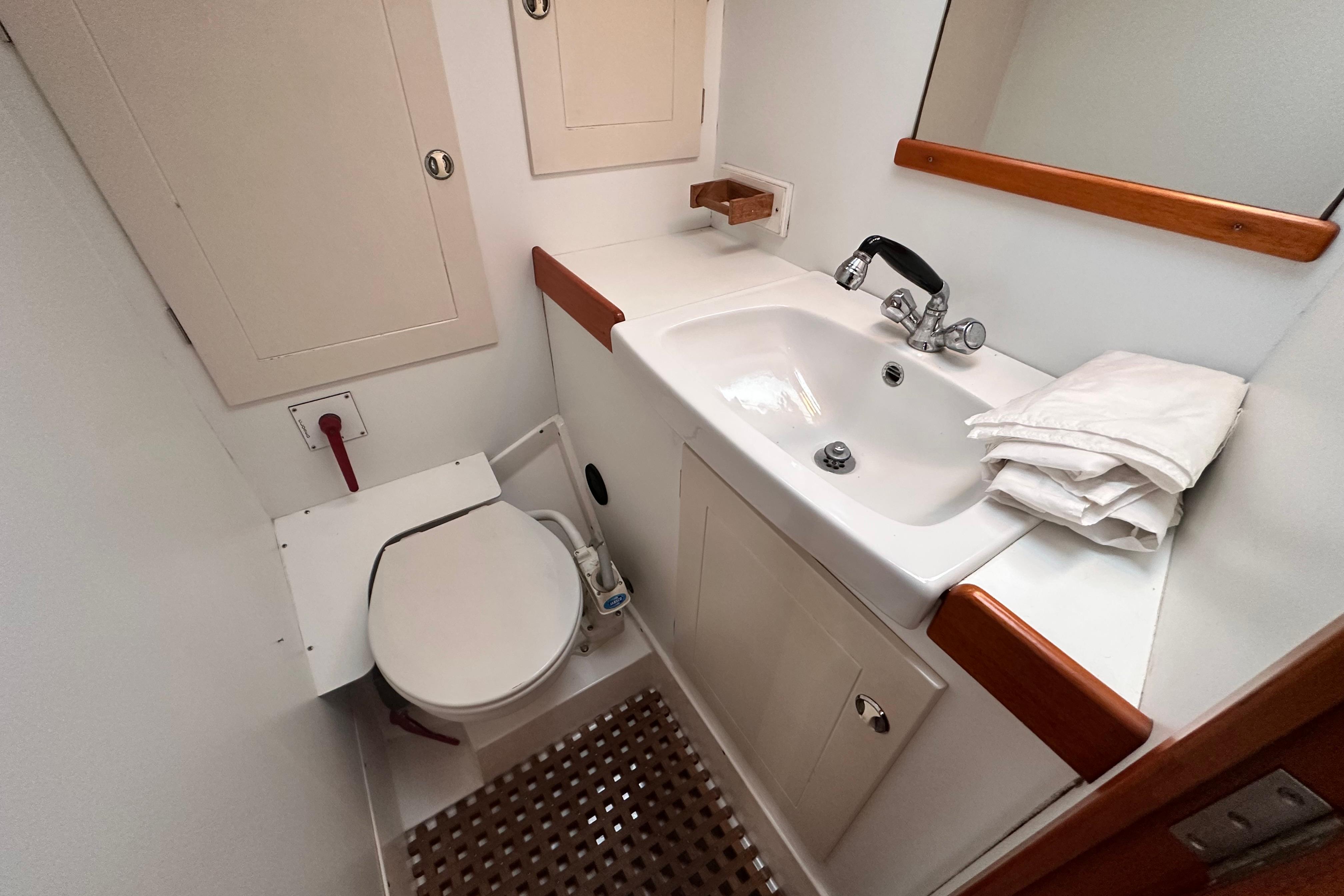 Bulkheads and lockers in white laminate. Watertight shower stall, teak grating, china wash basin and large mirror. Shower curtain (not installed). Pressurised hot and cold fresh water. Mixer tap in wash basin is pulled out for shower use. Shower water drained by electric pump directly overboard without going into bilges. Pump action sea toilet. Stainless steel holding tank. Cupboard above and below washbasin. Ventilation through ventilator, opening porthole and hatch.