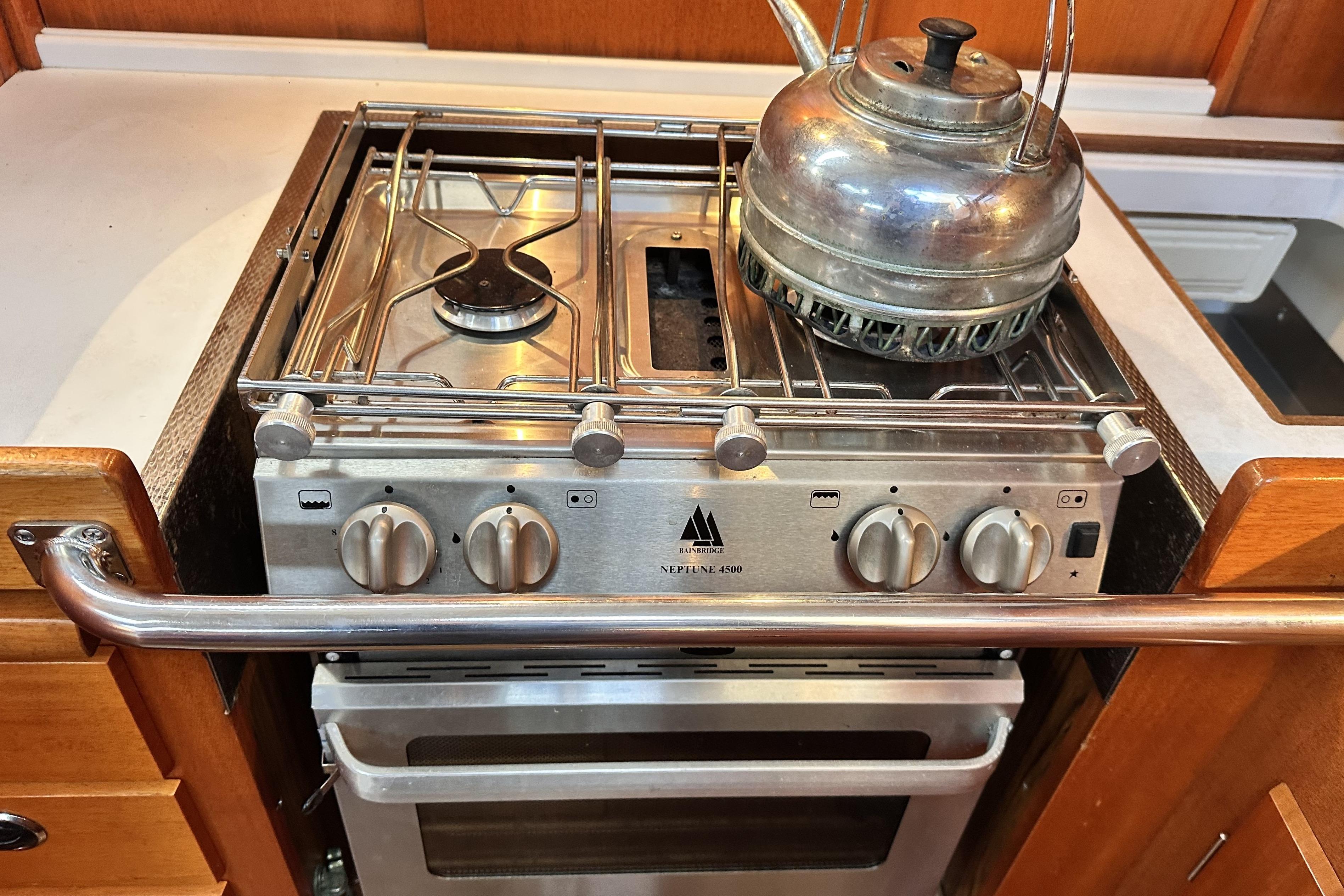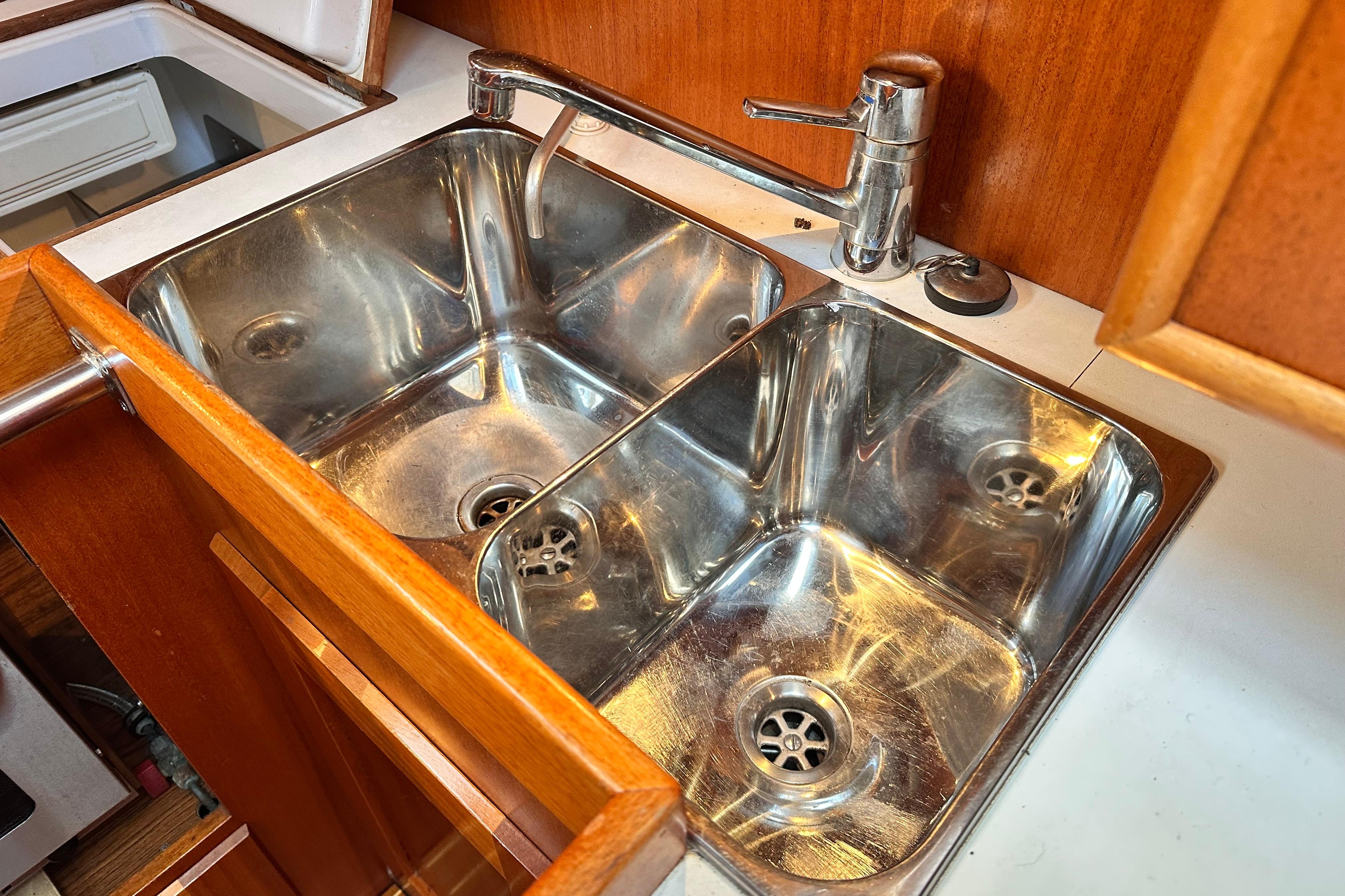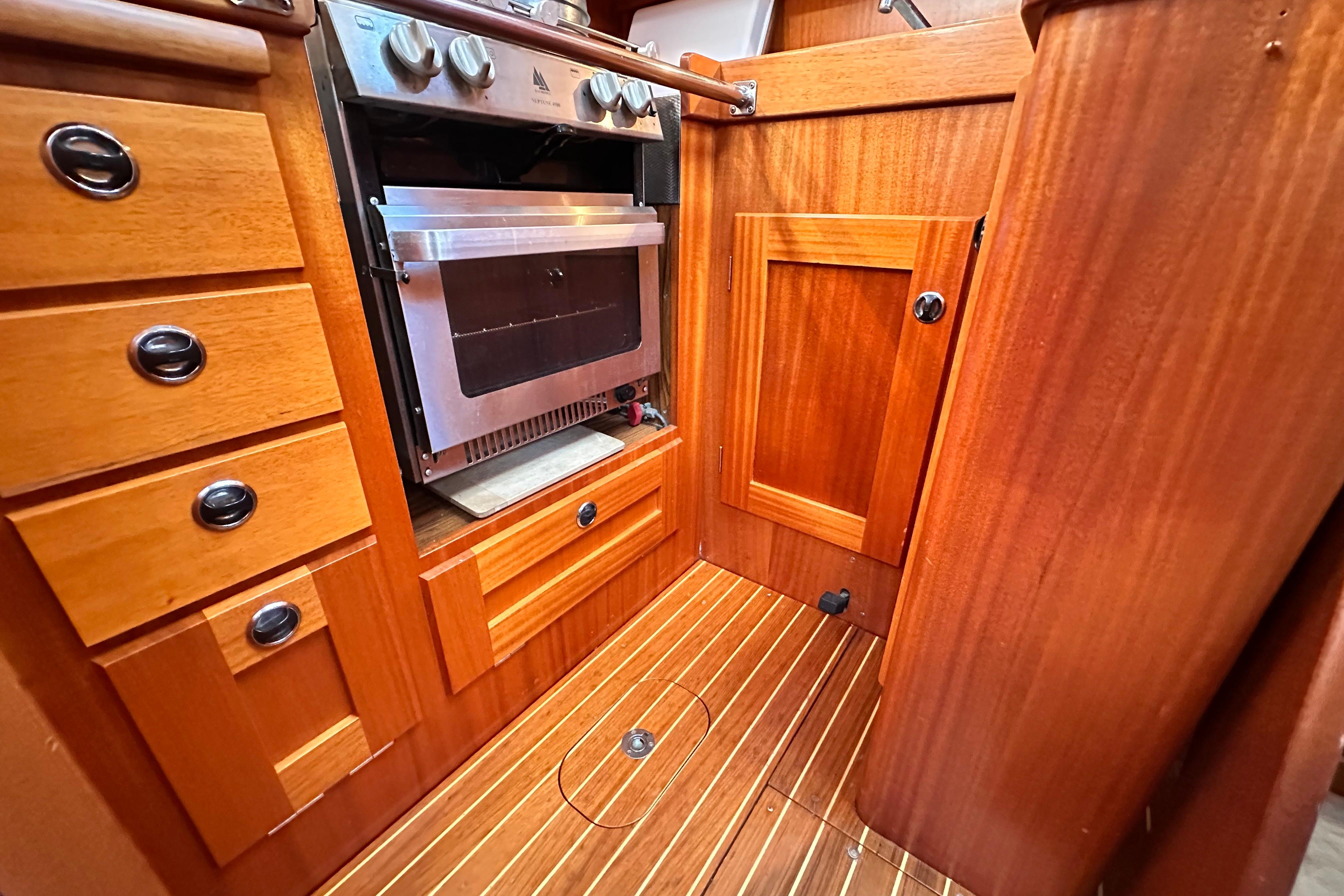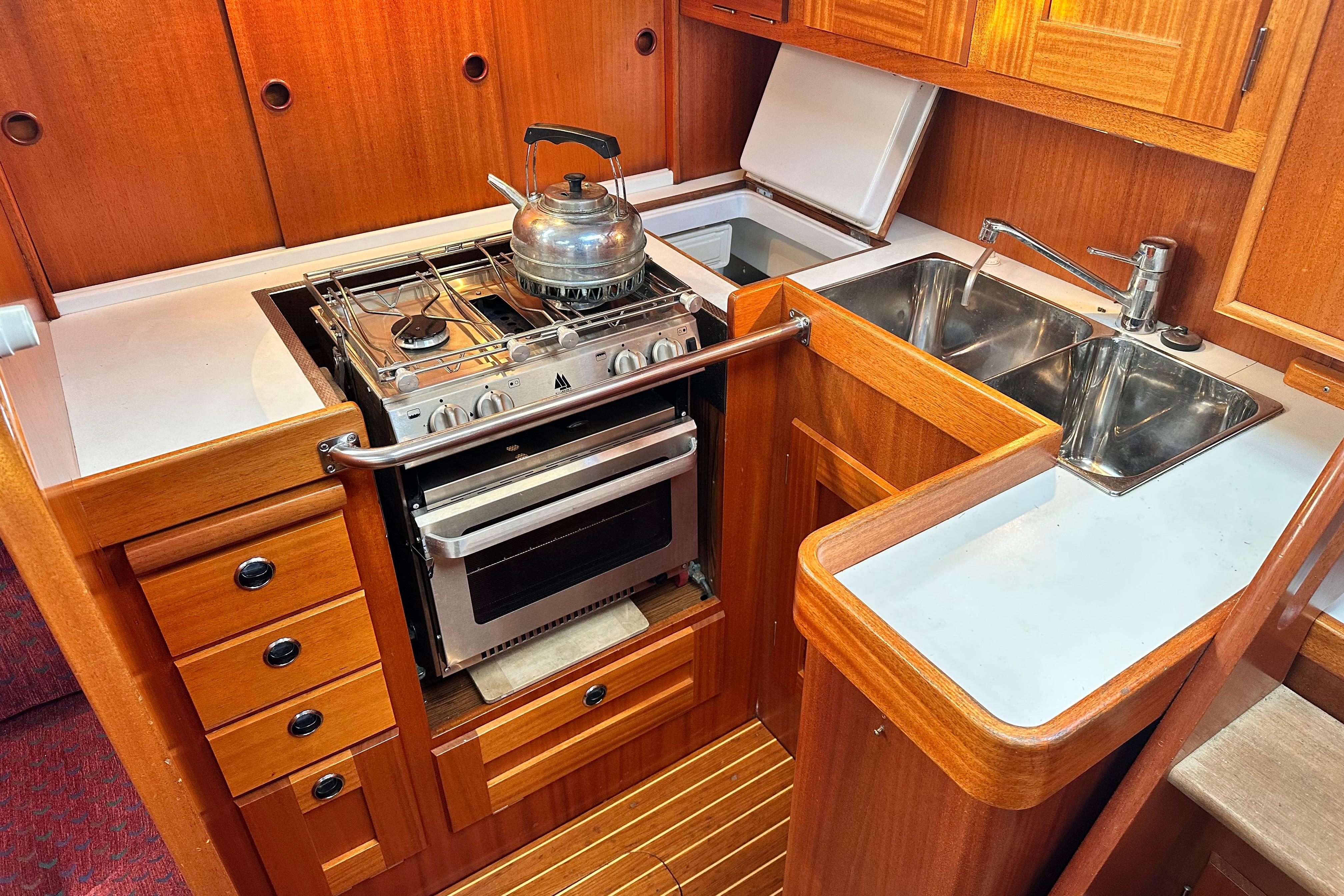 Working surface in white laminate with strong all around fiddle rail. Insulated icebox with 12v Frigomatic refrigeration unit and compressor. Stainless steel double sink. Pressurised hot and cold water with mixer tap. Two burner Bainbridge gas cooker with oven, grill and electric ignition, New 2017. Opening window over the cooker. Crockery locker and three drawers. Room for saucepans and other kitchen utensils.