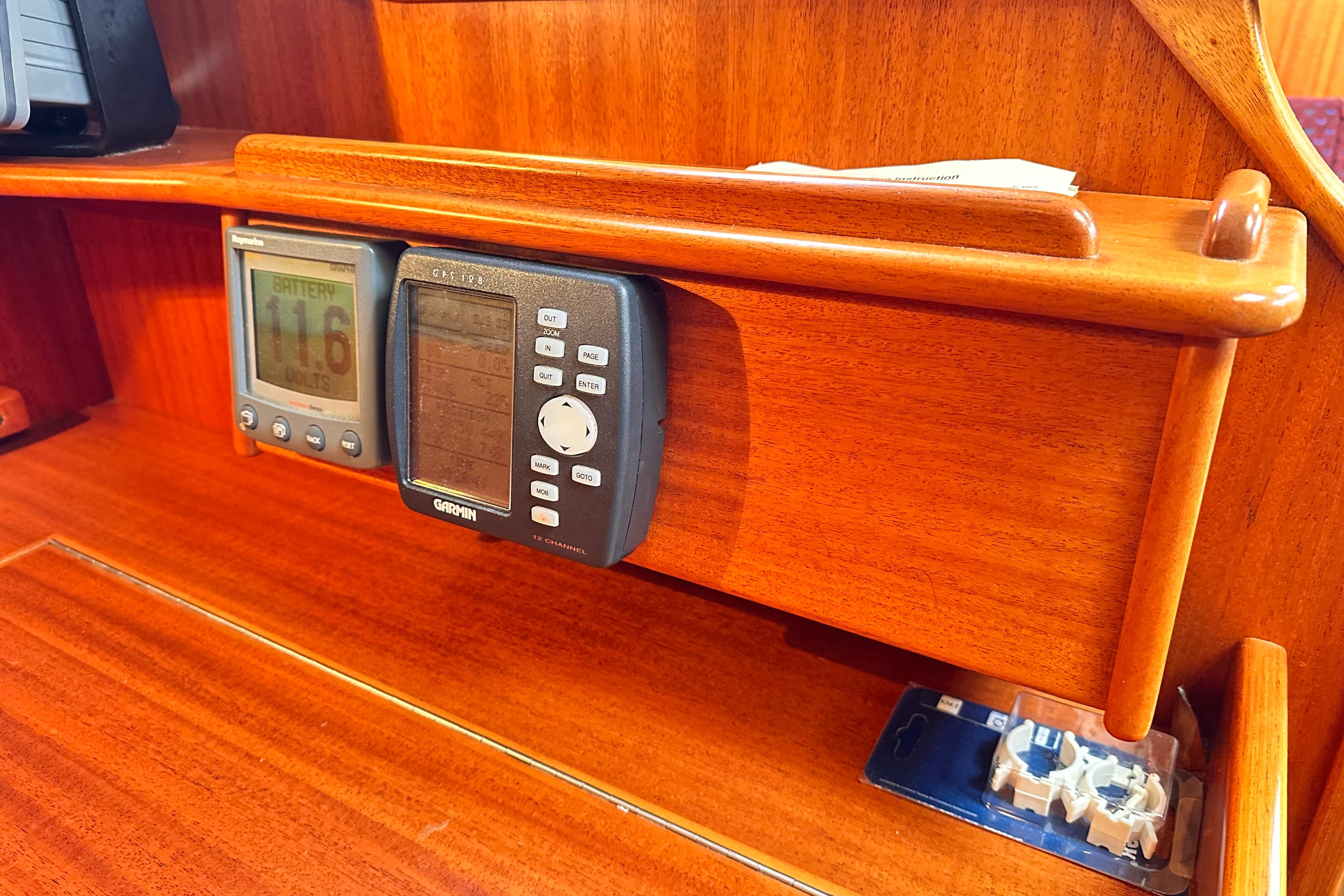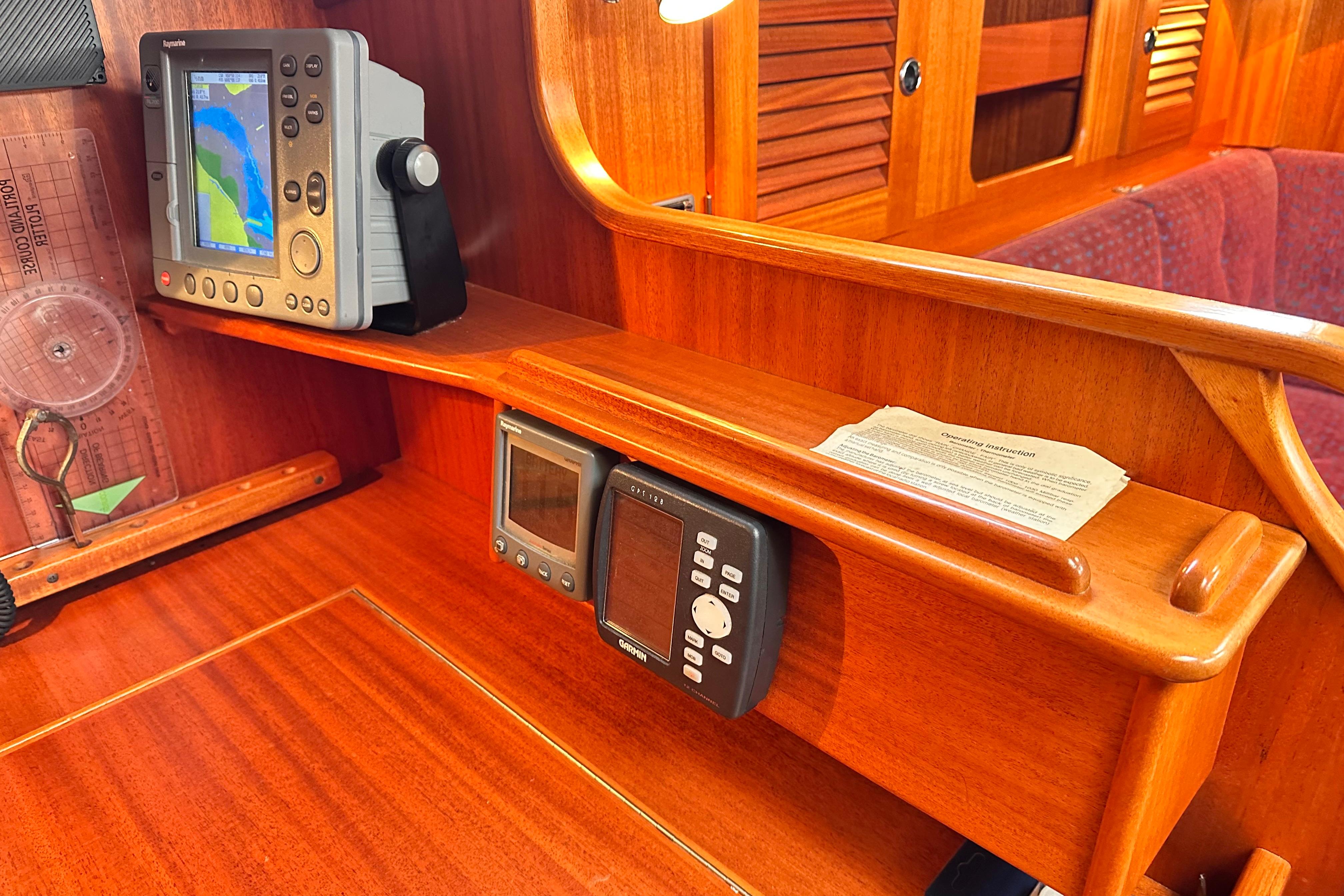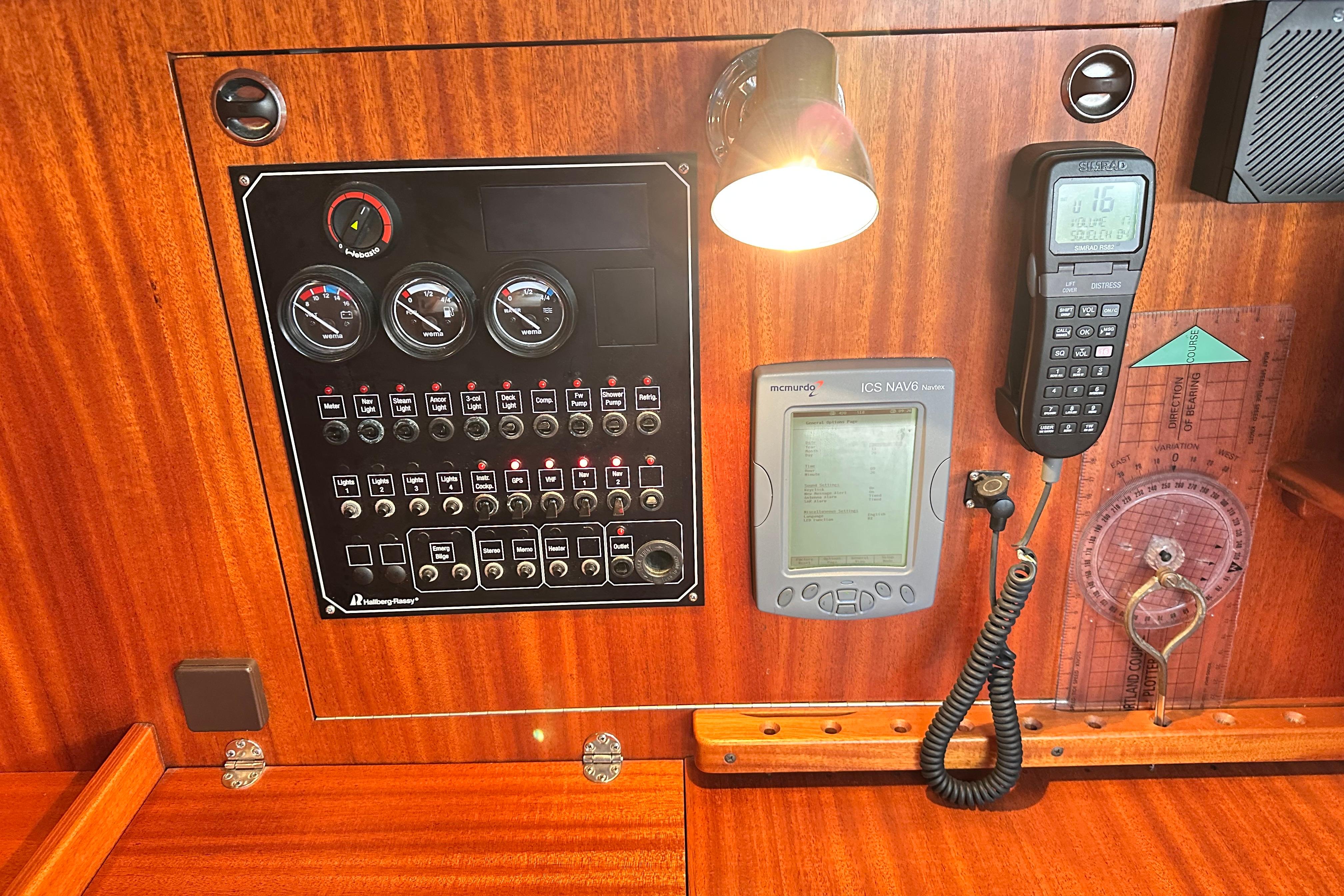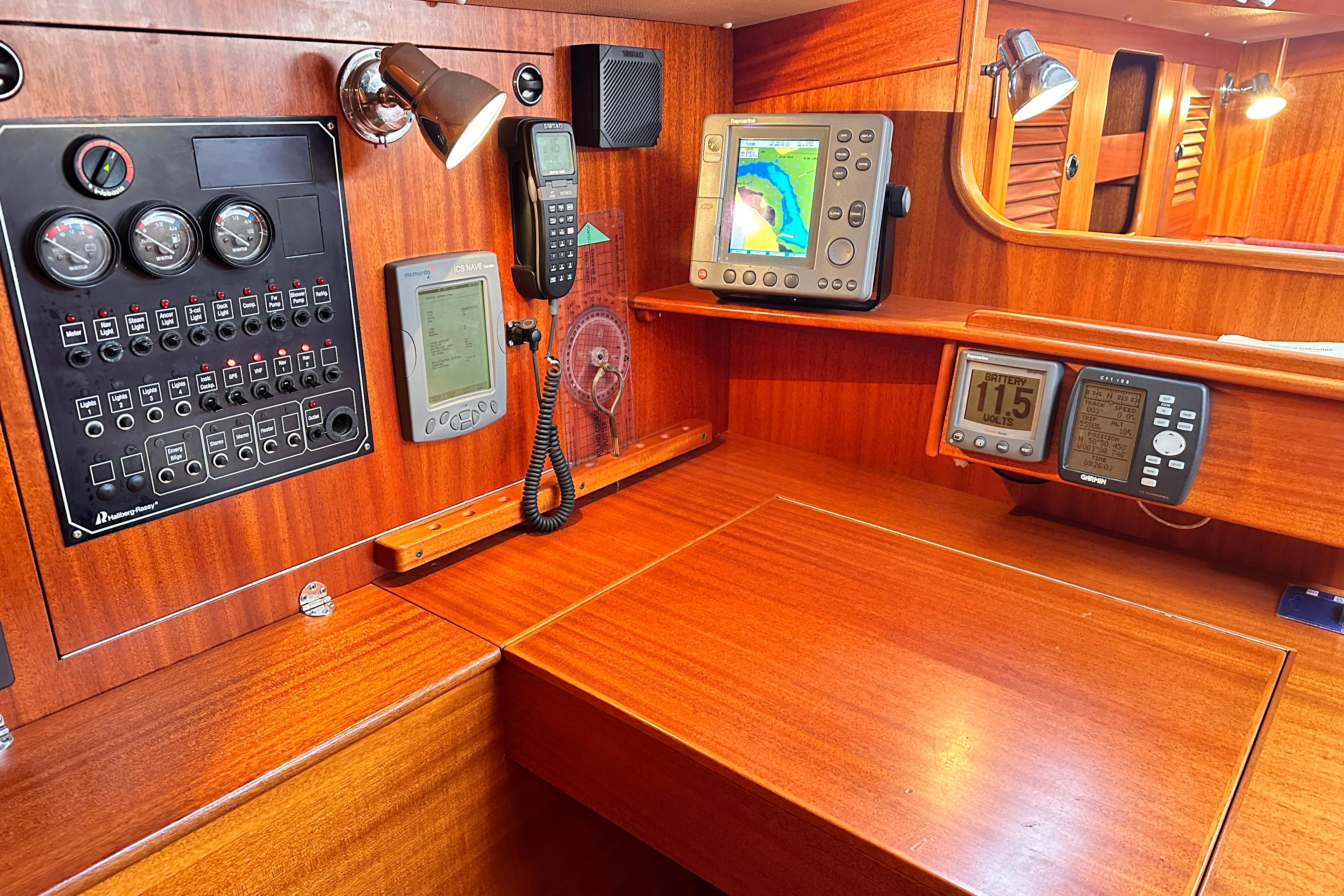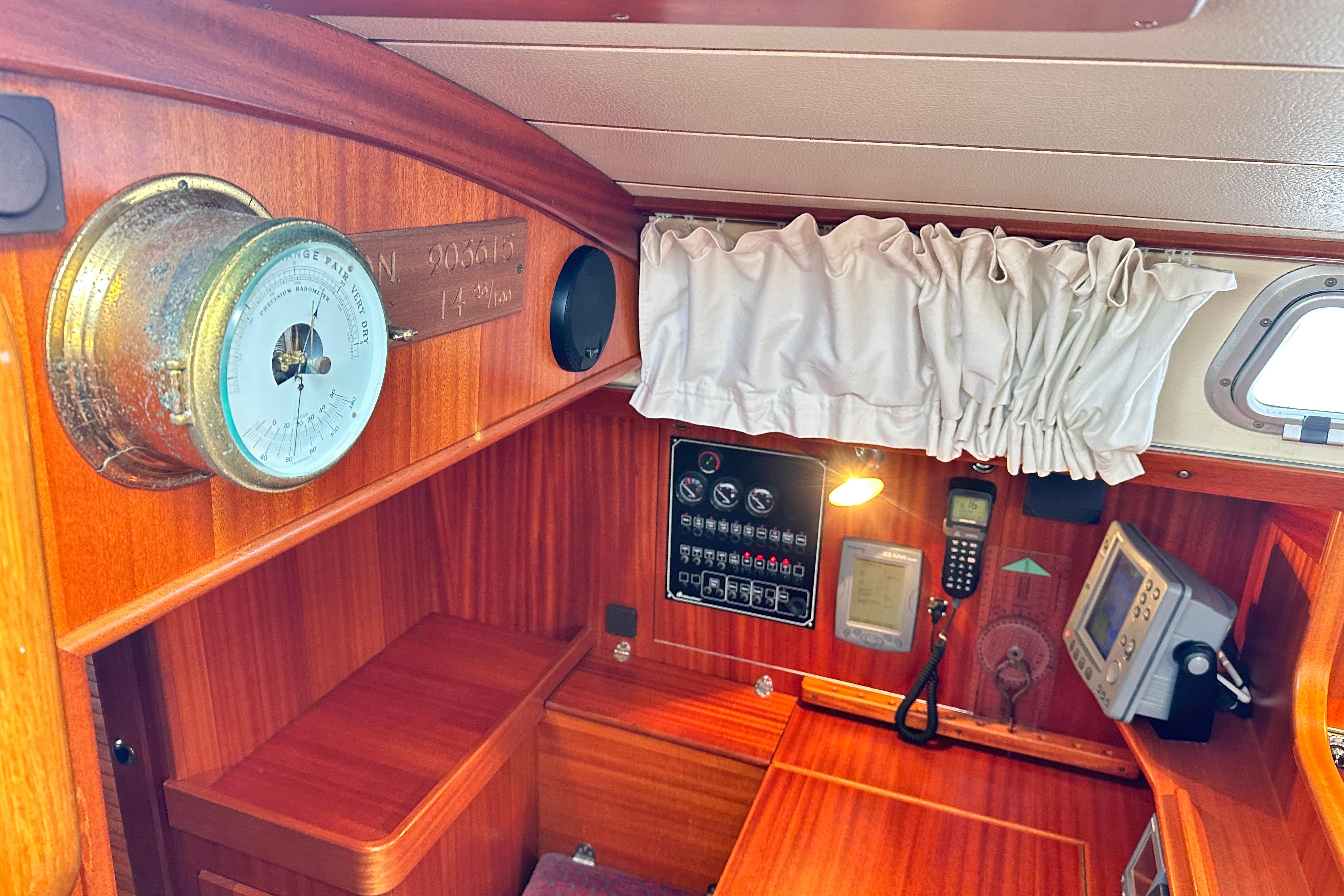 Engine instrument panel with engine start. Varnished washboards and outer chart tables.