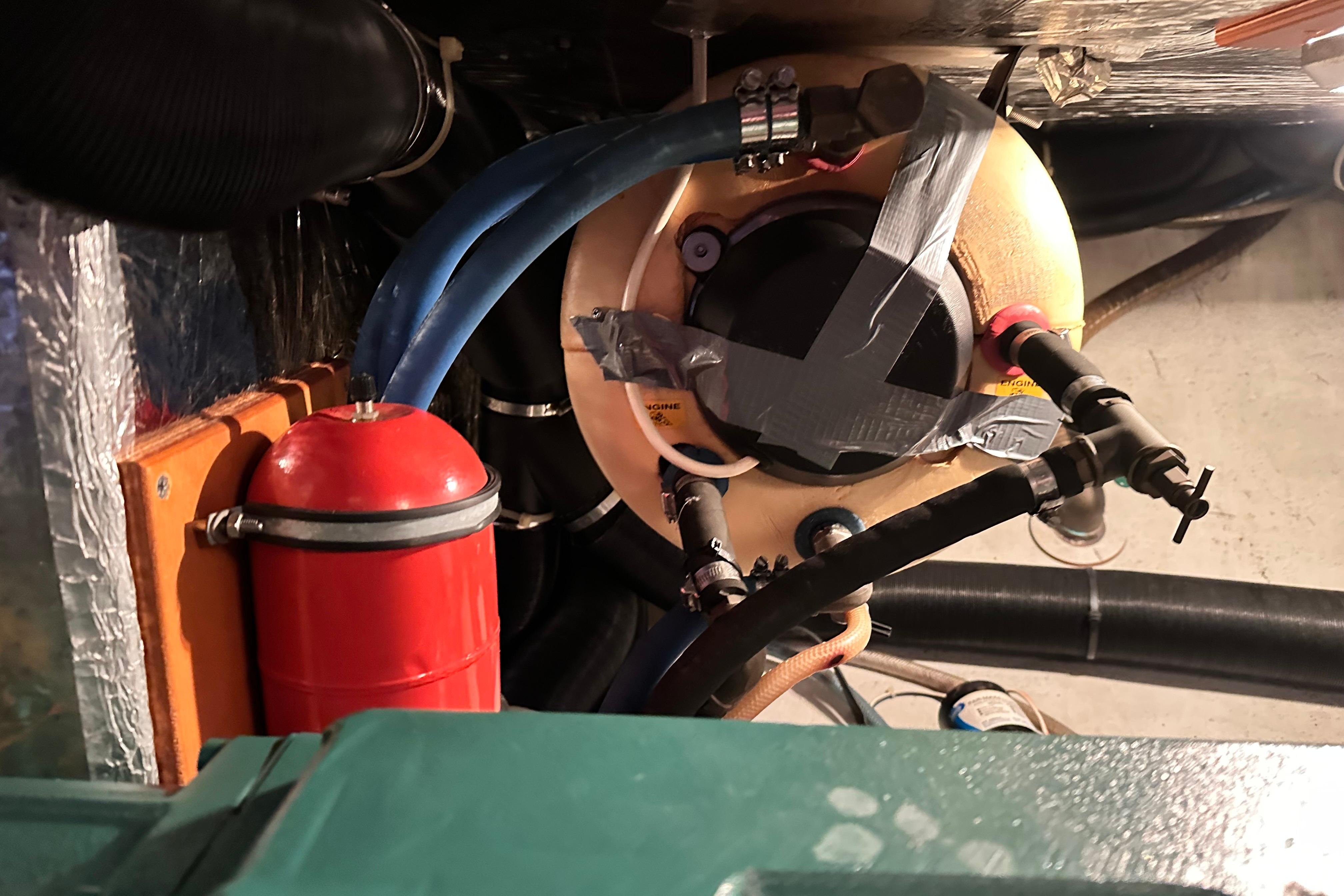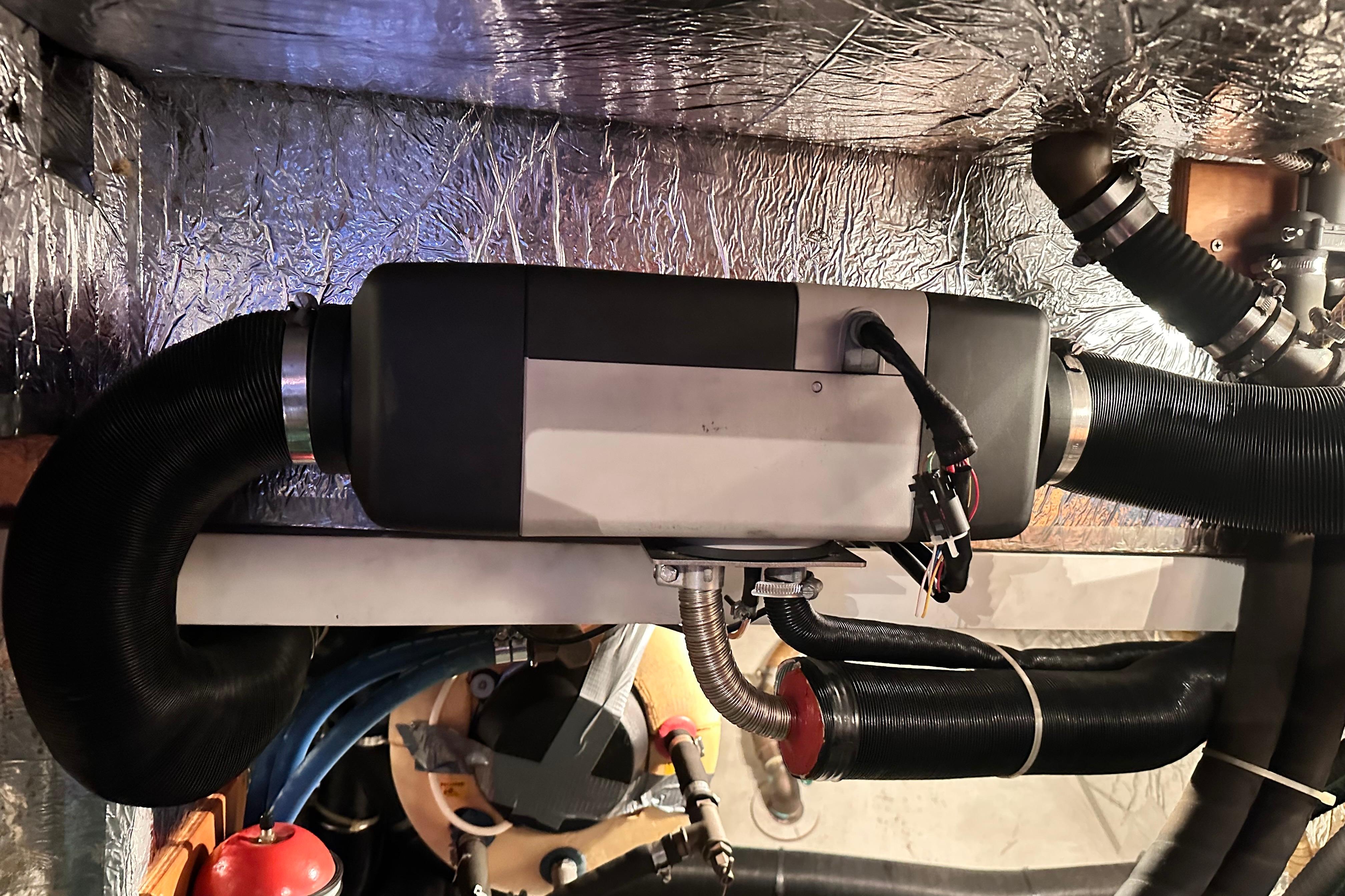 Webasto Airtop 32 Diesel heater with silencer in engine room, 3 outlets, thermostatically controlled.