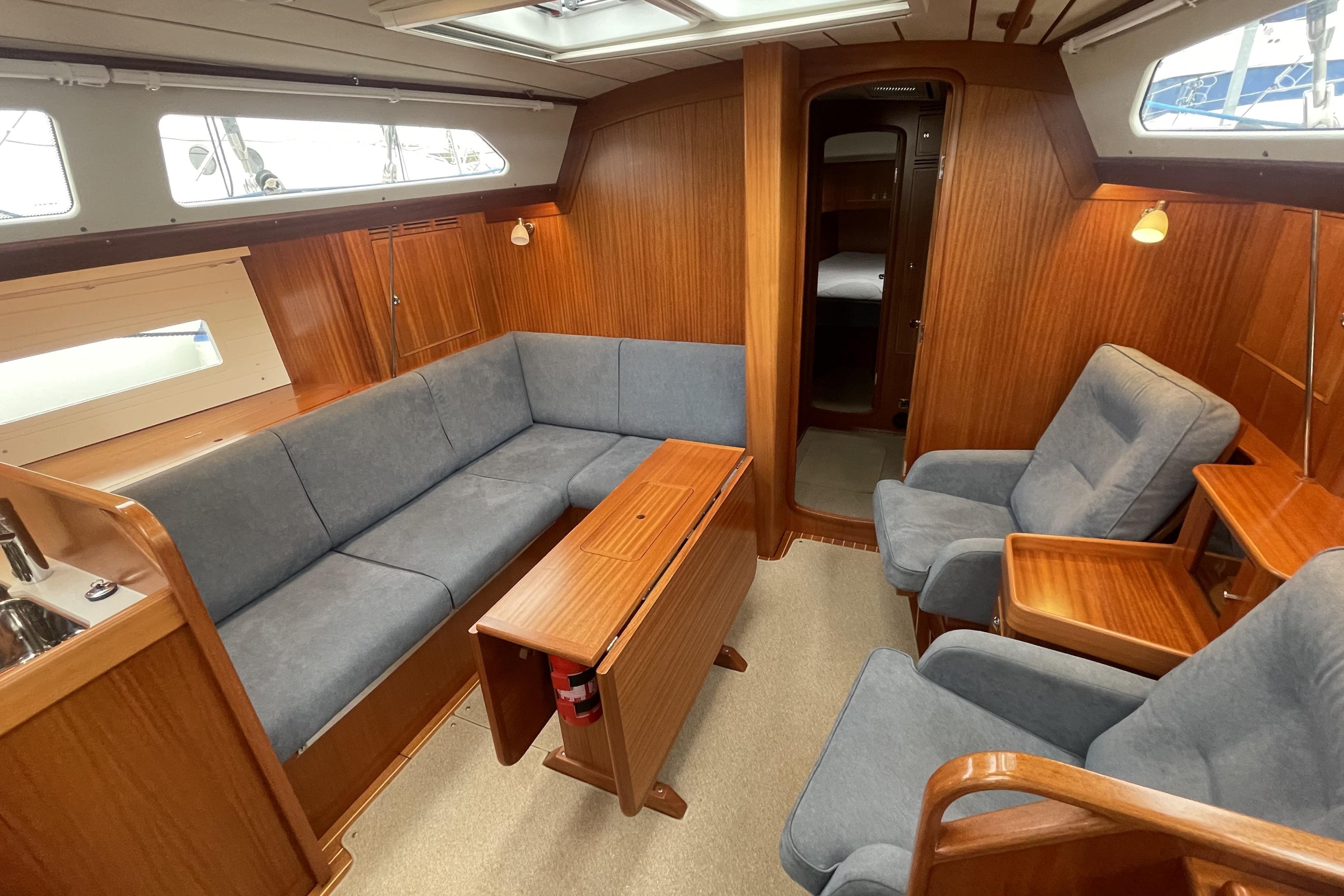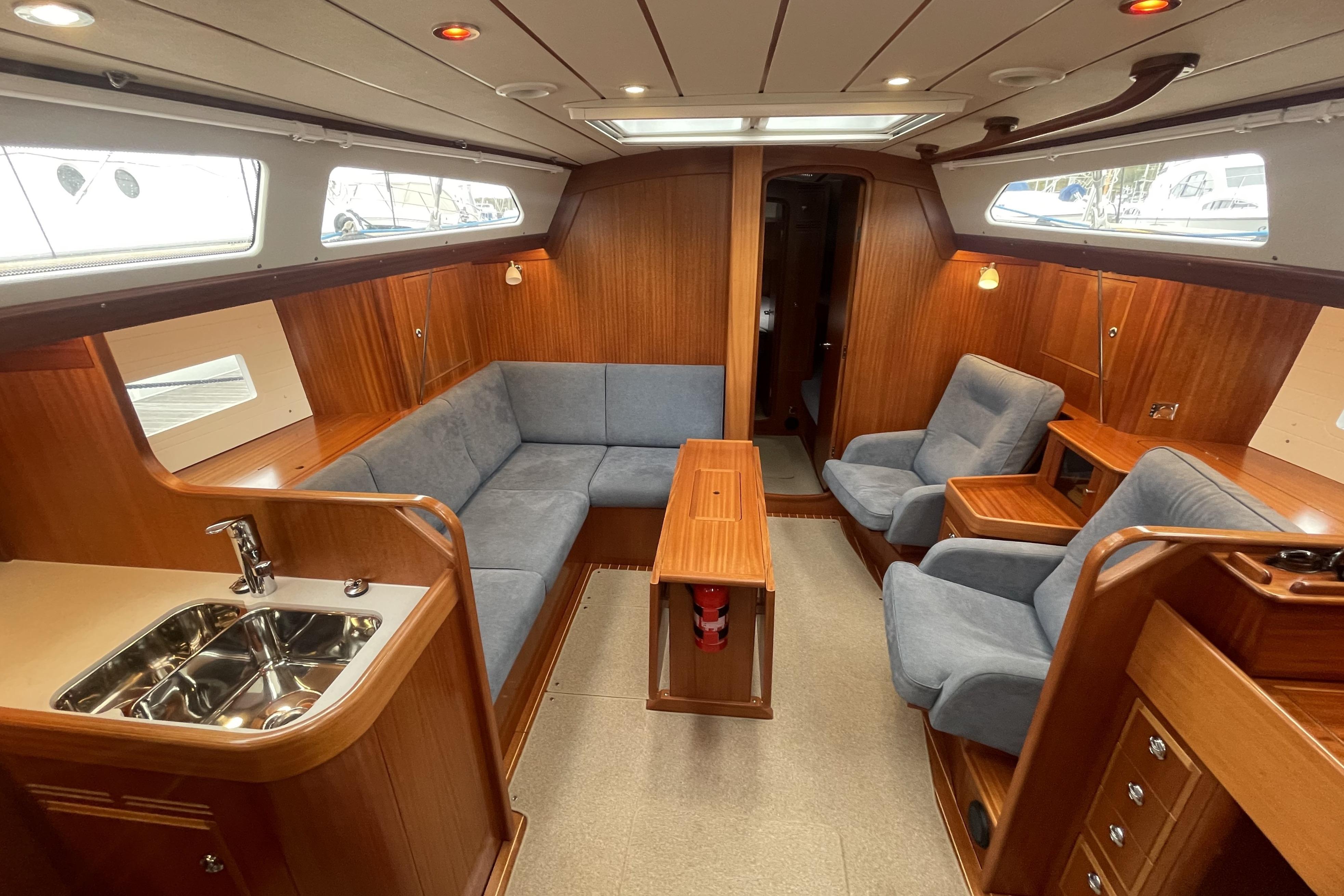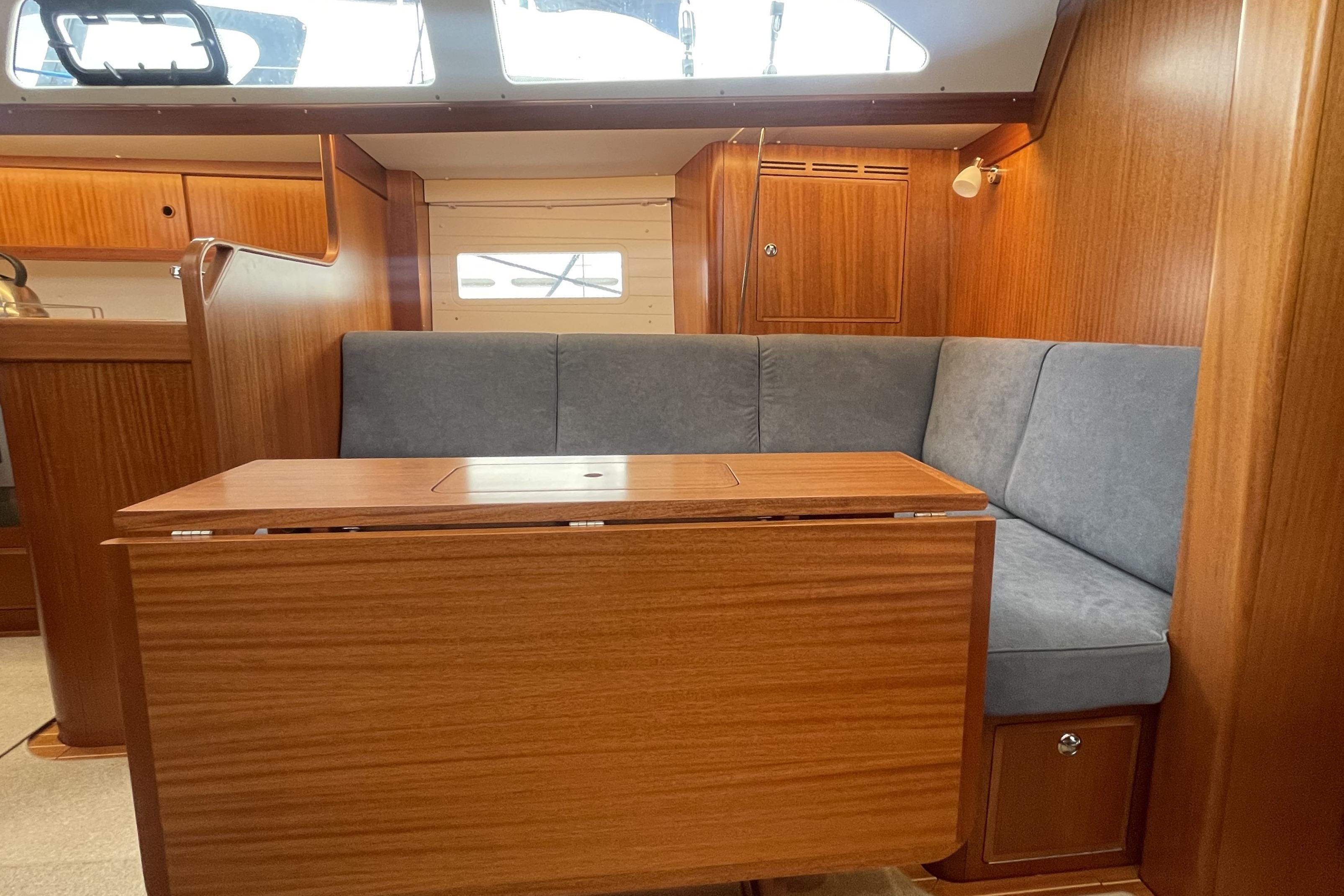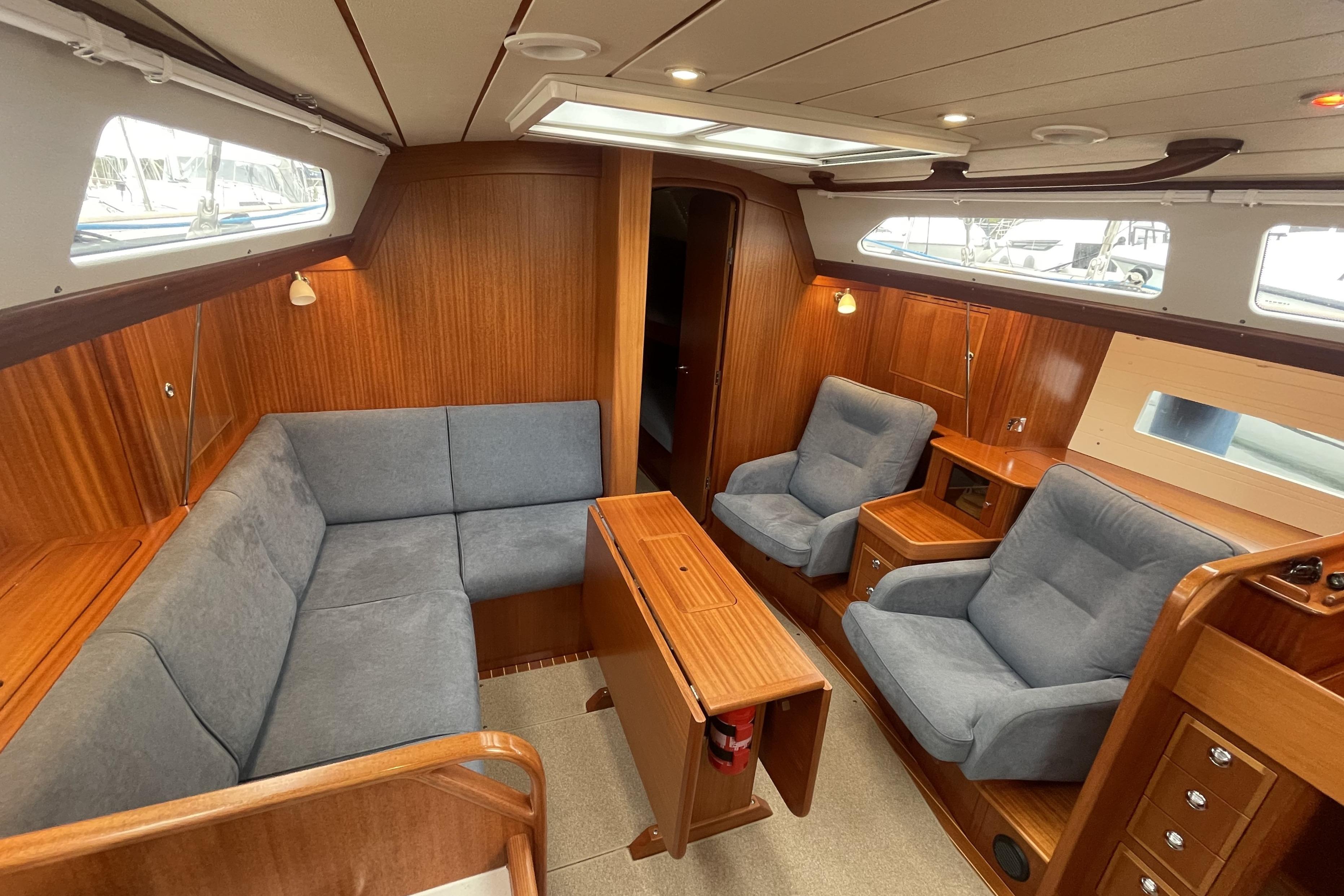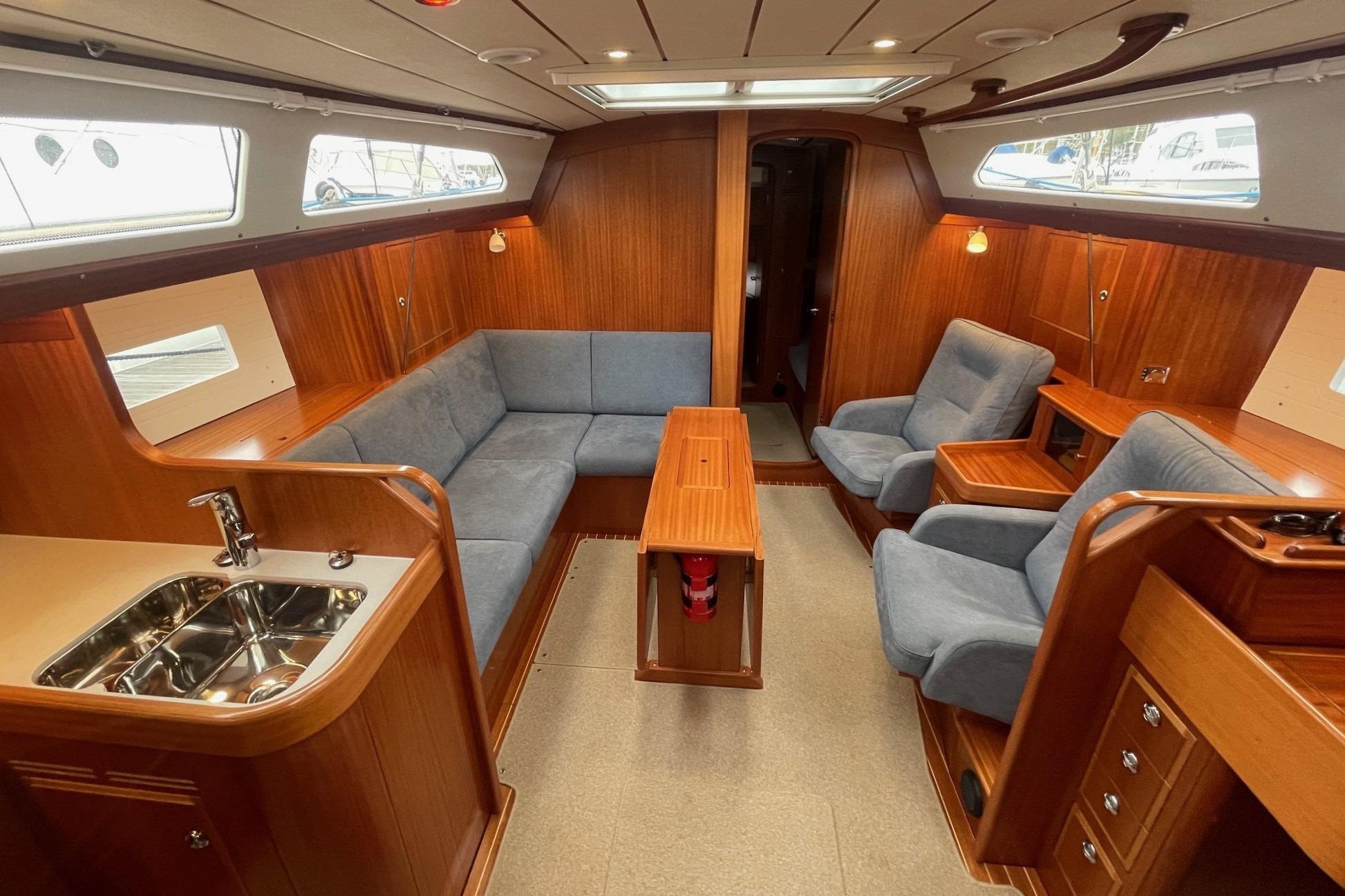 All interior woodwork in light mahogany matt silk finish. Flushed locker doors with invisible hinges and ventilation as far as possible. Floor is varnished real teak with inlaid holly strips with beige carpet throughout. Saloon deck head finished in cream panelling with mahogany strips. Original Alcatara upholstery to all seating and complimentary deluxe upholstery to the berths, cushions on all berths 12 cm / 5’’ thick sandwich foam resting on unvarnished, well ventilated boards to avoid condensation. Mattress toppers for fore peak and aft cabin berths. Hand holds are in all the right positions. All portholes and hatches are fitted with curtains or blinds.
