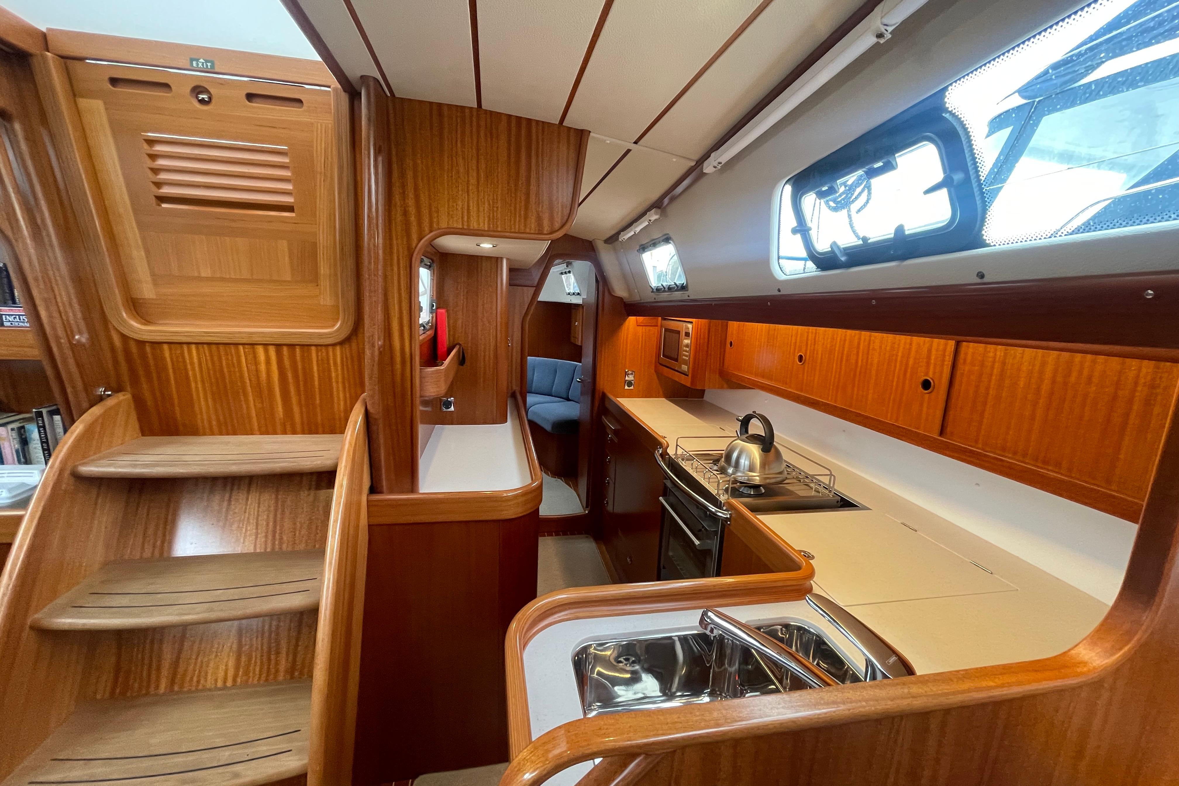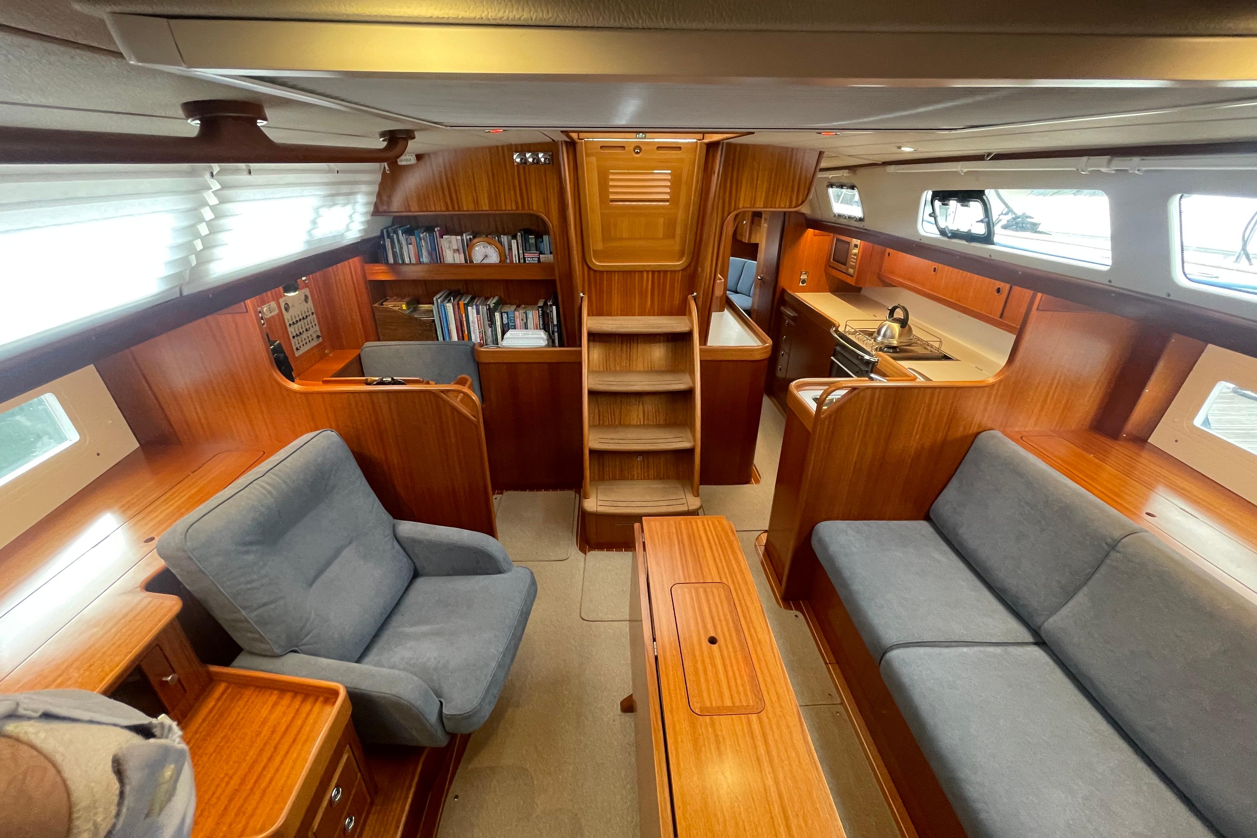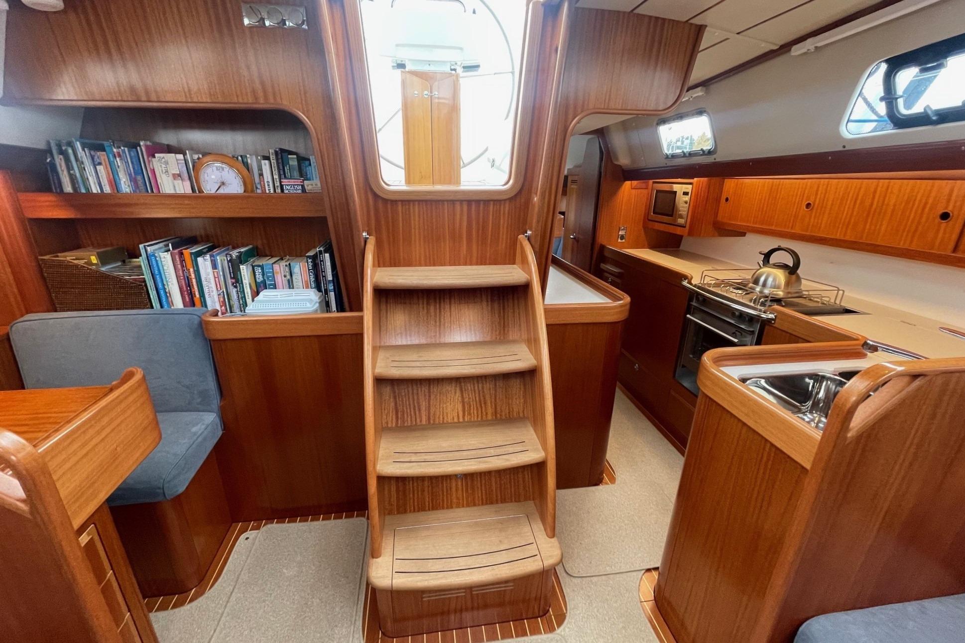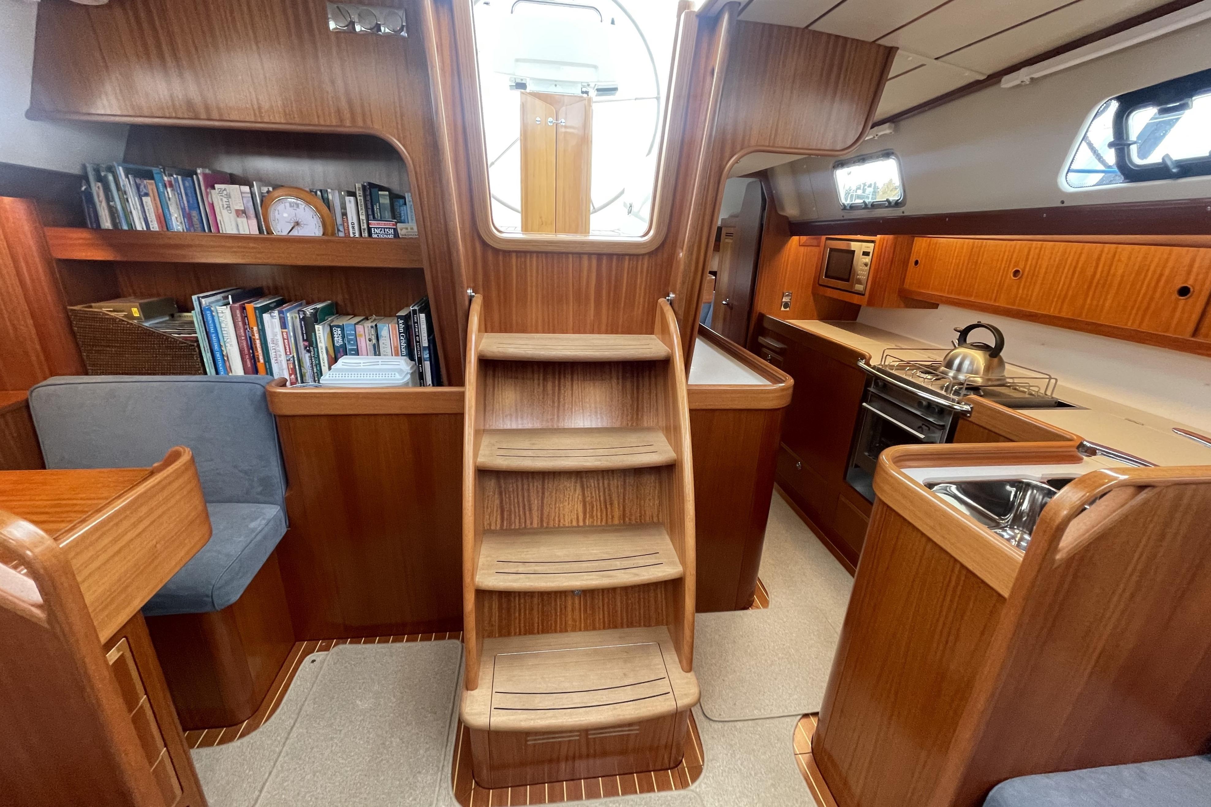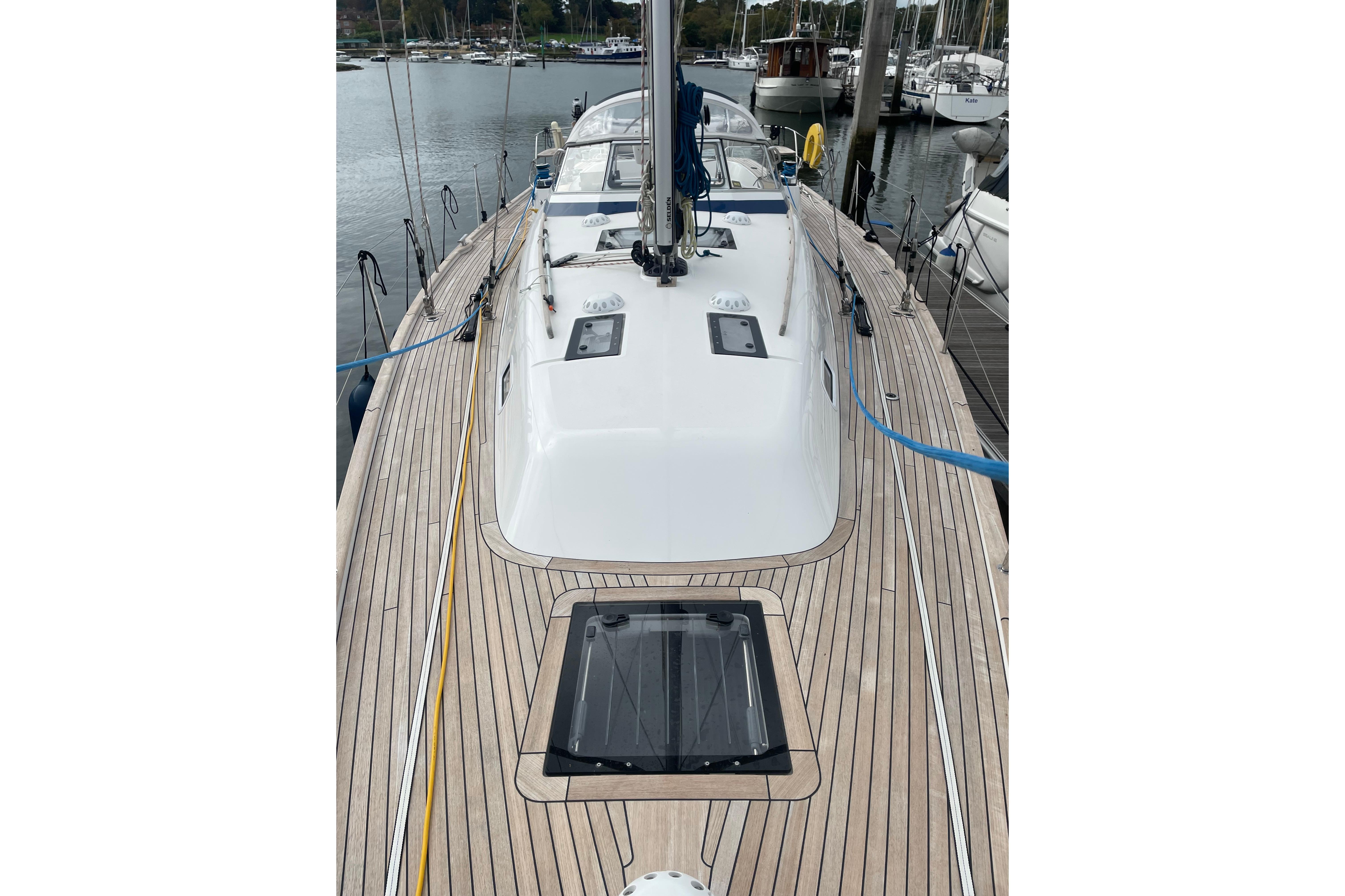 - On either side of sliding hatch there are useful teak covered work surfaces, ideal as chart tables, etc.