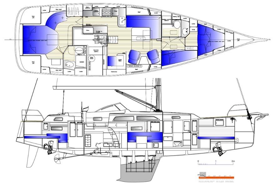 - Fresh water capacity is approximately 650 litres in three tanks, the lower tank under the cabin sole and the upper tanks under the parts of the saloon settees.