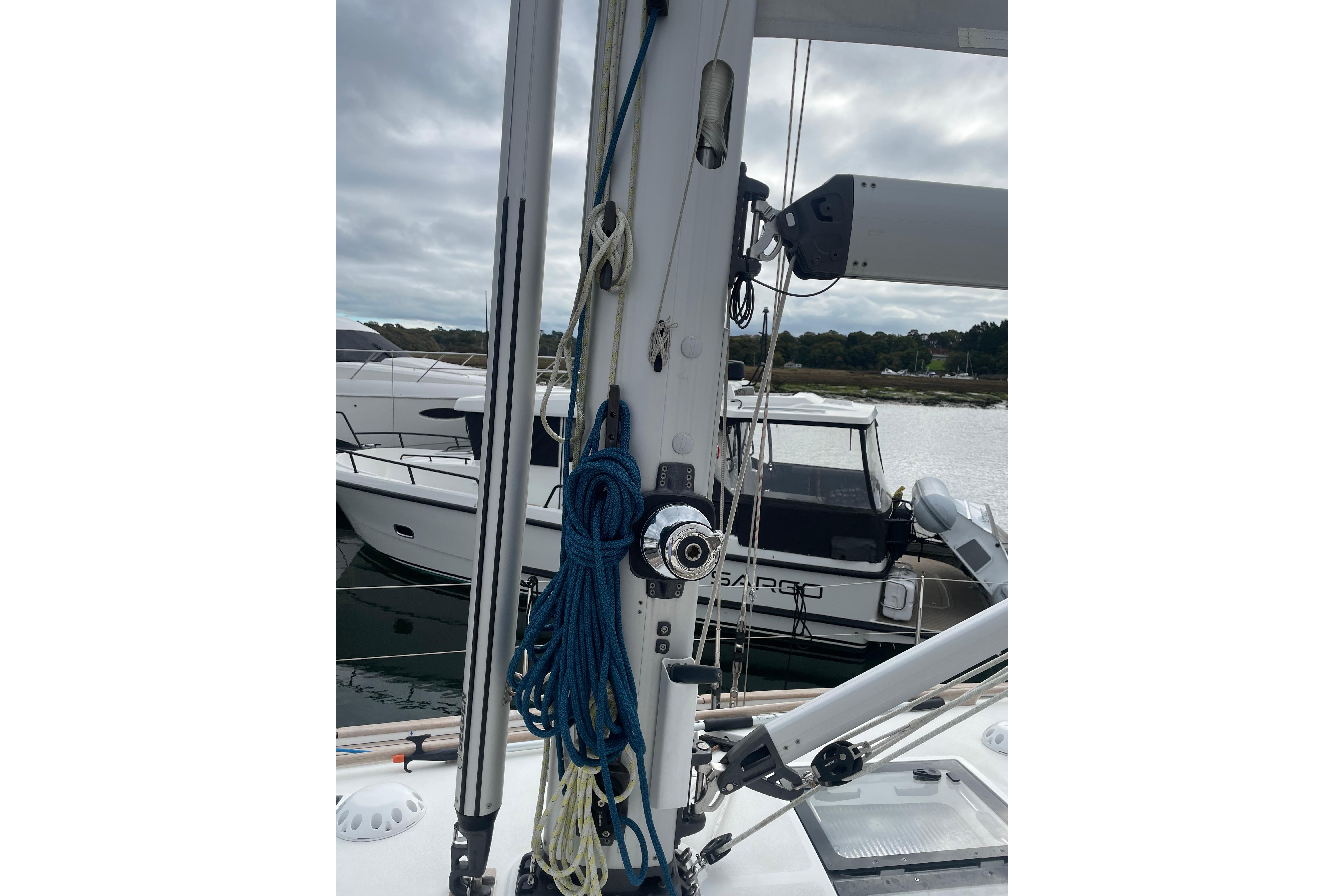 - Cleats and clutches to handle all lines at the mast.