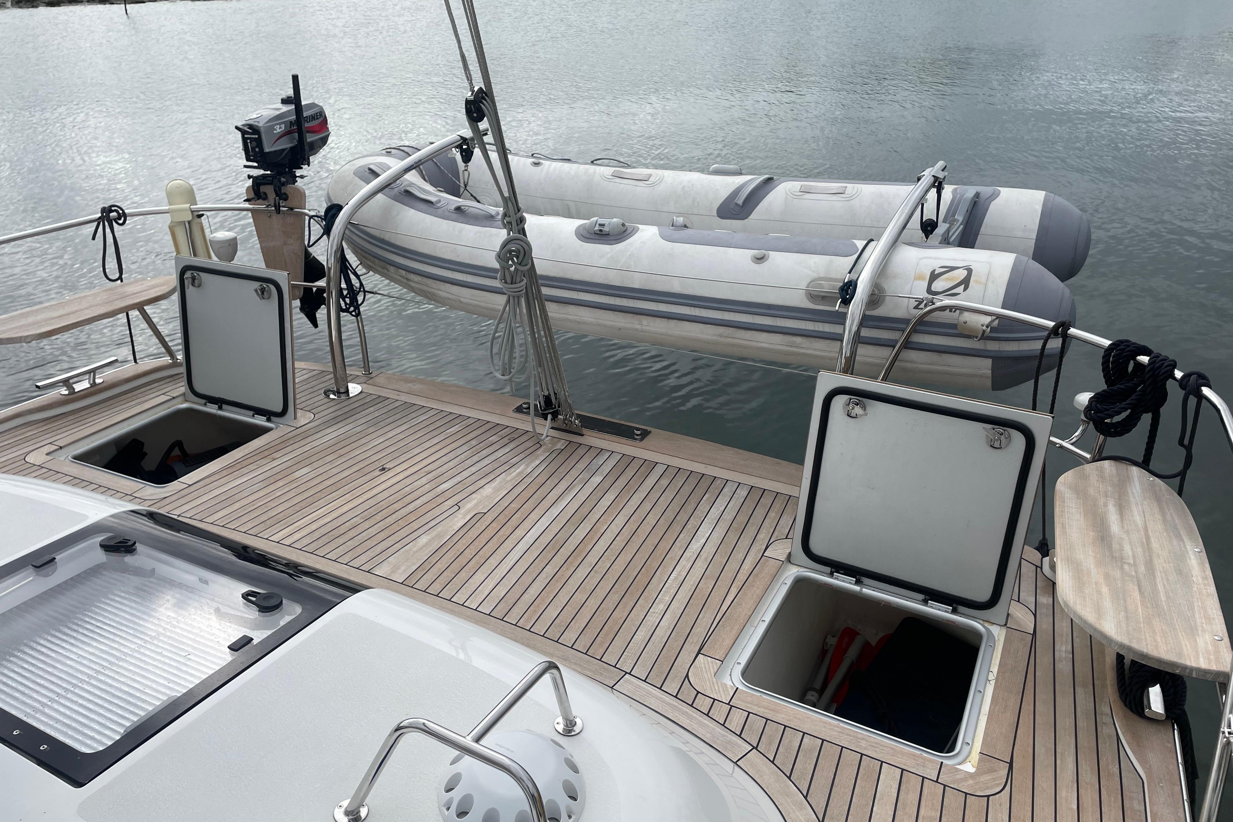- Toerail, cockpit seats, cockpit floor, side decks and bathing platform in top-quality teak.