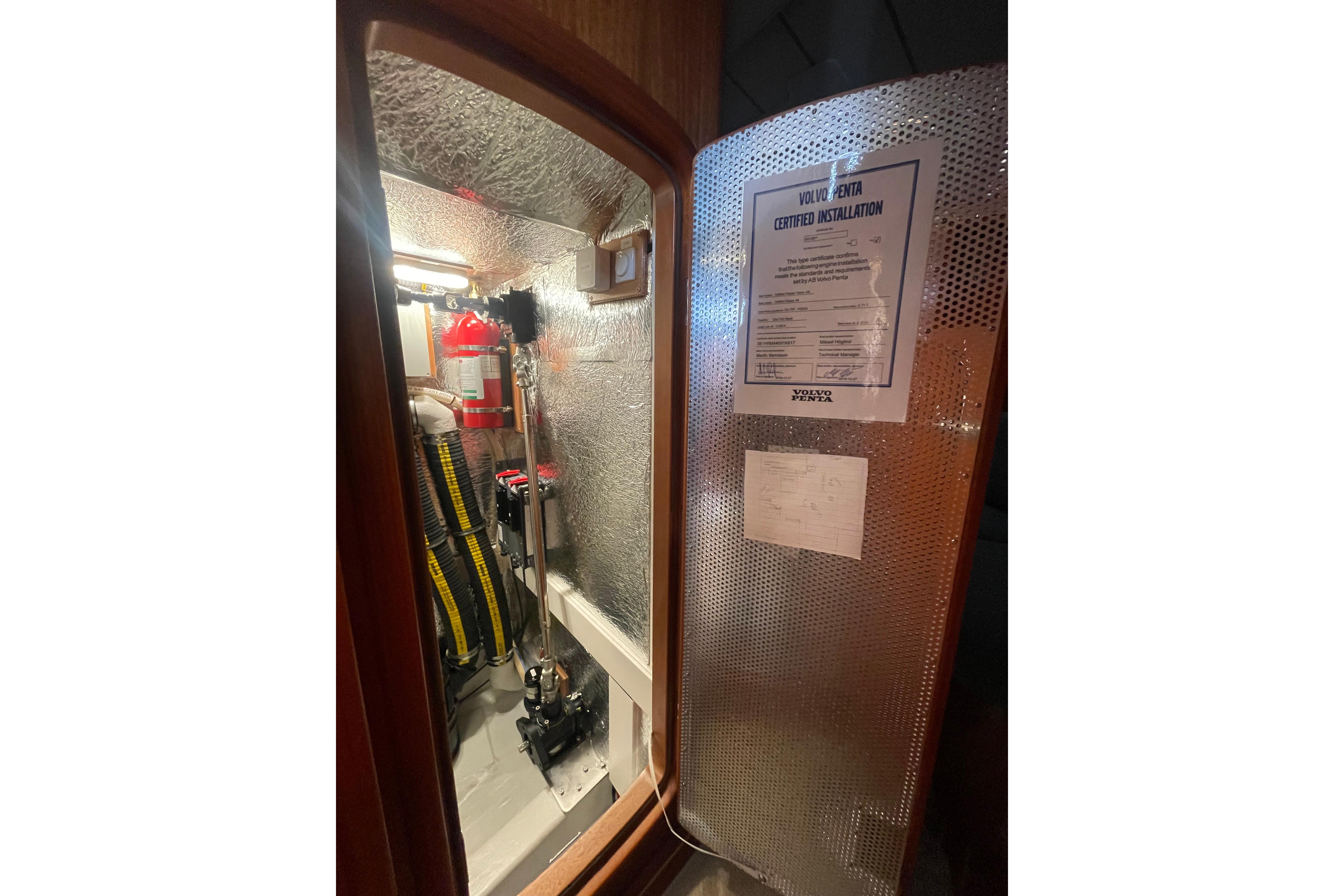 - Four fire extinguishers, one fitted to the saloon table, one in the forward cabin, one in the aft cabin and one in the cockpit locker.