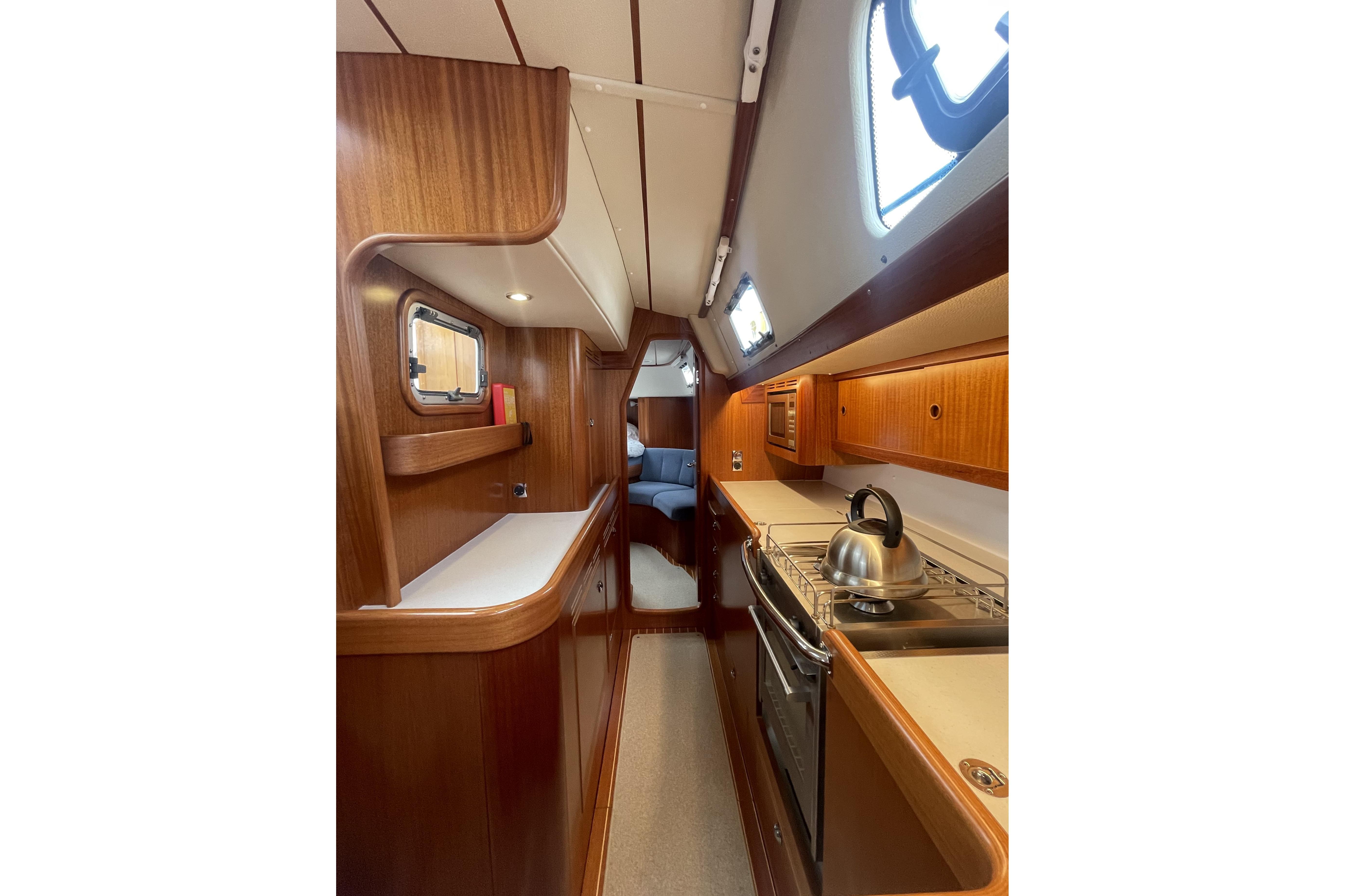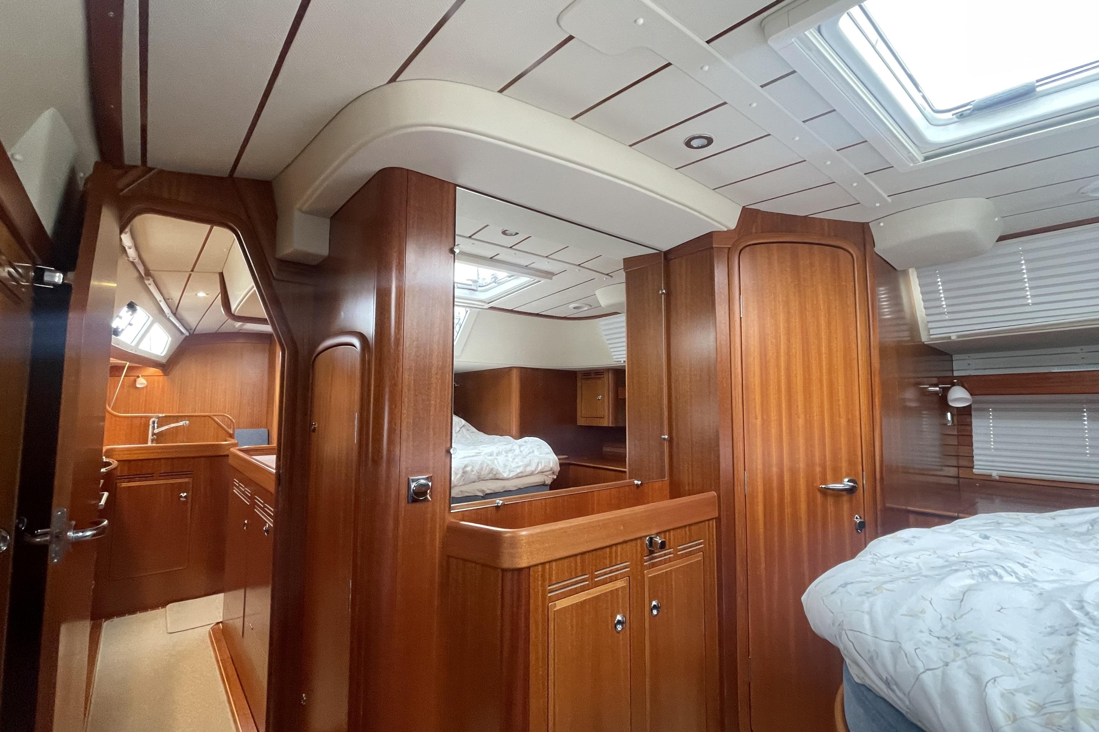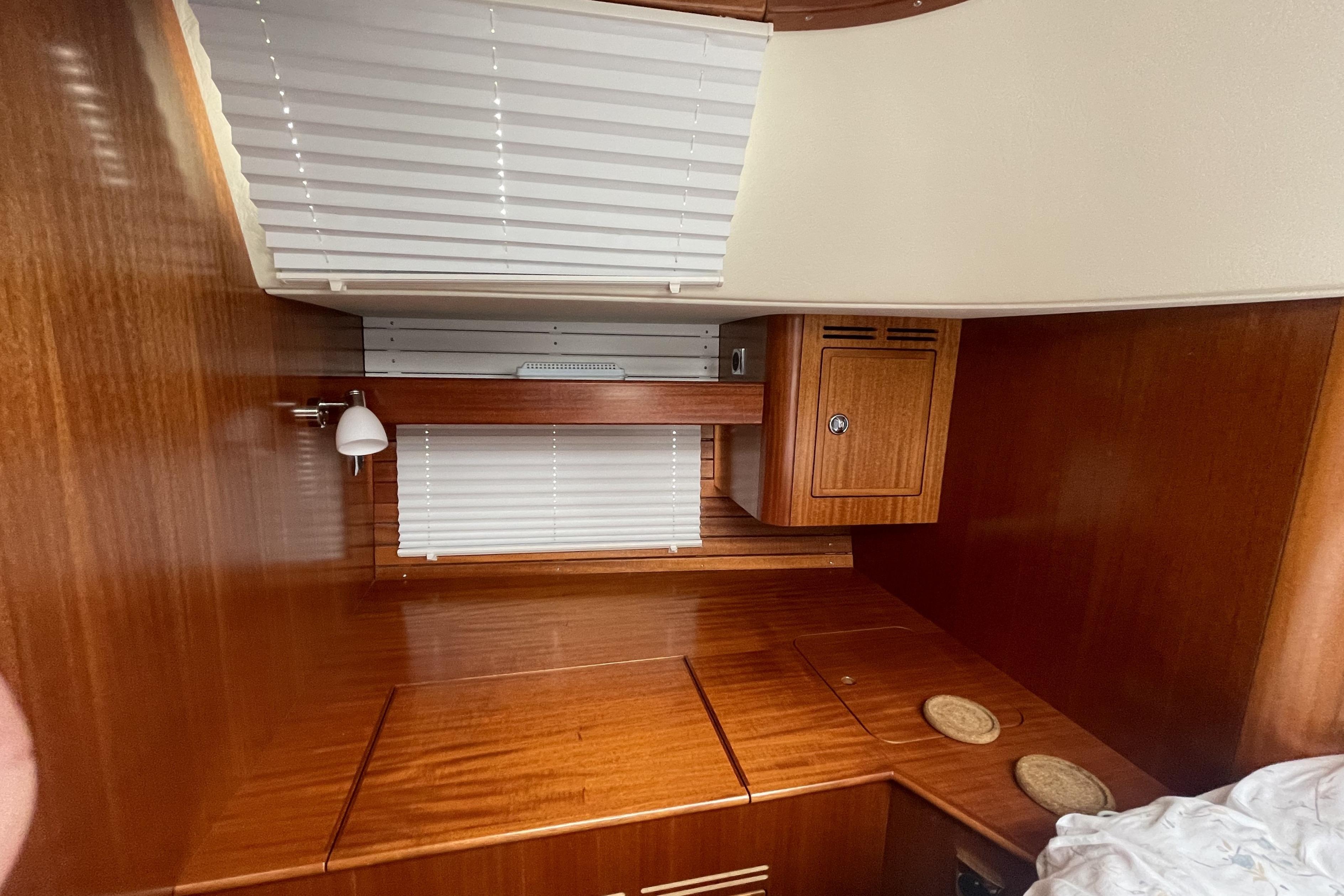 The settee offers comfortable seating. On the port side a 2.00 m long L-sofa that has backrests with hinges so that the space behind can be utilised as storage. Port settee has lee-cloth for use as sea-berth. On the starboard side there are two of Hallberg-Rassys famous, luxurious armchairs. Between the Armchairs, there is a center piece holding two drawers and a glass-fronted locker. On the centreline is a strong table with folding leaves. Top opening bottle locker in the centre of the table. Headroom in saloon is approximately 1.97 m.