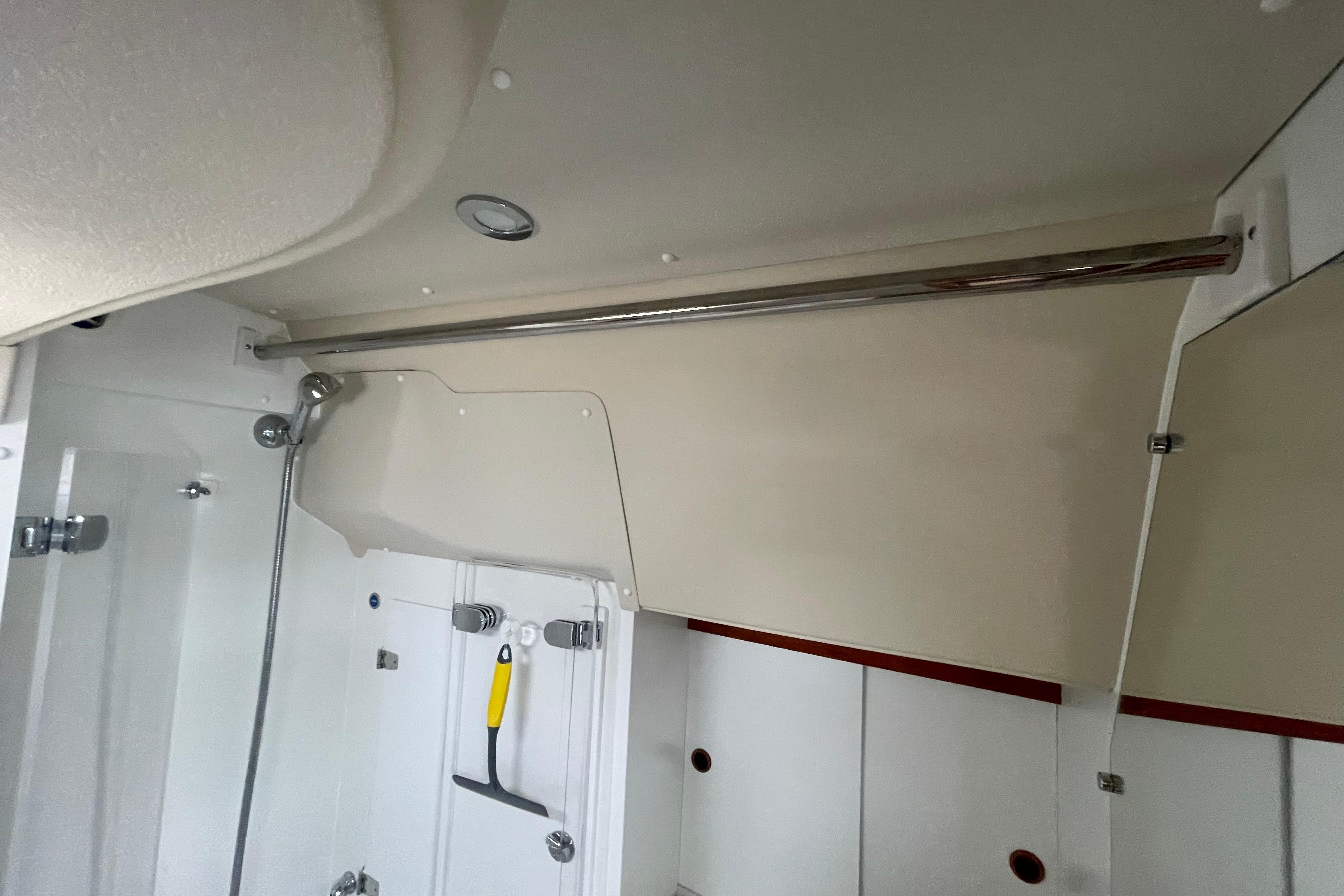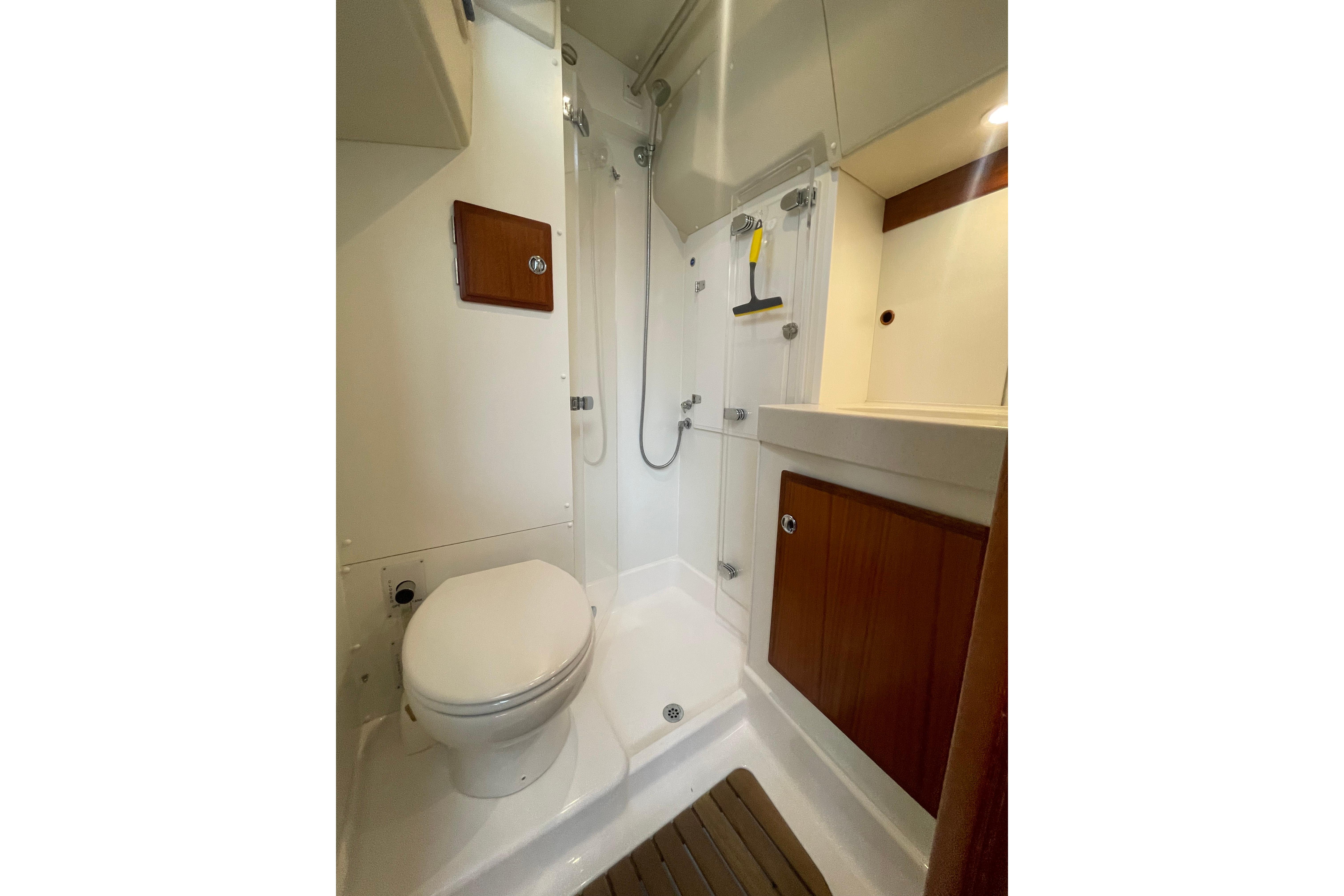 As forward toilet. The separate shower has plexi glass doors. Ventilation through an opening portlight towards the cockpit.