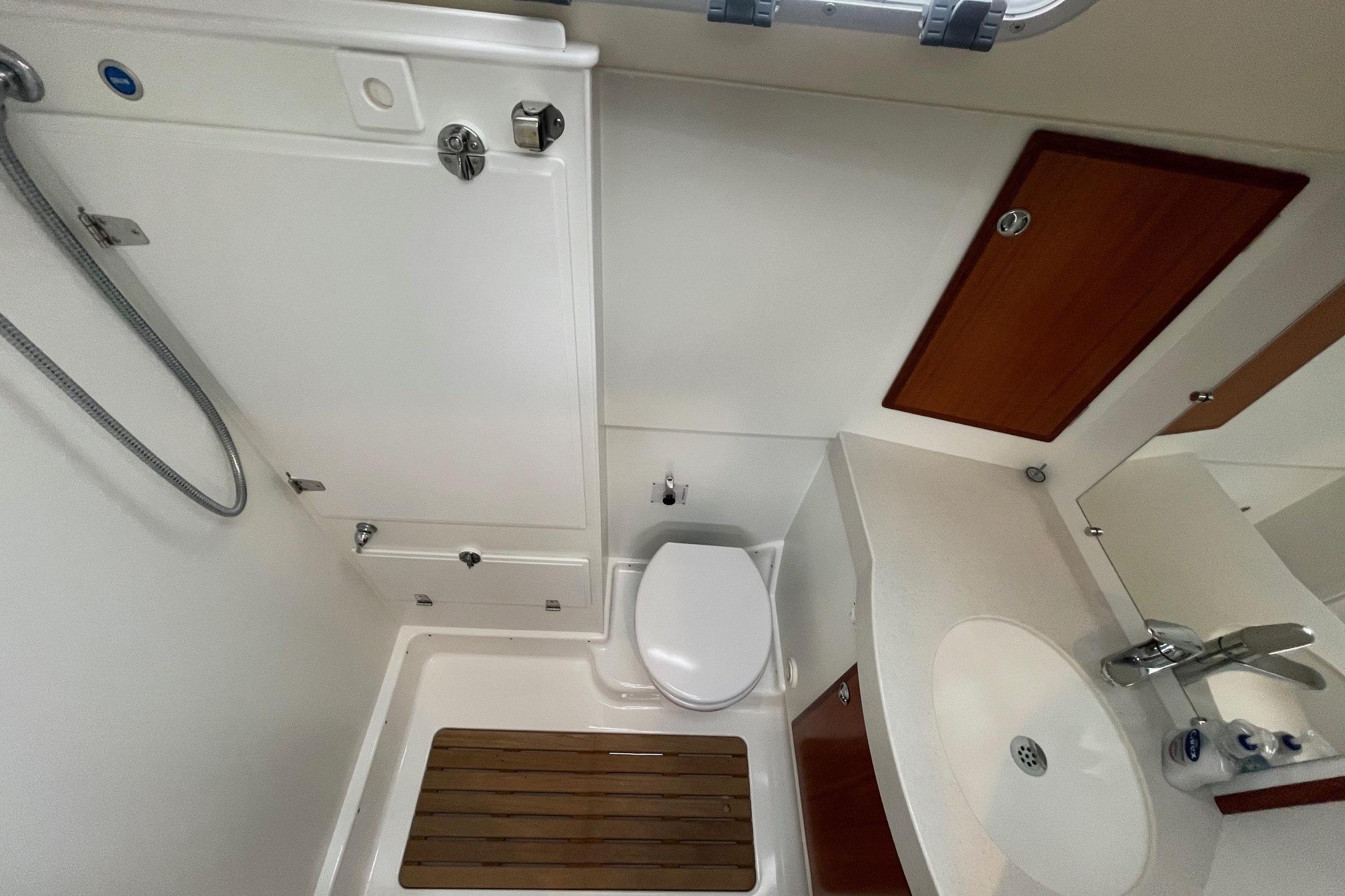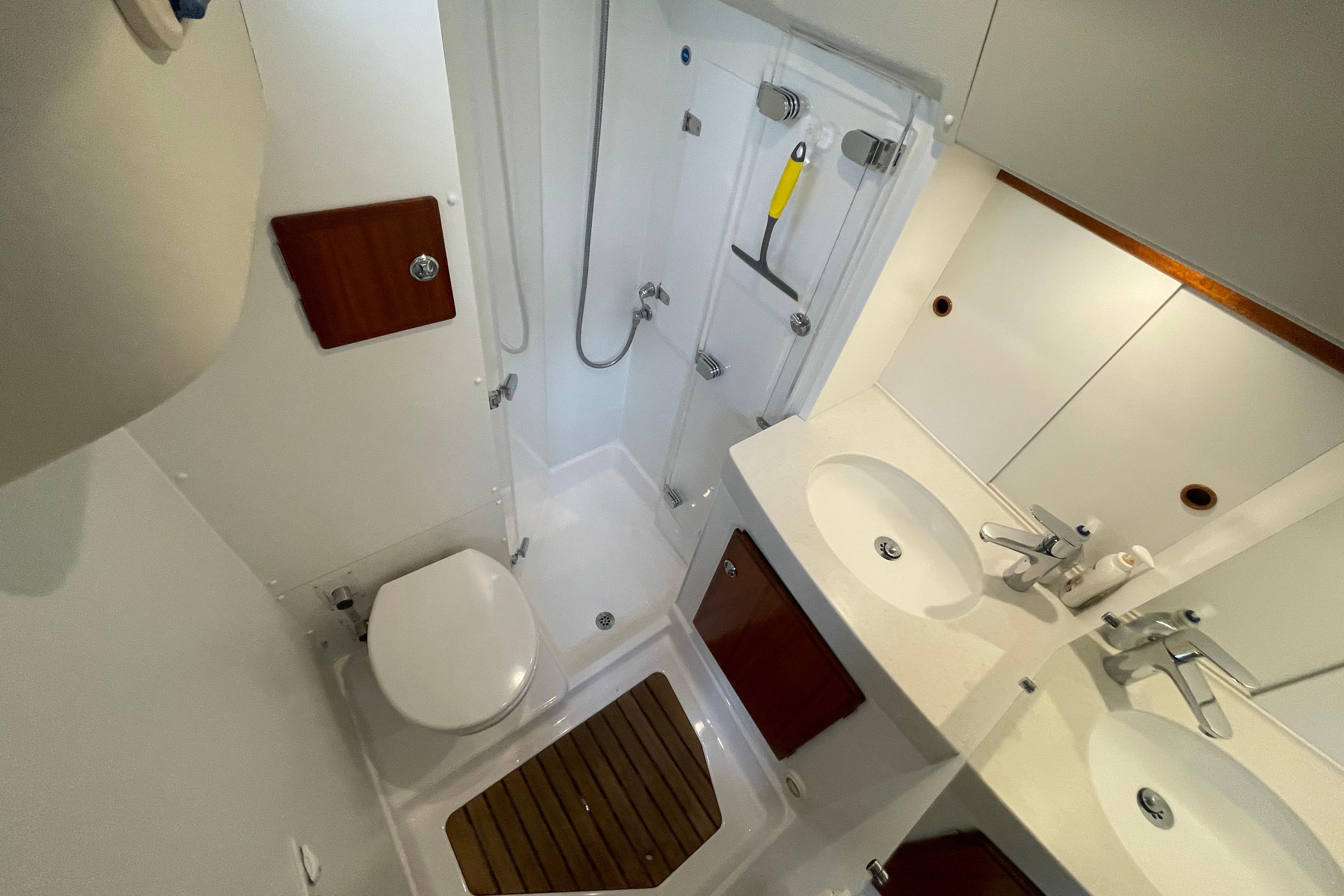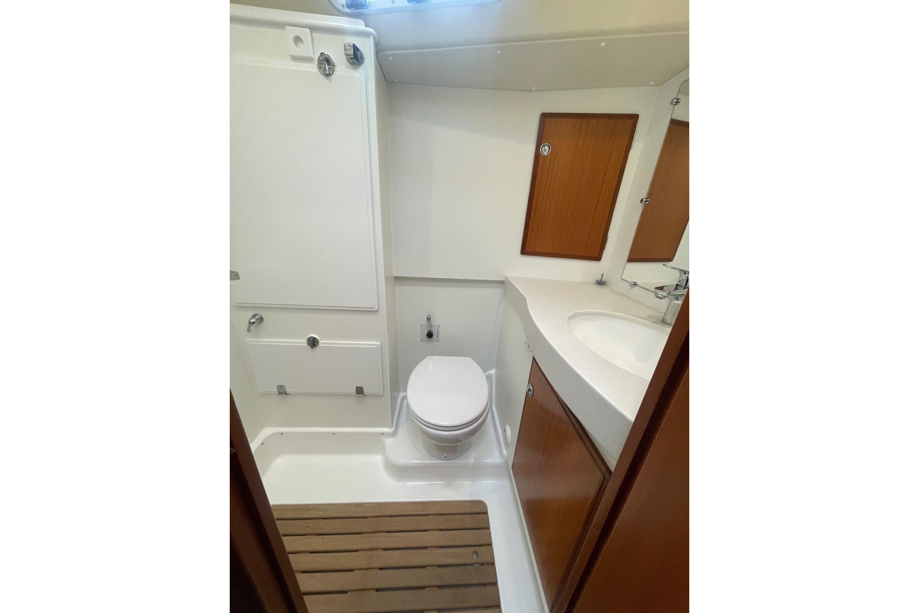 Bulkheads and lockers in white laminate. Teak grating. Wash basin and countertop in Corian composite stone. There is a large mirror fitted. Separate shower with watertight shower stall, plexi glass doors. Shower water drained by pump directly overboard without going into bilges. Hand switch for shower pump for utmost safety. Strong, reliable pump action toilet. Holding tank, emptied by gravity or by deck pump out. Cupboard above and below washbasin. Ventilation through opening porthole and a hatch, with milk coloured acrylic glass to let light but obstruct view into the head.