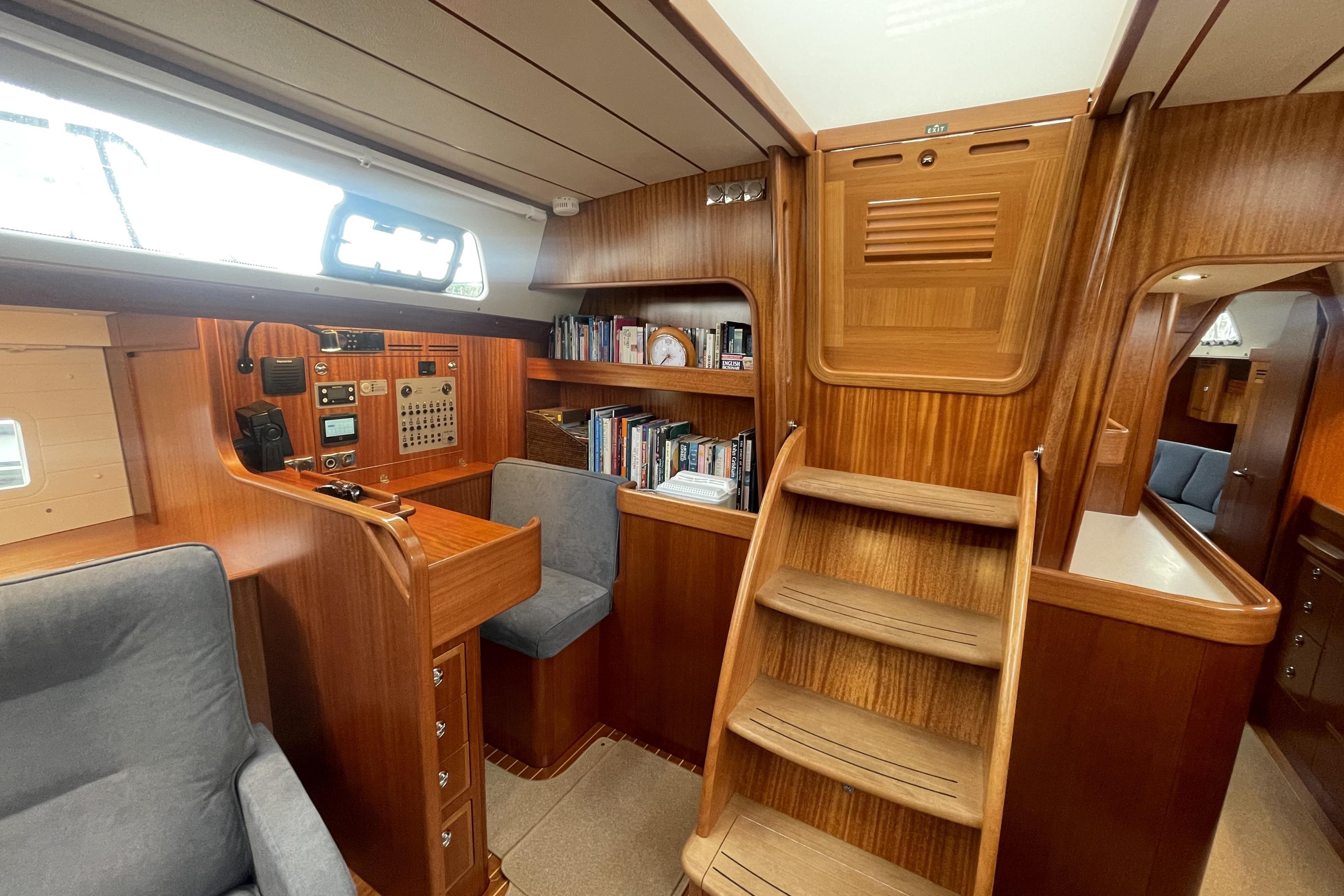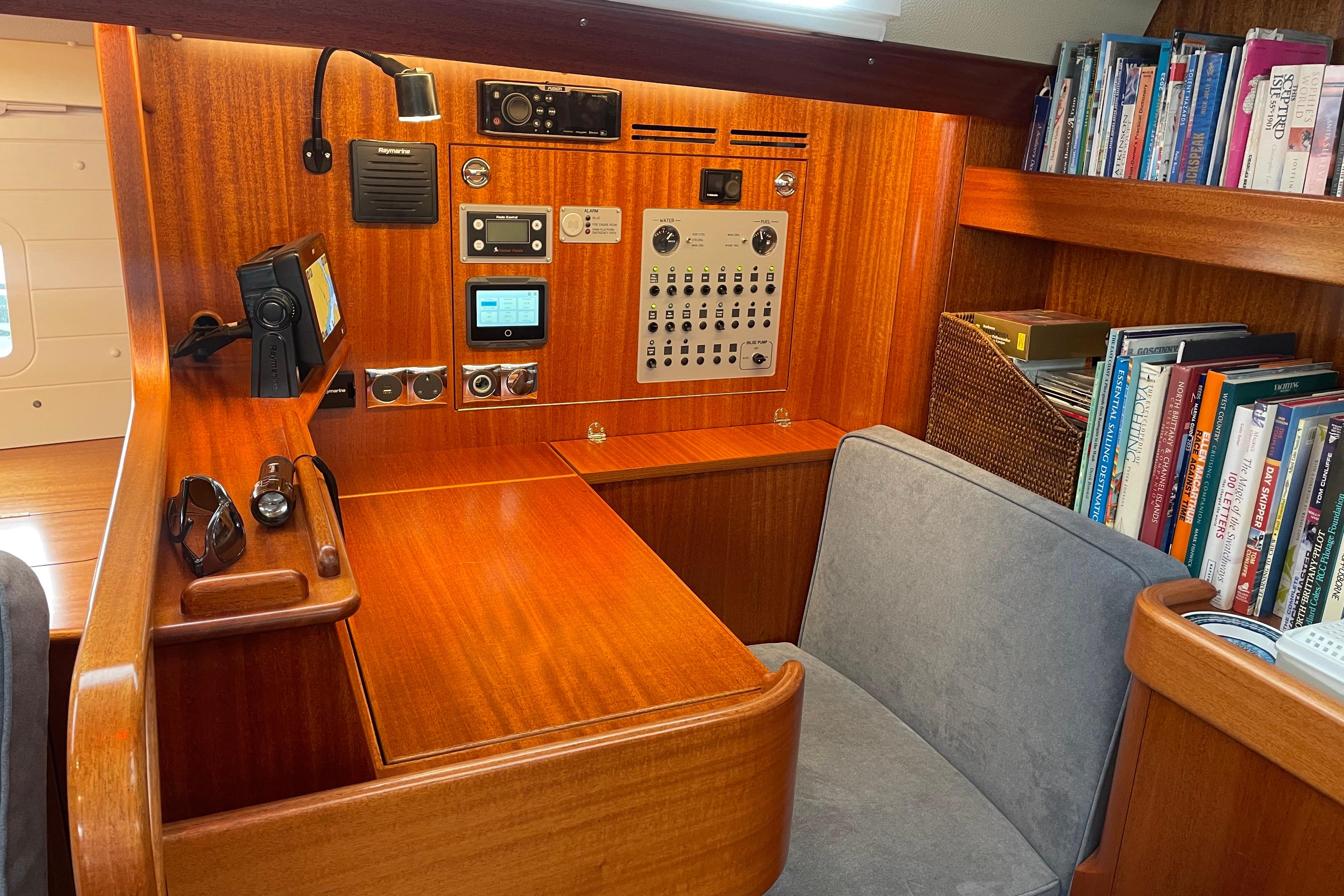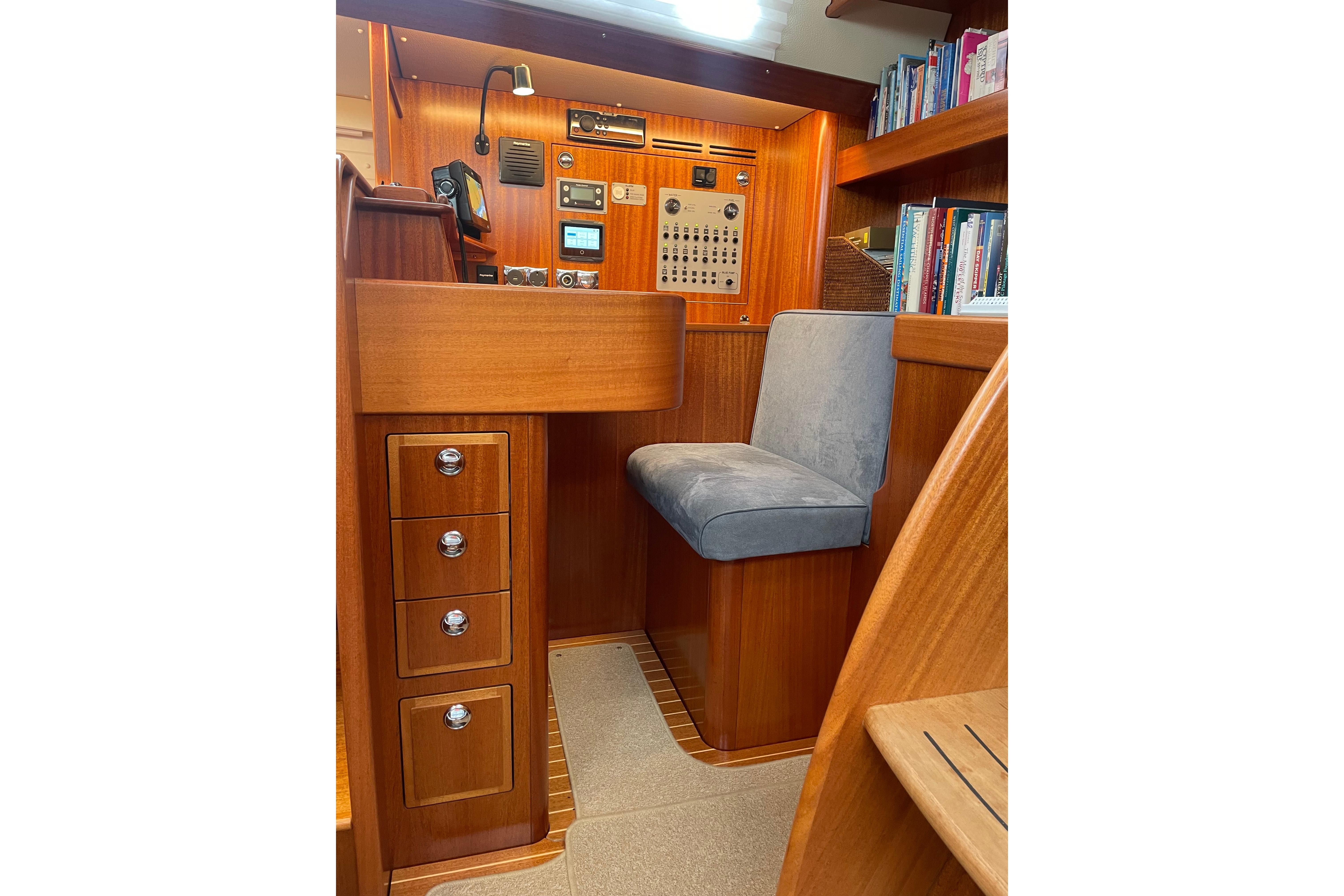 A comfortable chart table seat with spacious chart table. Electric panel to the left of the navigator. Drawers and stowage slots. There are two latge book shelves behind the chart table drawers under and various other useful shelves and chubby holes around teh chart table.